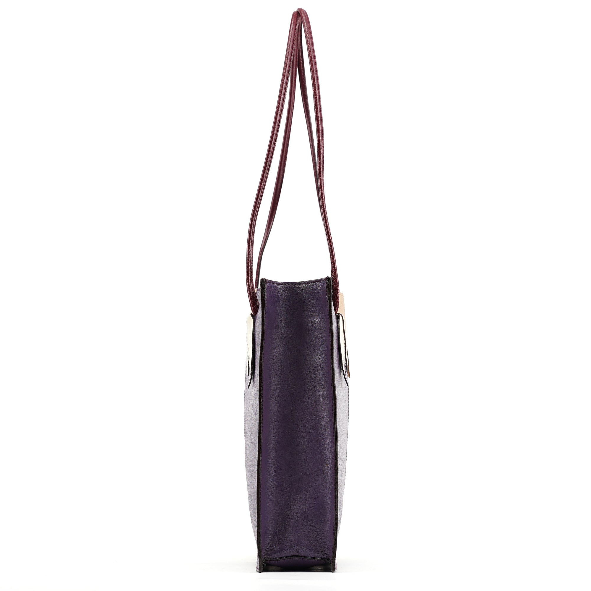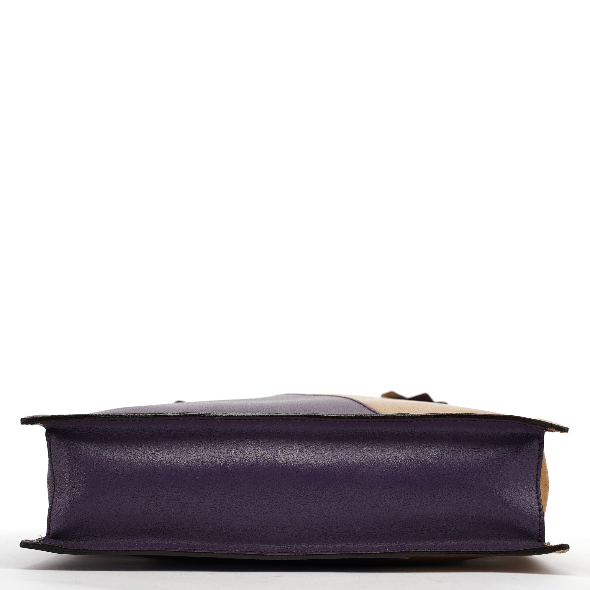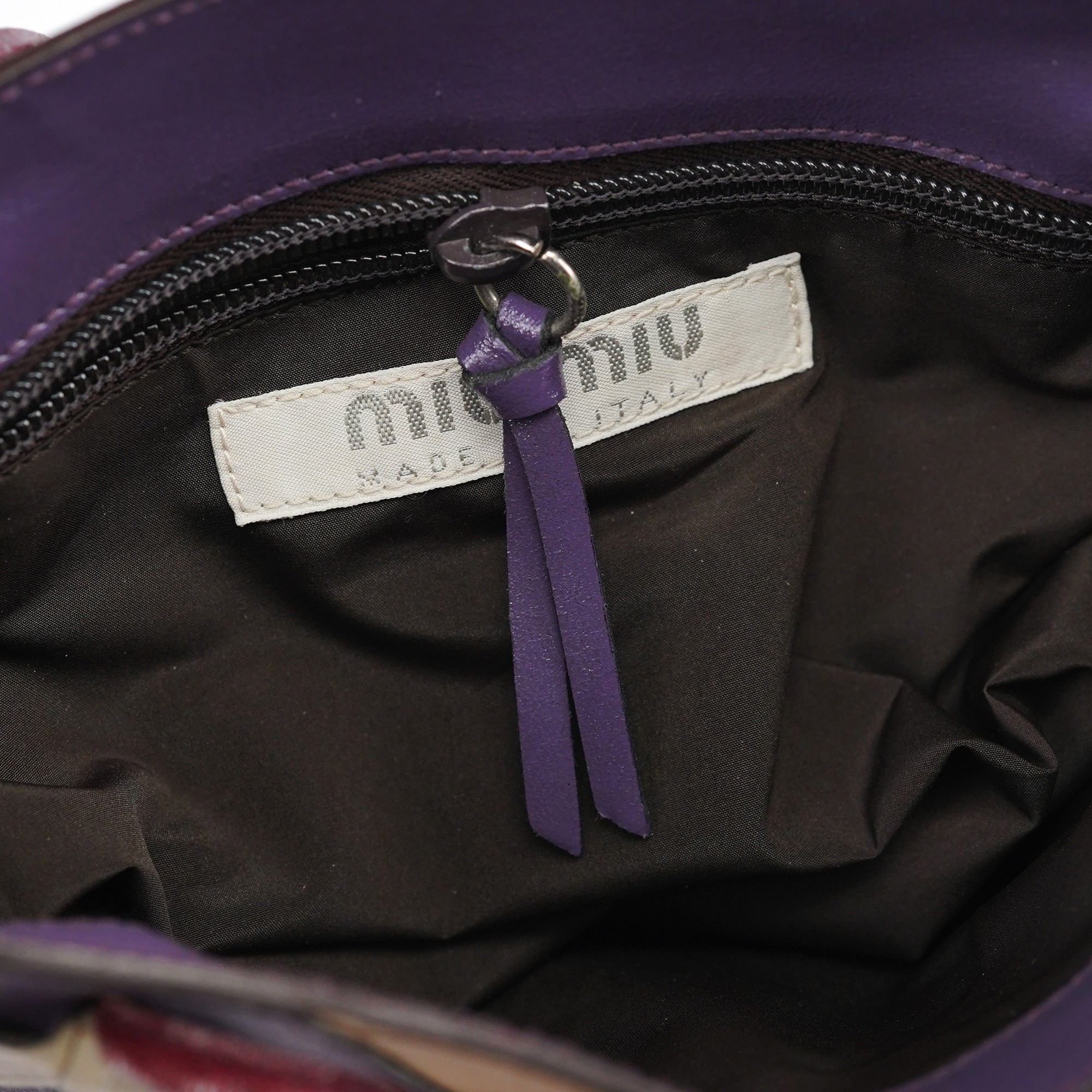 Designed in the early 2000's by Miuccia Prada, this vintage Miu Miu tote bag features purple and beige leather in a color-blocked design with twin top handles adorned with decorative leaf-shaped leather ornaments. The bag features contrast stitching along the edges and closes at the top. The interior is lined in brown nylon and includes a zipper pocket.