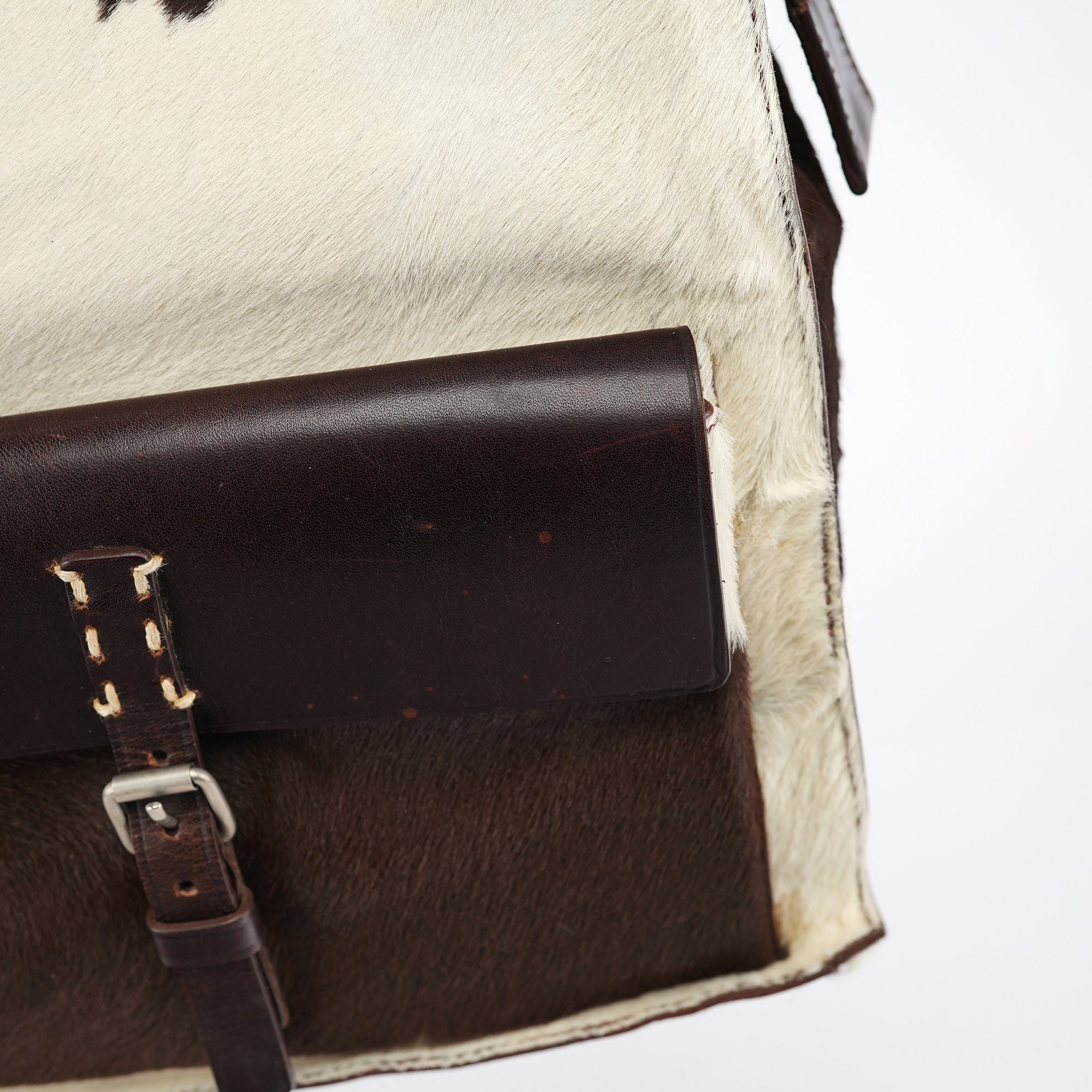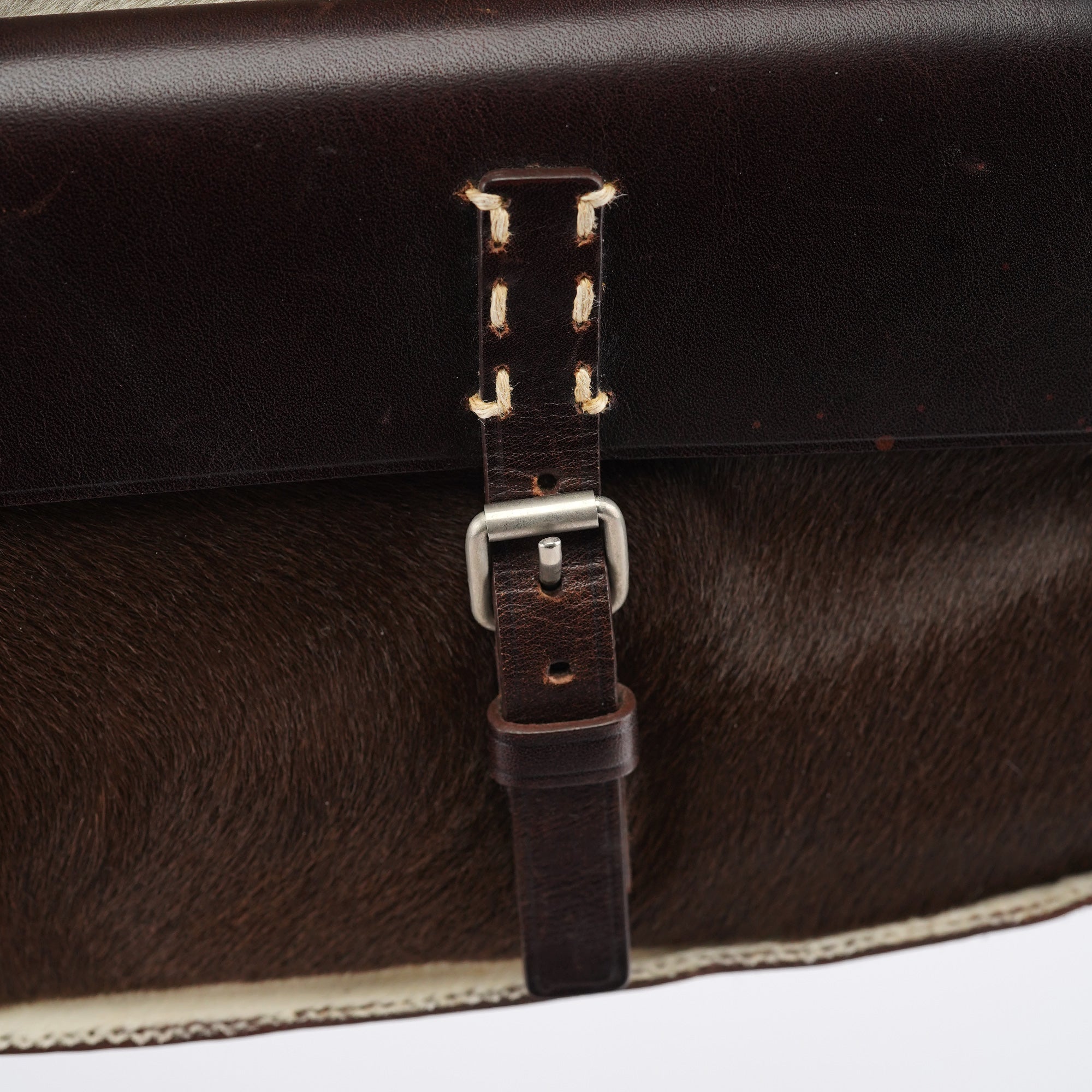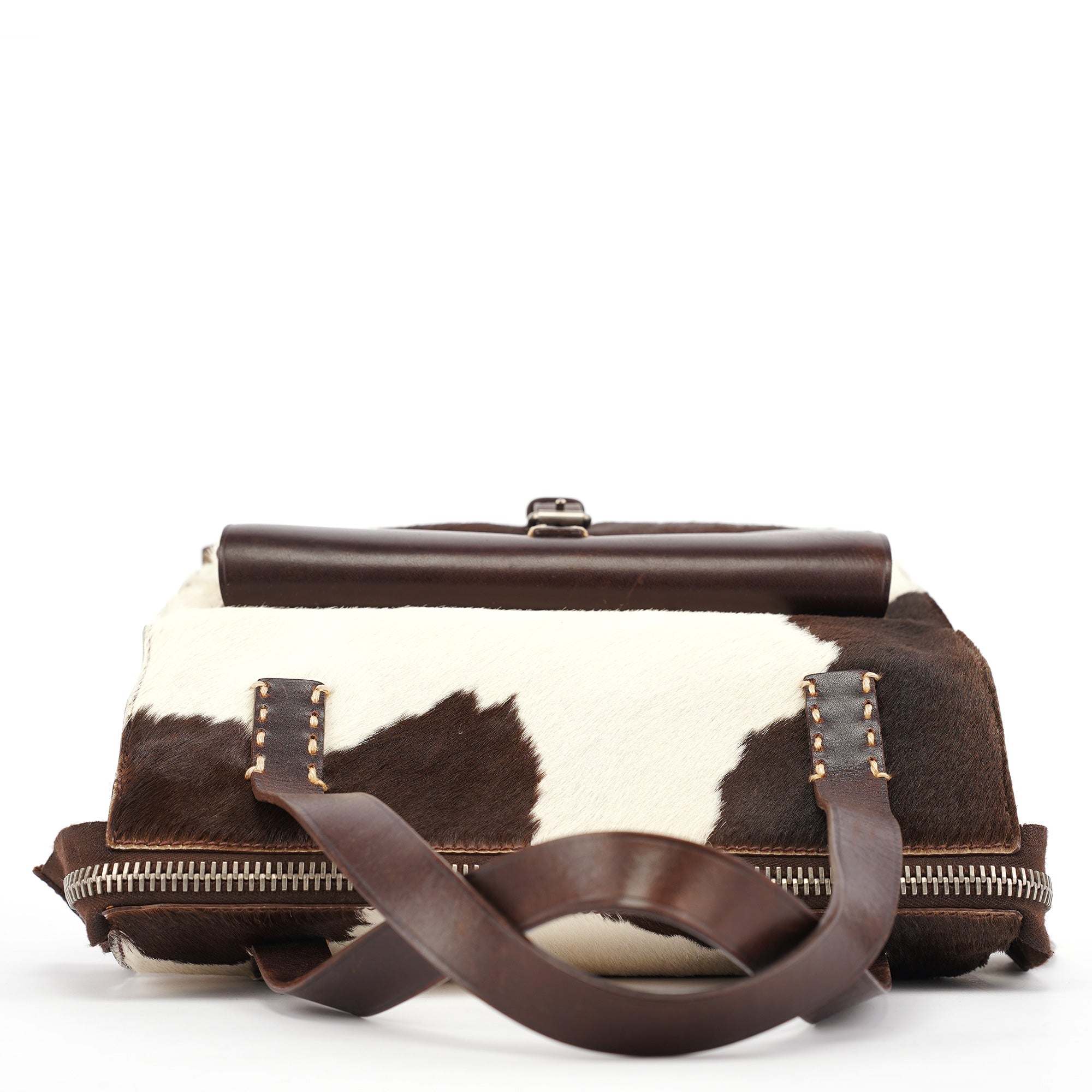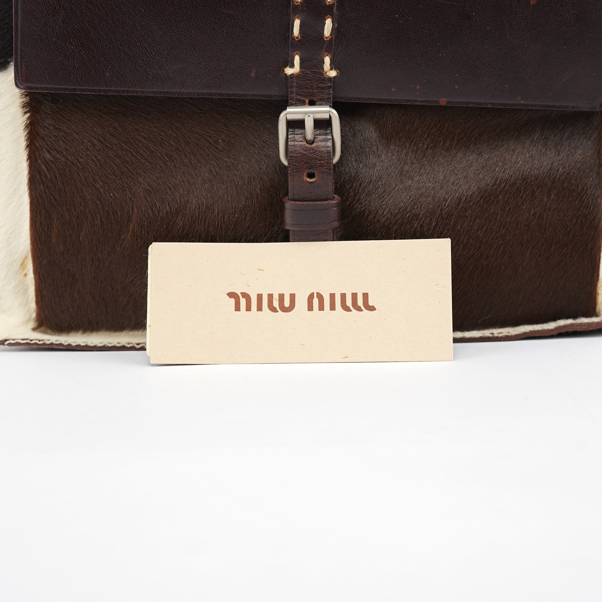 Designed in the mid-1990s by Miuccia Prada, this vintage Miu Miu archive tote bag features striking brown and white calf hair with dark brown calfskin leather trim. The structured design showcases a front pocket with buckle closure detail and dual top handles, with a canvas-lined interior including interior zipper pocket.