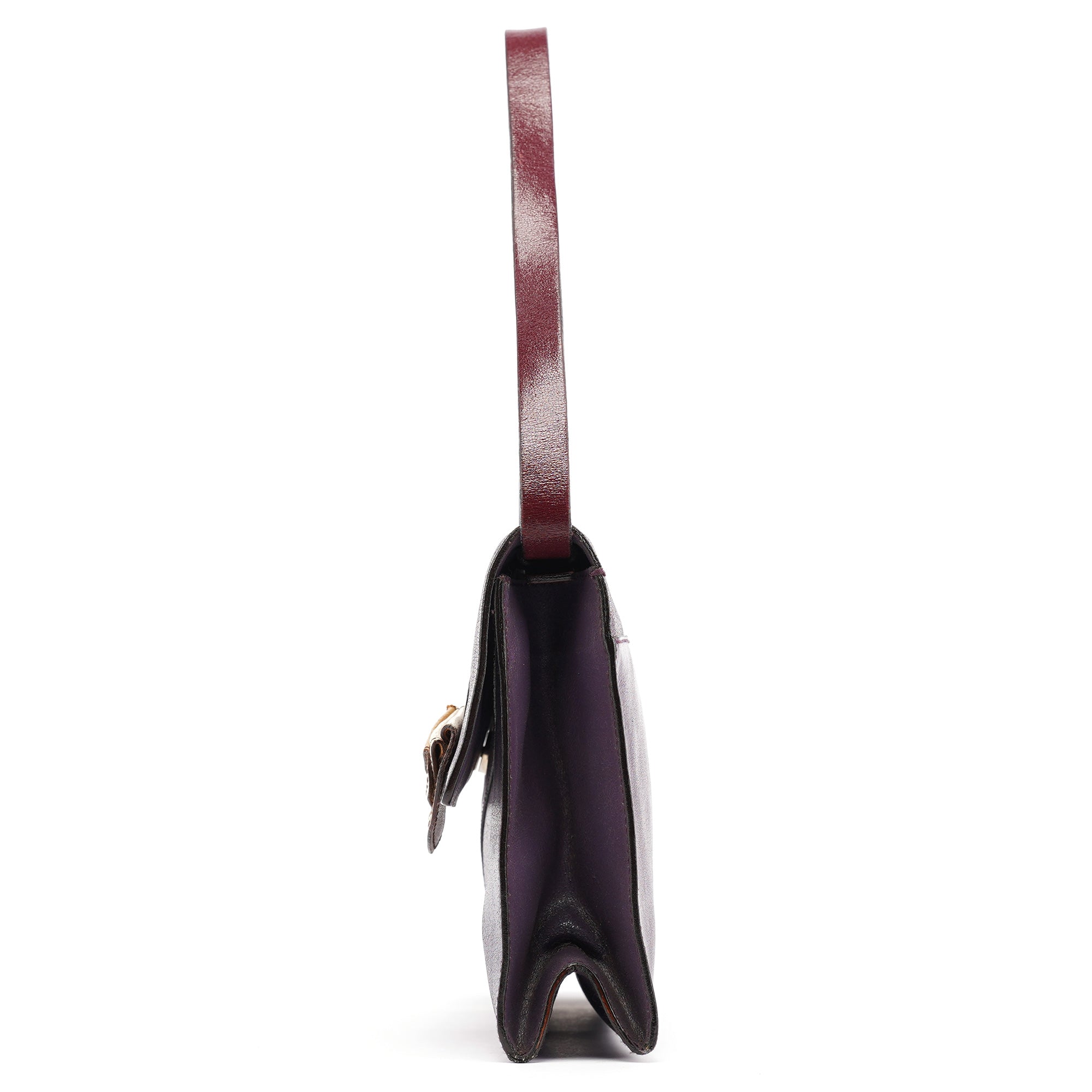 Designed in the early 2000s by Miuccia Prada, this vintage Miu Miu shoulder bag features purple calfskin leather with an envelope-style flap and distinctive gold and silver-tone geometric closure. The single shoulder strap and streamlined silhouette reflect Prada's minimalist approach to Miu Miu's accessories line.