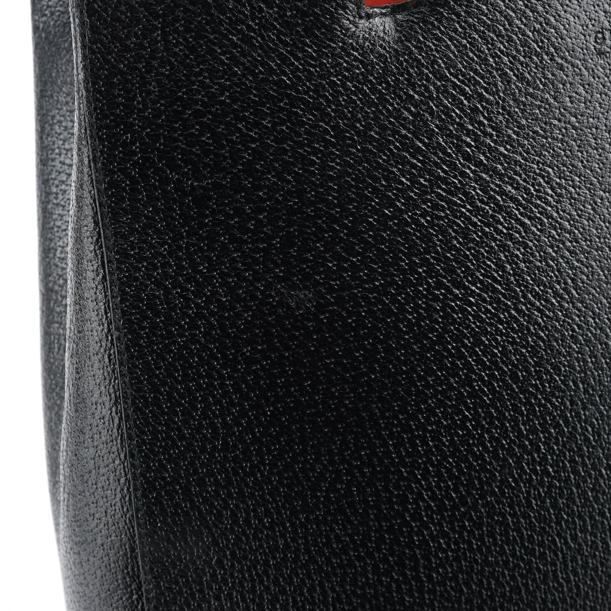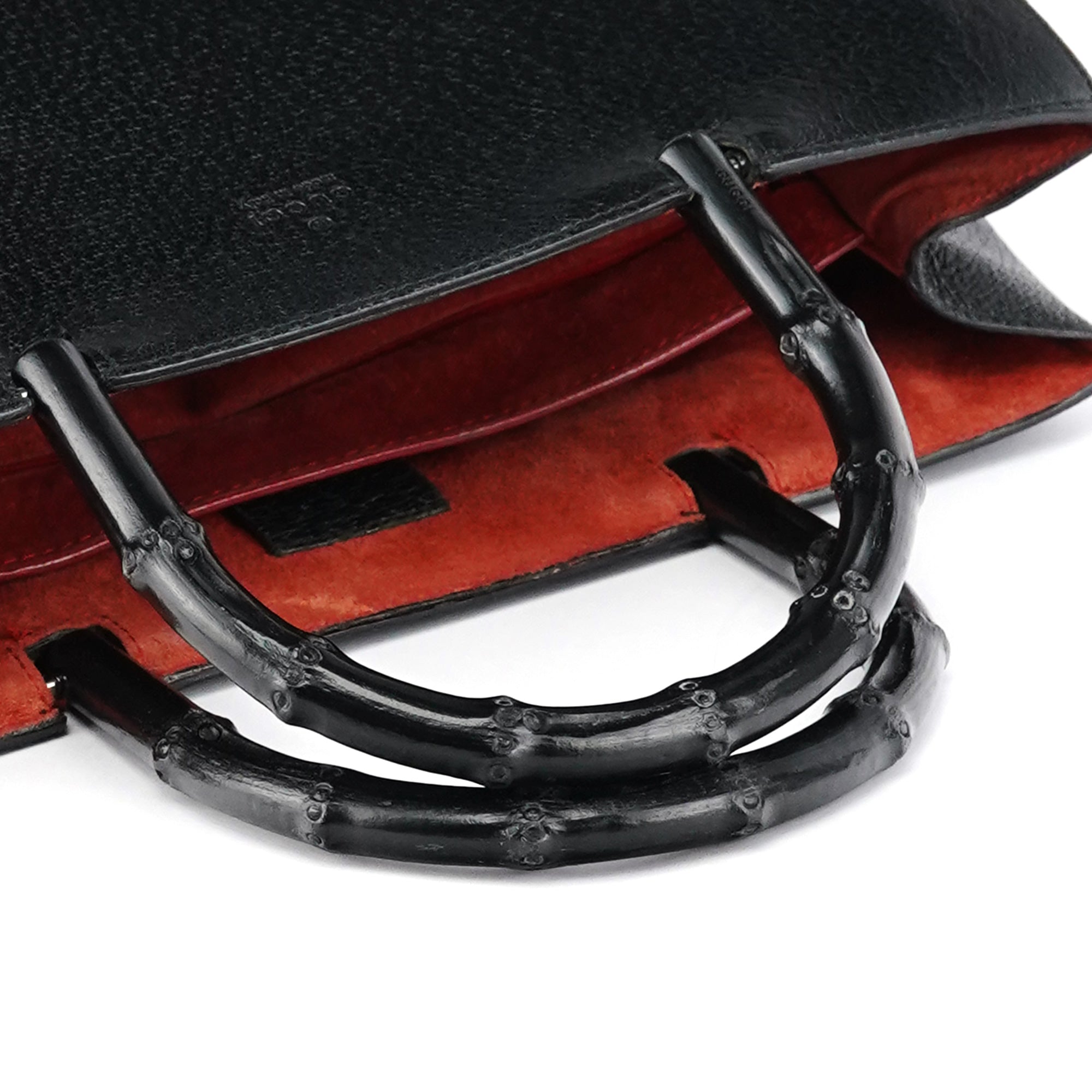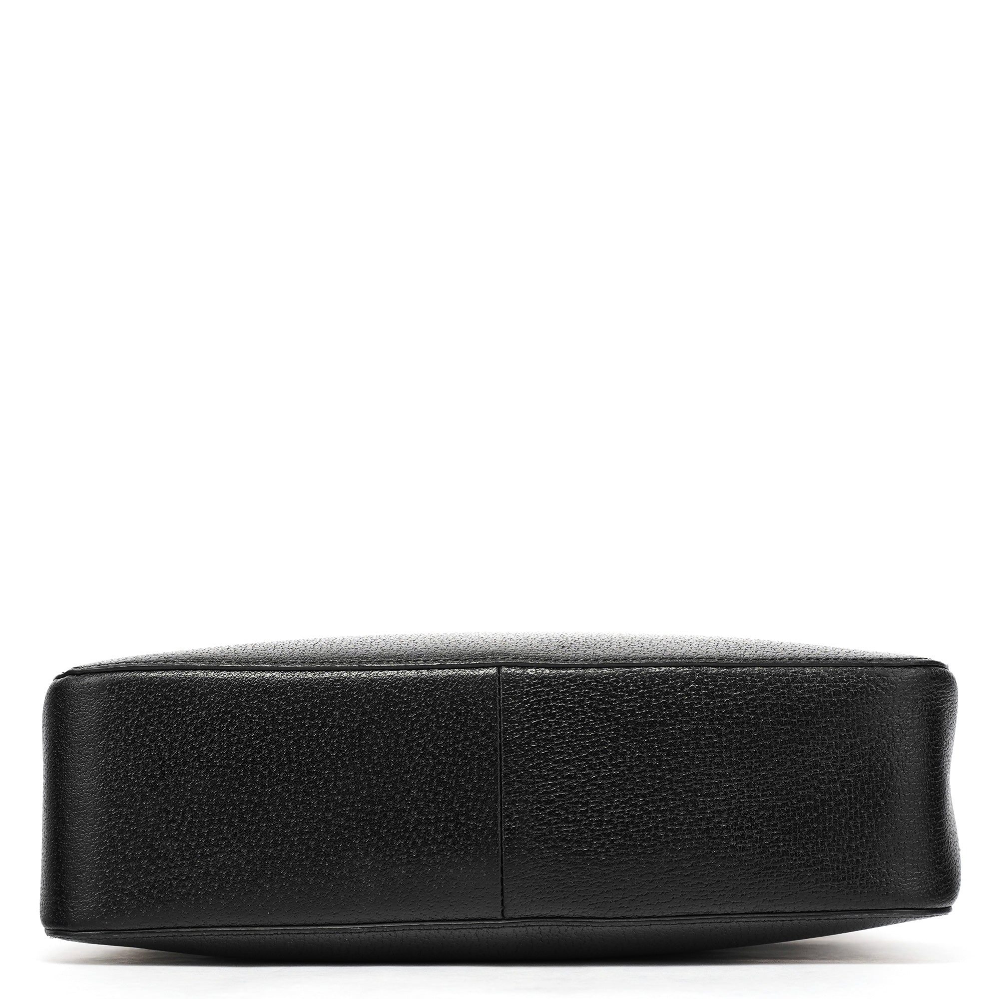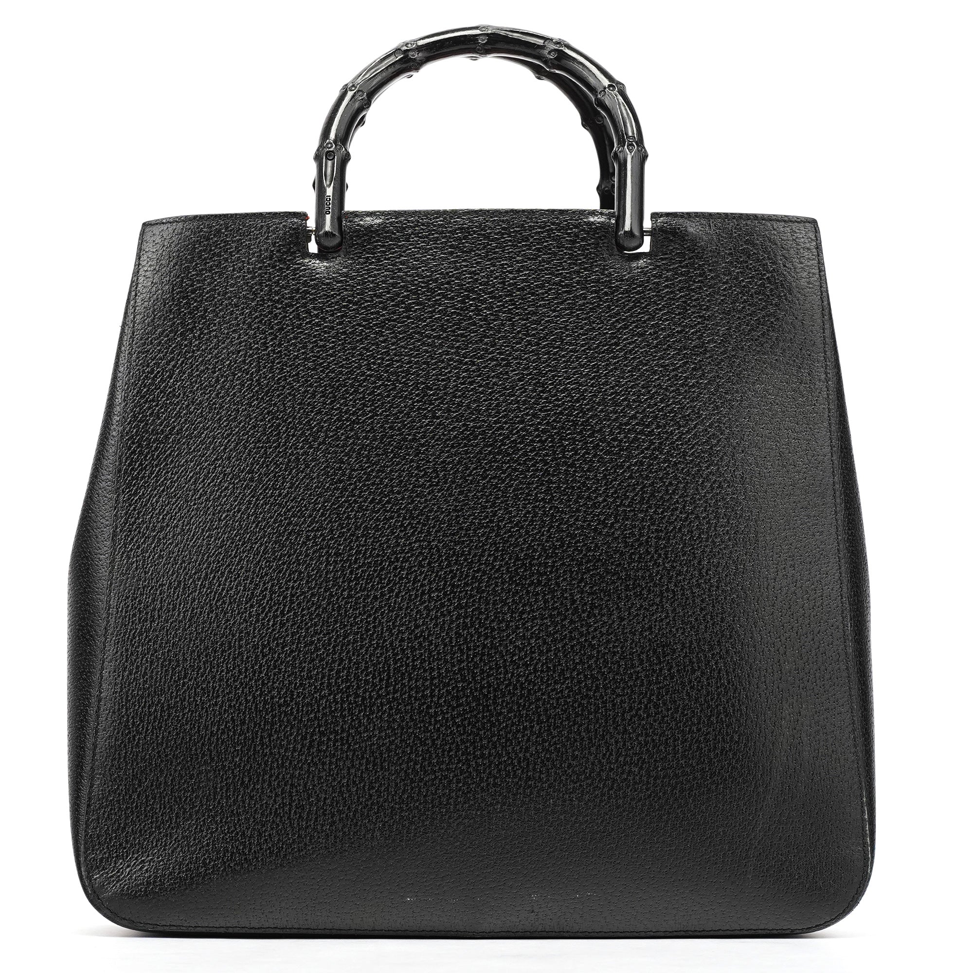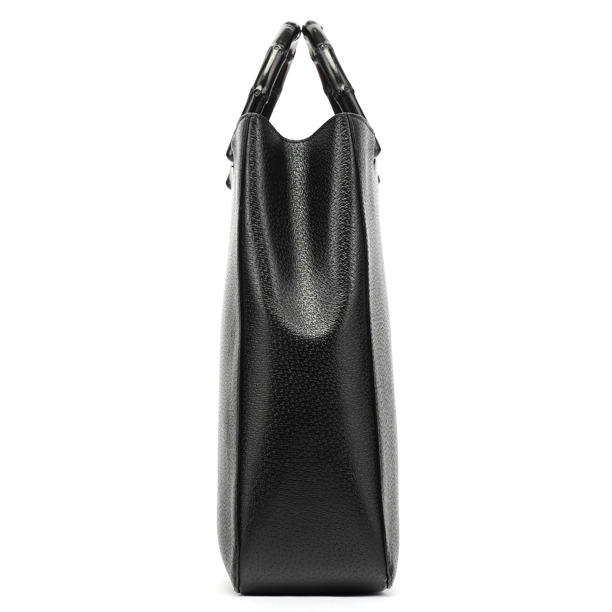 Designed in the early 2000s by Tom Ford, this vintage Gucci Bamboo tote features sleek black pebbled leather with the iconic bamboo handles that have defined this style since 1947. The structured tote silhouette showcases silver-tone hardware and the distinctive curved bamboo top handles wrapped in leather. The interior is lined in suede with pockets for organization.