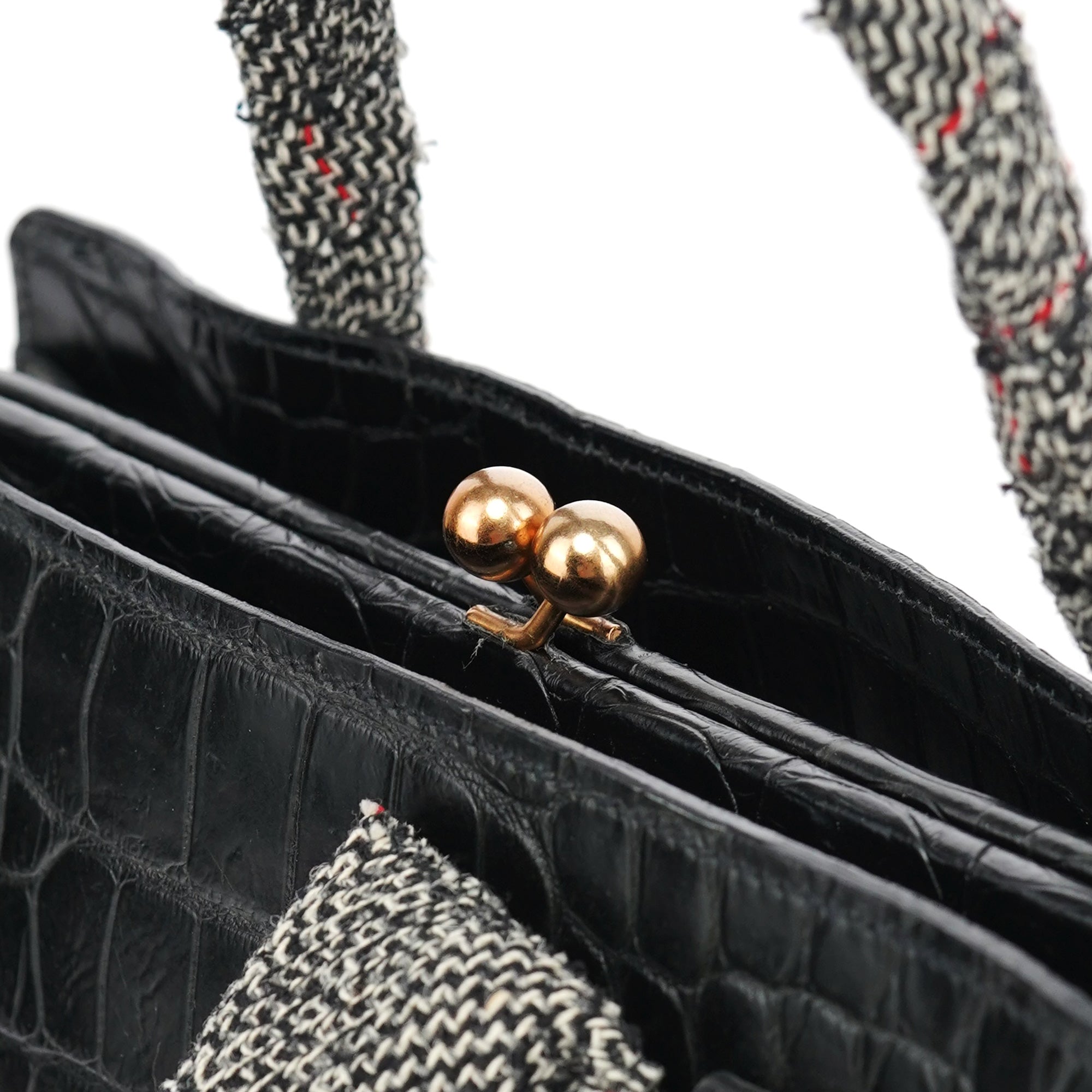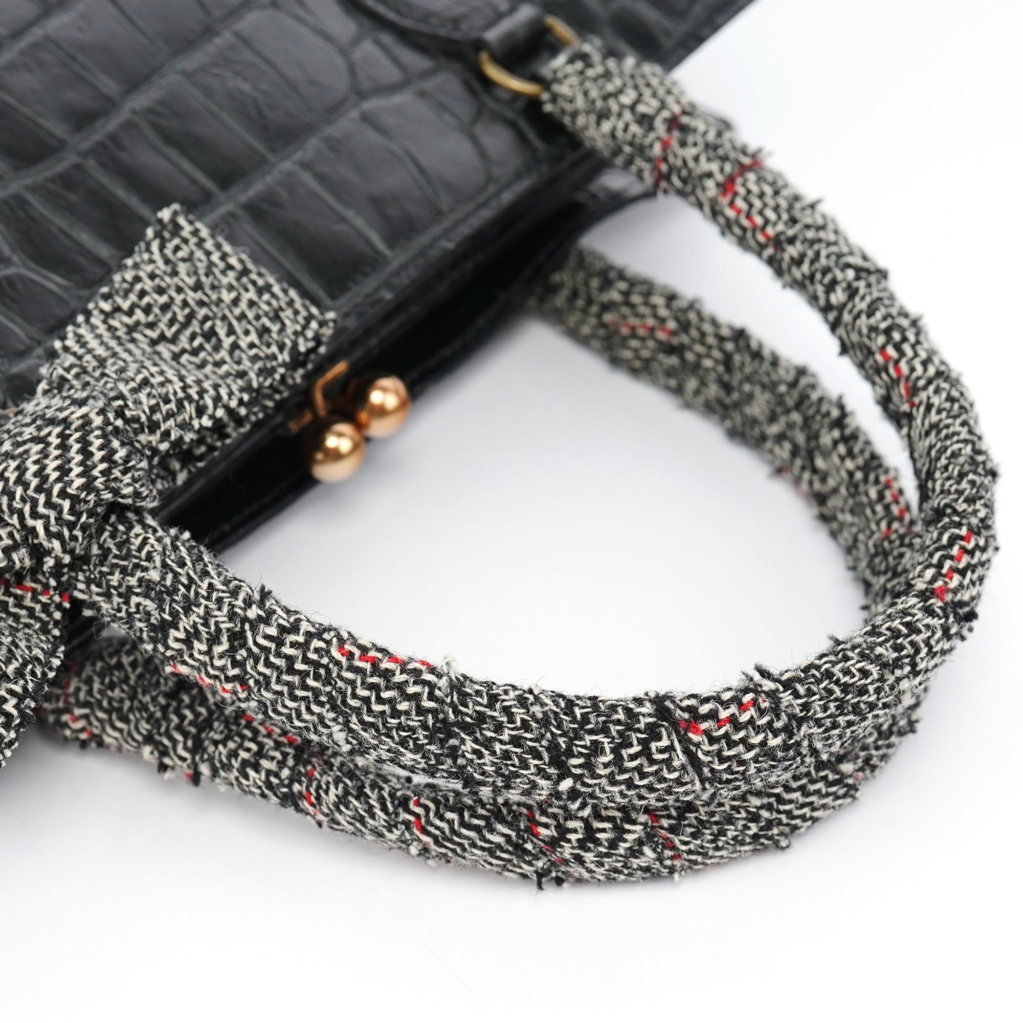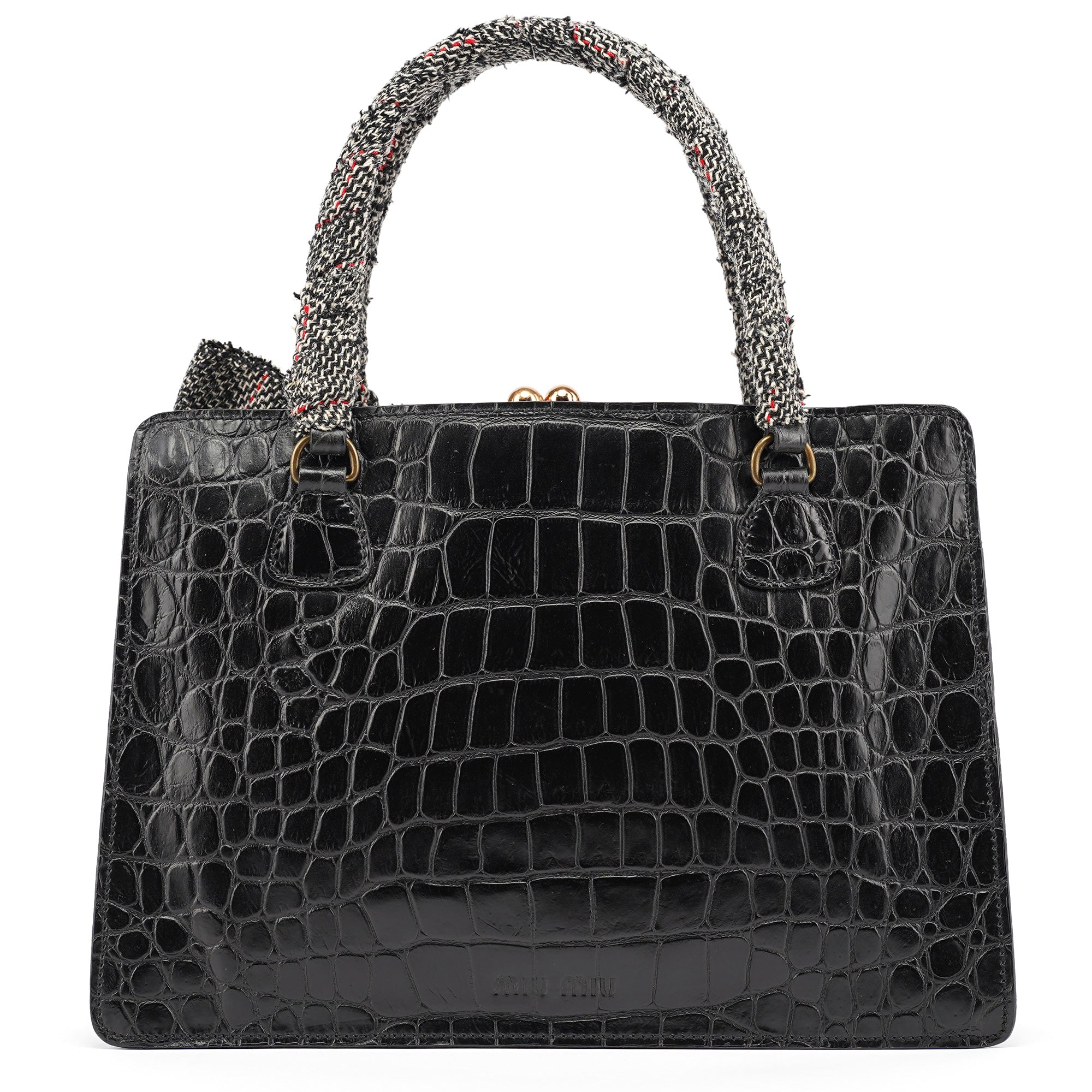 Designed in the late 1990s, this Miu Miu tote is crafted in crocodile-embossed leather with soft fabric-covered handles and a playful bow accent. The structured silhouette features a dual-ball kiss-lock frame opening, leading to a two-compartment interior lined in black canvas with a center zip pocket. A rare archival design blending ladylike structure with subversive detail.
