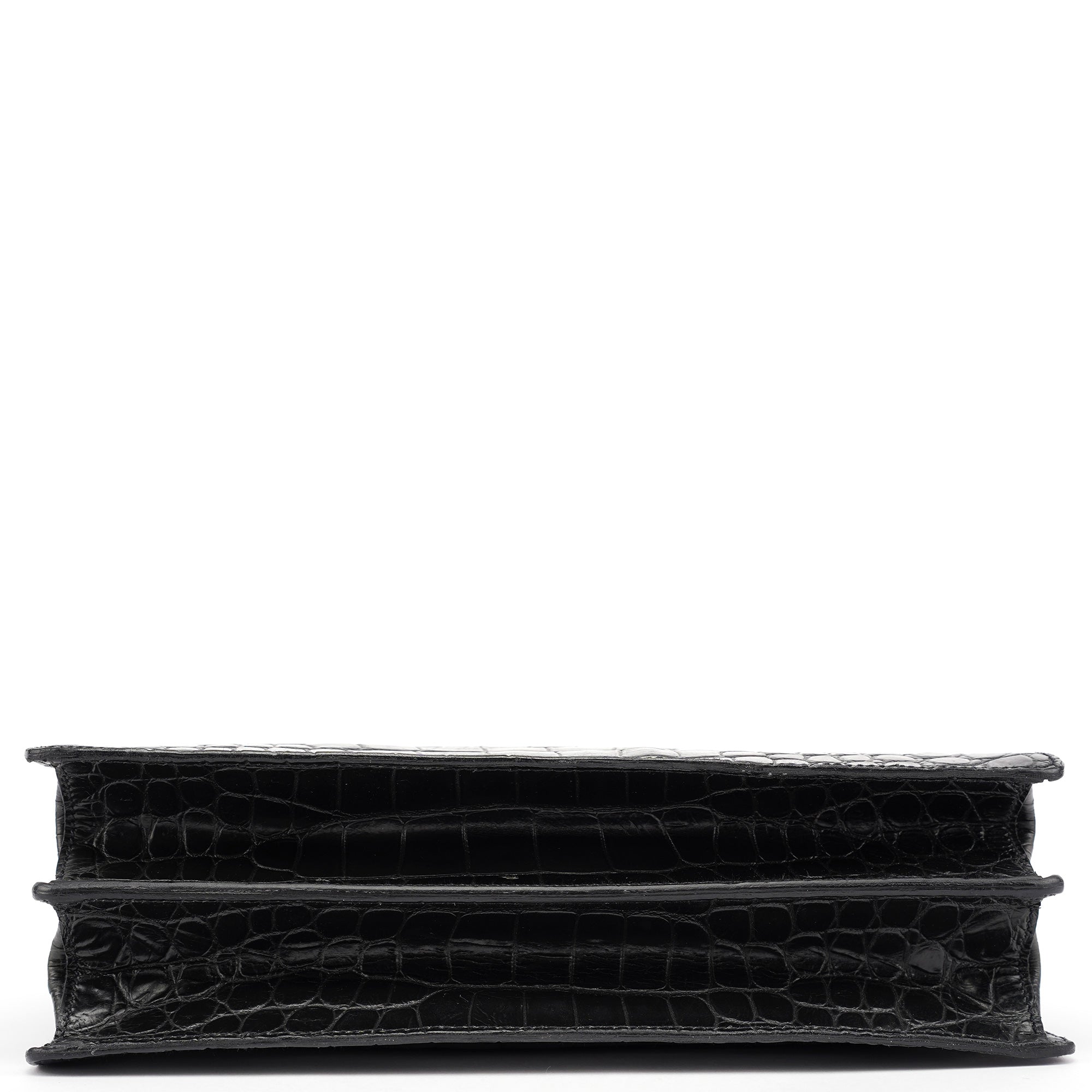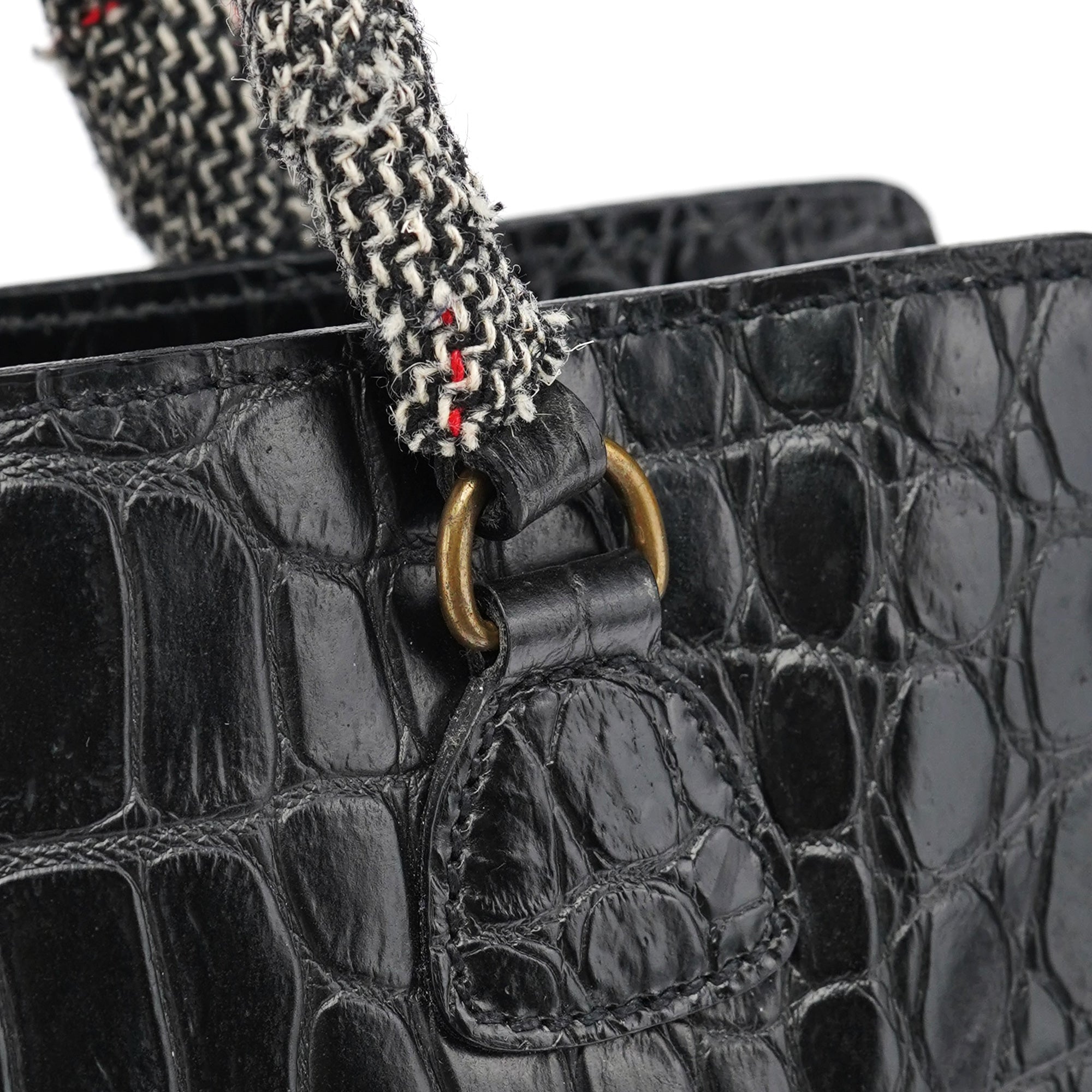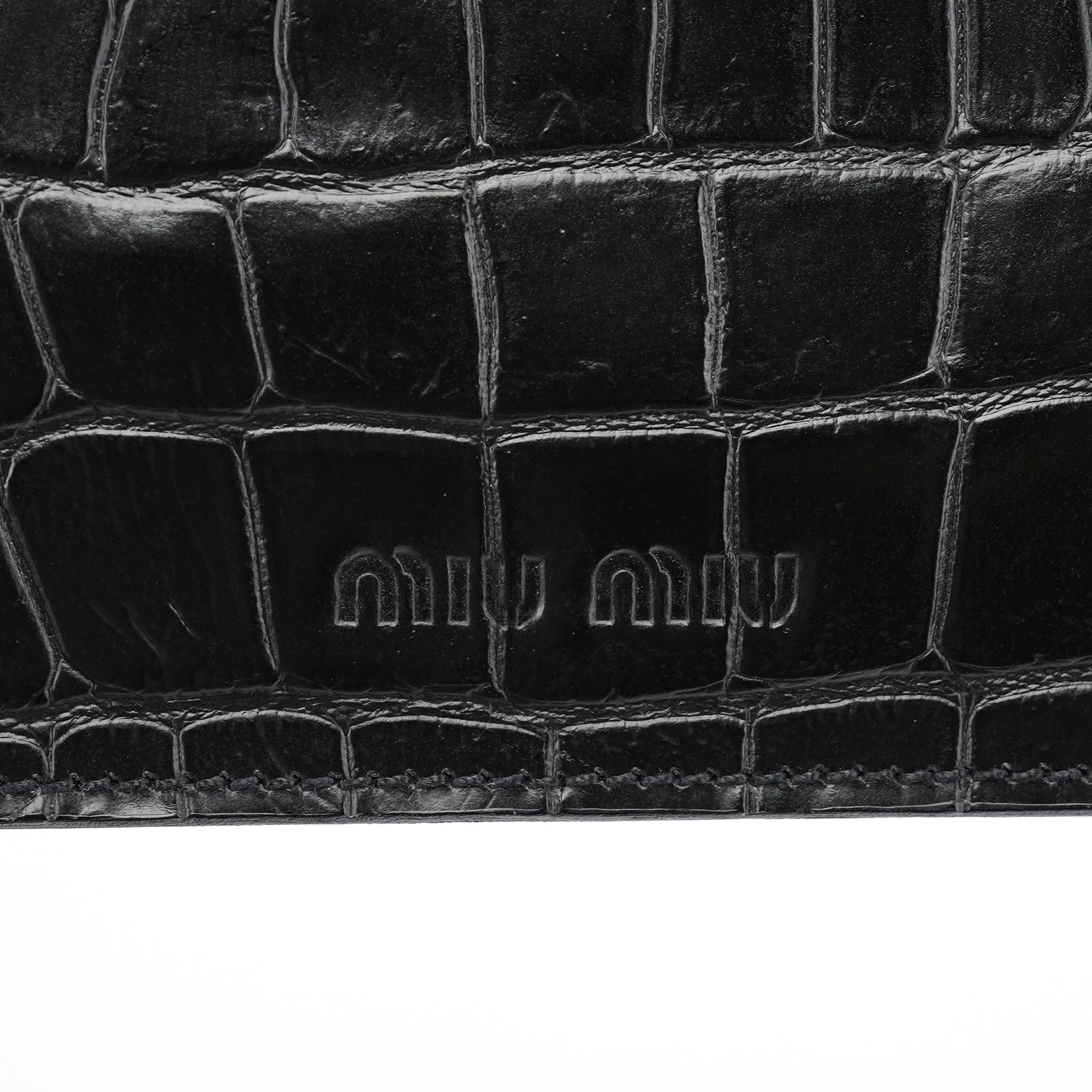 Designed in the late 1990s, this Miu Miu tote is crafted in crocodile-embossed leather with soft fabric-covered handles and a playful bow accent. The structured silhouette features a dual-ball kiss-lock frame opening, leading to a two-compartment interior lined in black canvas with a center zip pocket. A rare archival design blending ladylike structure with subversive detail.