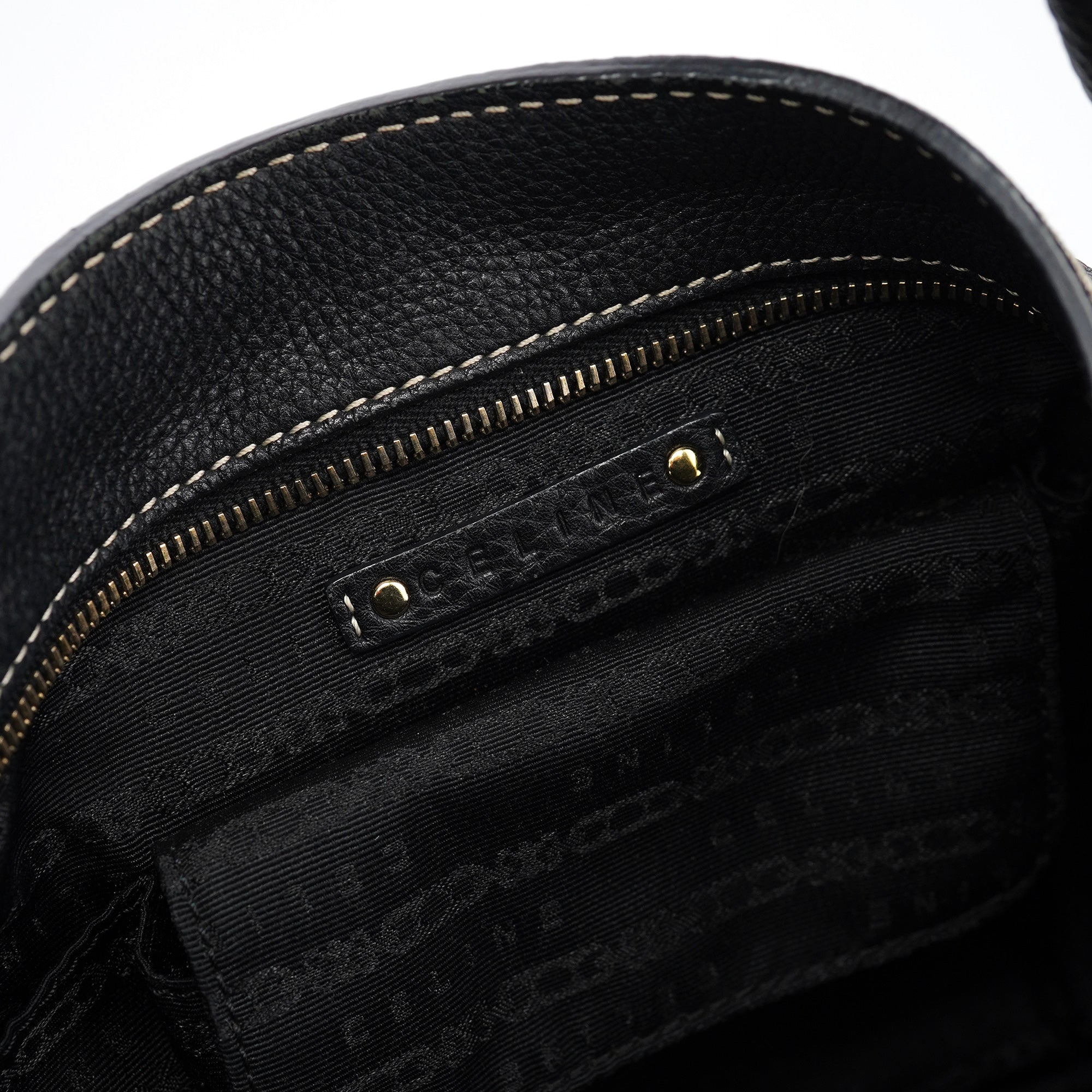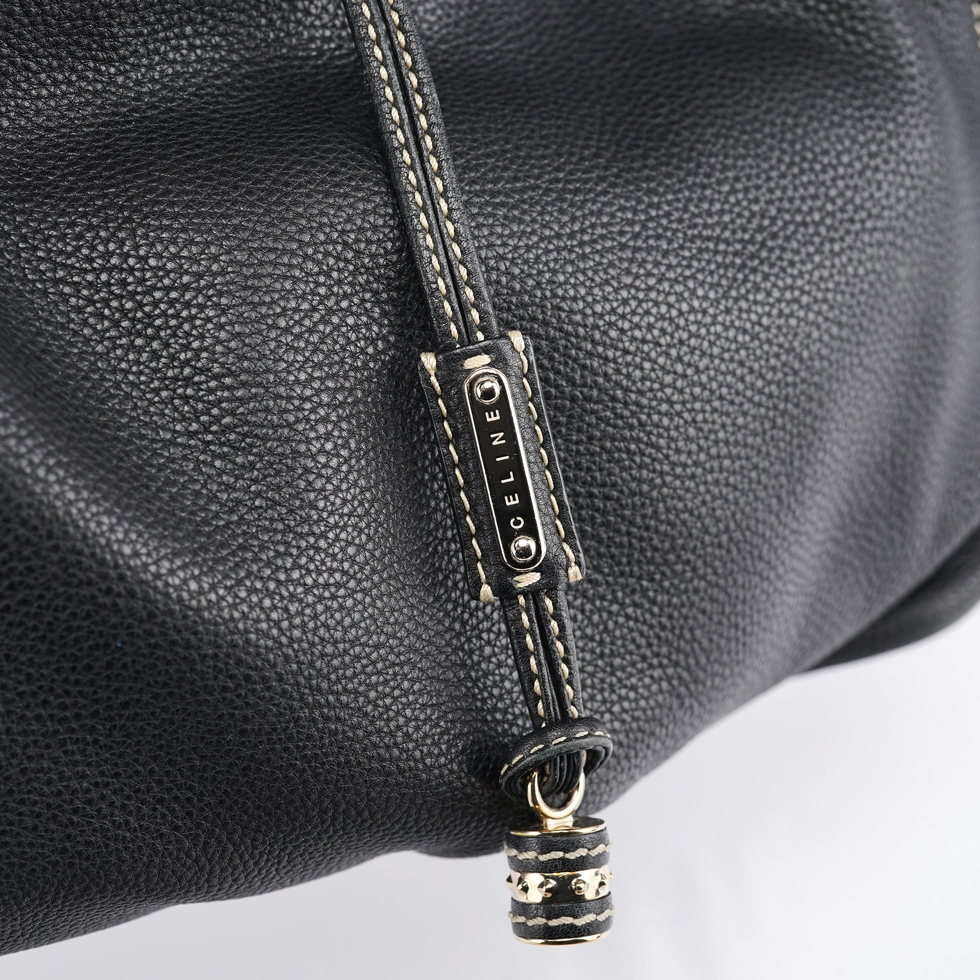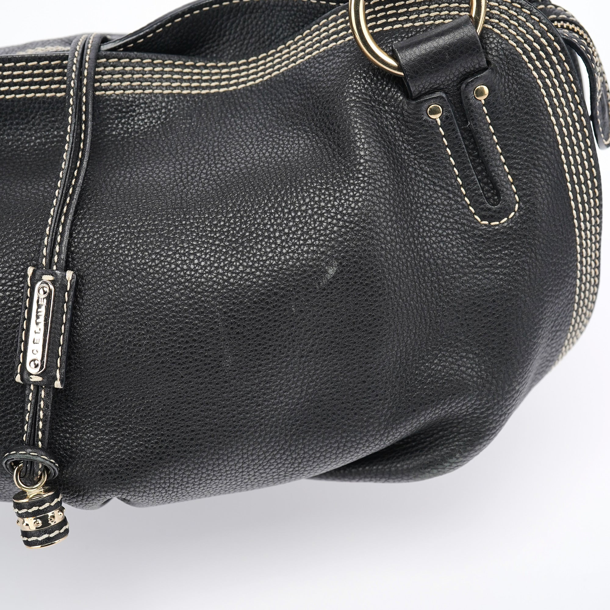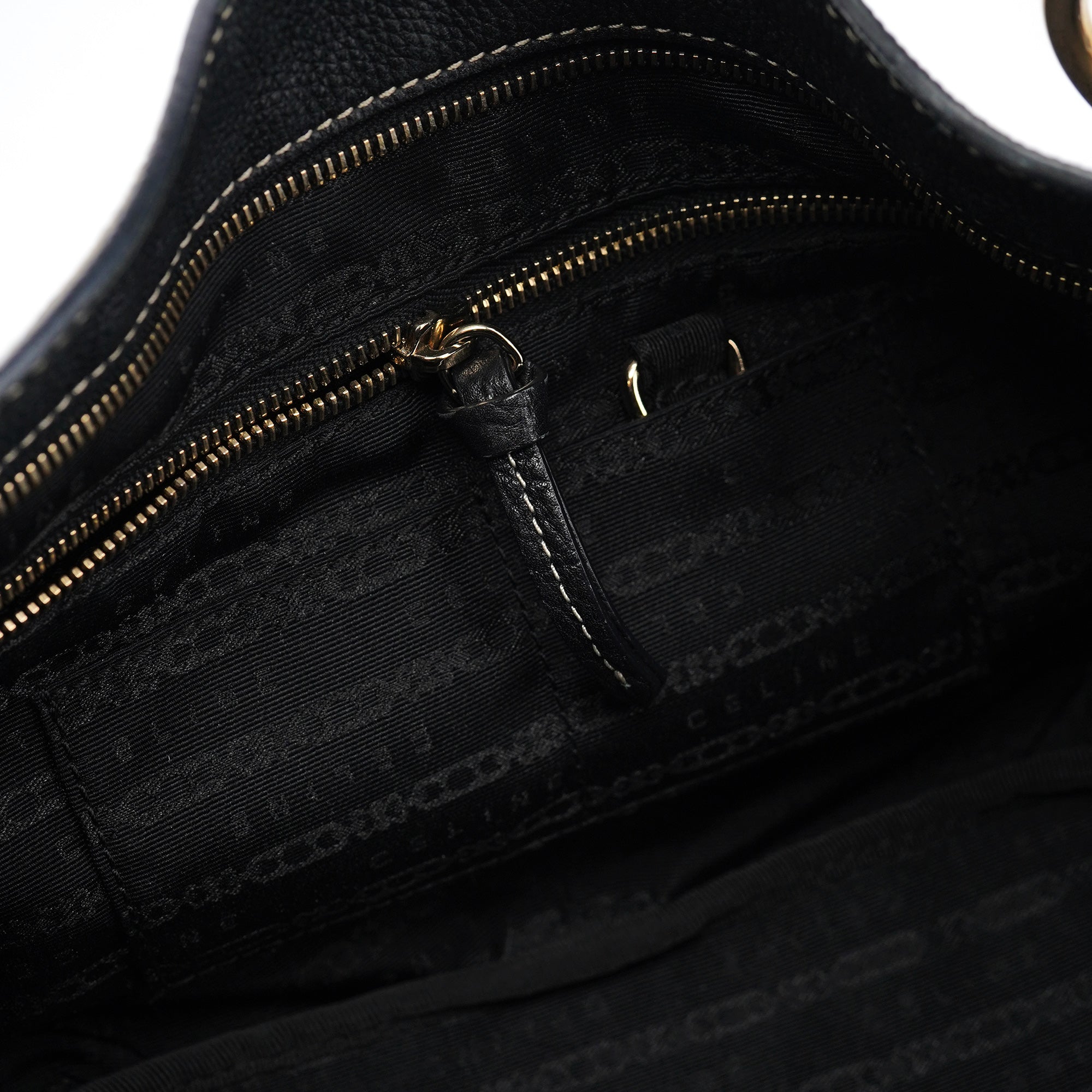 Designed in the early 2000s, this vintage Céline Bittersweet shoulder bag predates Phoebe Philo's transformative tenure at the house. Crafted in black pebbled leather with a distinctive rounded hobo silhouette, the bag features gold-tone hardware including ring attachments and a decorative padlock charm on the front zipper pull. The dual handles and spacious interior with multiple pockets—one zipper pocket, two open pockets, one flap pocket, and two pen pockets—make it both stylish and functional.