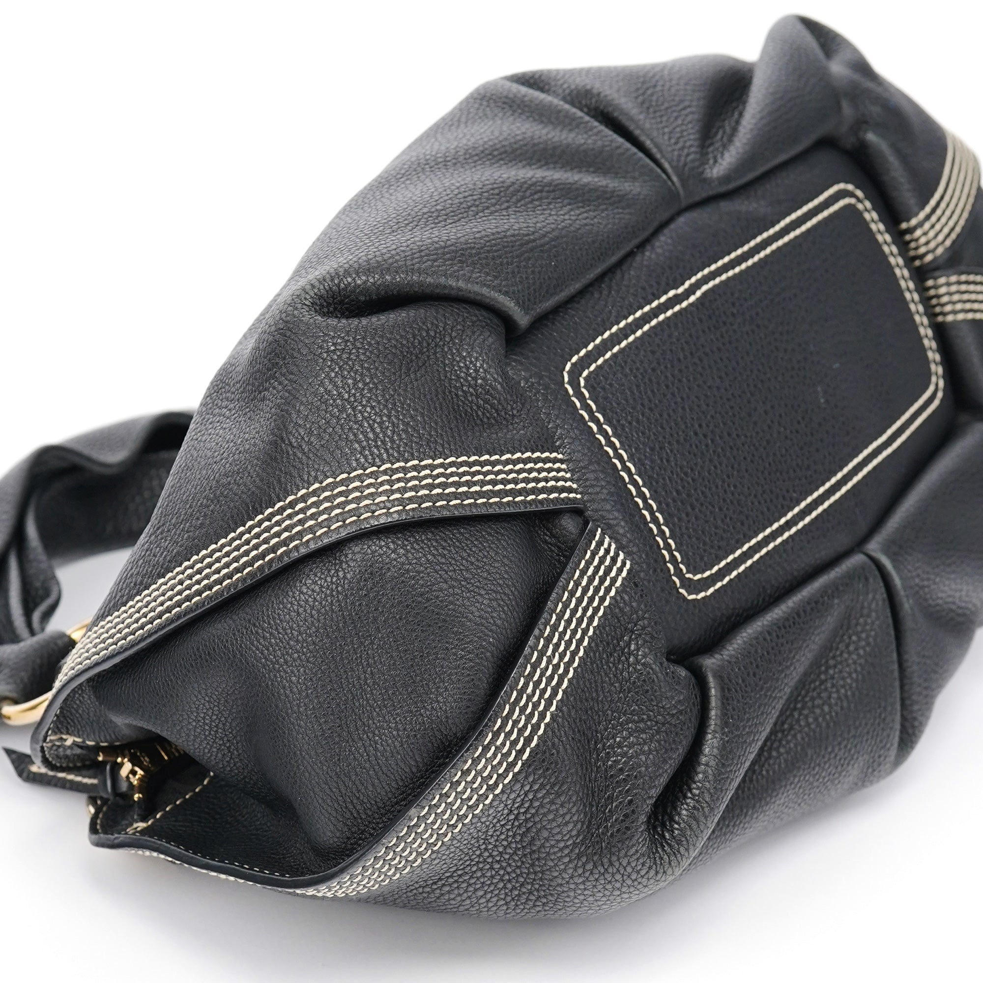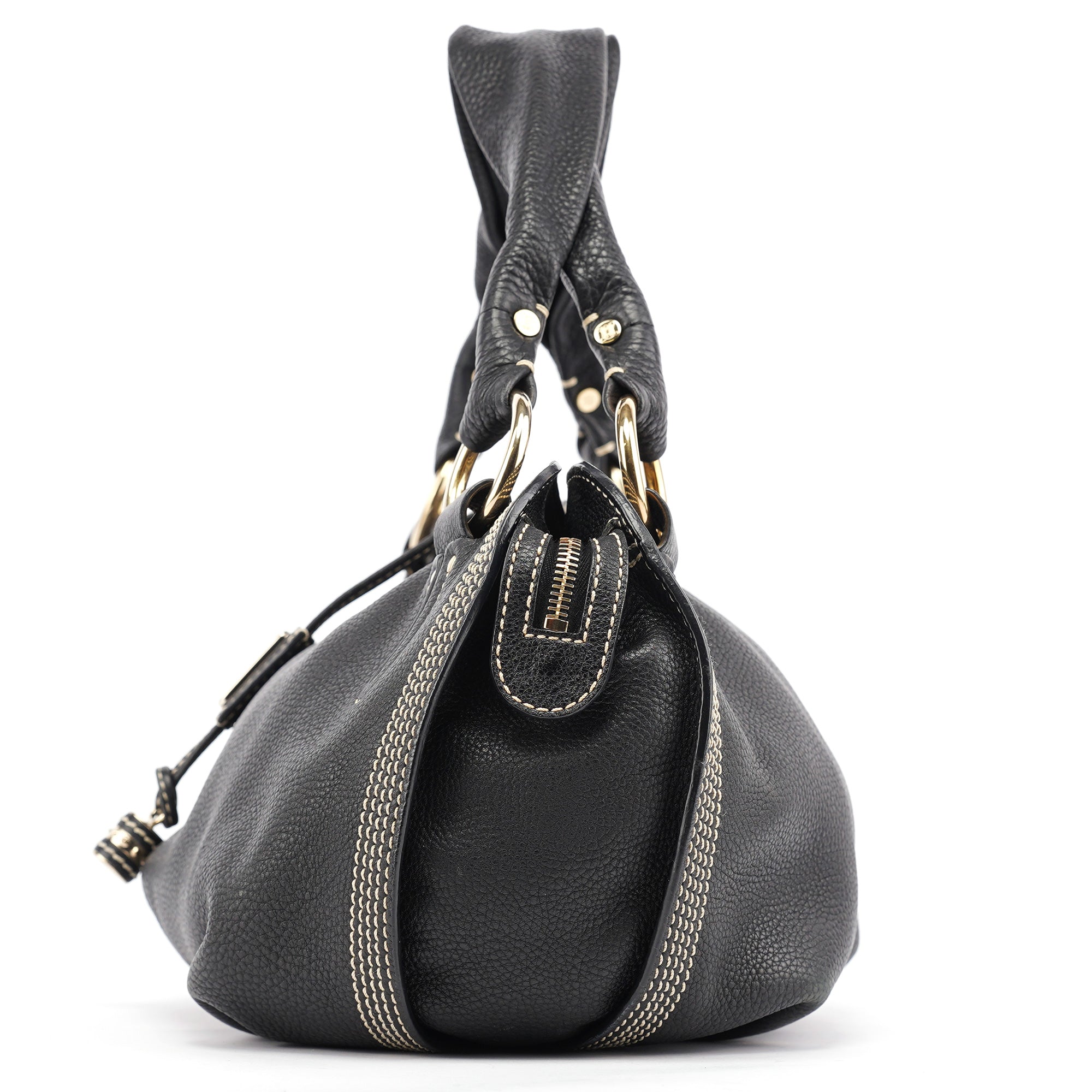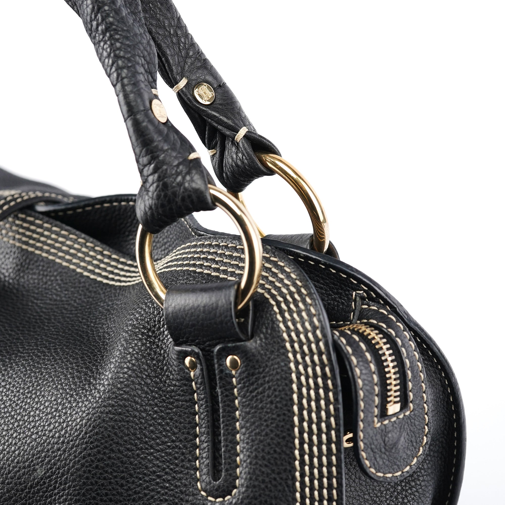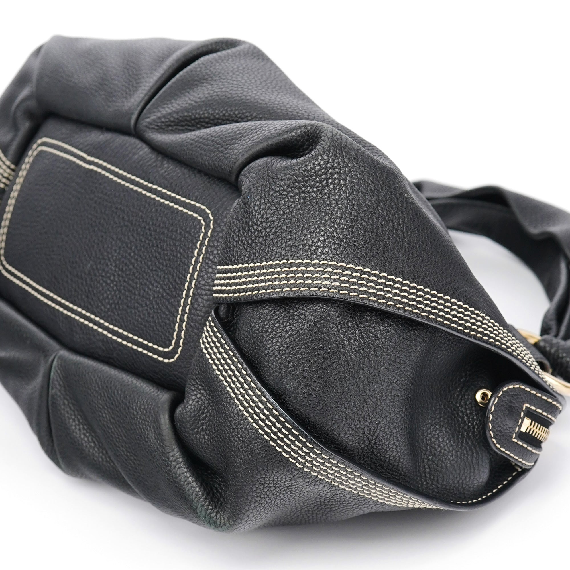 Designed in the early 2000s, this vintage Céline Bittersweet shoulder bag predates Phoebe Philo's transformative tenure at the house. Crafted in black pebbled leather with a distinctive rounded hobo silhouette, the bag features gold-tone hardware including ring attachments and a decorative padlock charm on the front zipper pull. The dual handles and spacious interior with multiple pockets—one zipper pocket, two open pockets, one flap pocket, and two pen pockets—make it both stylish and functional.
