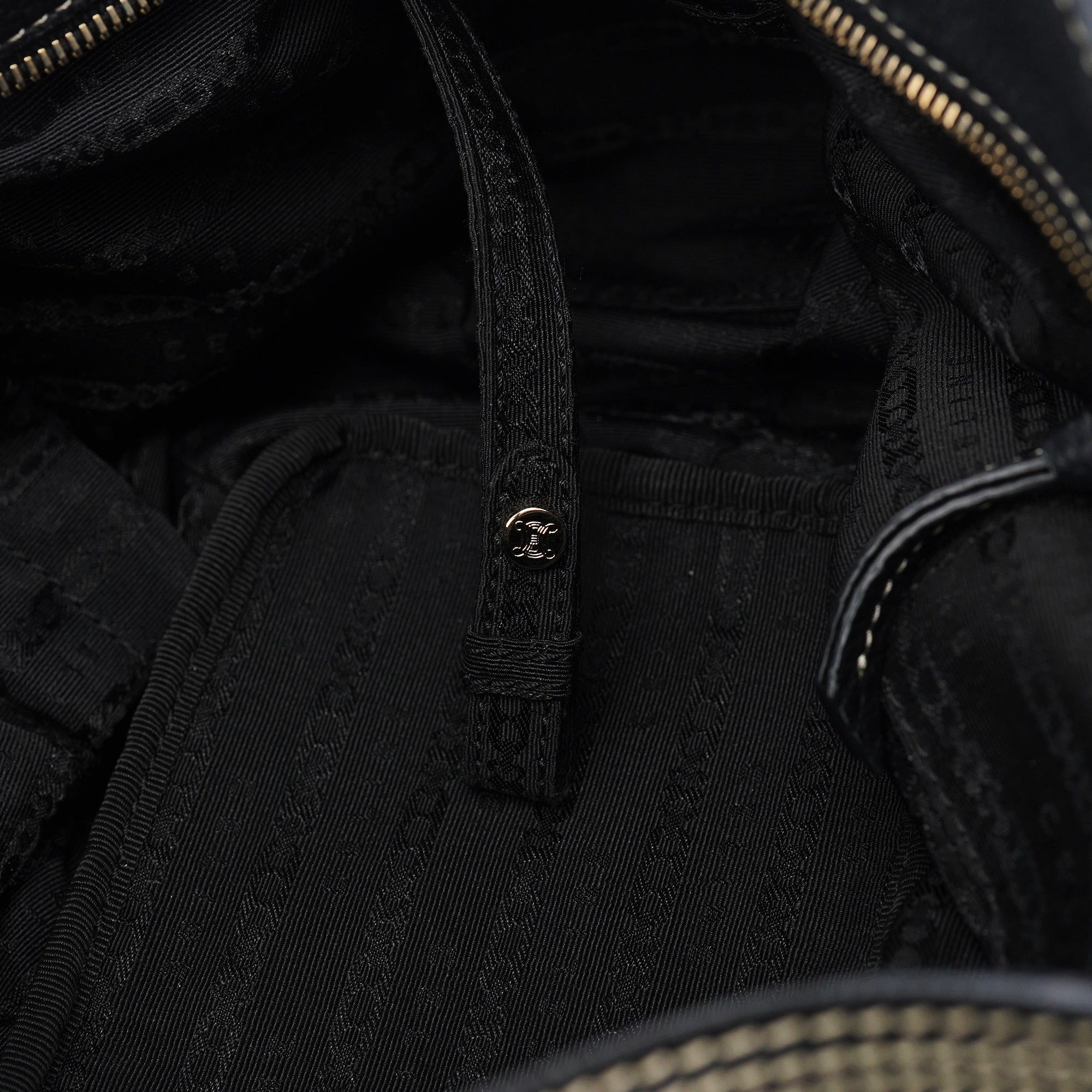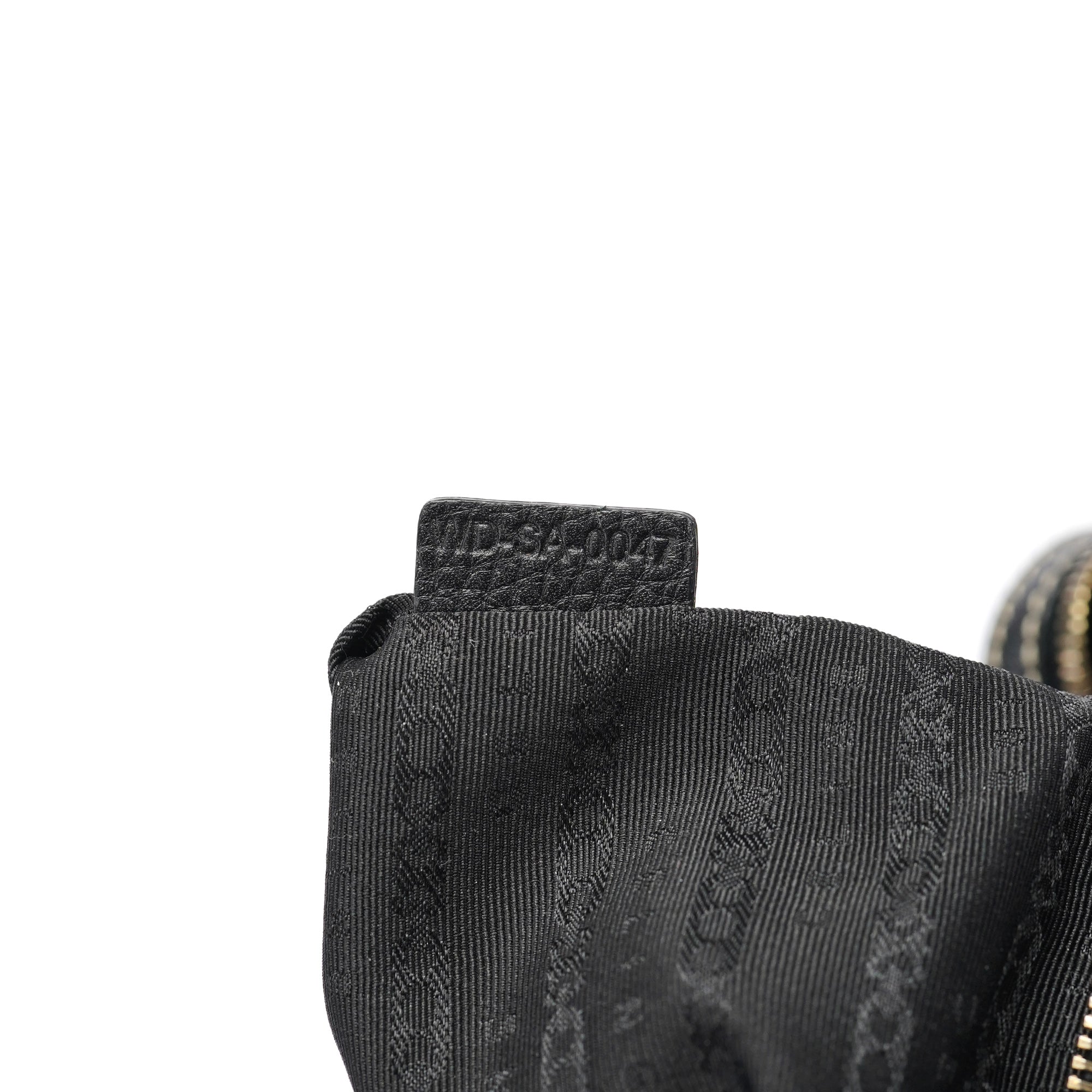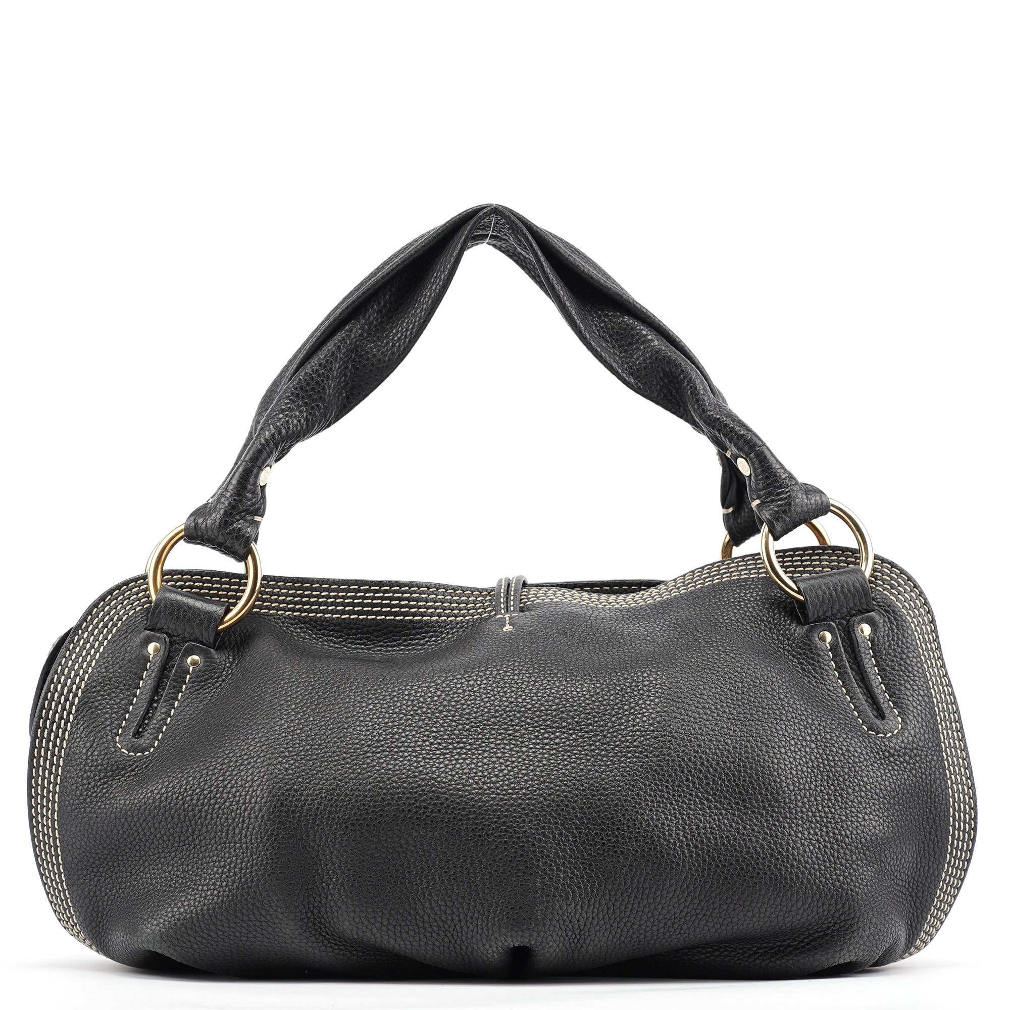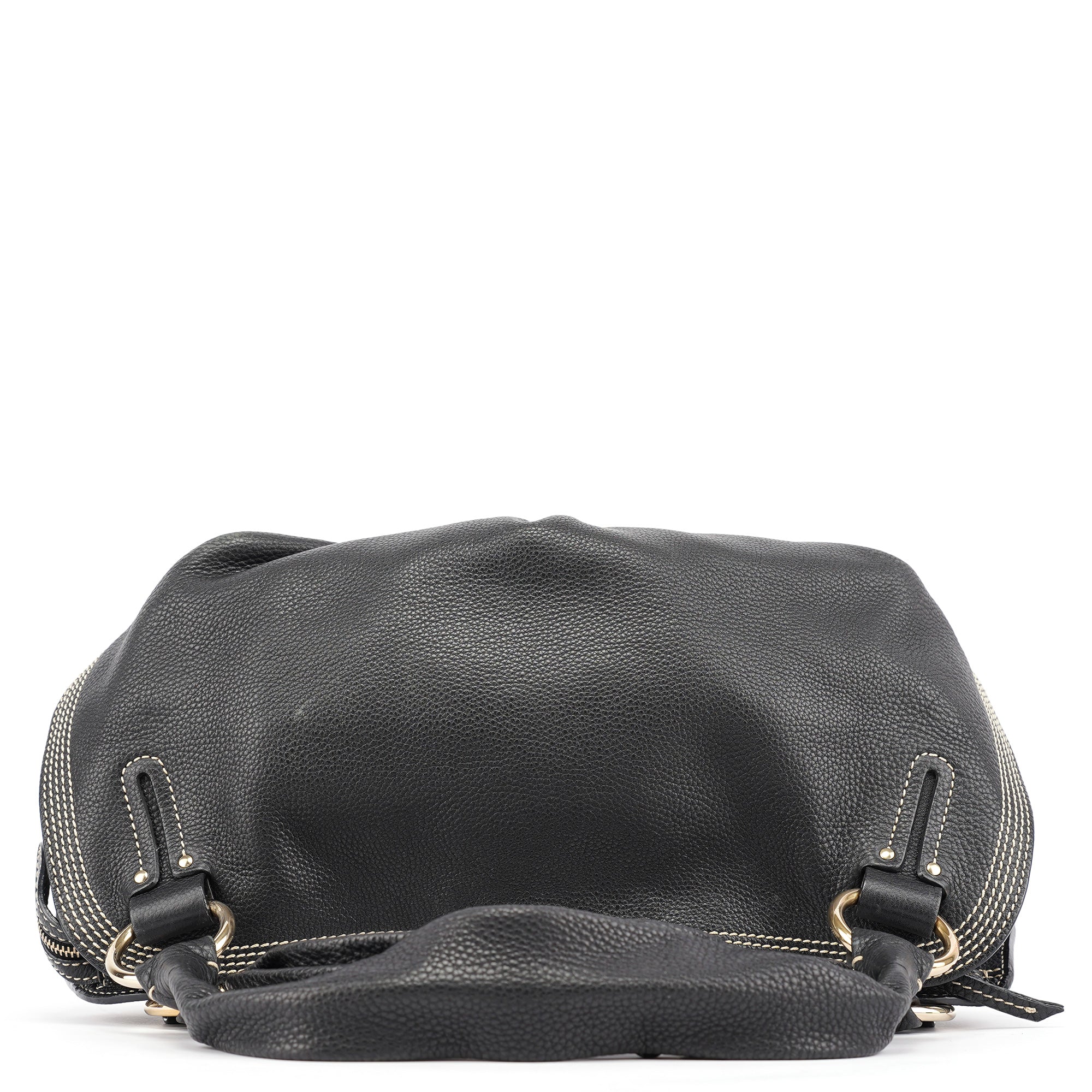 Designed in the early 2000s, this vintage Céline Bittersweet shoulder bag predates Phoebe Philo's transformative tenure at the house. Crafted in black pebbled leather with a distinctive rounded hobo silhouette, the bag features gold-tone hardware including ring attachments and a decorative padlock charm on the front zipper pull. The dual handles and spacious interior with multiple pockets—one zipper pocket, two open pockets, one flap pocket, and two pen pockets—make it both stylish and functional.