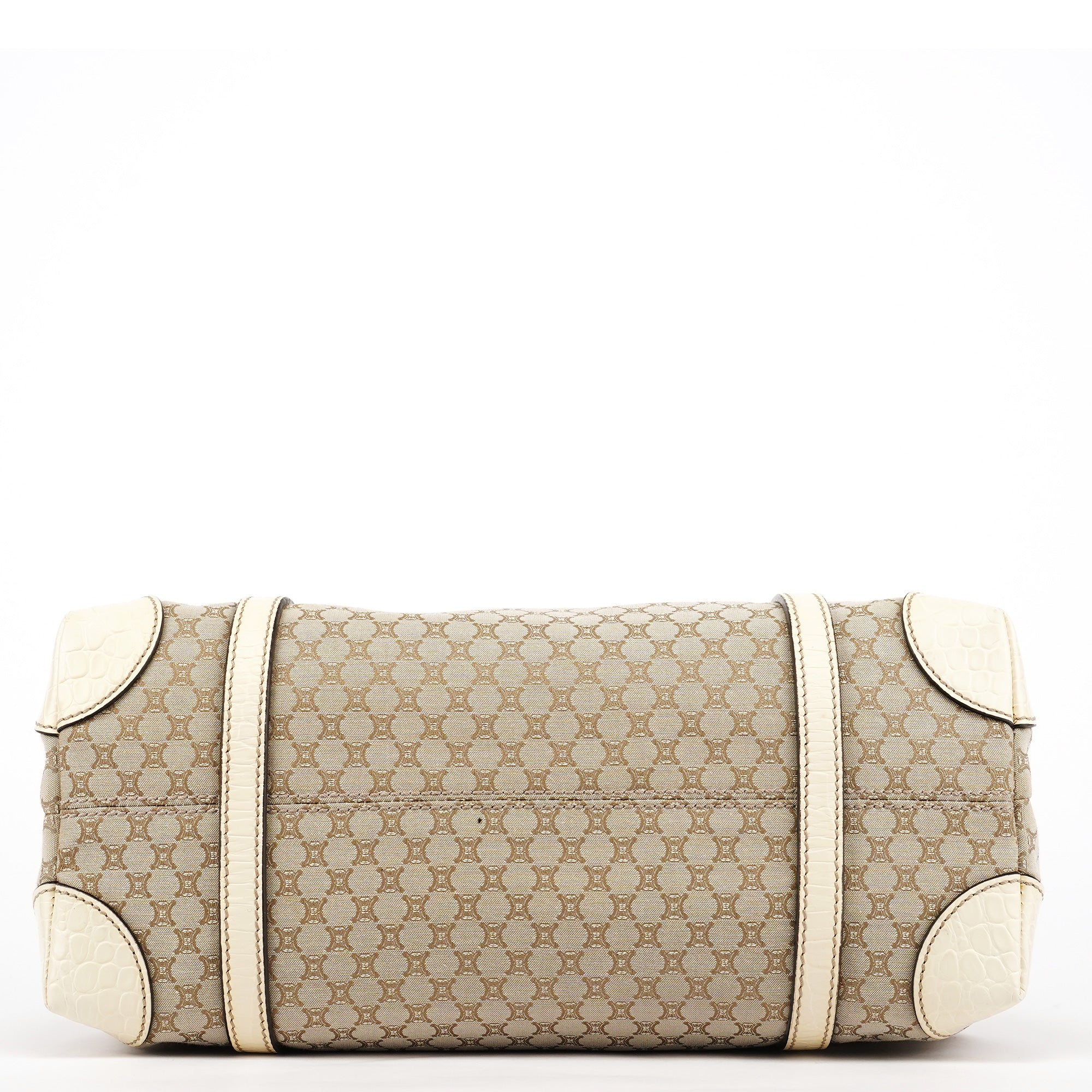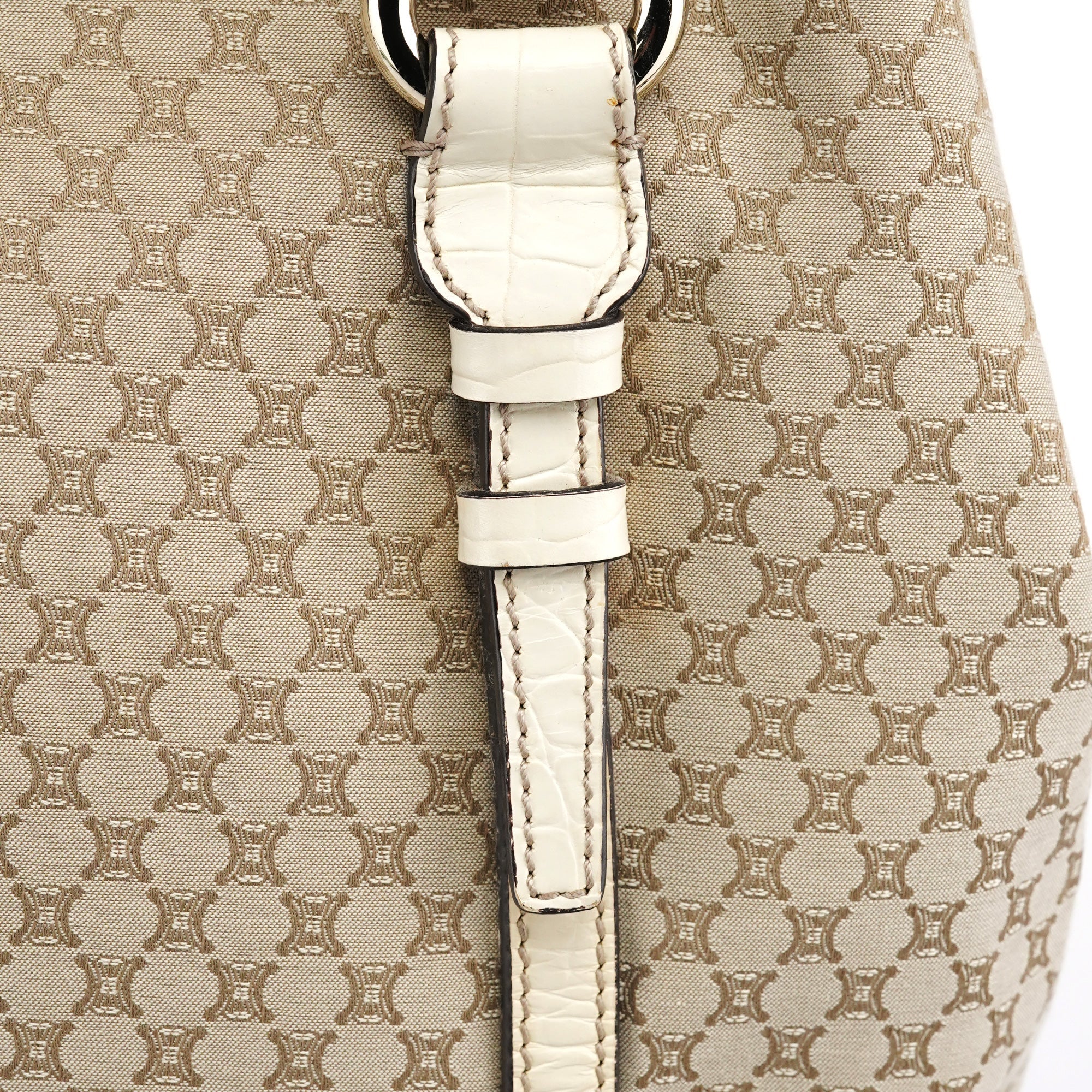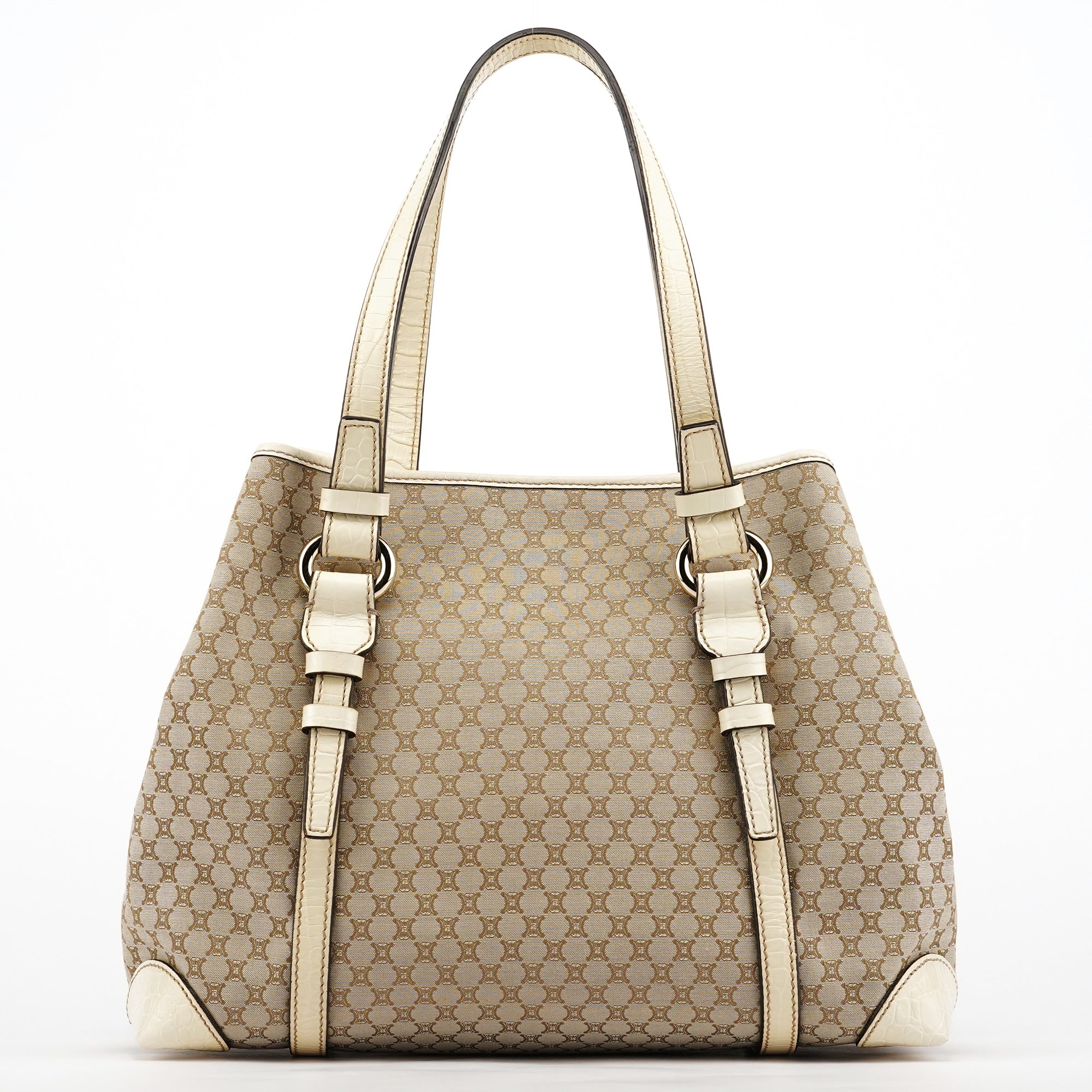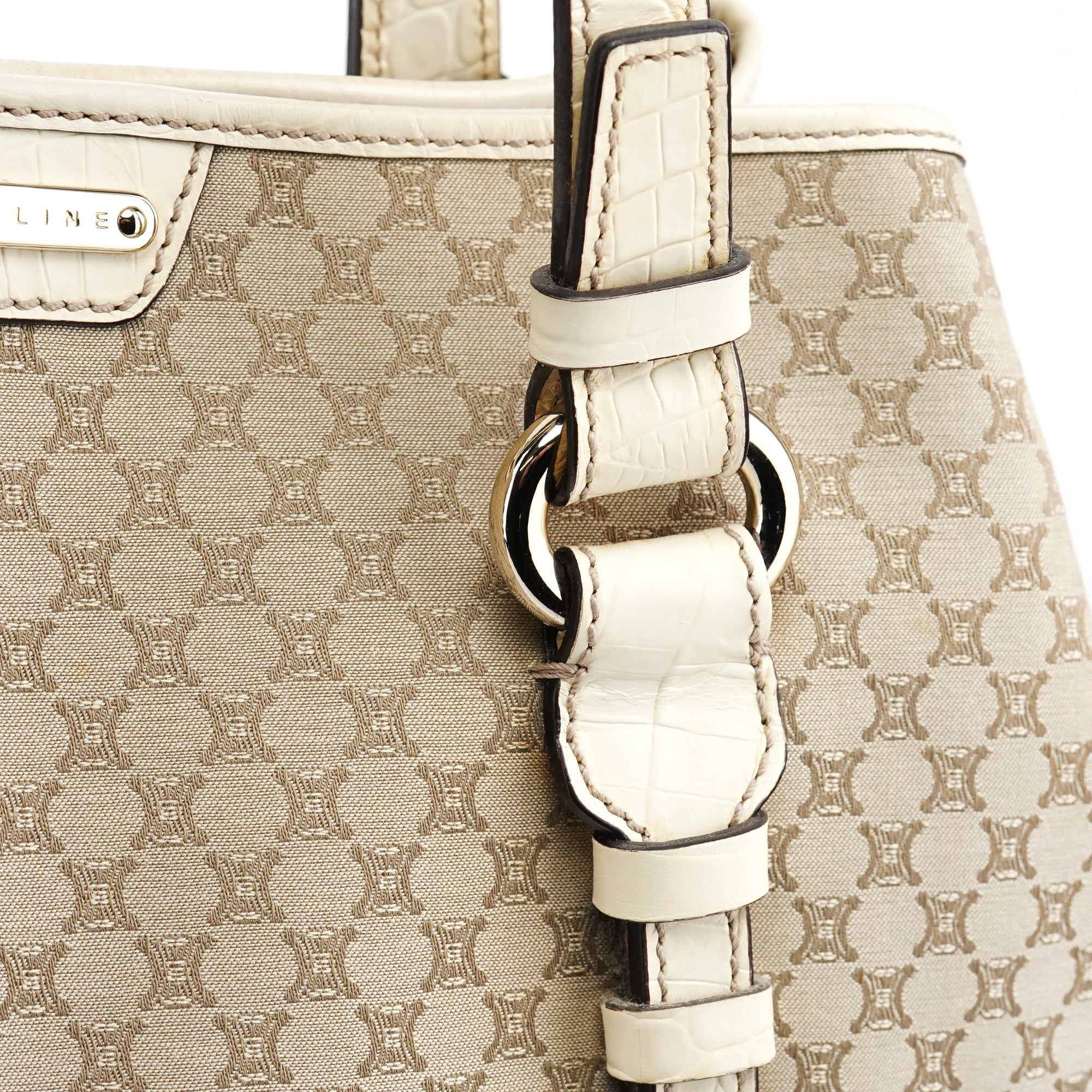Designed in the late 1990s, this Celine tote bag is handcrafted from beige Triomphe monogram canvas with croc-embossed leather trim. Featuring silver-tone hardware, a magnetic closure, and a cotton-lined interior with a zipper pocket, it is finished with a signature Celine logo plate on the front, combining timeless style with practicality.