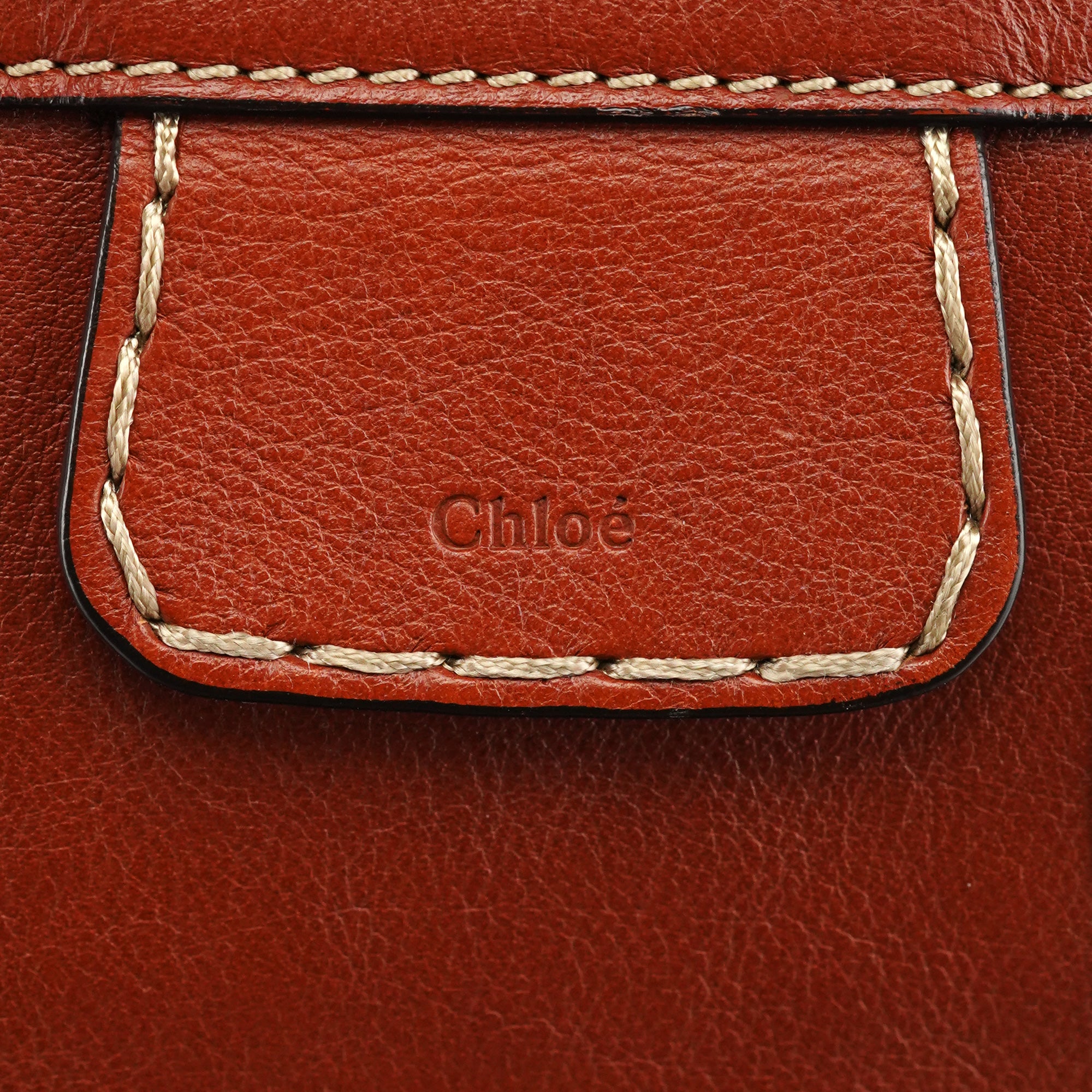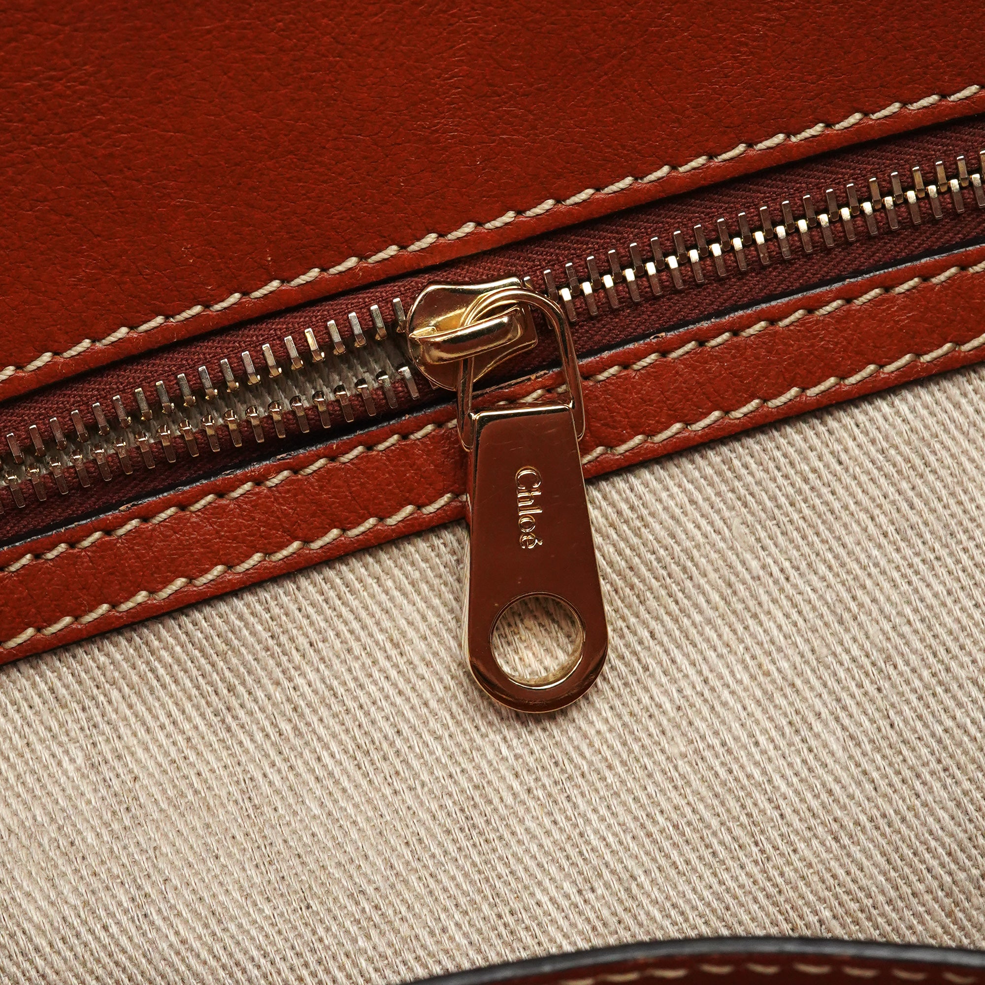 Designed in the 2020s, this Chloé Edith tote is crafted in smooth cognac leather with contrast topstitching, rounded top handles, and a structured everyday silhouette, finished with a canvas-lined interior and gold-tone zip detailing.