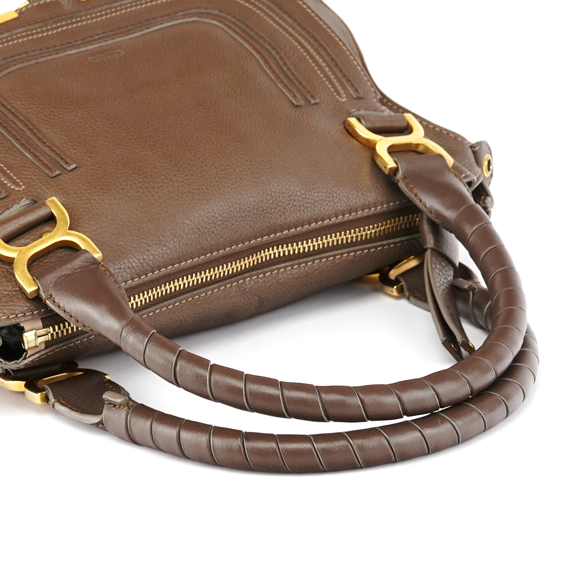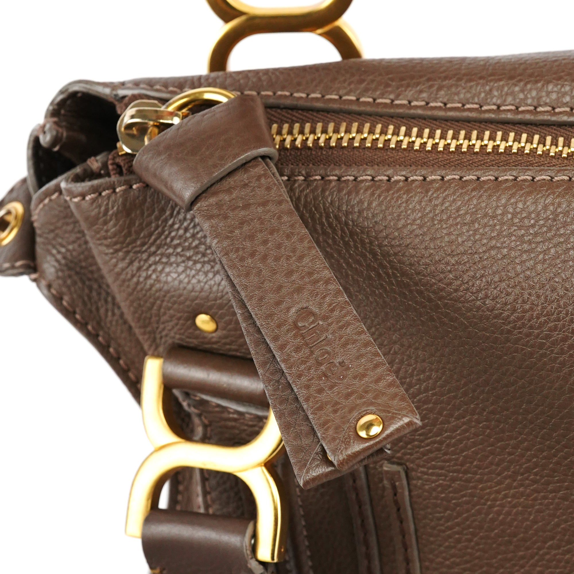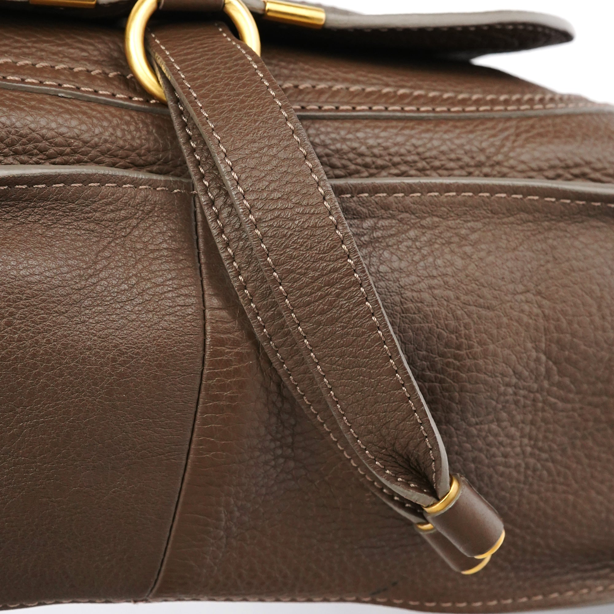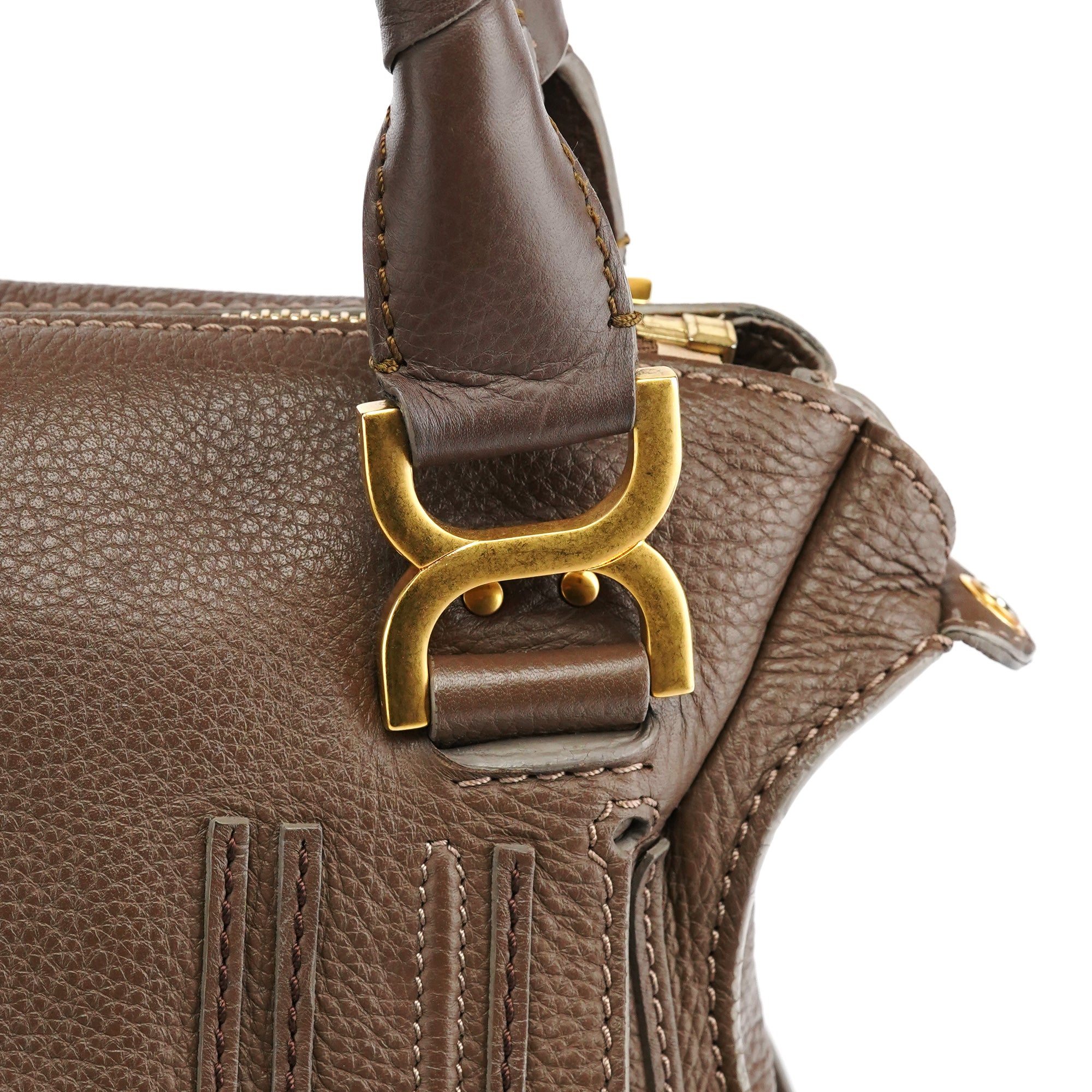 Designed in 2010 by Hannah MacGibbon, this vintage Chloé Marcie is crafted in rich brown grained leather with the model’s signature saddle-stitch detailing, curved front flap, and horseshoe-inspired paneling. Finished with gold-tone hardware, braided top handles, a detachable shoulder strap, and the line’s characteristic bohemian silhouette.