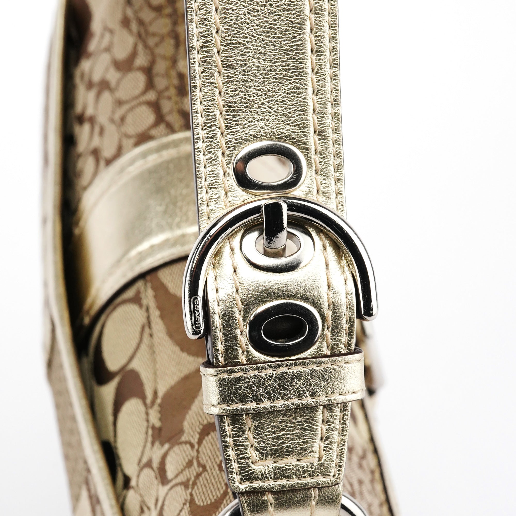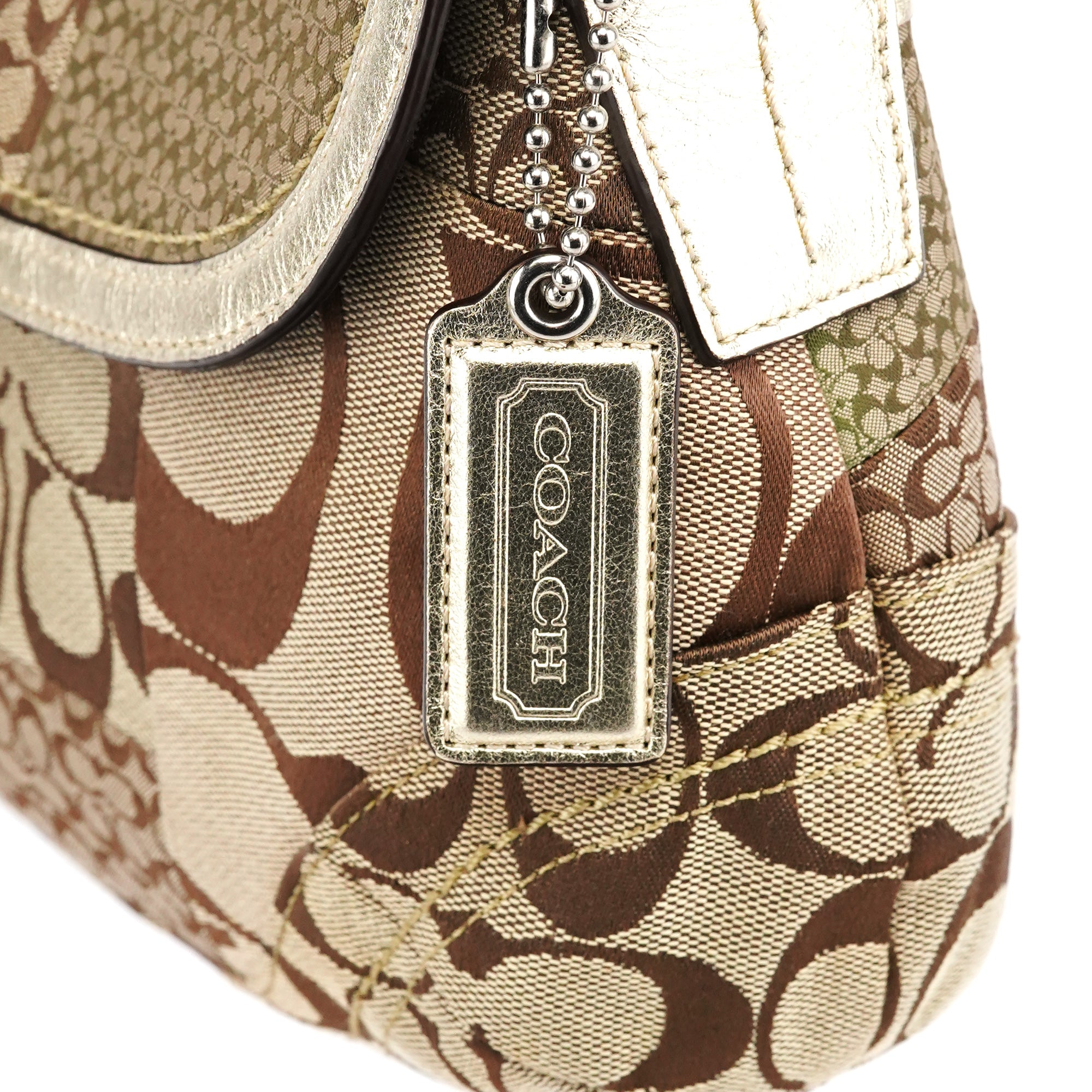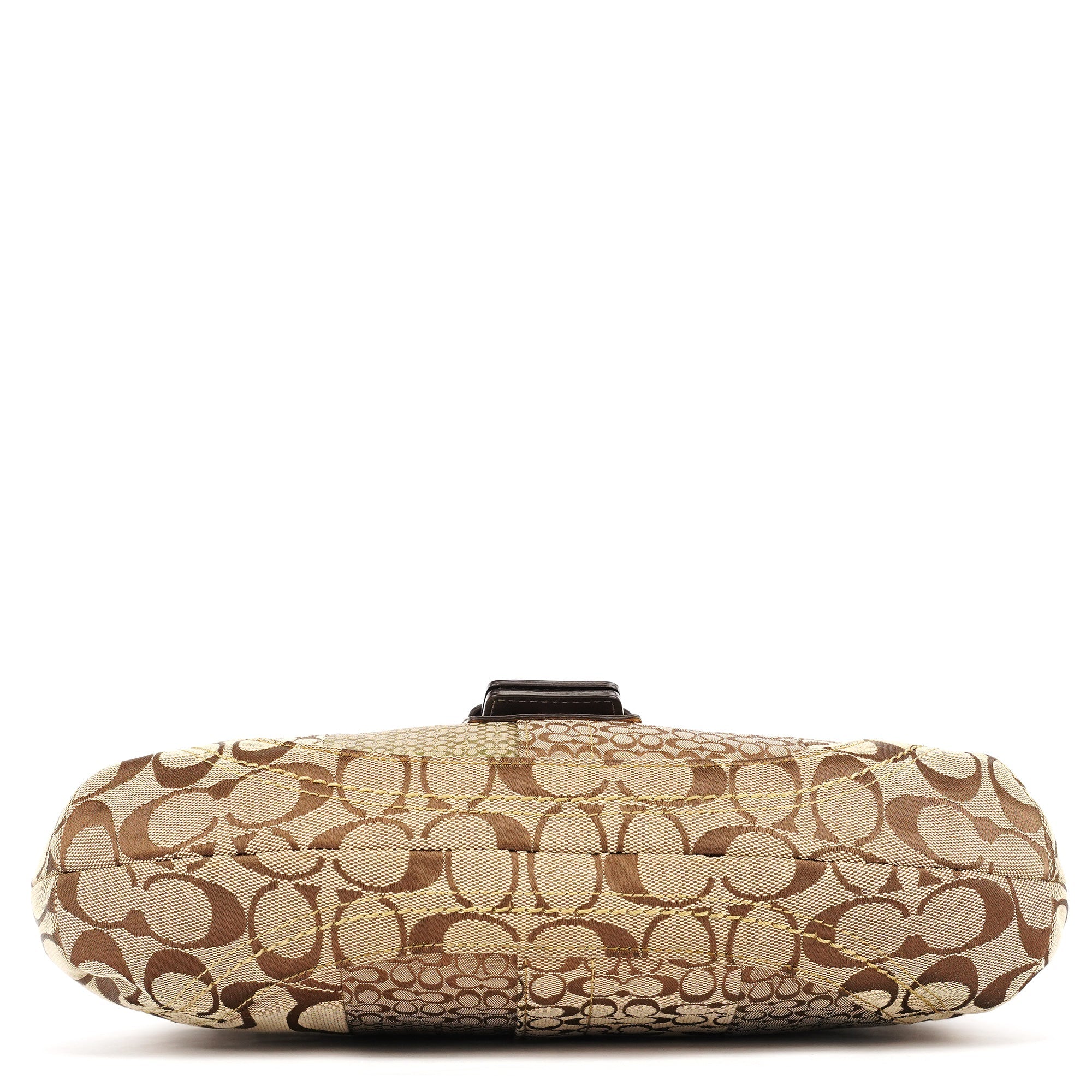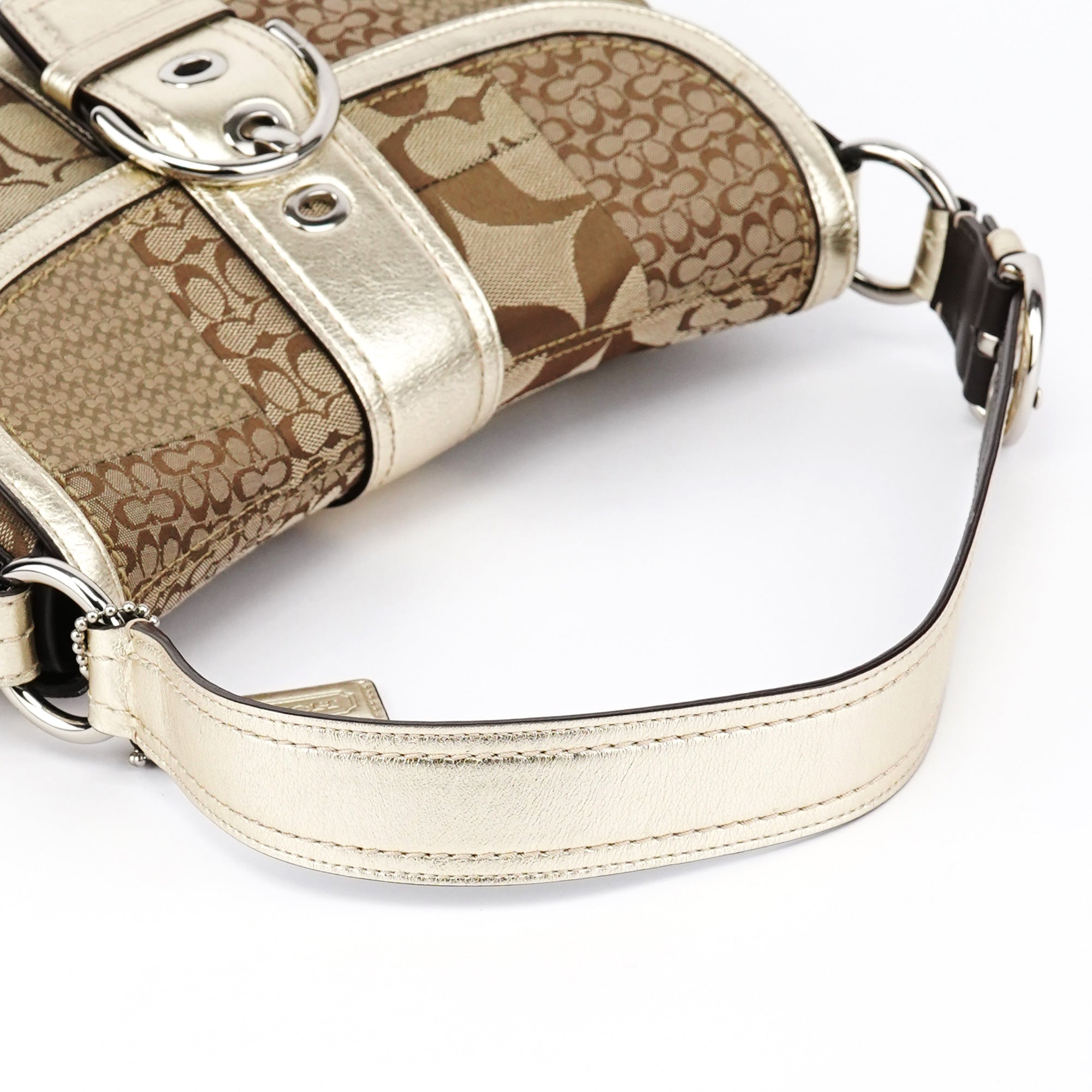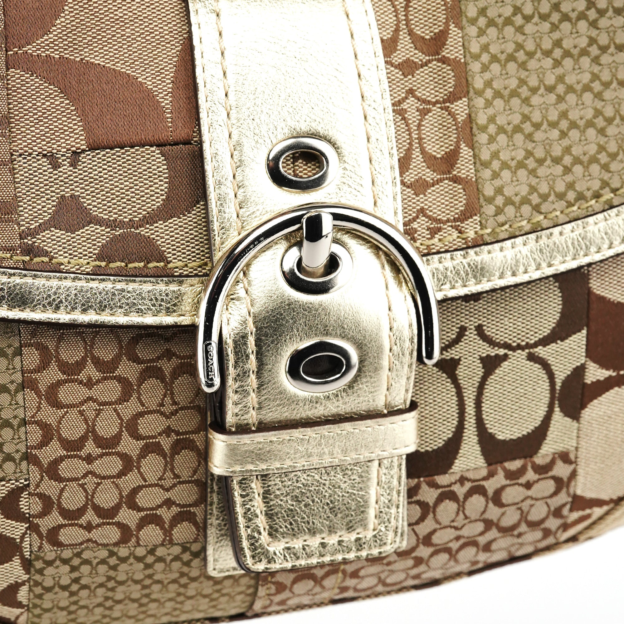 Designed in the early 2000s, this vintage Coach Patchwork Soho shoulder bag features a mixed-media construction of signature Coach canvas and leather in beige tones. The crescent-shaped silhouette showcases the brand's iconic patchwork design with silver-tone hardware and turn-lock closure, representing Coach's heritage craftsmanship and American luxury aesthetic.