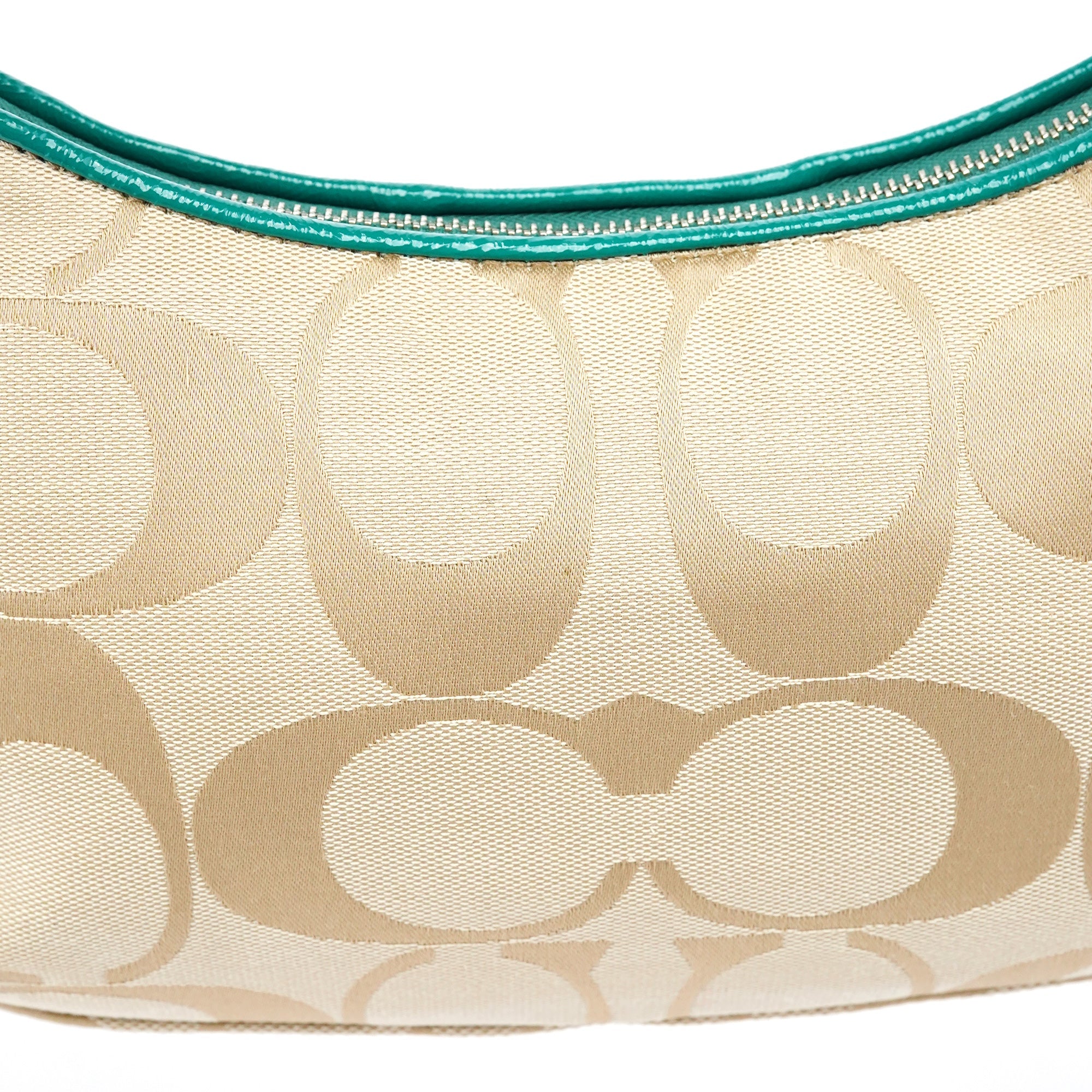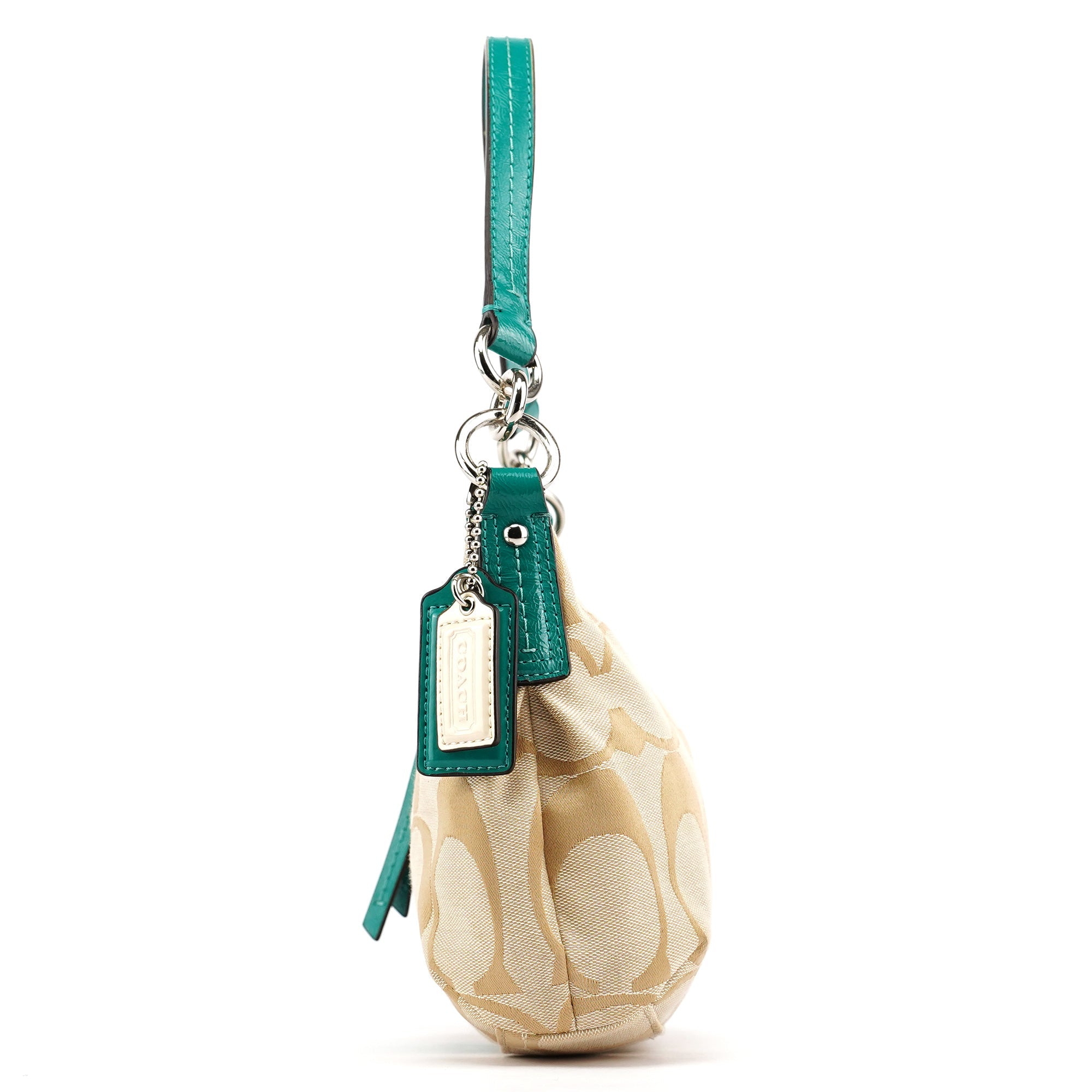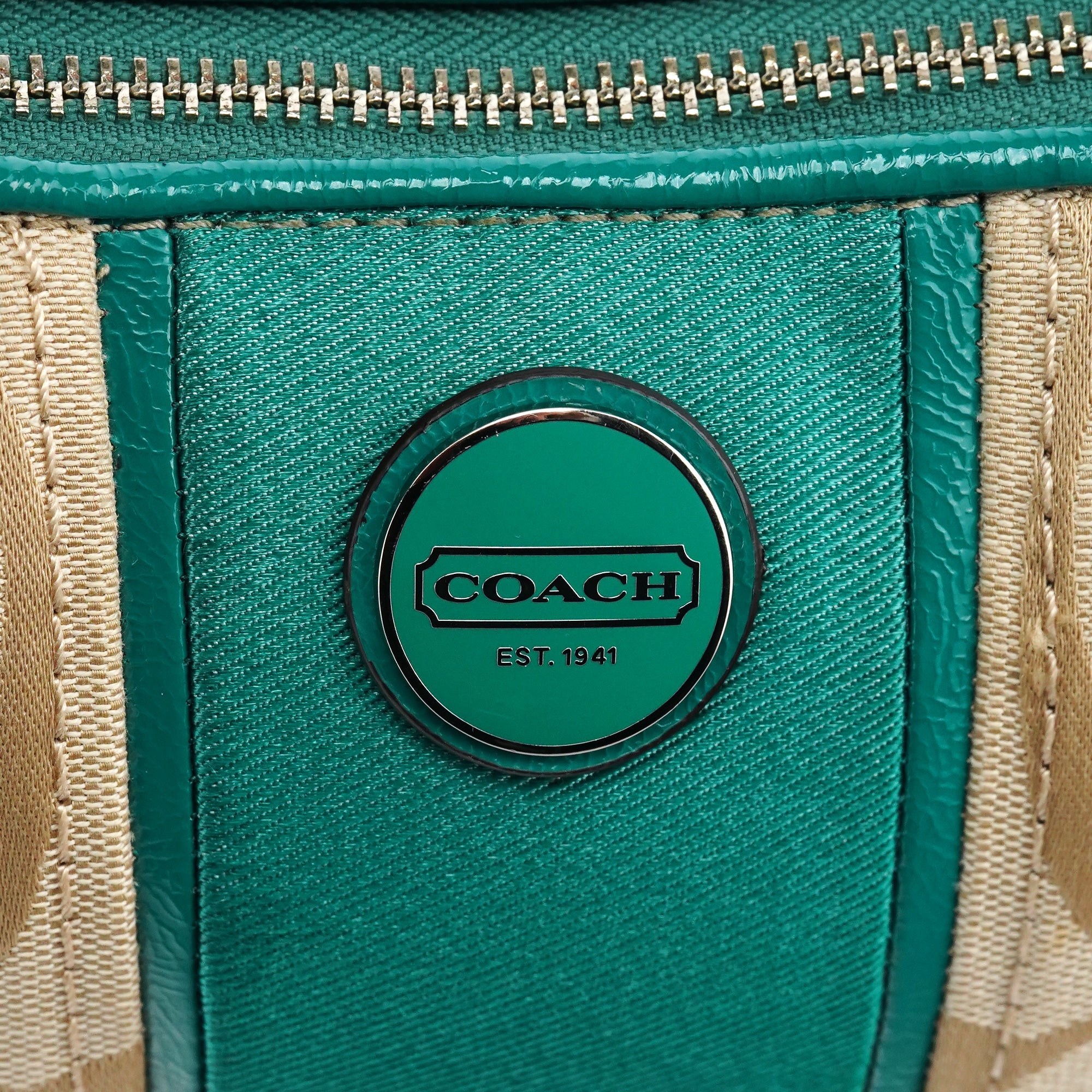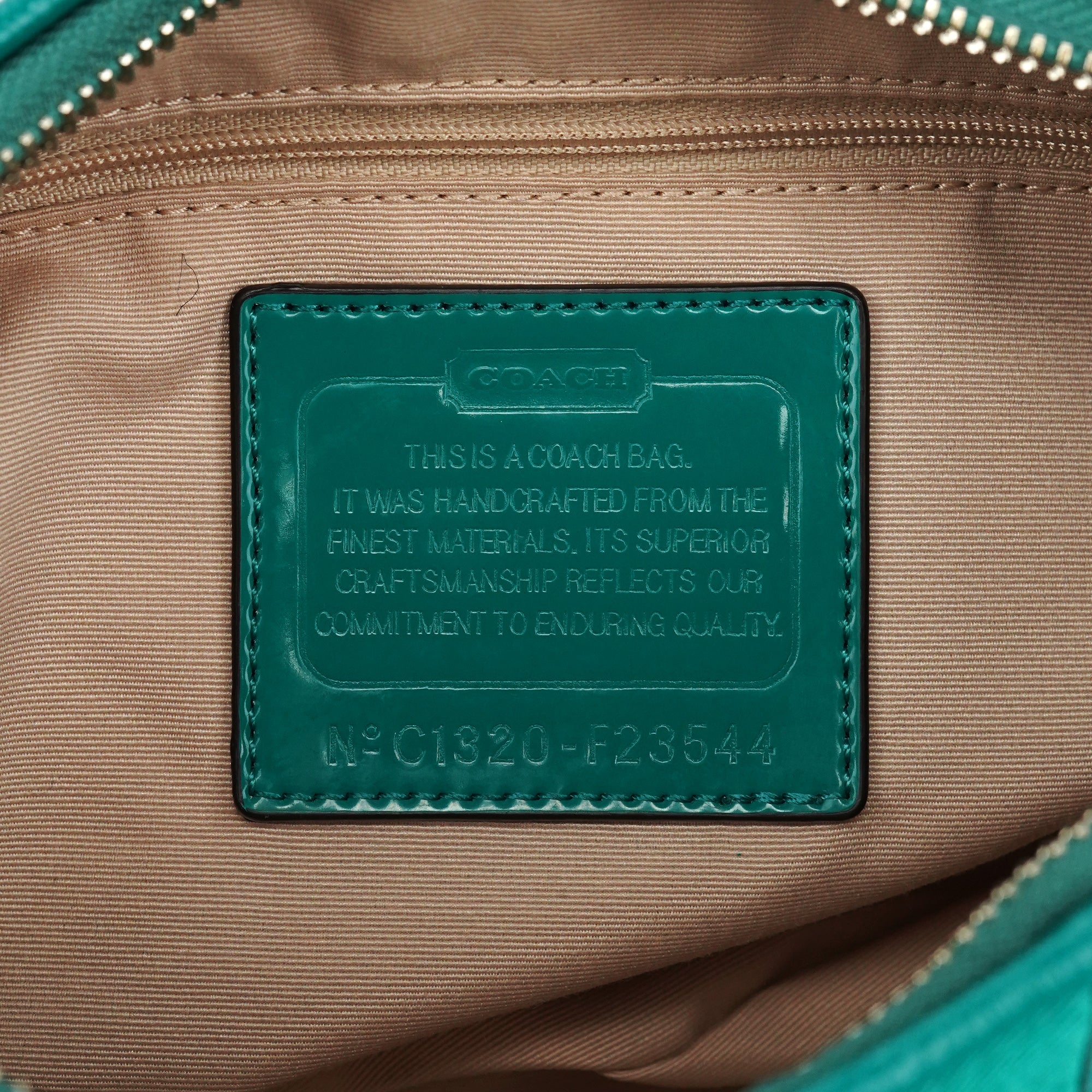 Designed in the early 2000s, this Coach Soho 2-way bag is crafted from signature canvas with turquoise leather trim, finished with silver-tone hardware, a top zip closure, and a detachable strap for shoulder or crossbody wear.