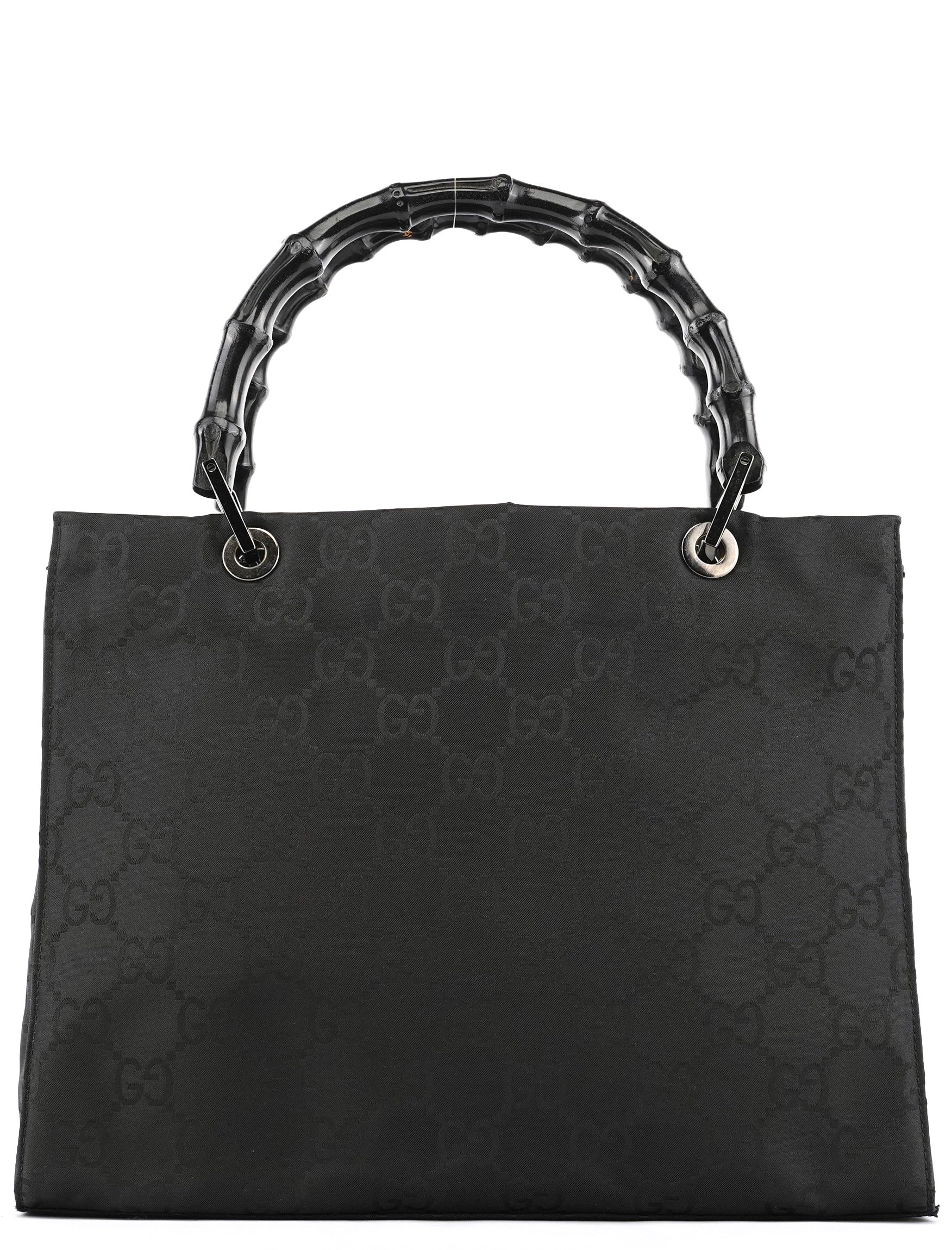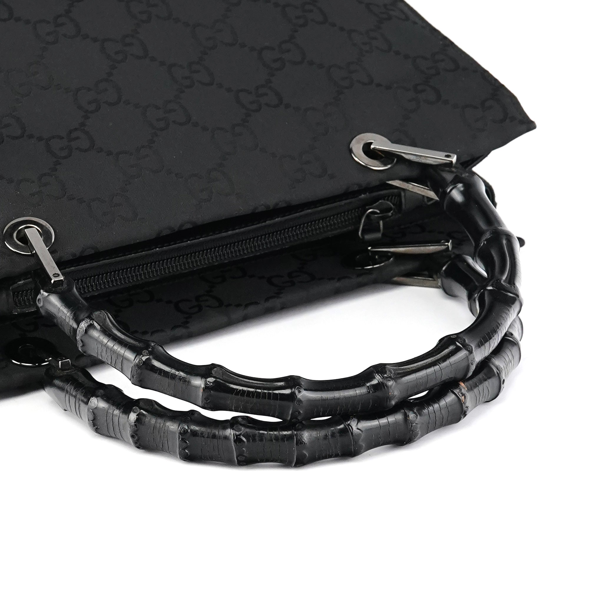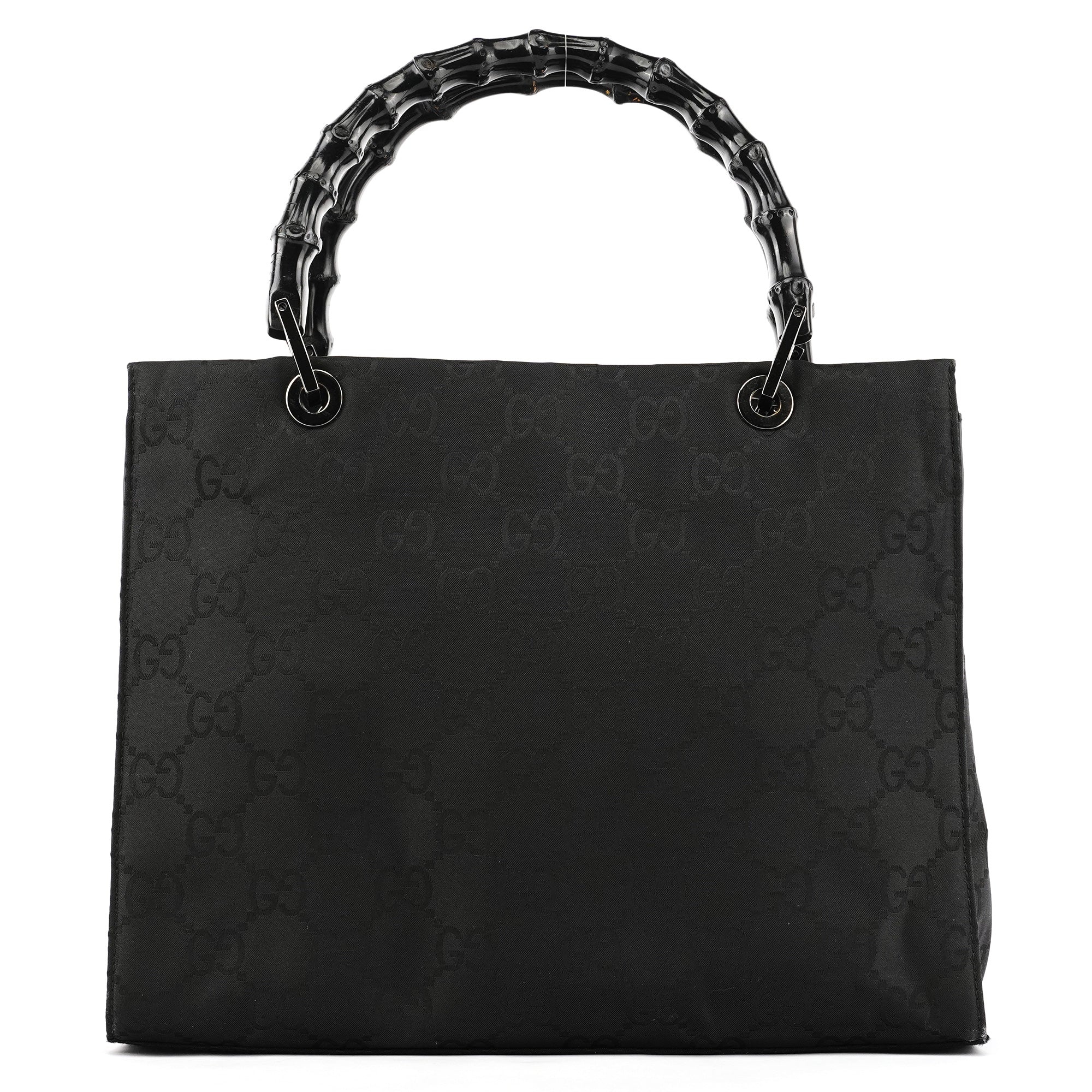Designed in the late 1990s by Tom Ford, this Gucci bamboo tote is crafted in black GG canvas with signature bamboo handles and silver-tone hardware. The satin-lined interior is divided into three compartments with a central zip pocket.