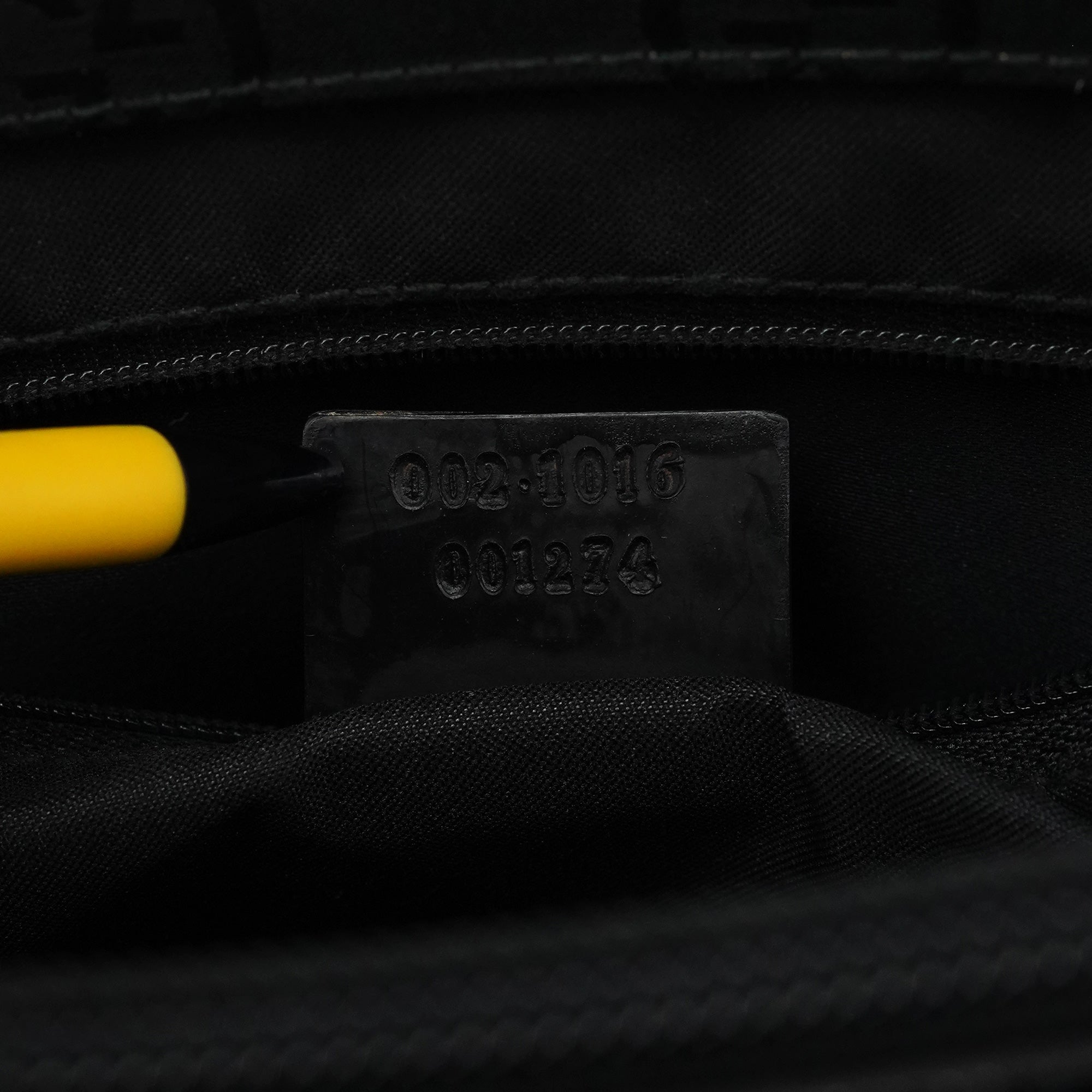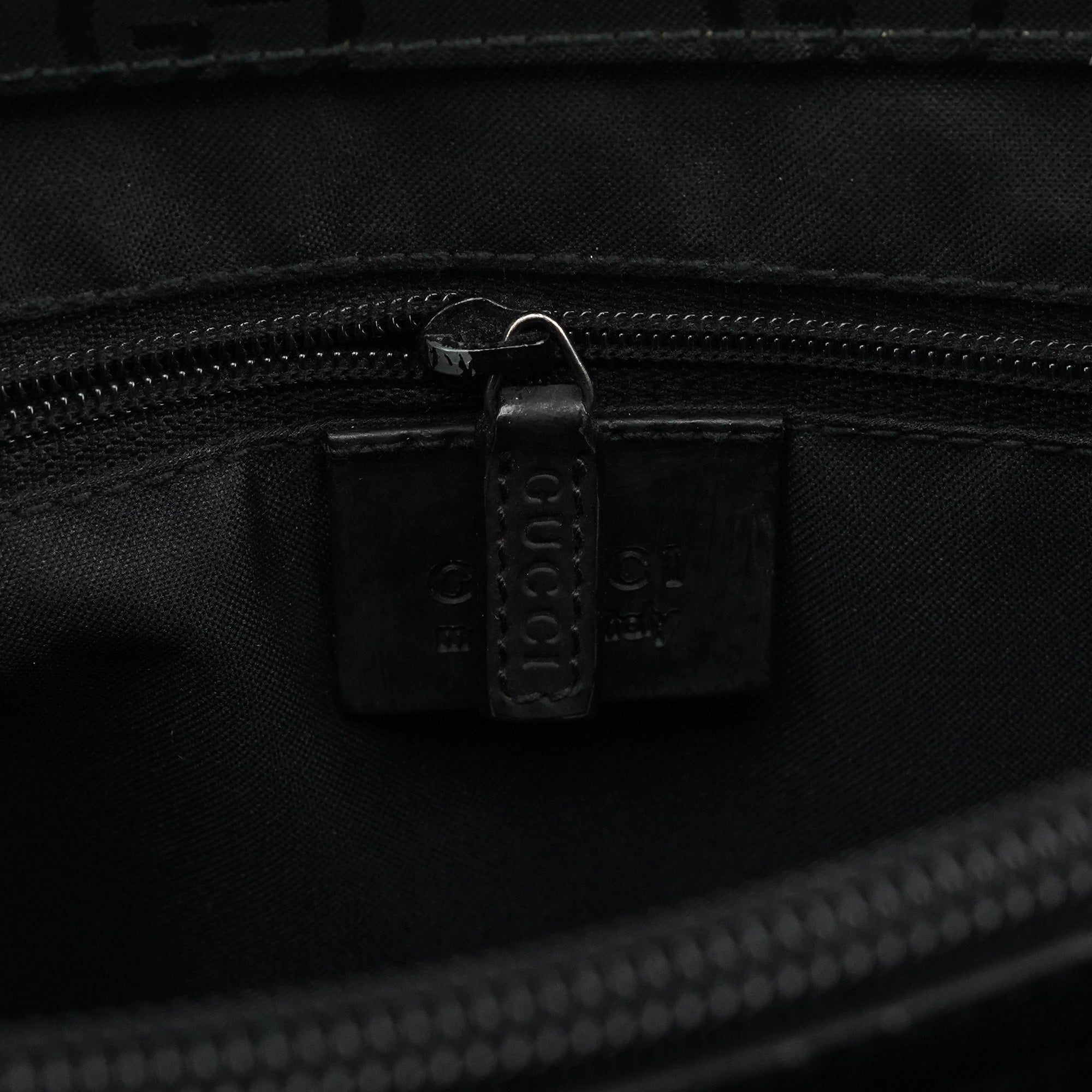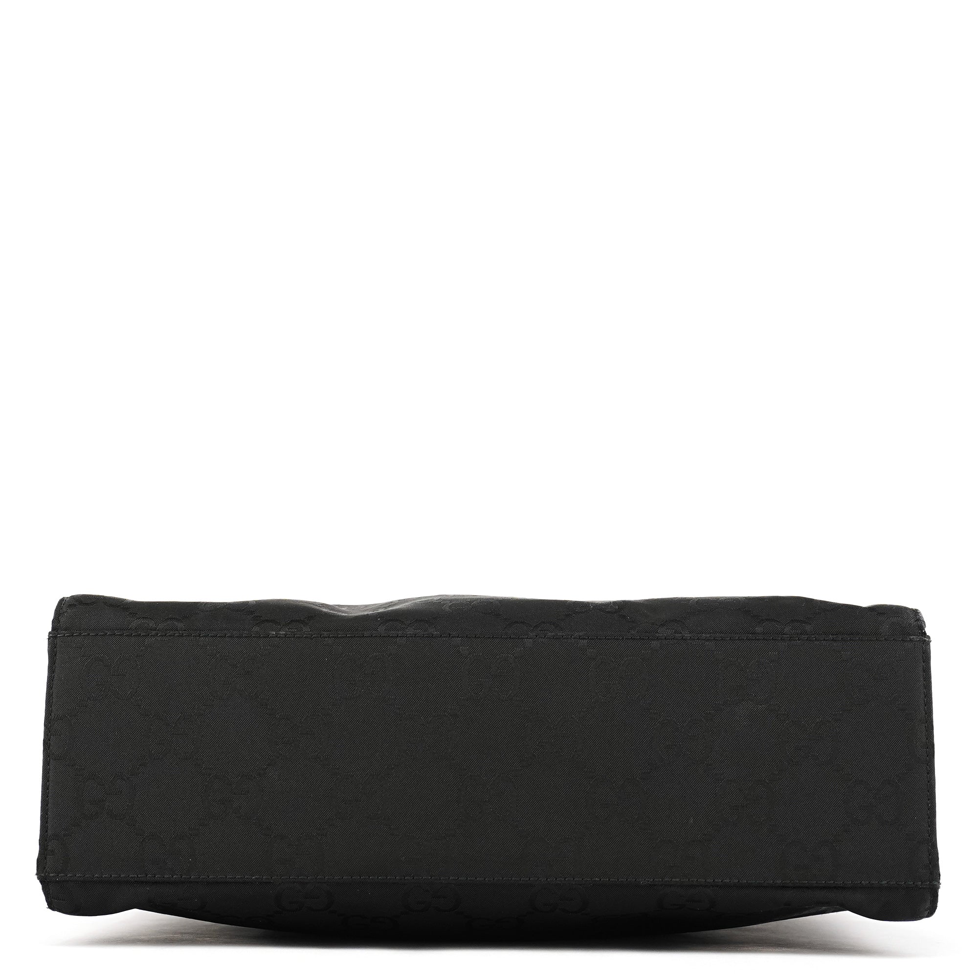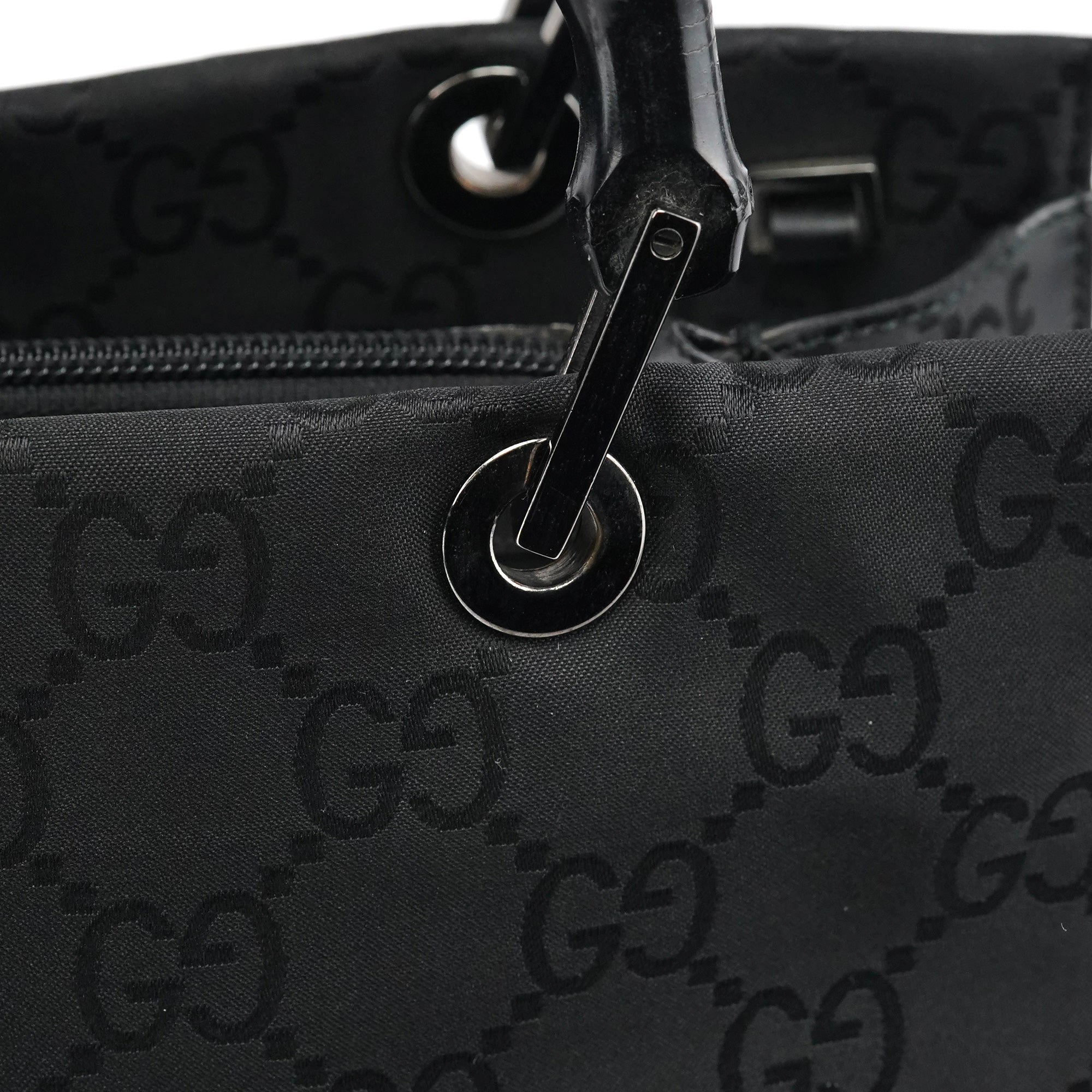 Designed in the late 1990s by Tom Ford, this Gucci bamboo tote is crafted in black GG canvas with signature bamboo handles and silver-tone hardware. The satin-lined interior is divided into three compartments with a central zip pocket.