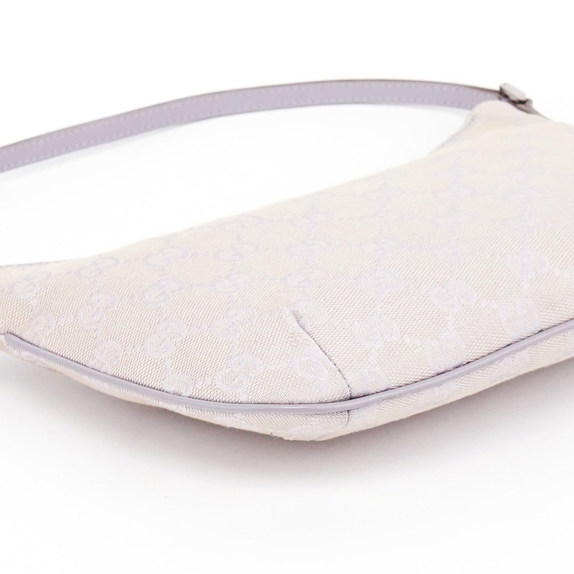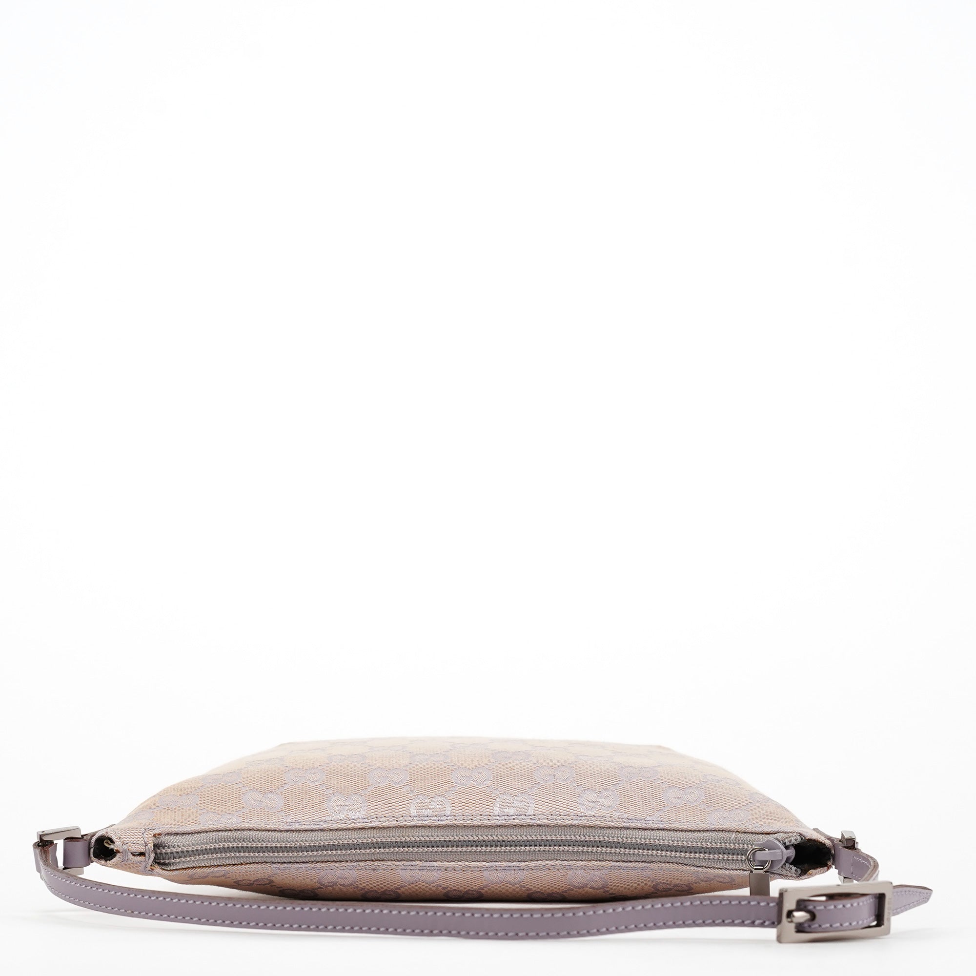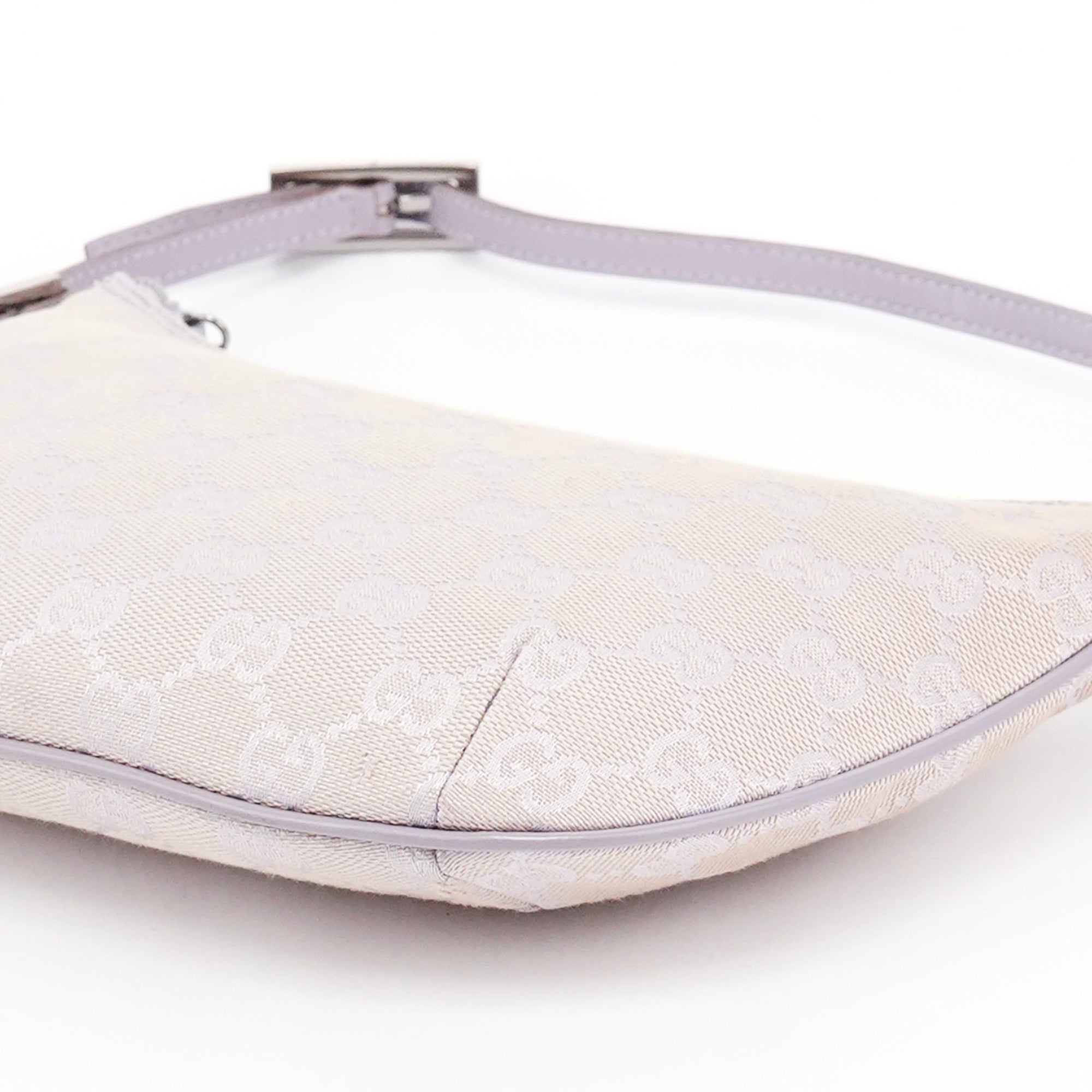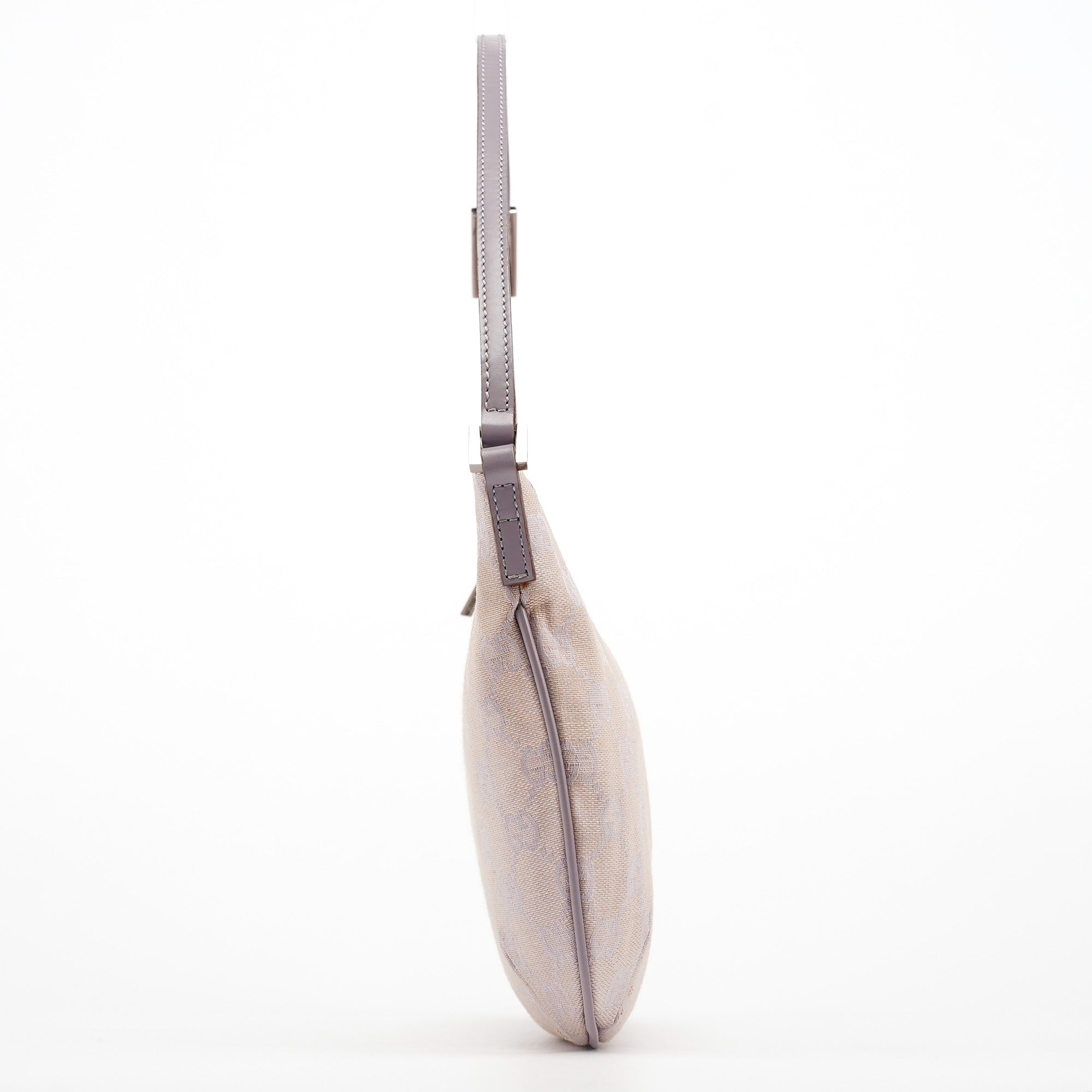 Designed in the late 1990s by Tom Ford, this Gucci GG shoulder bag is crafted in lavender GG monogram canvas with tonal leather trim and a flat shoulder strap. It features a softly curved silhouette with a top zipper closure and a cotton-lined interior with a single open pocket.