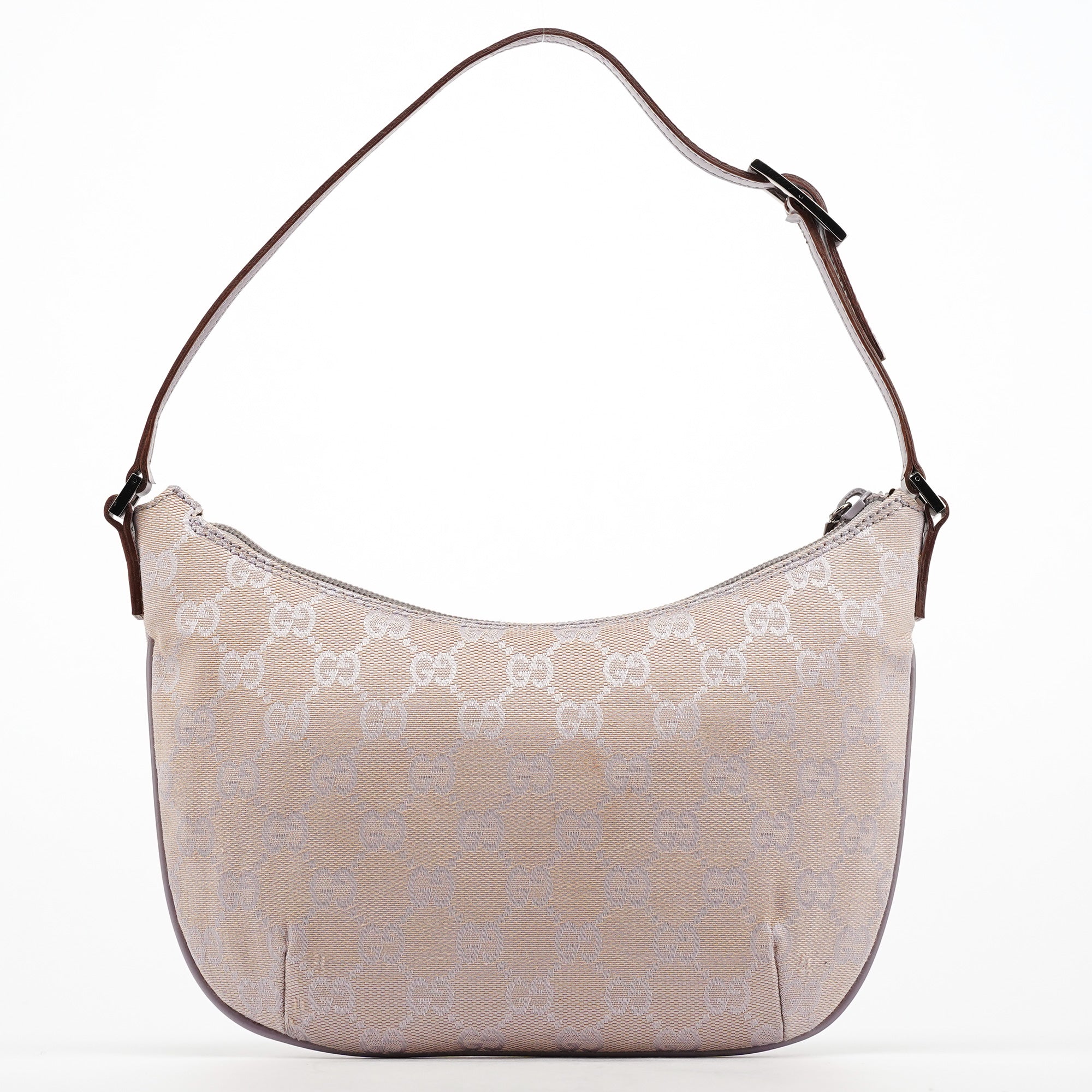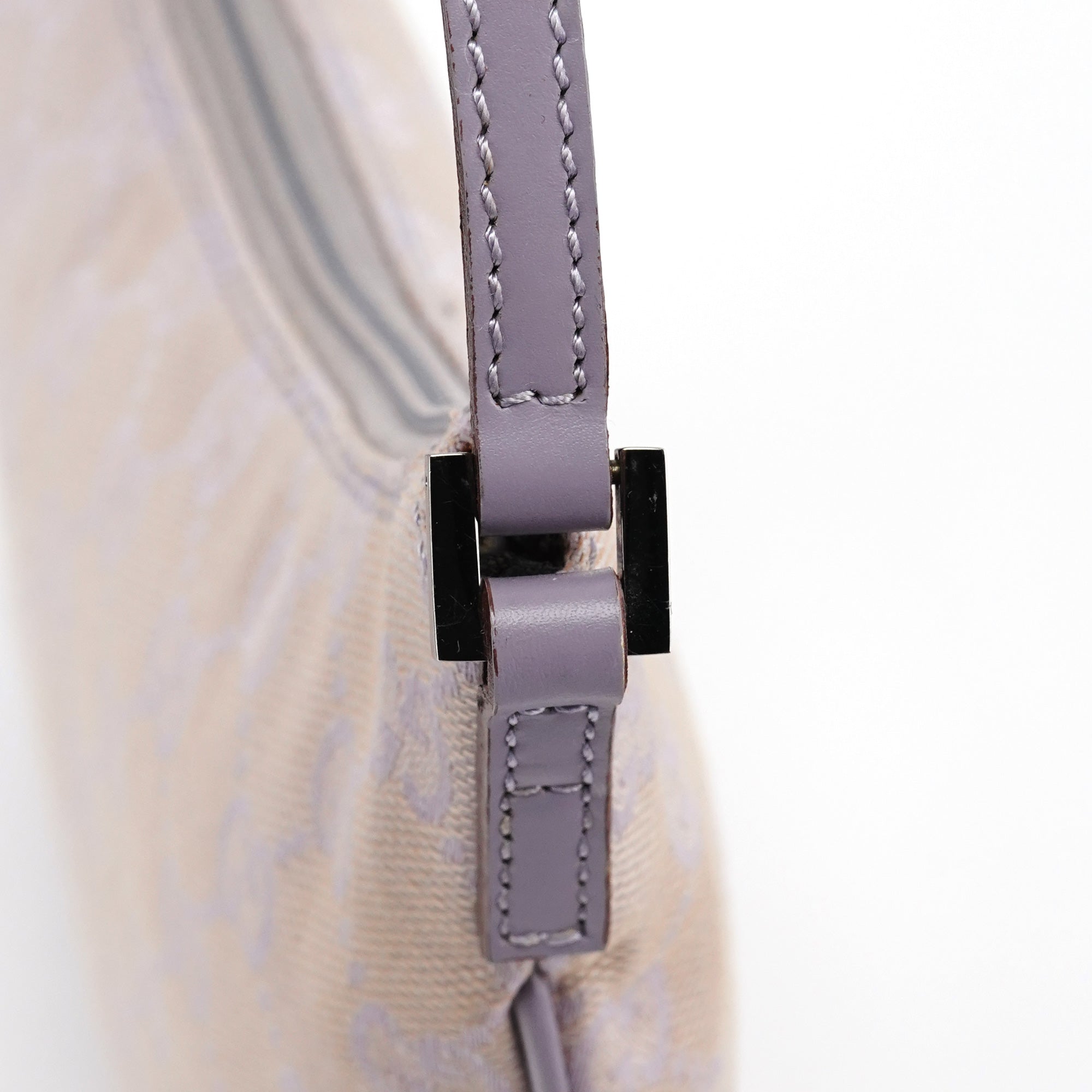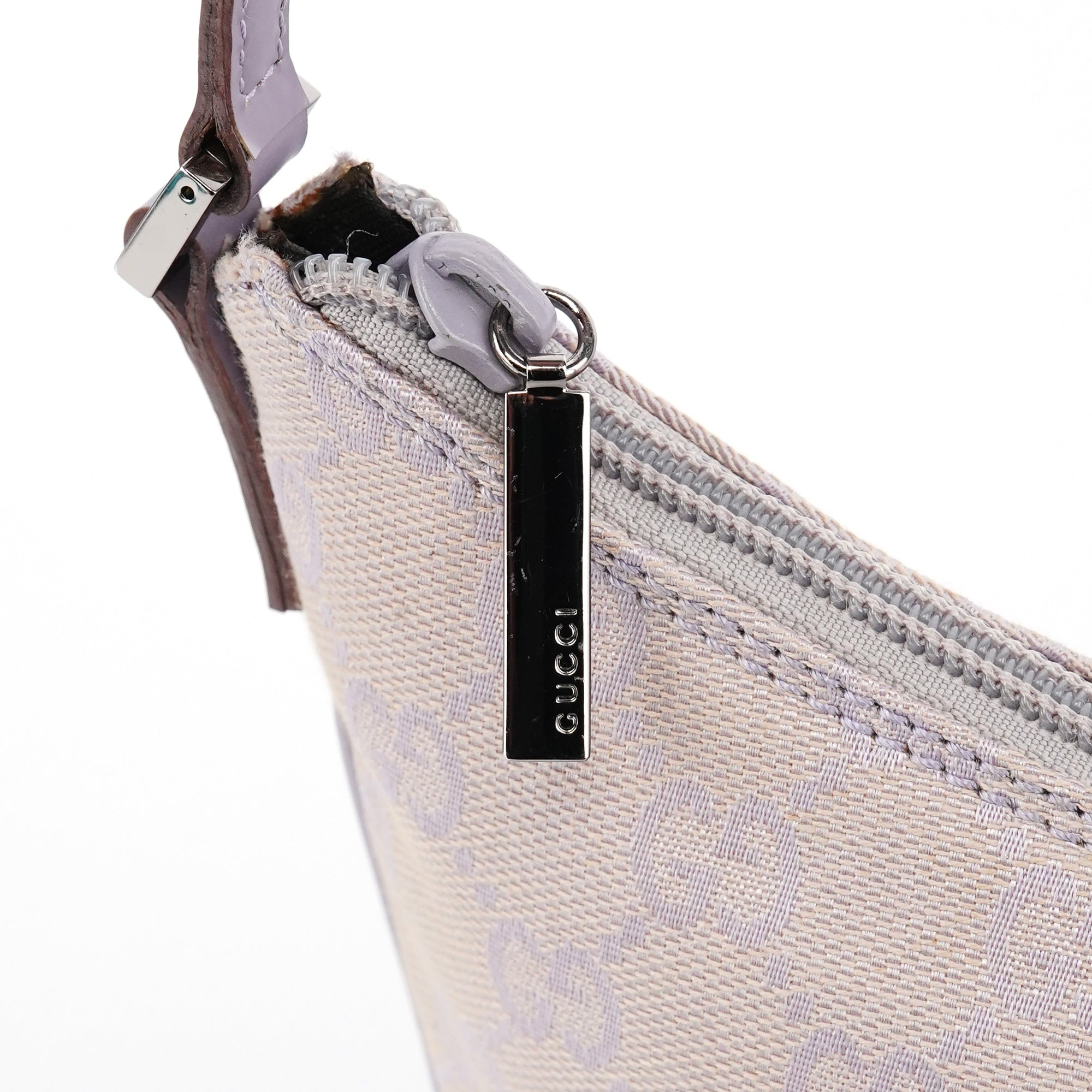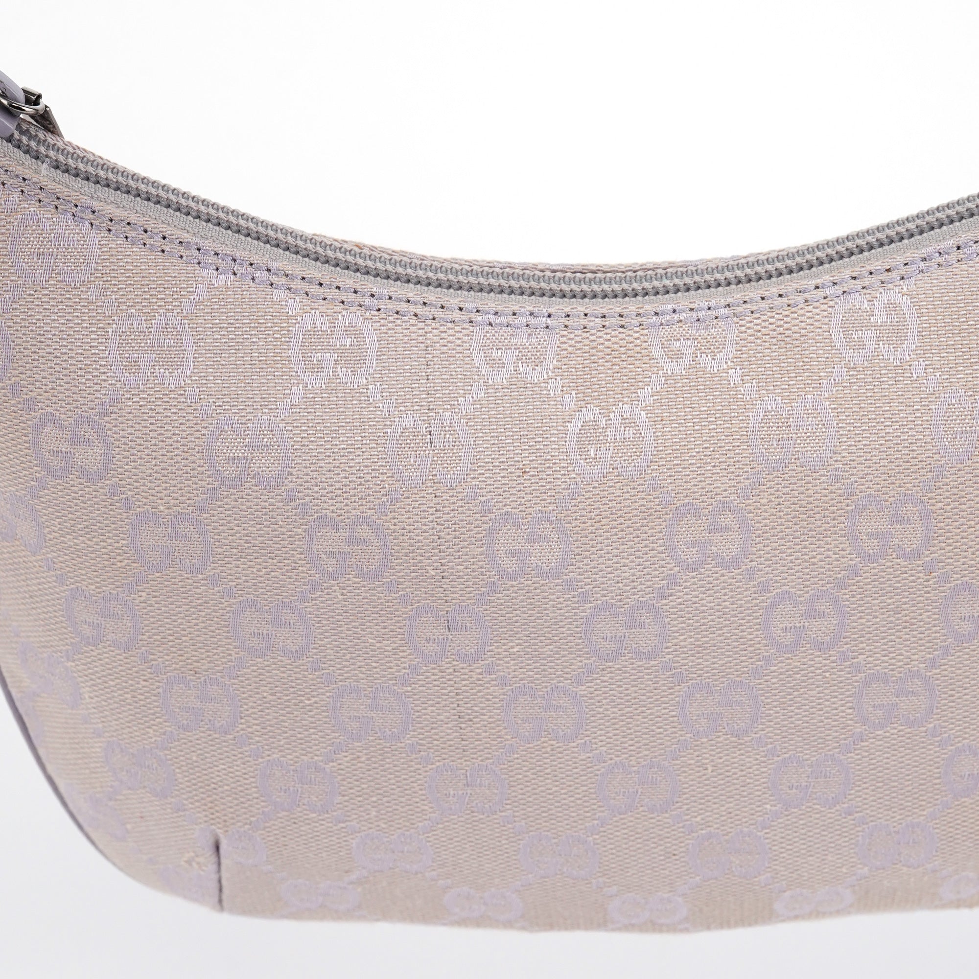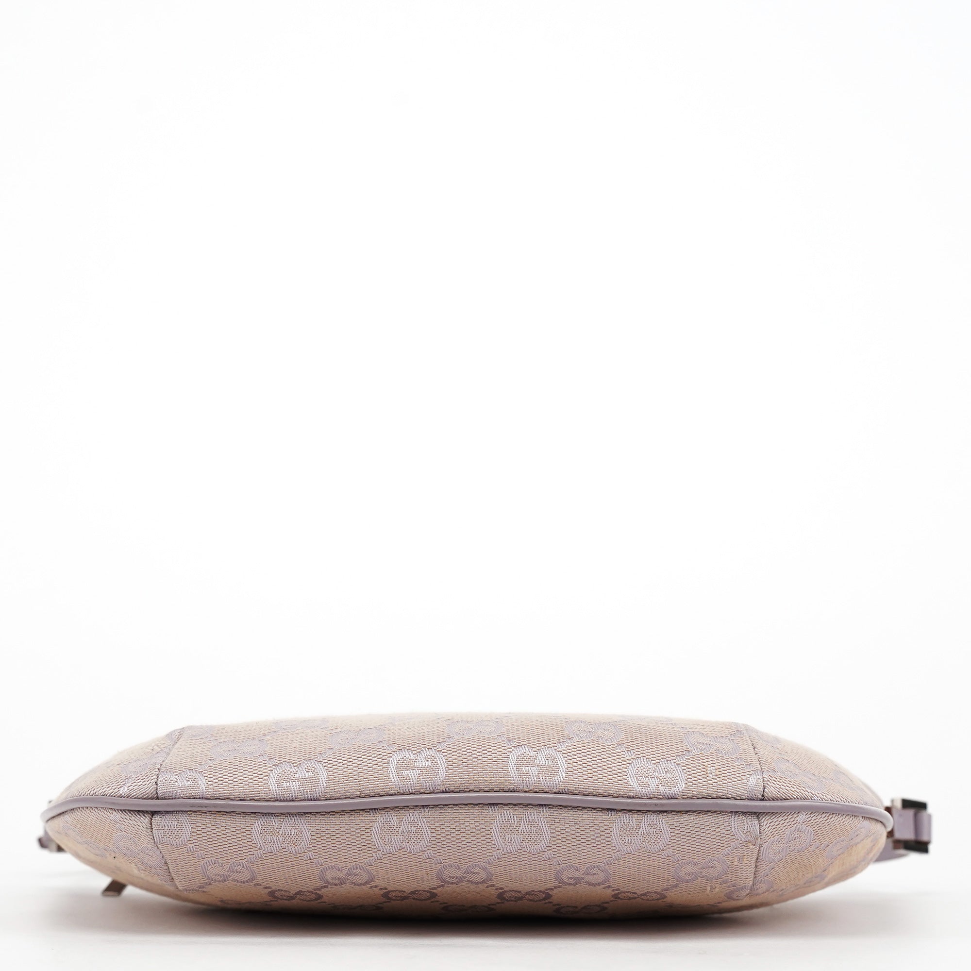 Designed in the late 1990s by Tom Ford, this Gucci GG shoulder bag is crafted in lavender GG monogram canvas with tonal leather trim and a flat shoulder strap. It features a softly curved silhouette with a top zipper closure and a cotton-lined interior with a single open pocket.