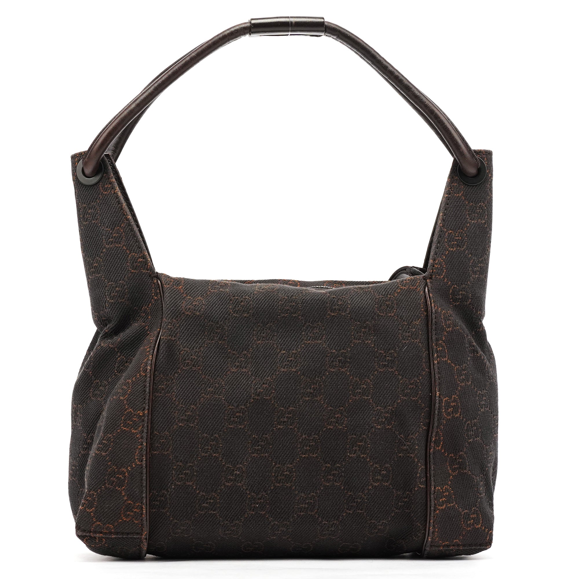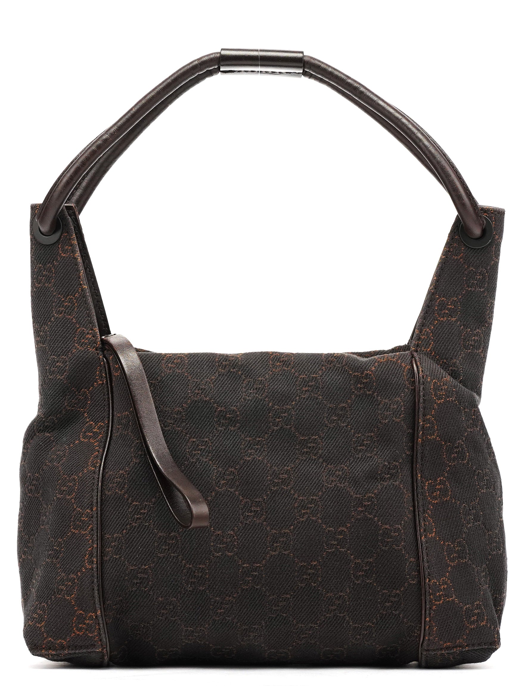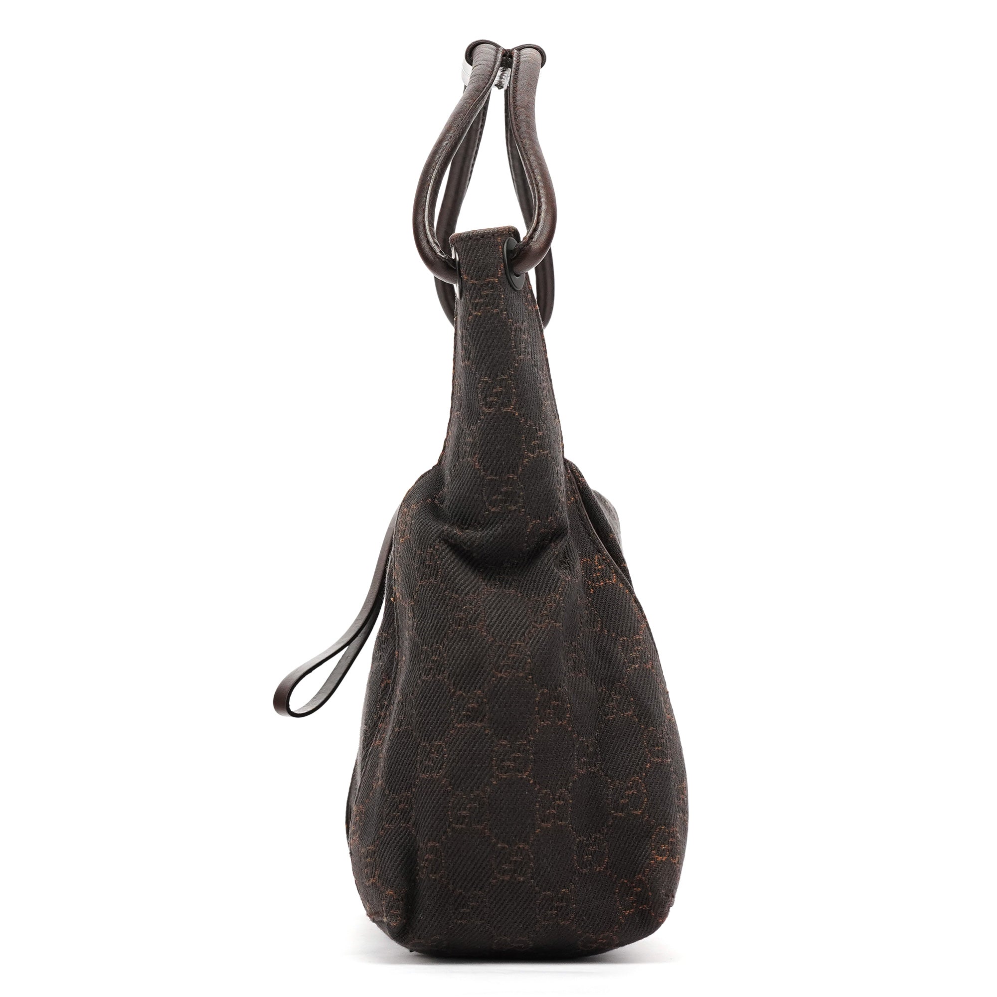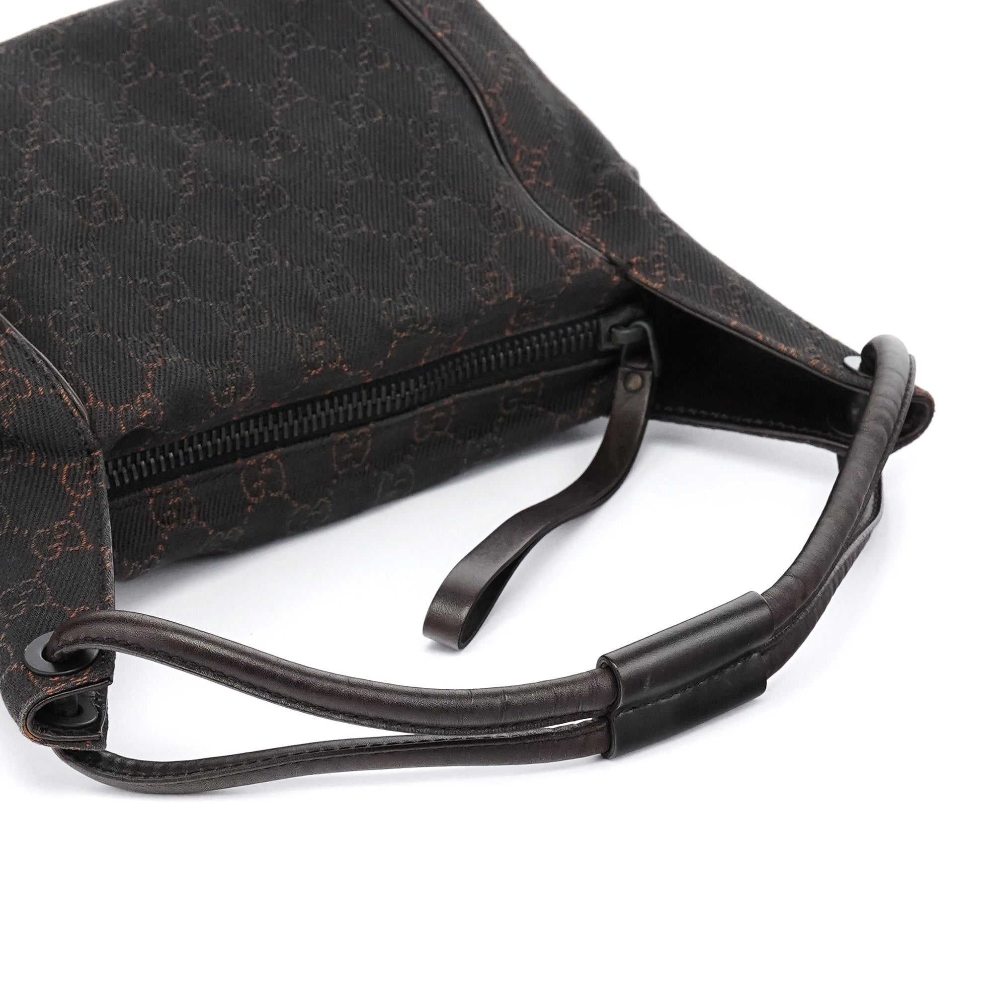 Designed in the late 1990s by Tom Ford, this Gucci hobo bag is made in brown GG monogram canvas with smooth dark-brown leather trim and a sculpted single-handle silhouette. It features an extended leather zipper pull, a full top-zip closure, and a spacious interior lined in GG-patterned fabric with a zip pocket.