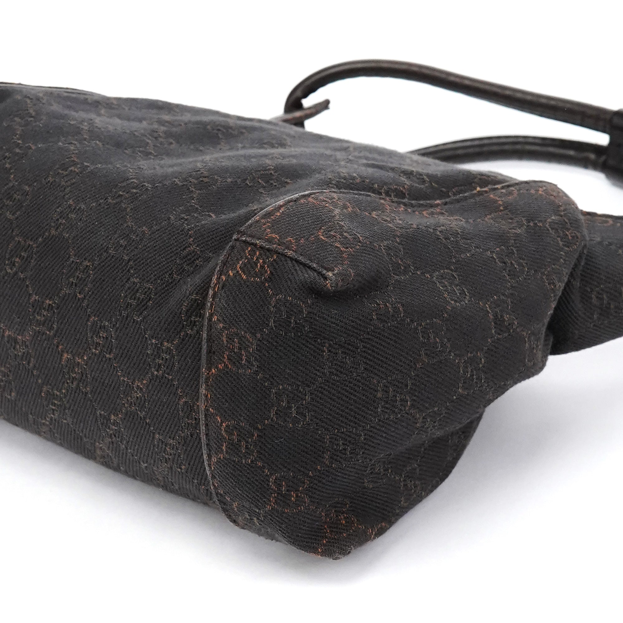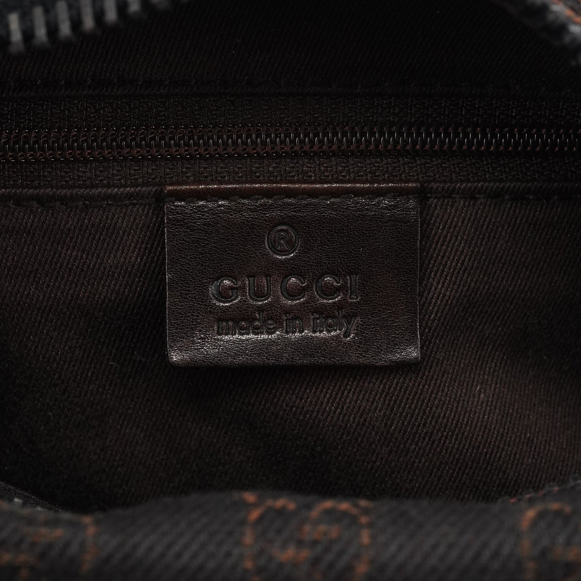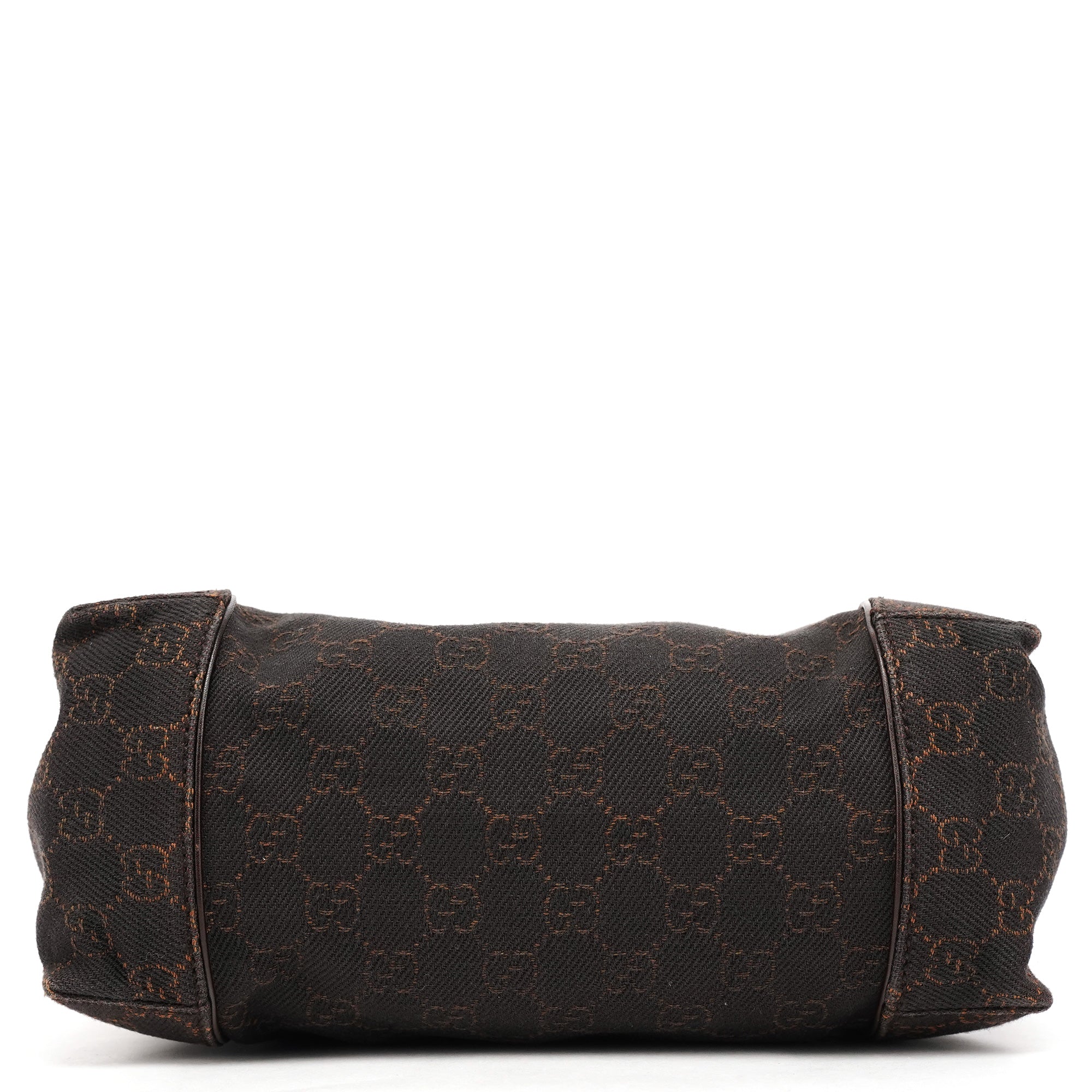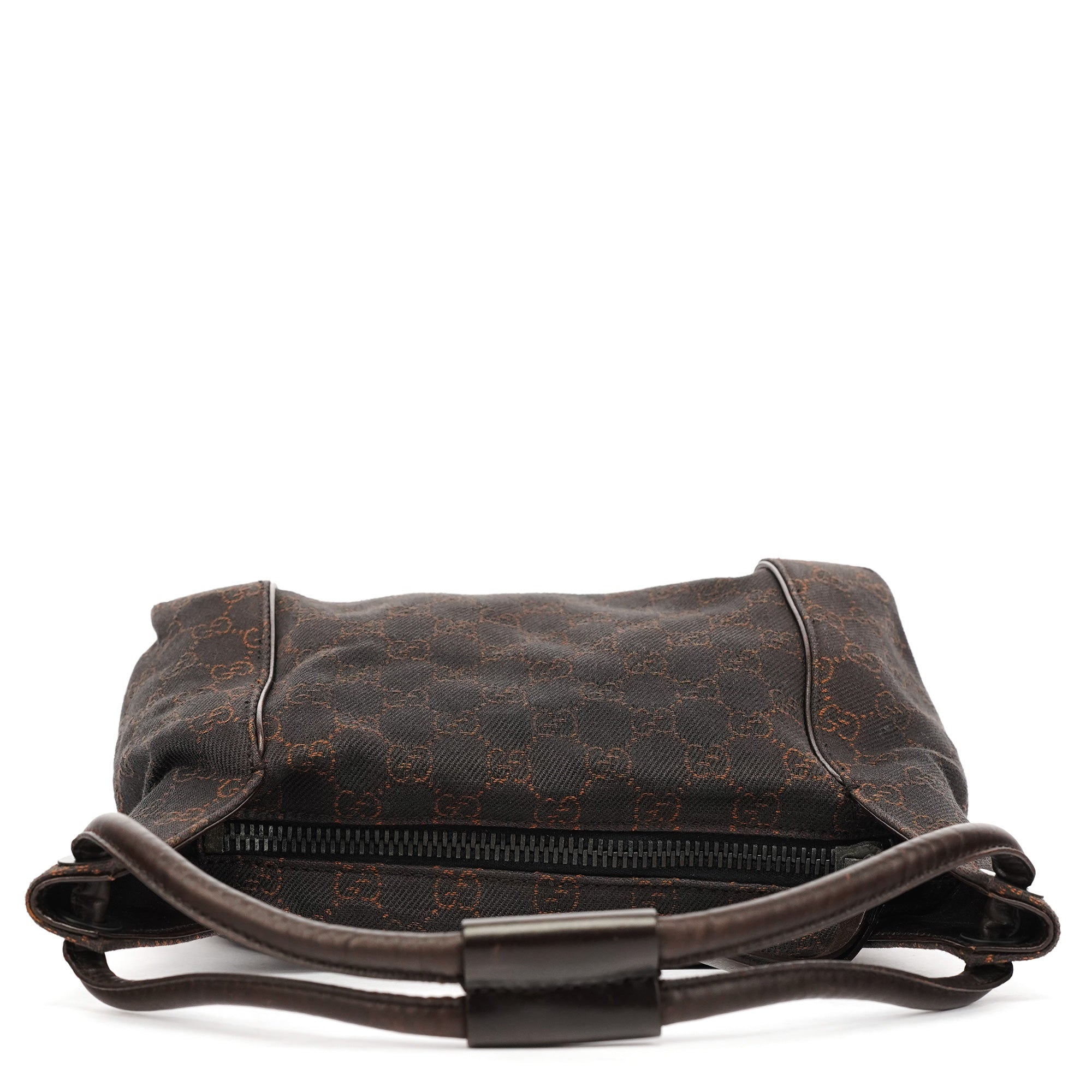 Designed in the late 1990s by Tom Ford, this Gucci hobo bag is made in brown GG monogram canvas with smooth dark-brown leather trim and a sculpted single-handle silhouette. It features an extended leather zipper pull, a full top-zip closure, and a spacious interior lined in GG-patterned fabric with a zip pocket.