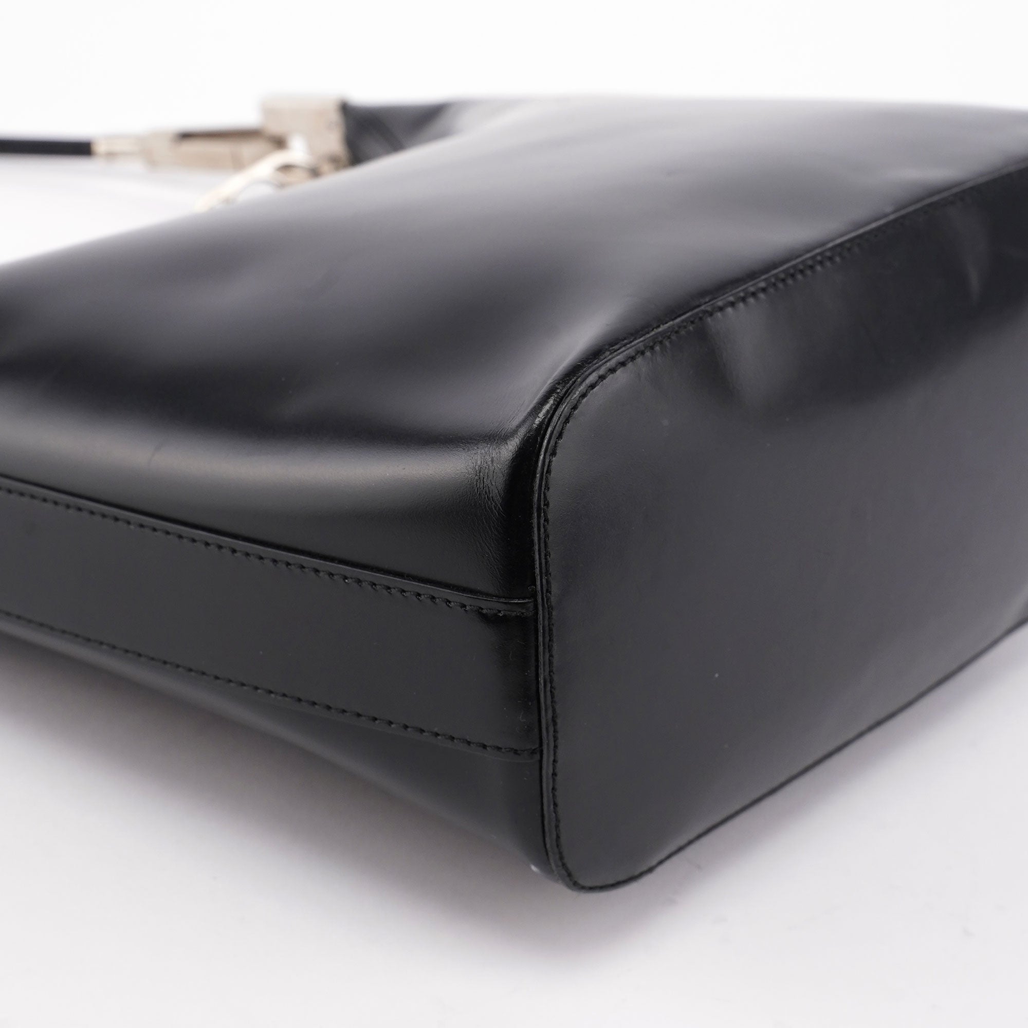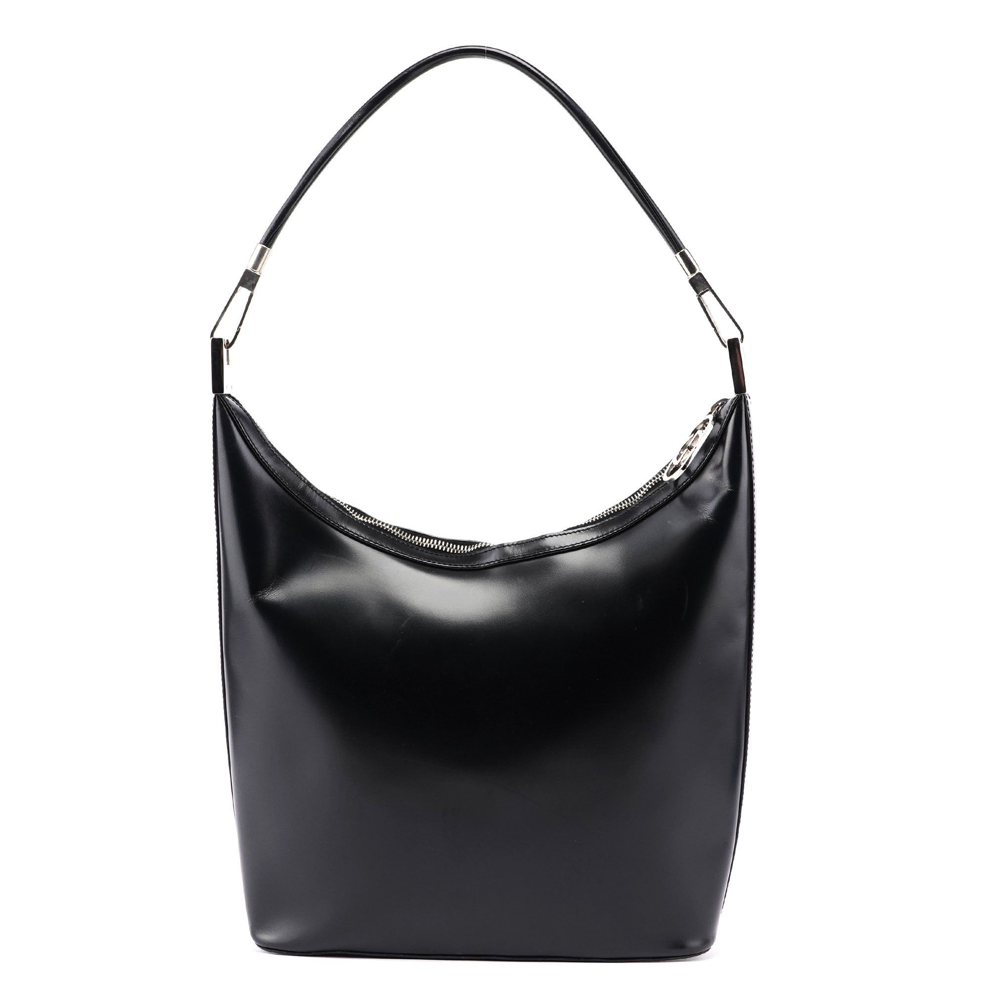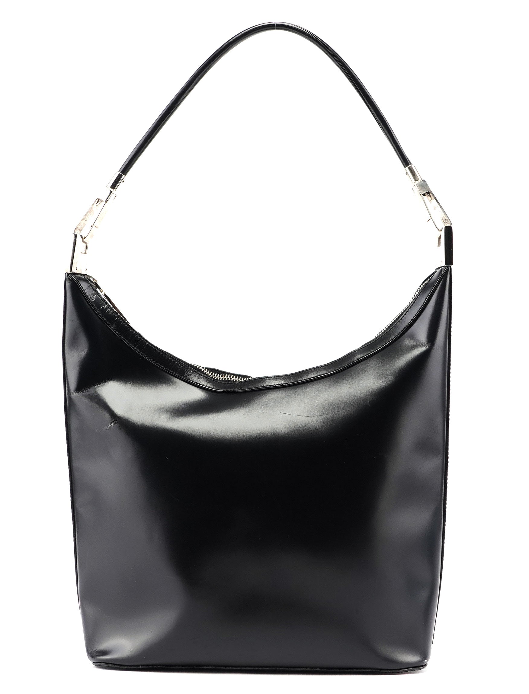 Introducing the Gucci Vitello bag, designed by Tom Ford and handcrafted from black leather. It features a zipper closure and silver-tone hardware, exuding sophistication. The satin-lined interior includes a zipper pocket for organization.