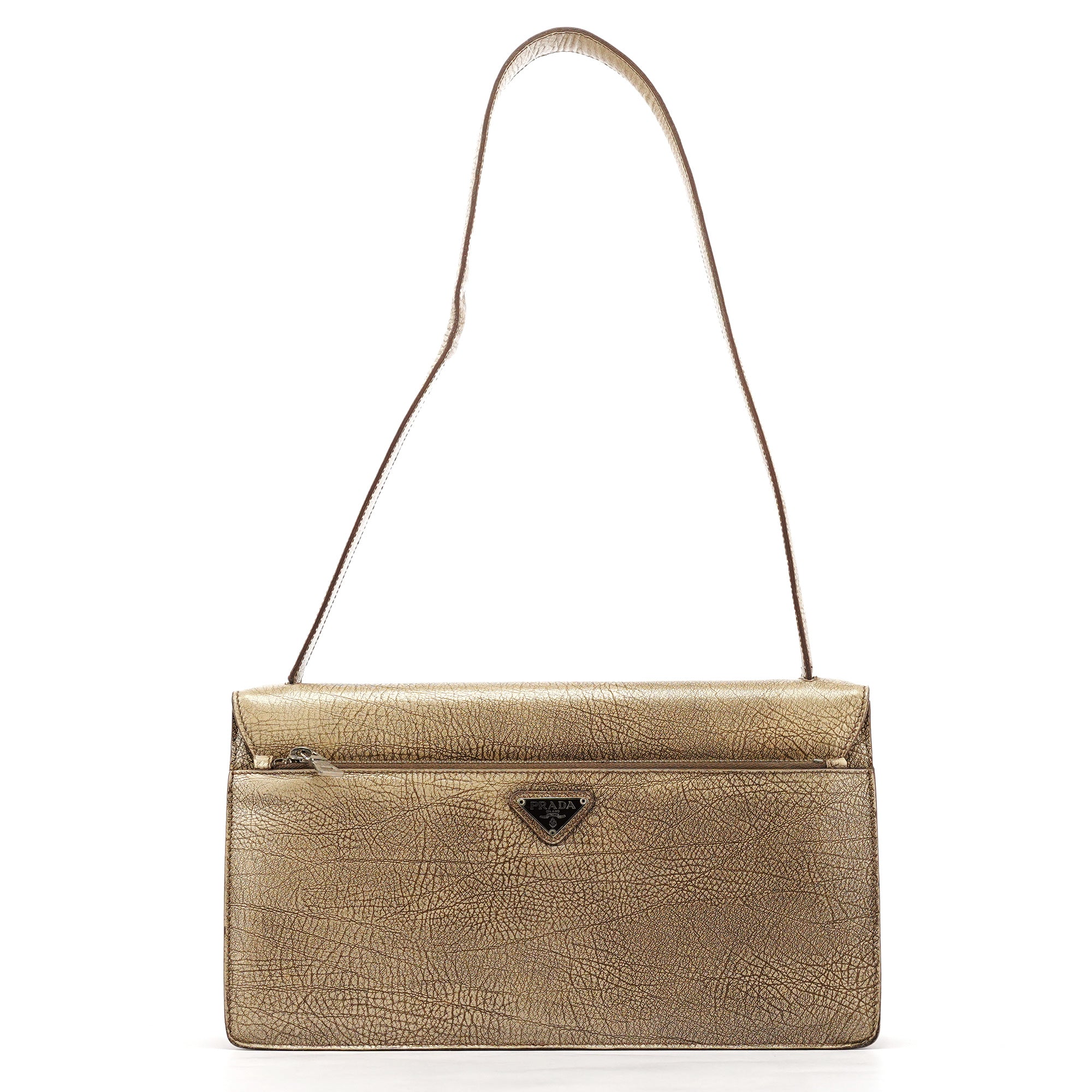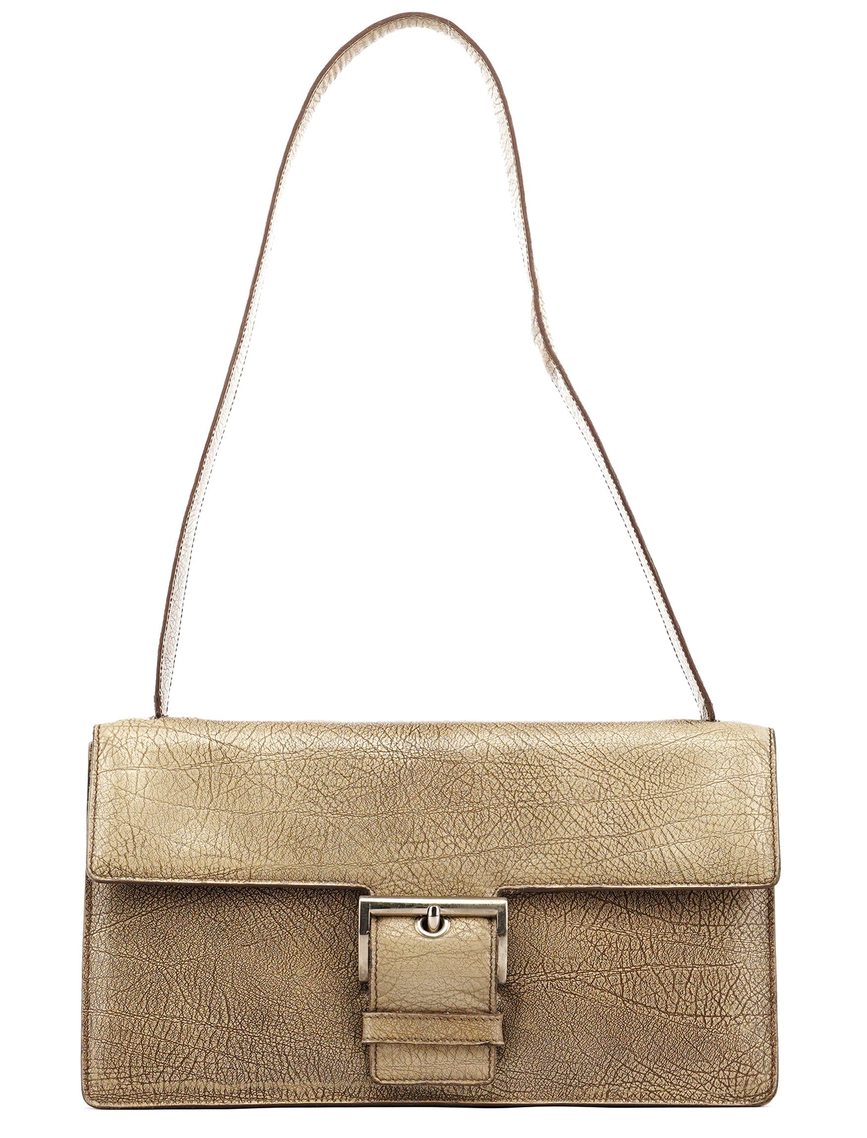Designed in the mid-1990s by Miuccia Prada, this shoulder bag is crafted in textured llama leather and defined by its structured rectangular silhouette and signature front belt-style buckle. Finished with silver-tone hardware, a single shoulder strap, and a zip-top interior lined in classic Prada logo jacquard.