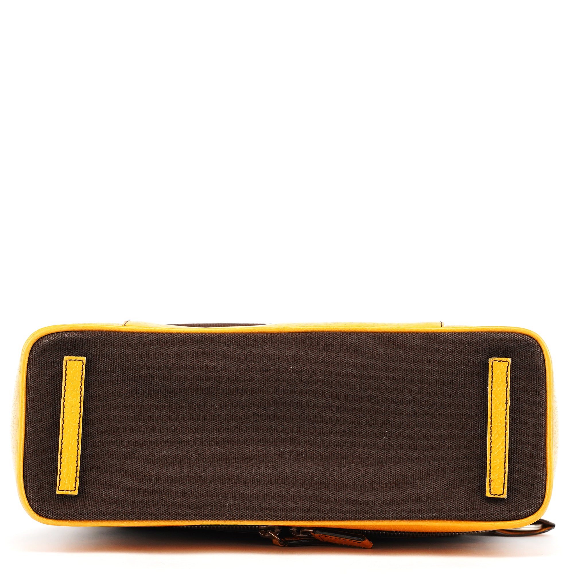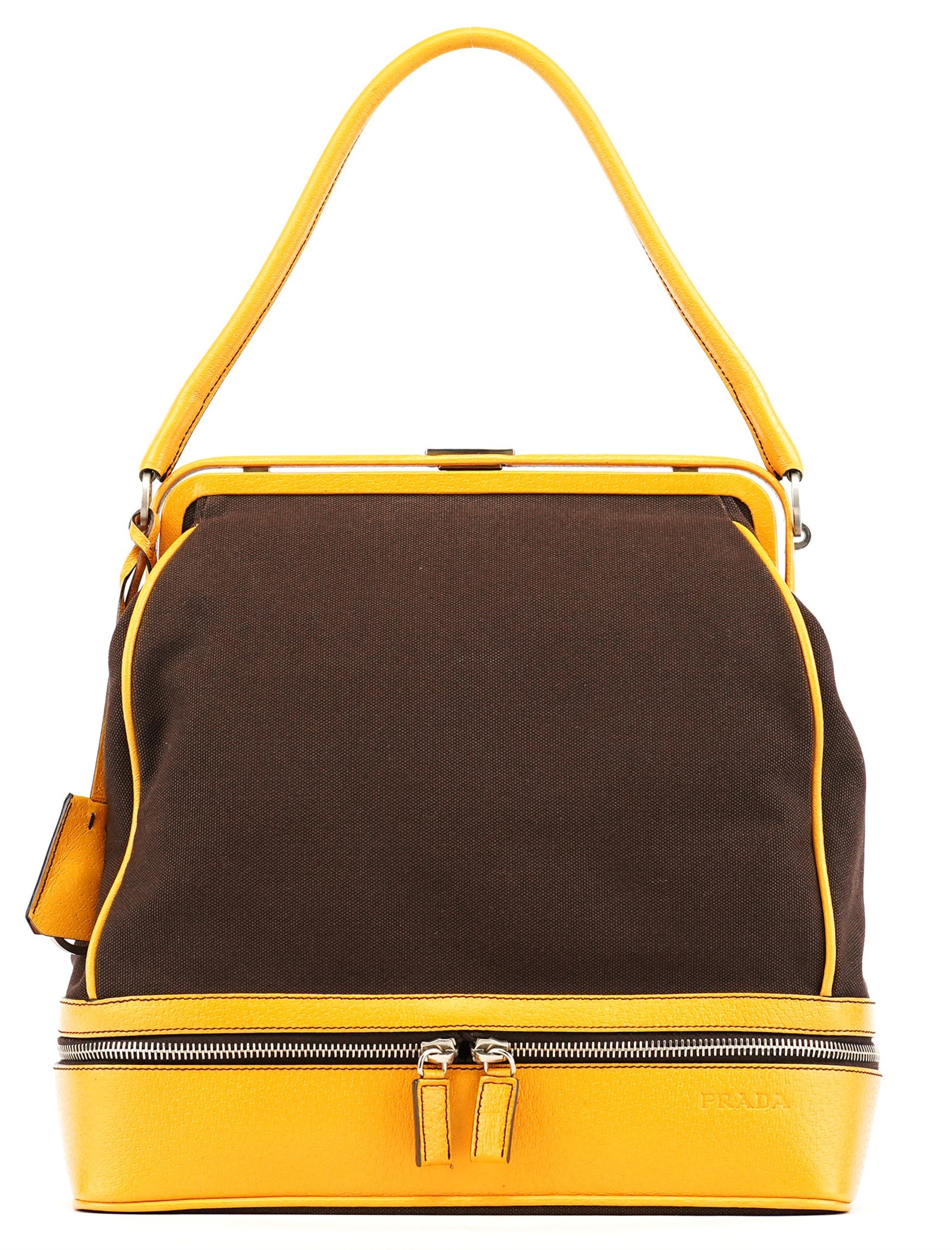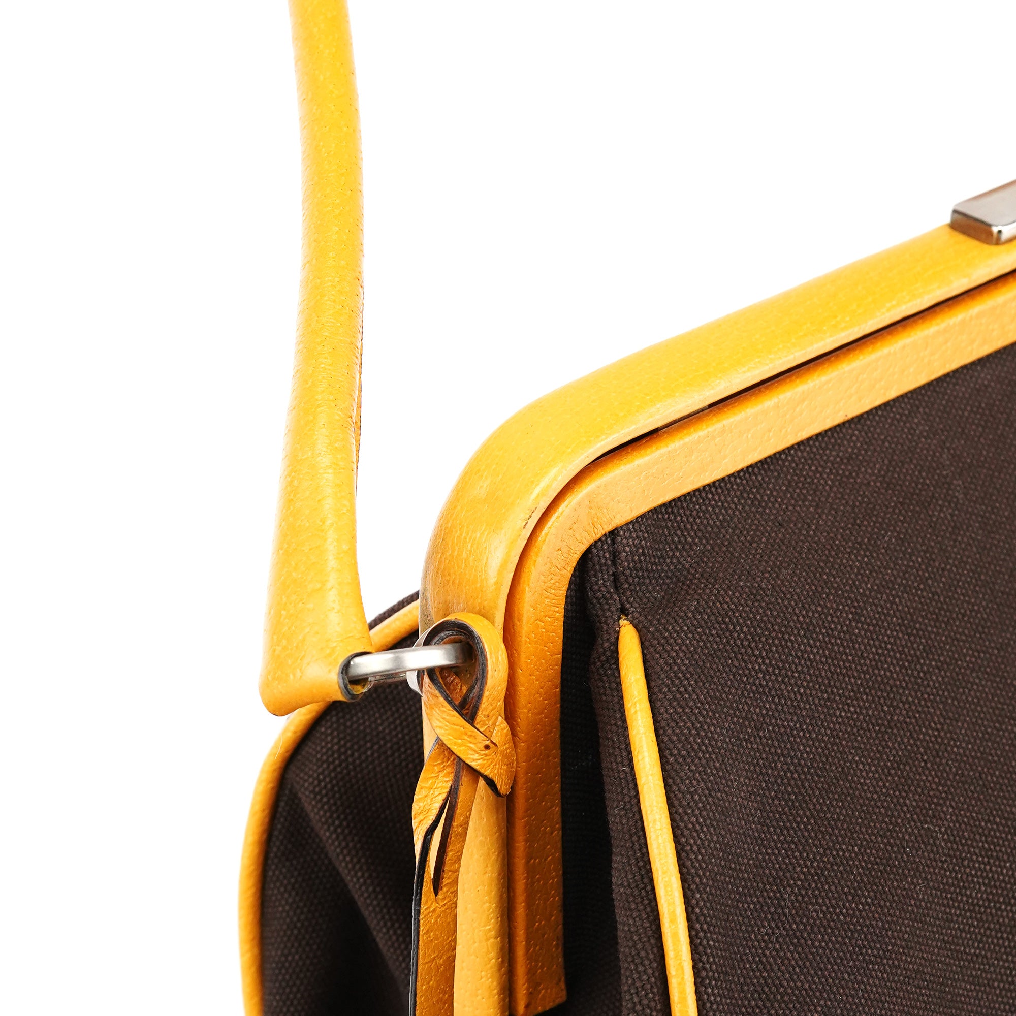 Designed for the Fall 2000 collection by Miuccia Prada, this Prada handbag pairs rich brown canvas with bold yellow leather trim for a clean, architectural look. The framed top, structured silhouette, and single shoulder strap give it a refined, modern feel, while the zipped lower compartment adds practical separation for everyday essentials. The interior is lined in signature logo jacquard with an interior zipper pocket.