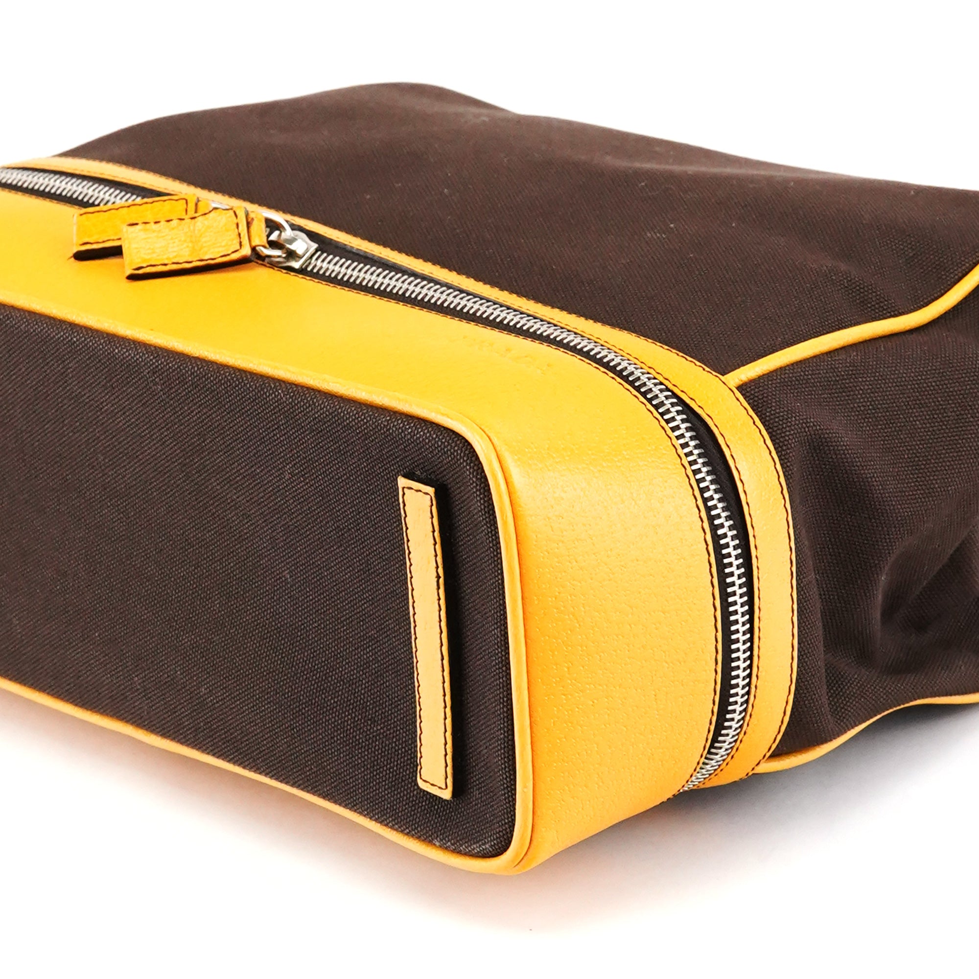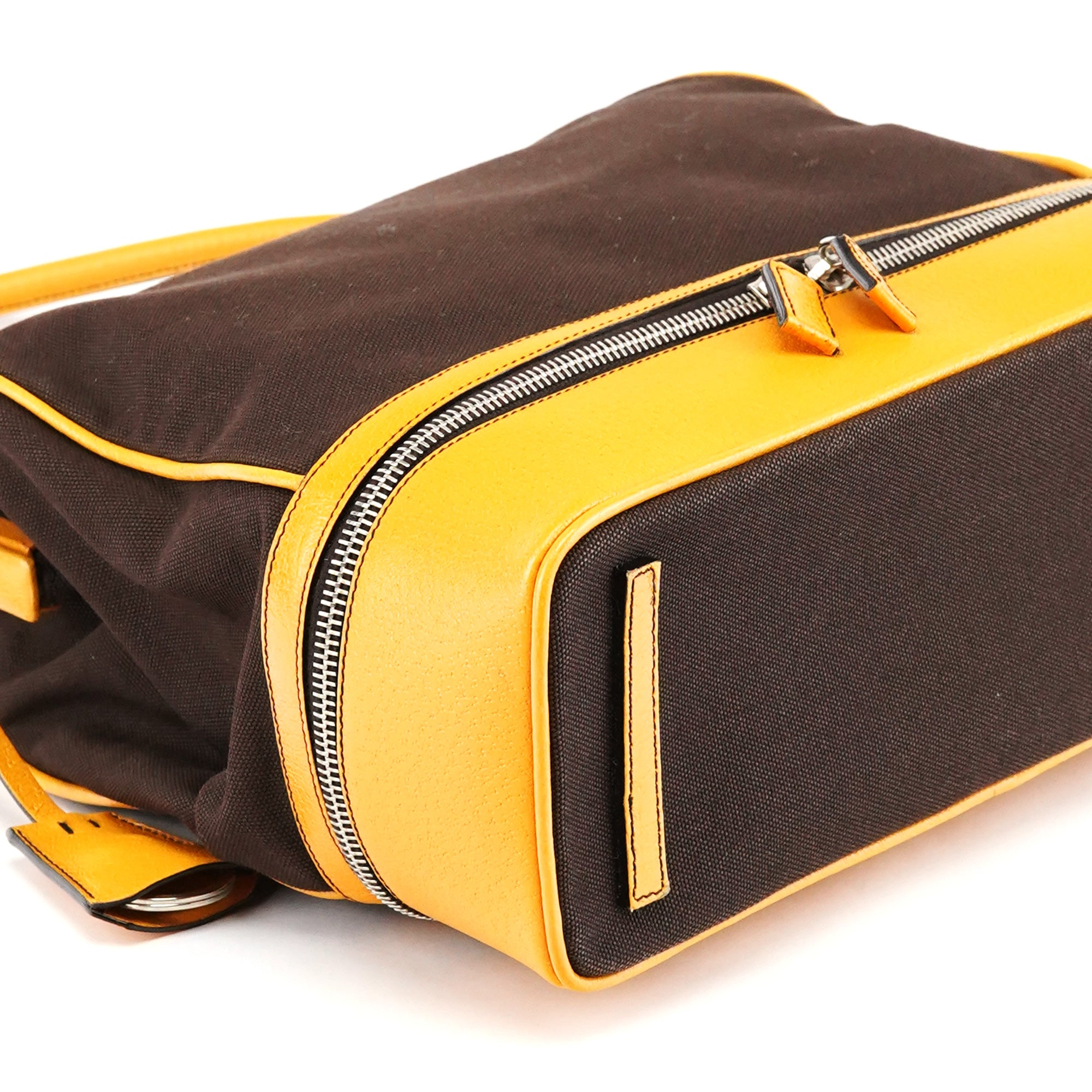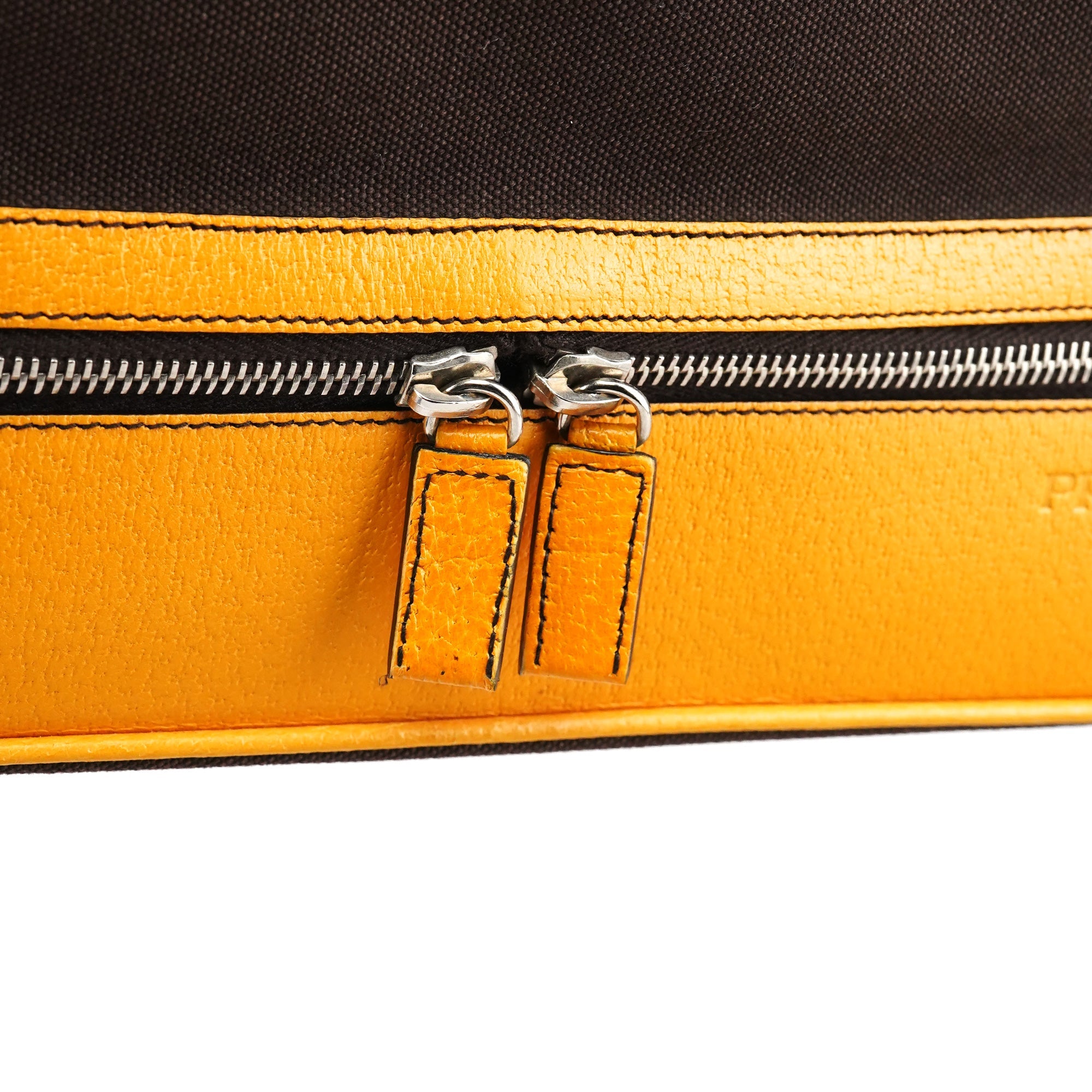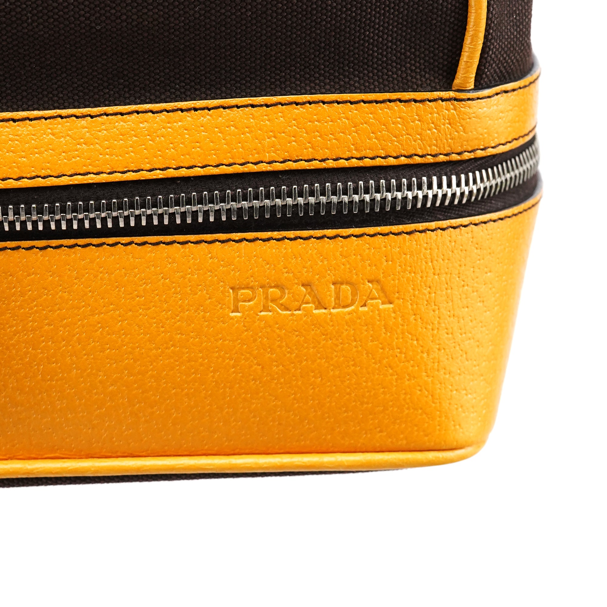 Designed for the Fall 2000 collection by Miuccia Prada, this Prada handbag pairs rich brown canvas with bold yellow leather trim for a clean, architectural look. The framed top, structured silhouette, and single shoulder strap give it a refined, modern feel, while the zipped lower compartment adds practical separation for everyday essentials. The interior is lined in signature logo jacquard with an interior zipper pocket.