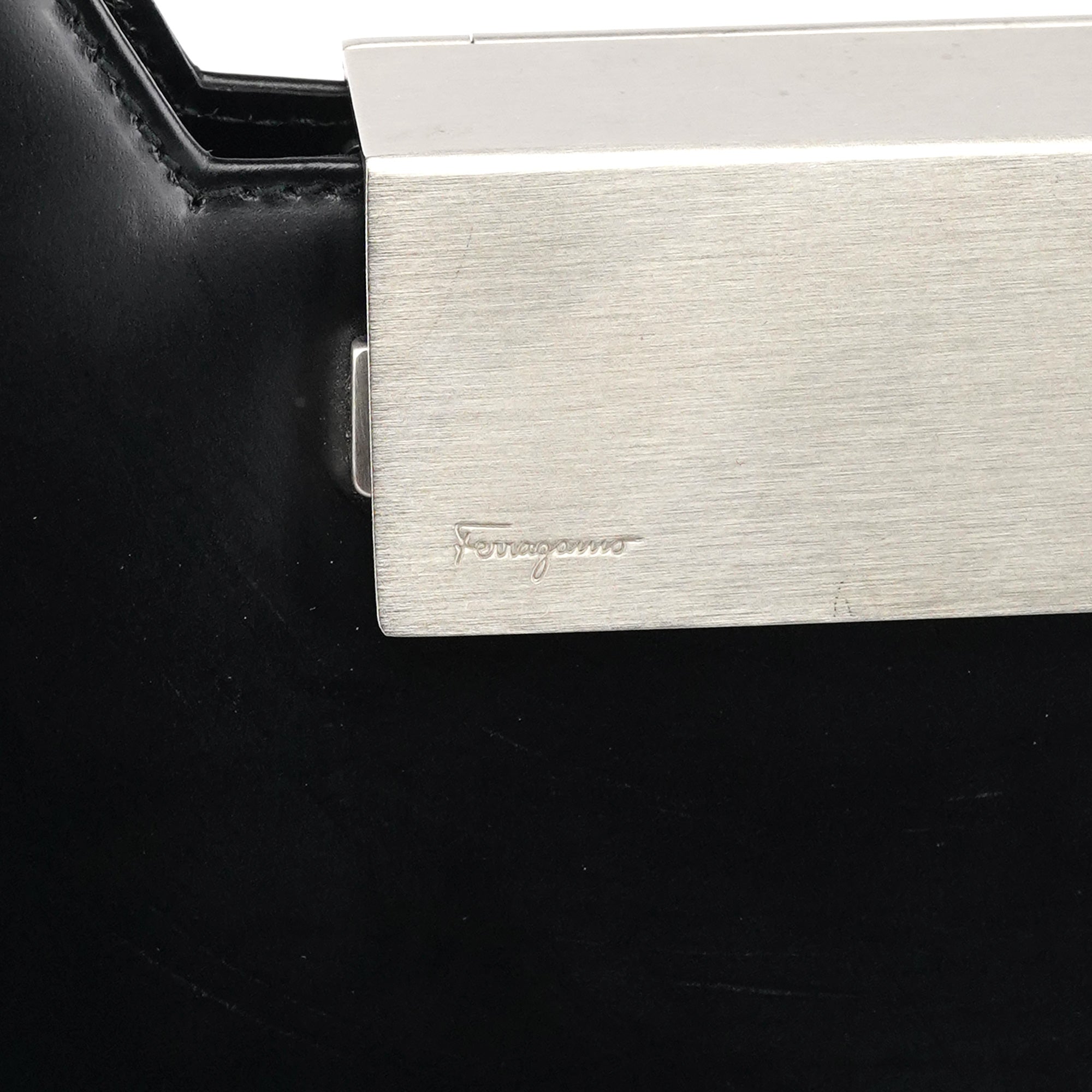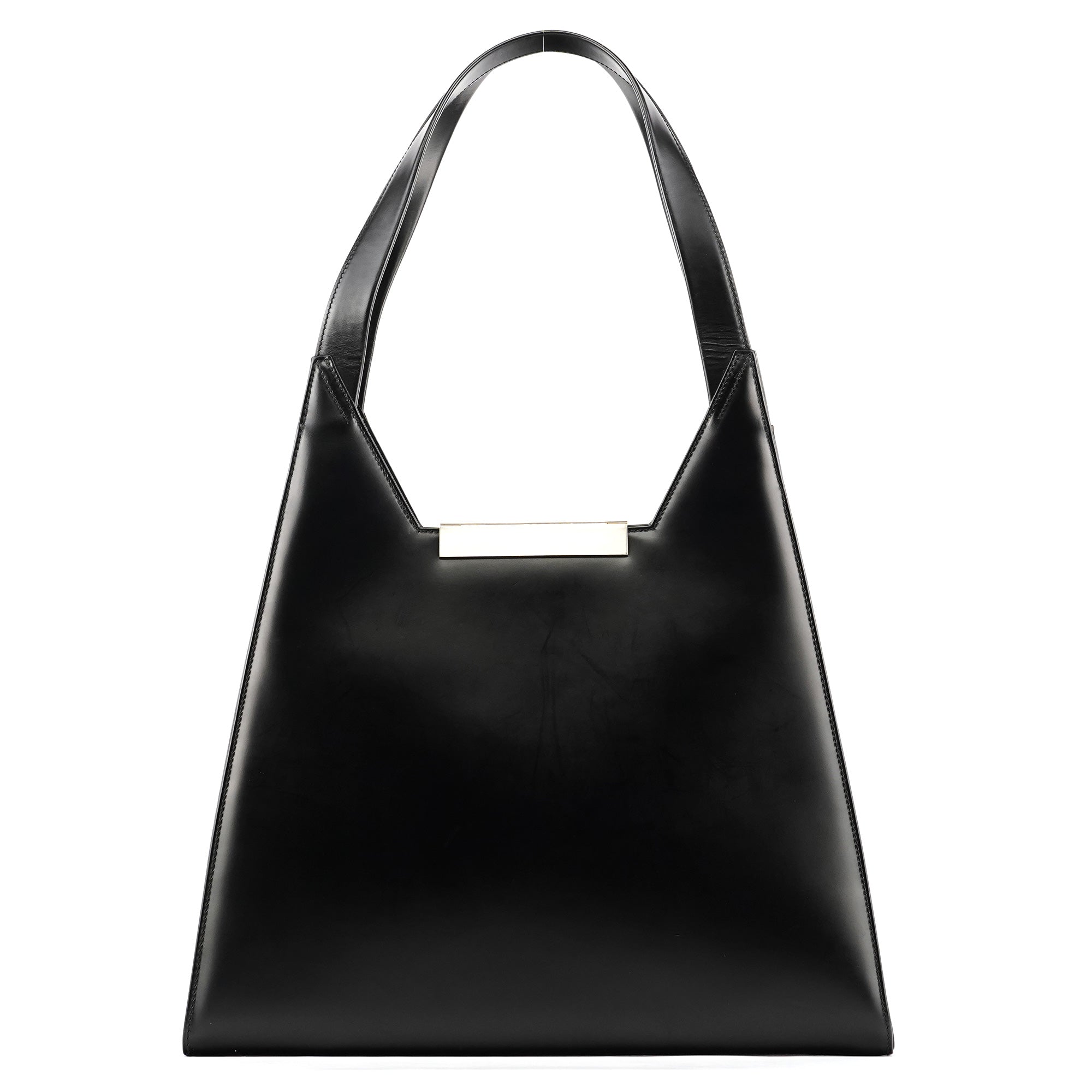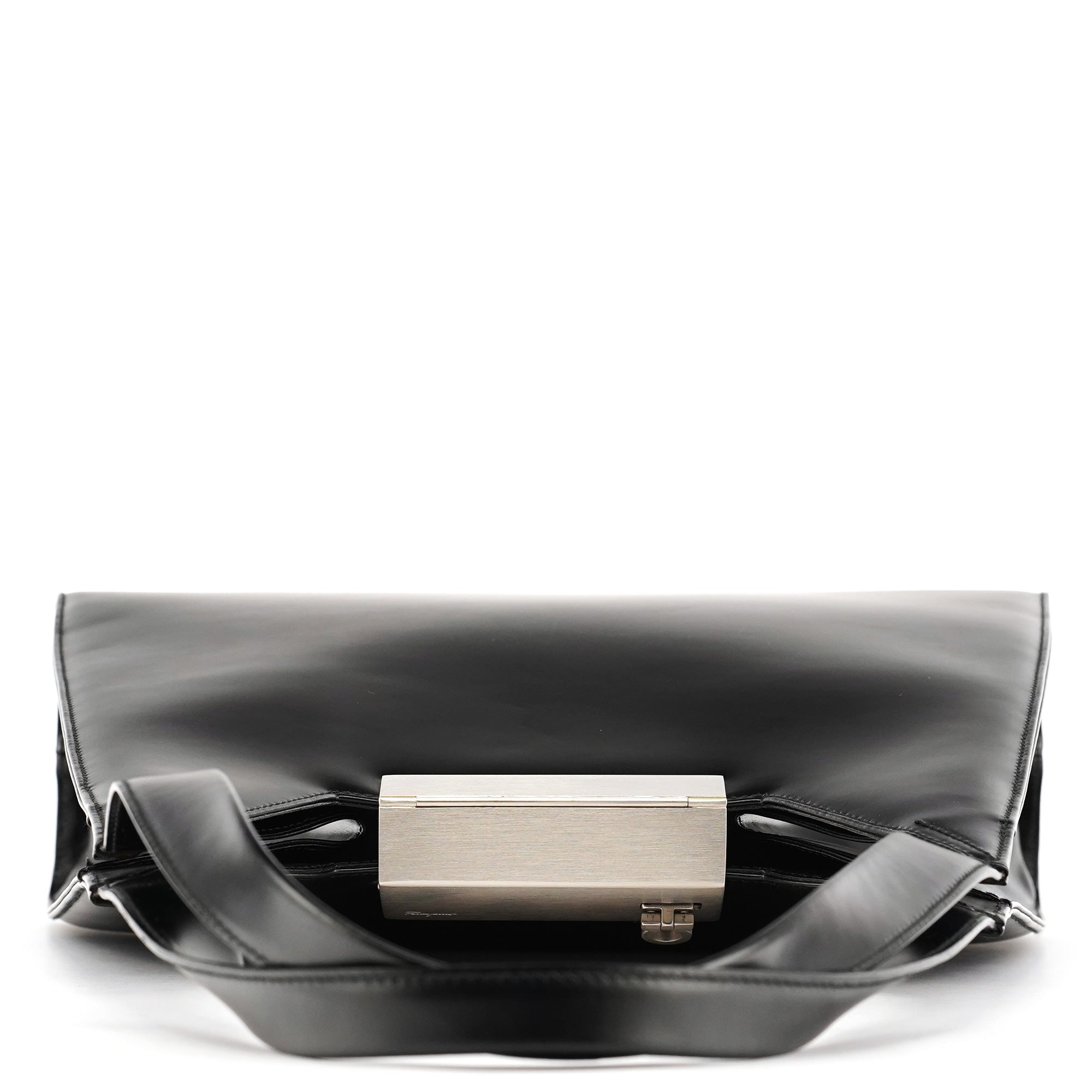 Designed in the late 1990s, this Salvatore Ferragamo hobo bag is crafted from smooth black leather with a geometric silhouette, long shoulder straps, and the signature Ferragamo metal clasp closure. The interior is lined in black fabric with a zip pocket.