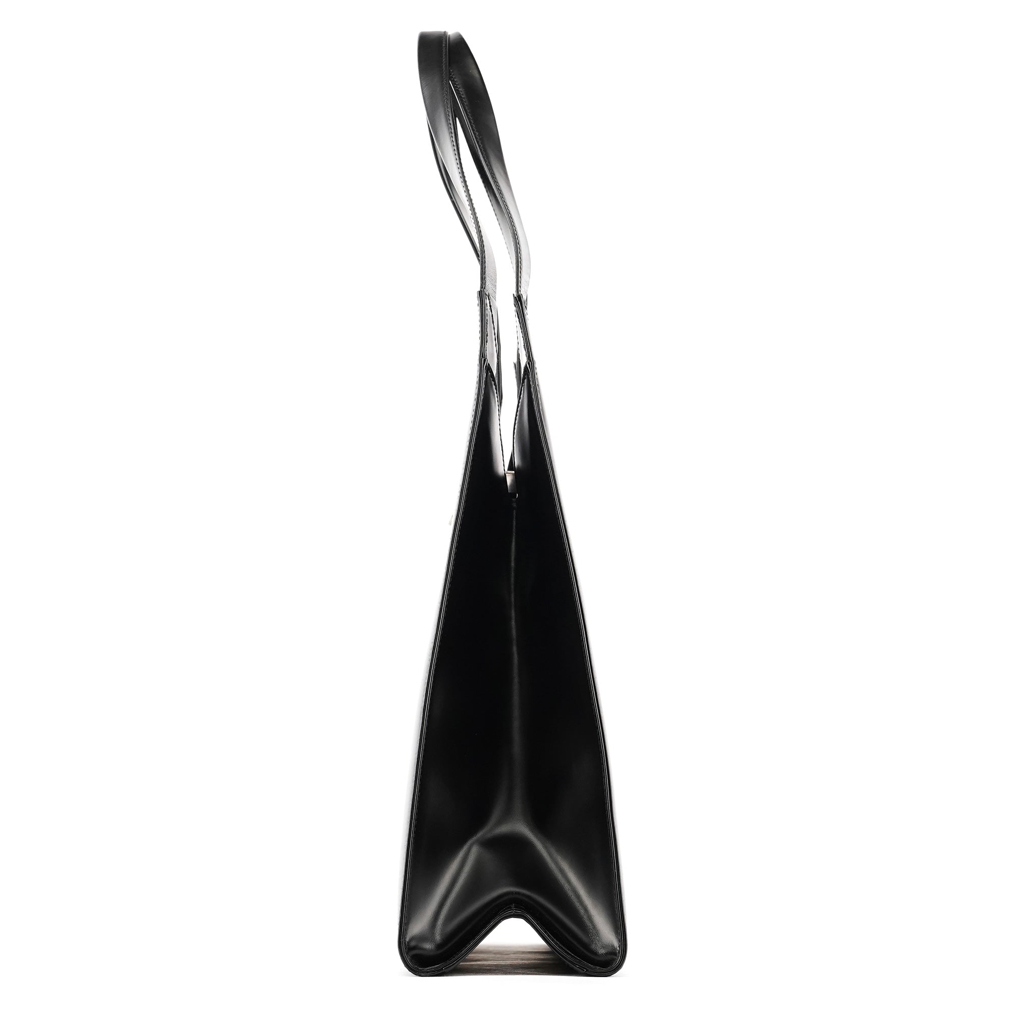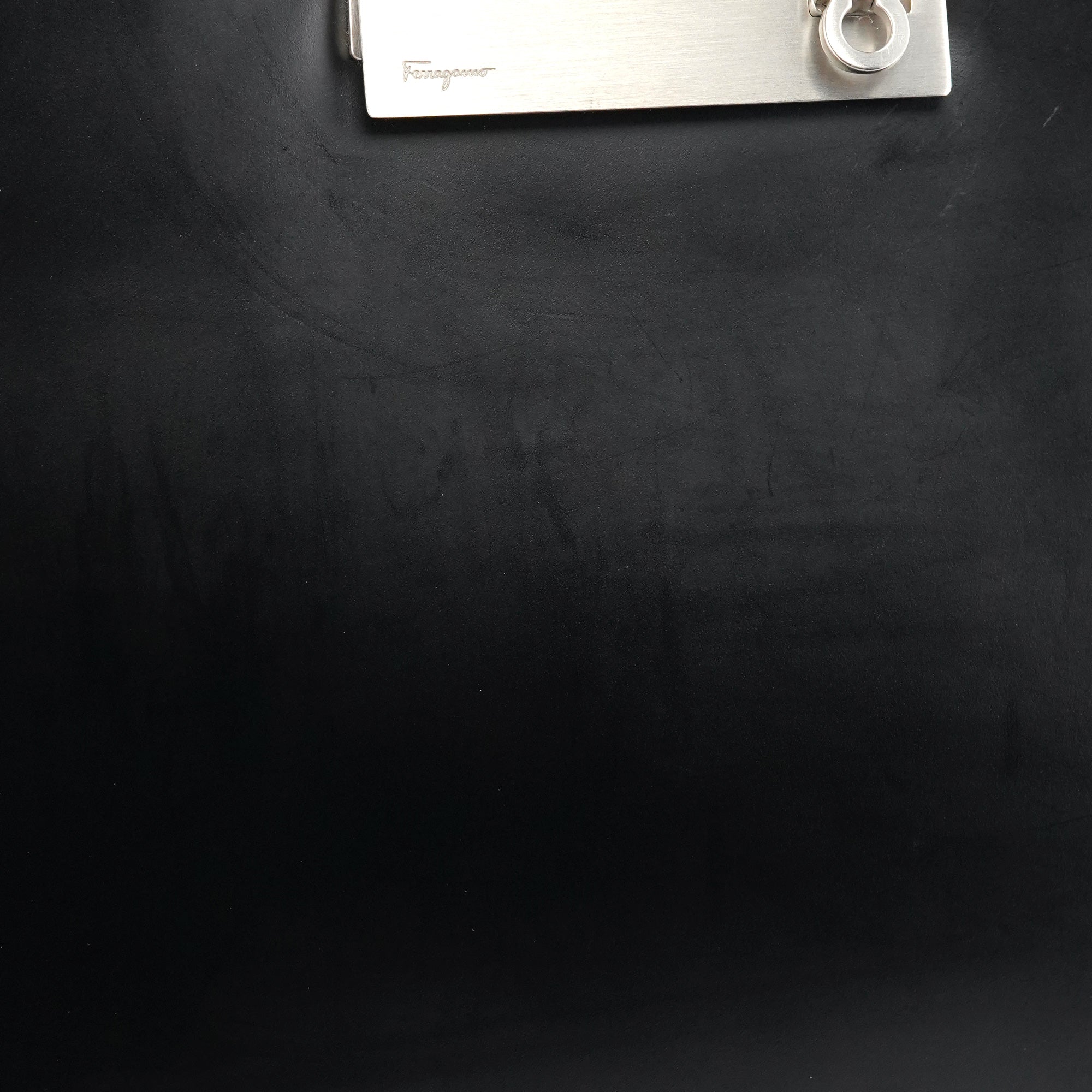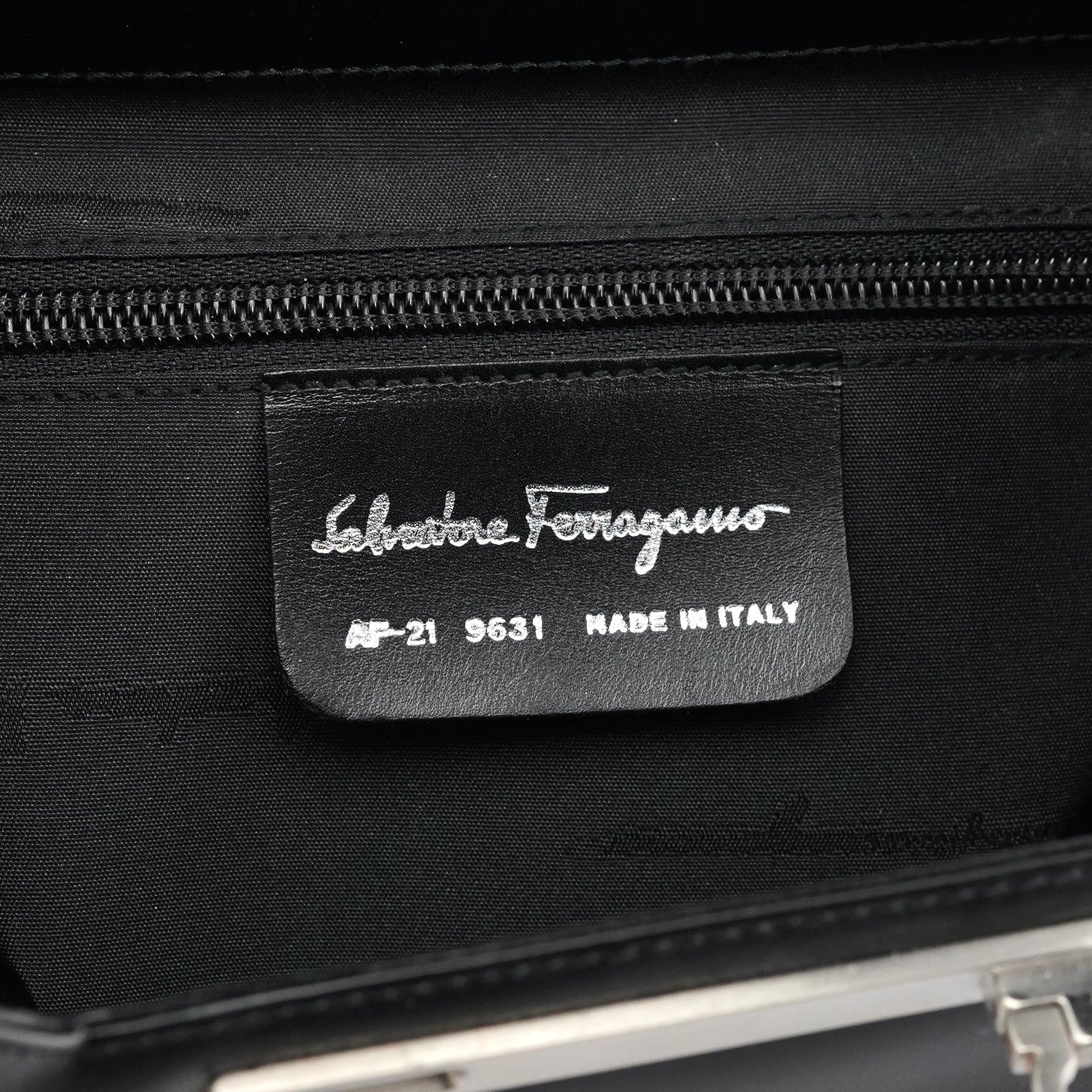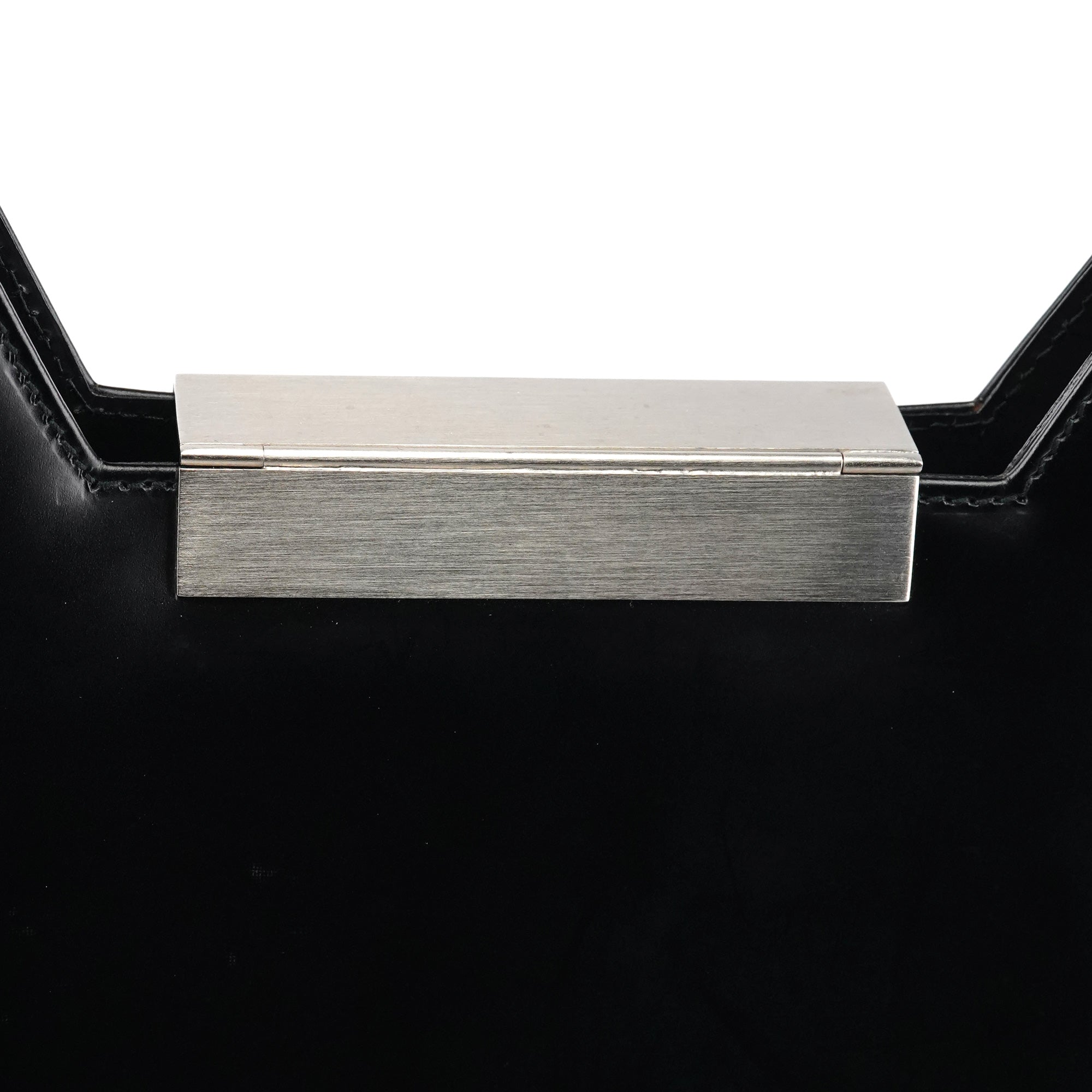 Designed in the late 1990s, this Salvatore Ferragamo hobo bag is crafted from smooth black leather with a geometric silhouette, long shoulder straps, and the signature Ferragamo metal clasp closure. The interior is lined in black fabric with a zip pocket.