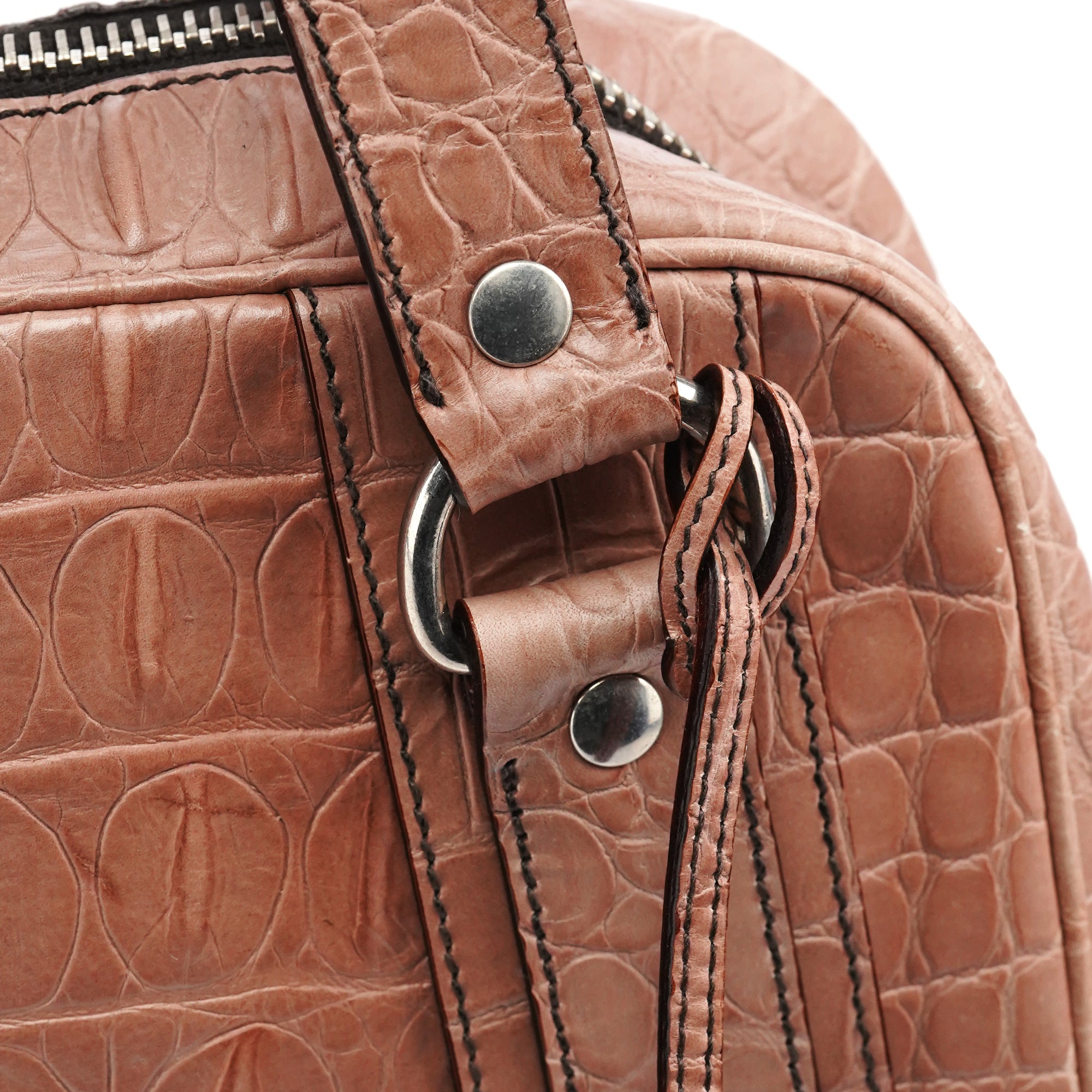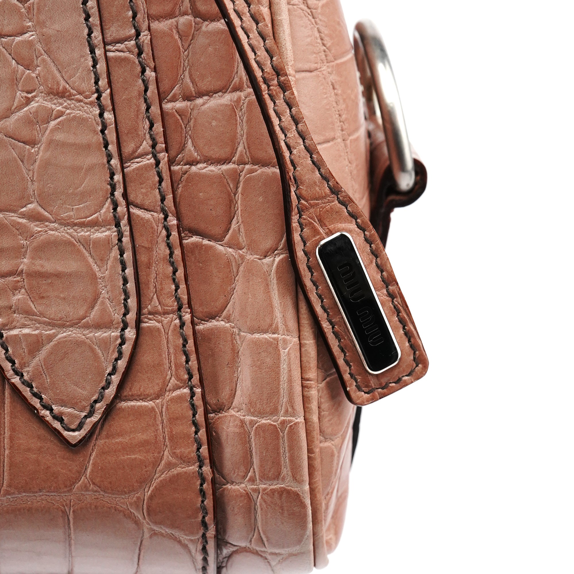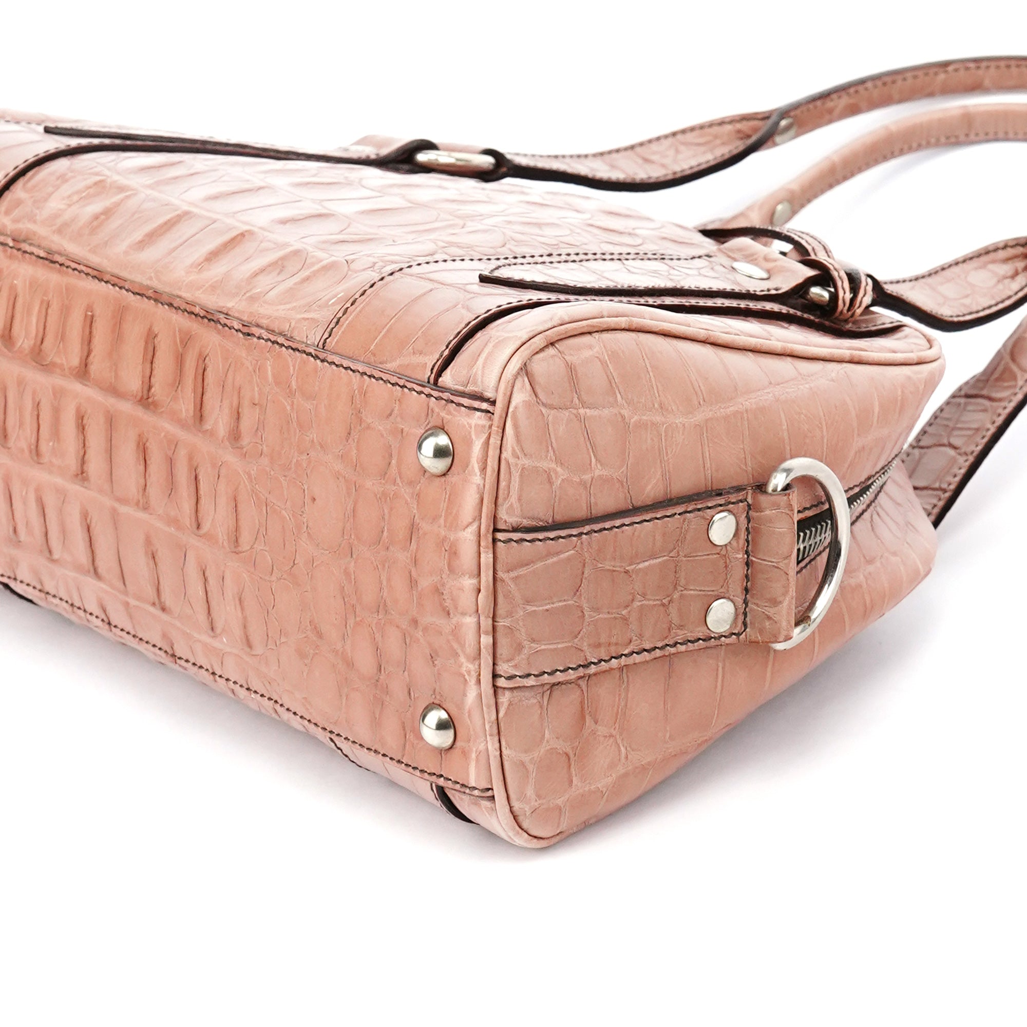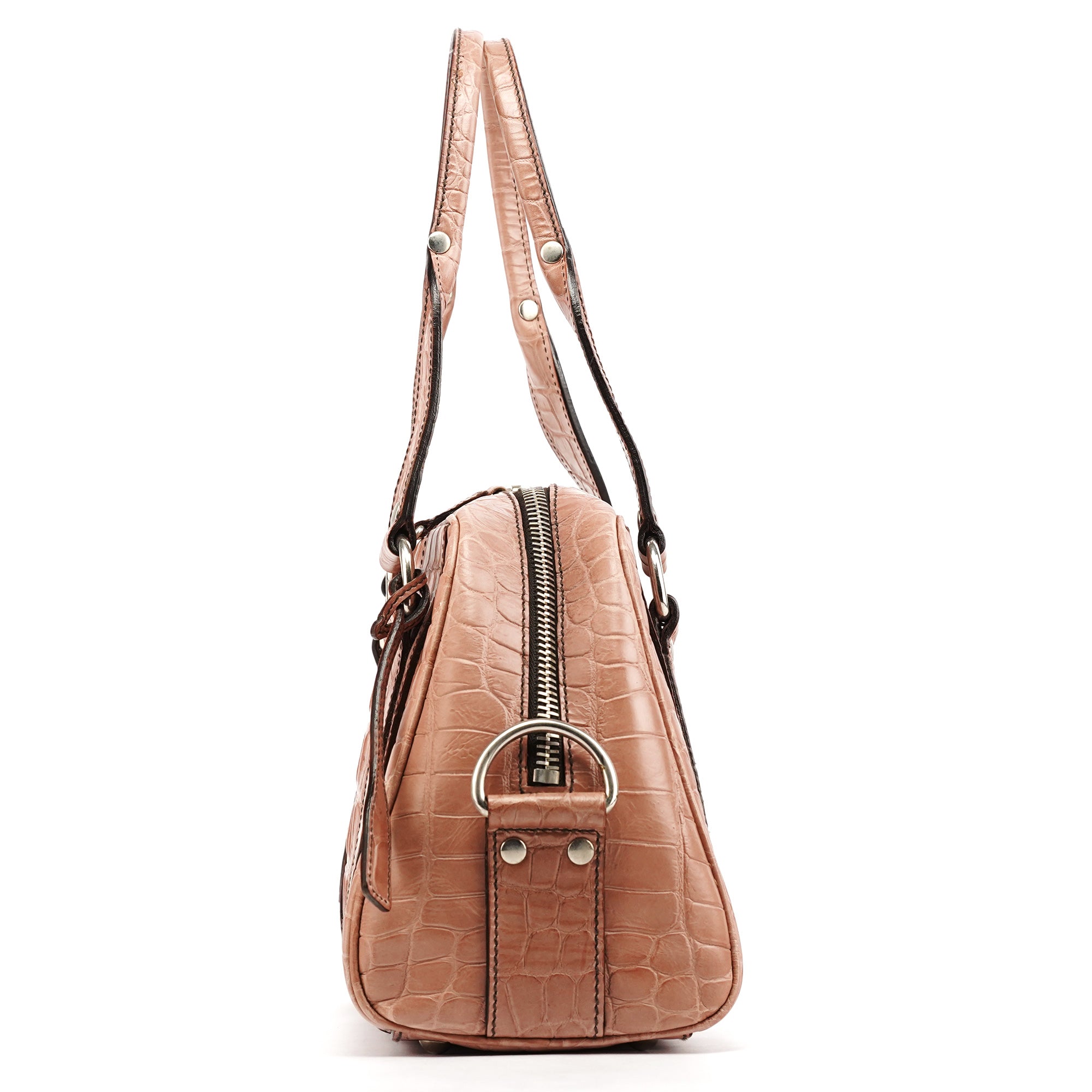Designed in the early 2000s by Miuccia Prada, this Miu Miu tote is crafted from soft pink croc-embossed leather, featuring dual rolled handles, silver-tone hardware, double zip closure, and a structured everyday silhouette.