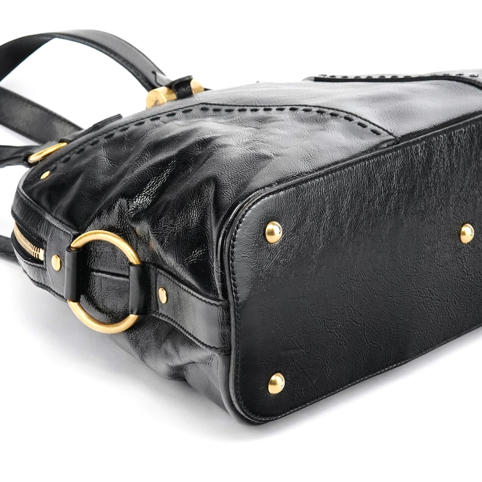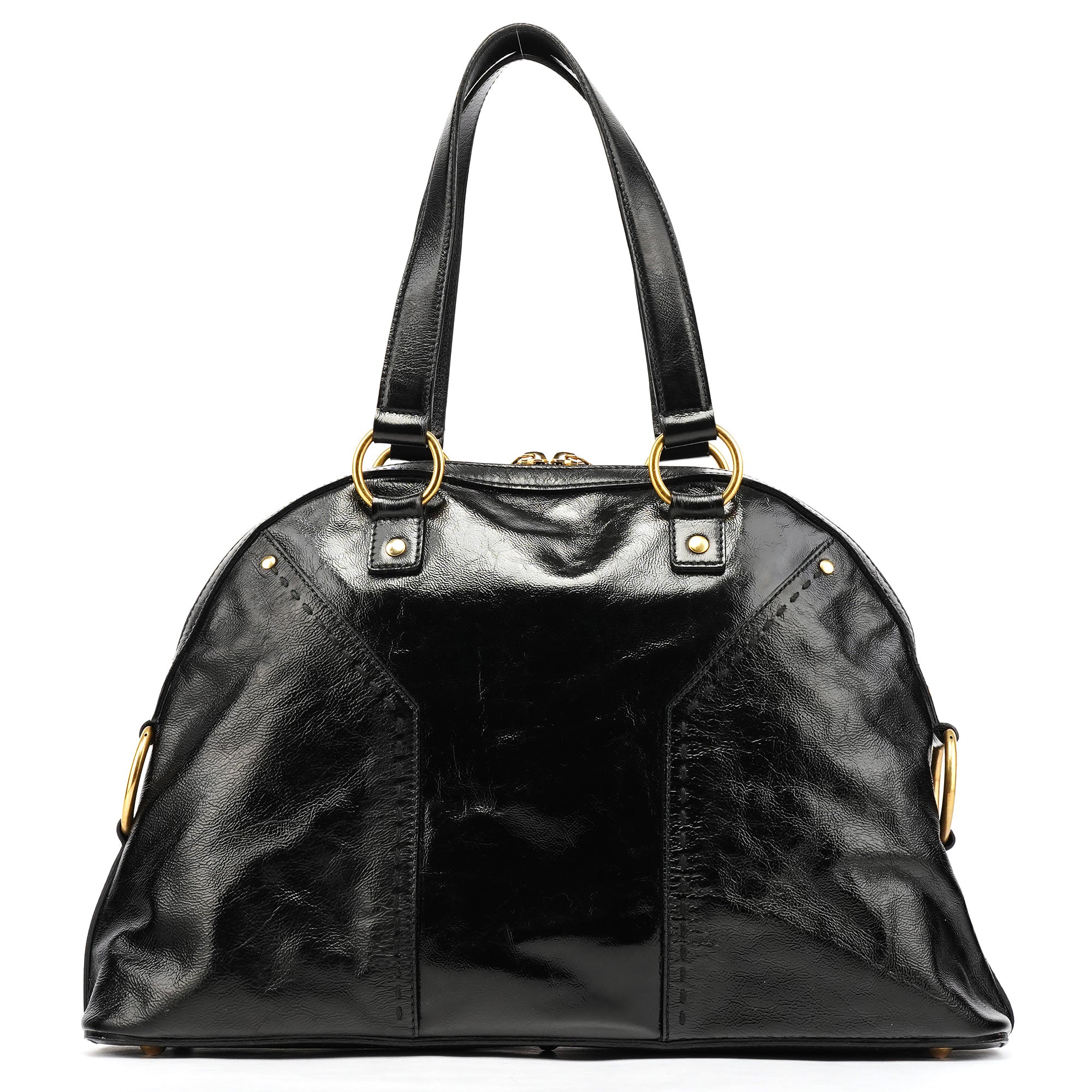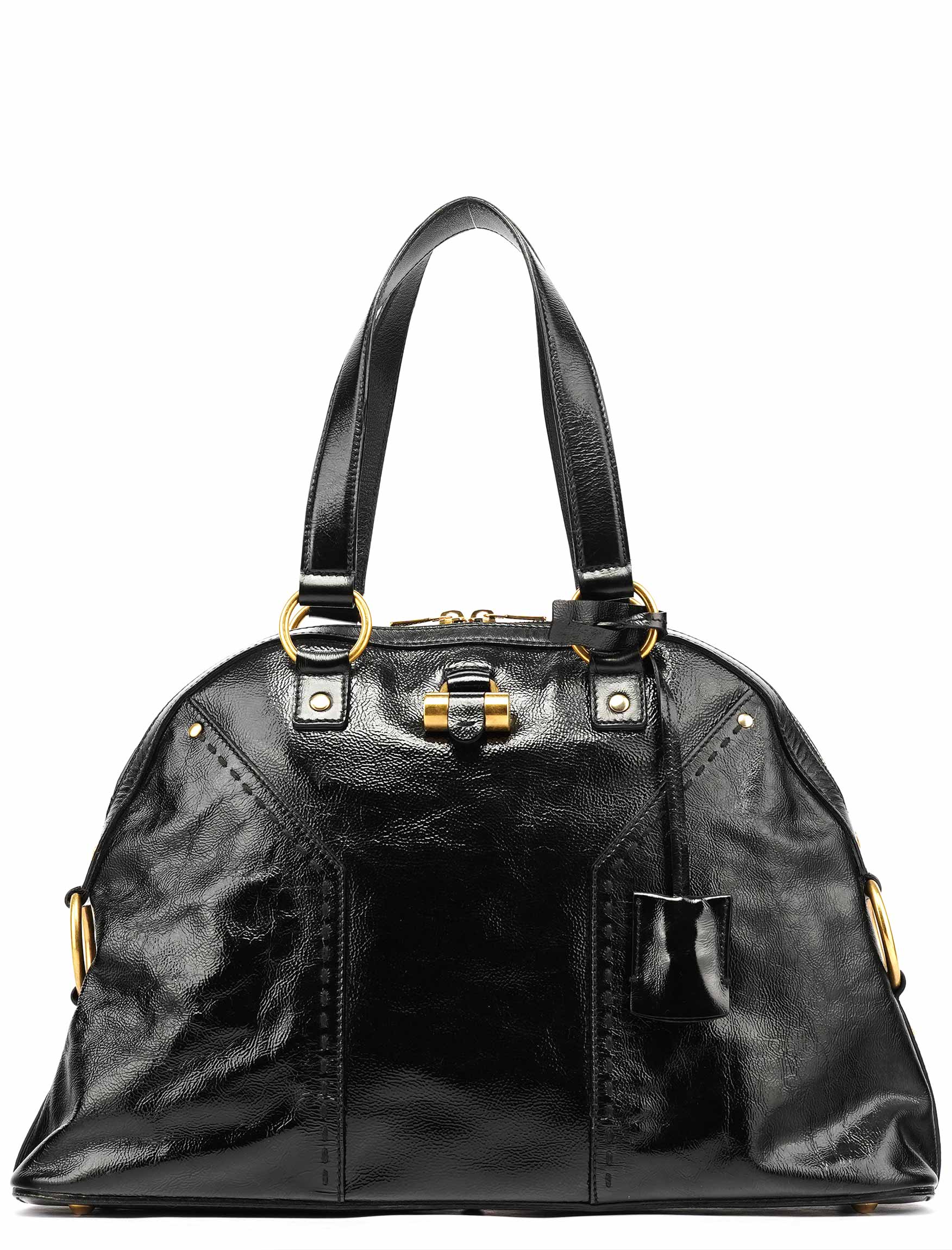 Designed in the late 2000s, the Yves Saint Laurent Muse tote bag is crafted from glossy black patent leather accented with brass hardware. Its structured dome silhouette features dual top handles, a double-zip closure, and the signature front padlock detail with matching leather clochette and key. The interior opens to a spacious satin-lined compartment with a zip pocket, combining everyday functionality with refined sophistication.