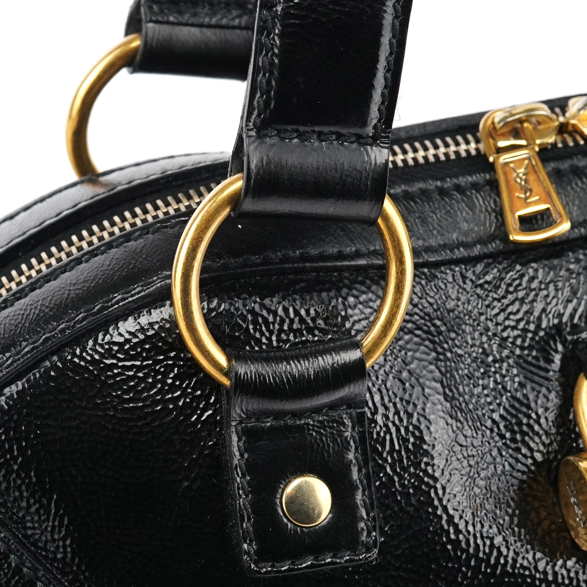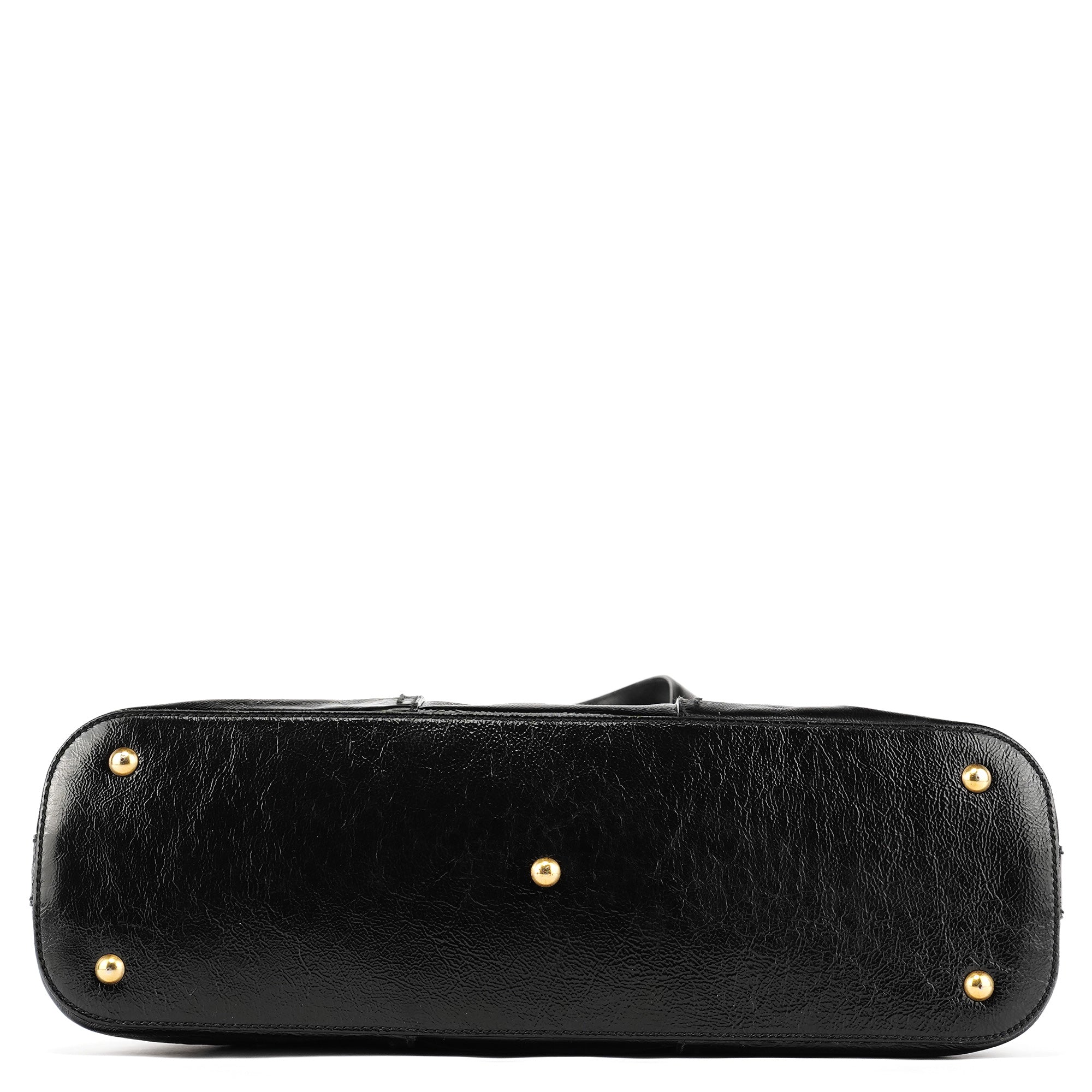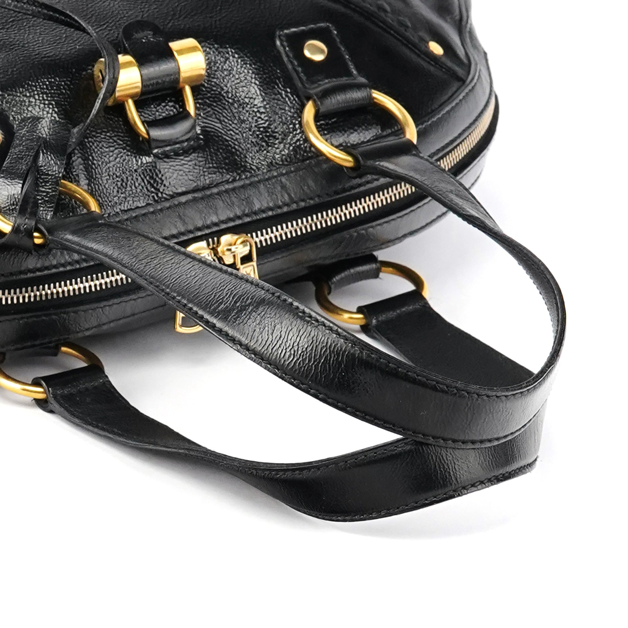 Designed in the late 2000s, the Yves Saint Laurent Muse tote bag is crafted from glossy black patent leather accented with brass hardware. Its structured dome silhouette features dual top handles, a double-zip closure, and the signature front padlock detail with matching leather clochette and key. The interior opens to a spacious satin-lined compartment with a zip pocket, combining everyday functionality with refined sophistication.