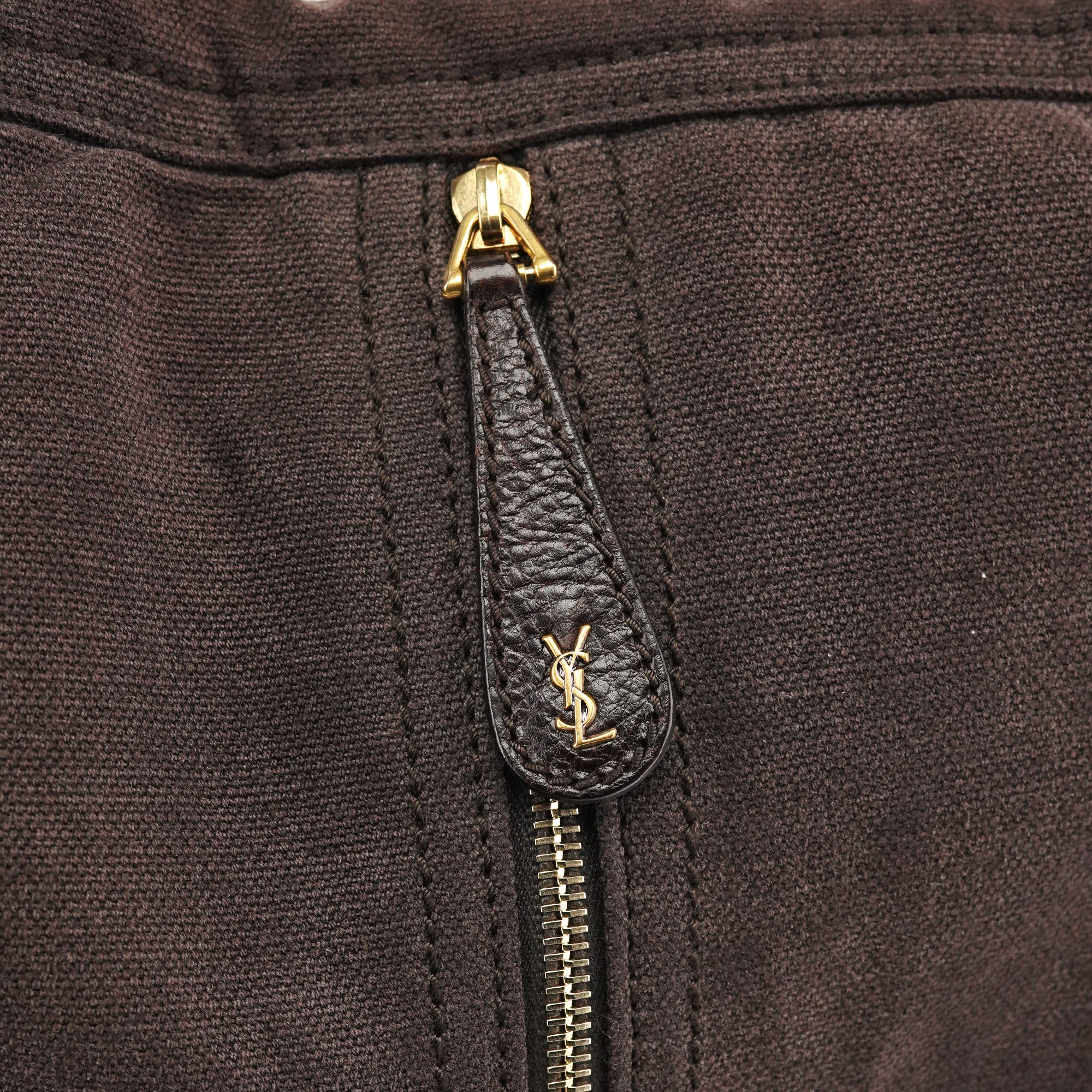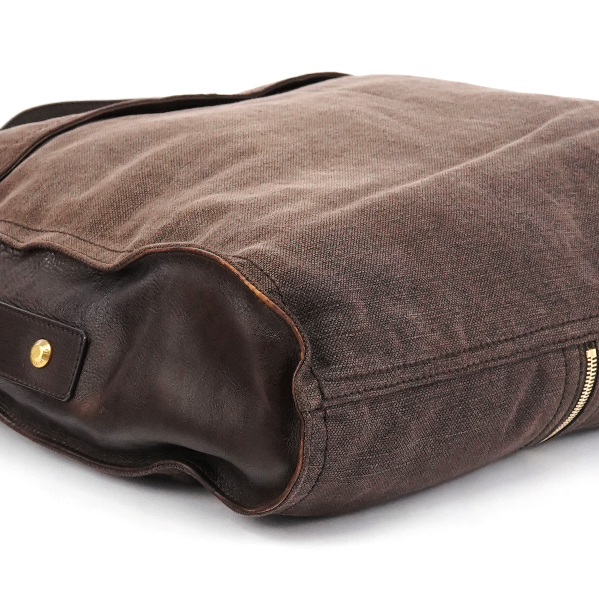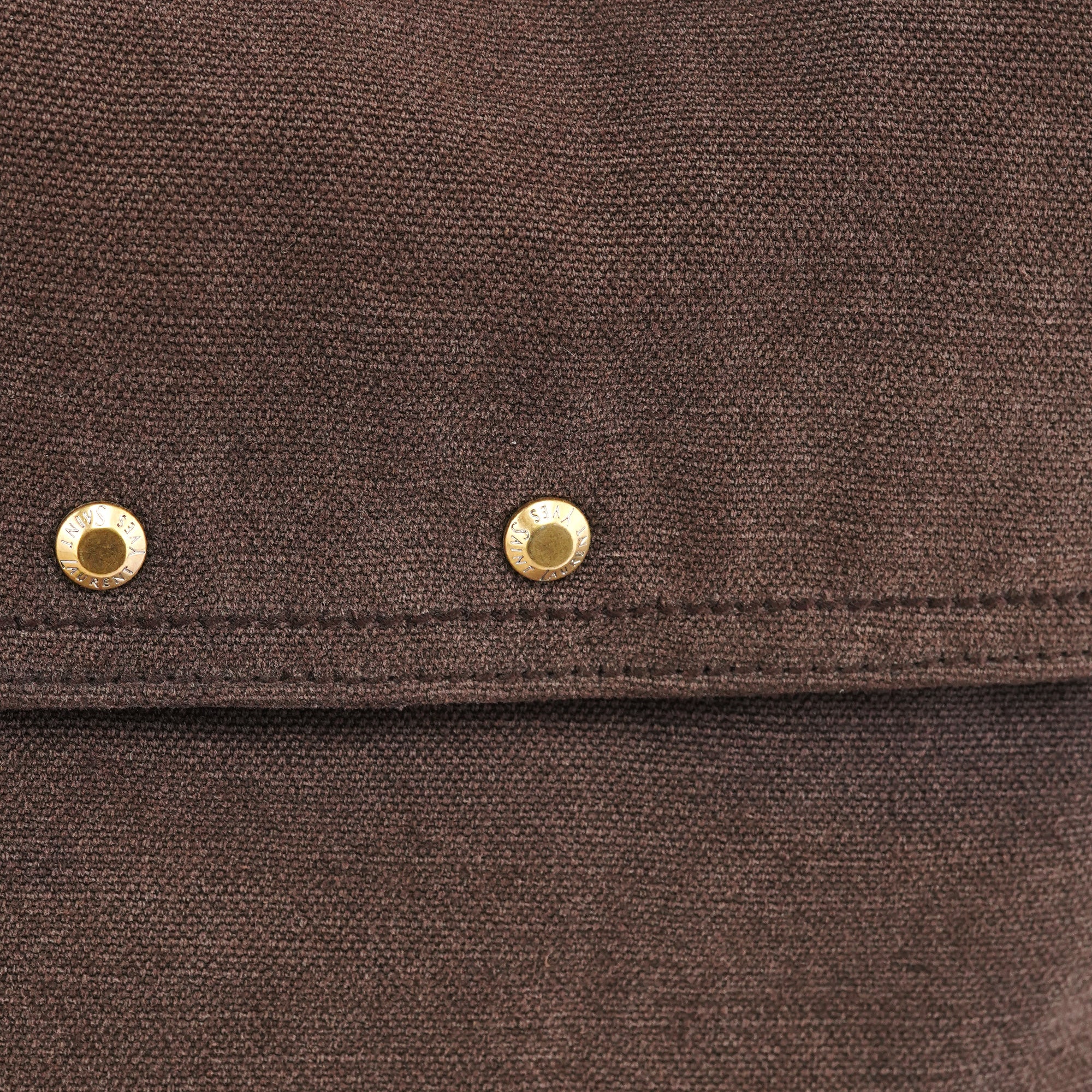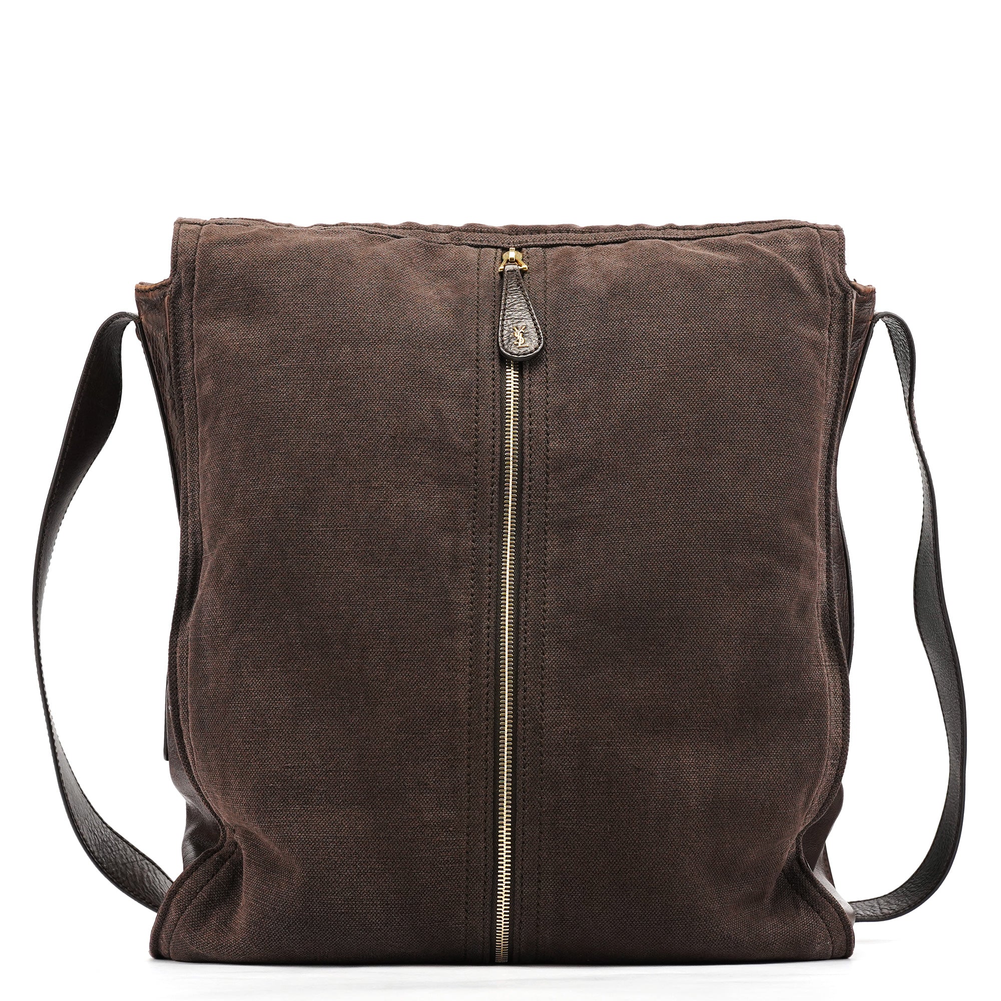 Designed in the mid-2000s, this Yves Saint Laurent crossbody is crafted in brown canvas with brown calfskin trim, featuring a folded flap with gold-tone studs, an adjustable leather strap, and a rear zip pocket finished with a calfskin pull and gold YSL hardware.