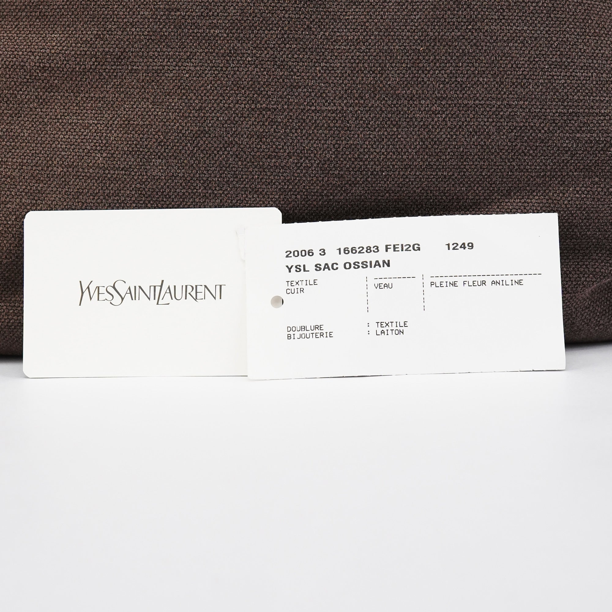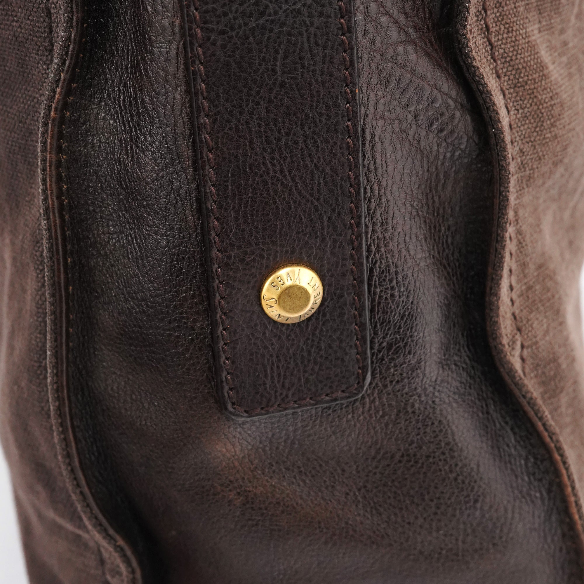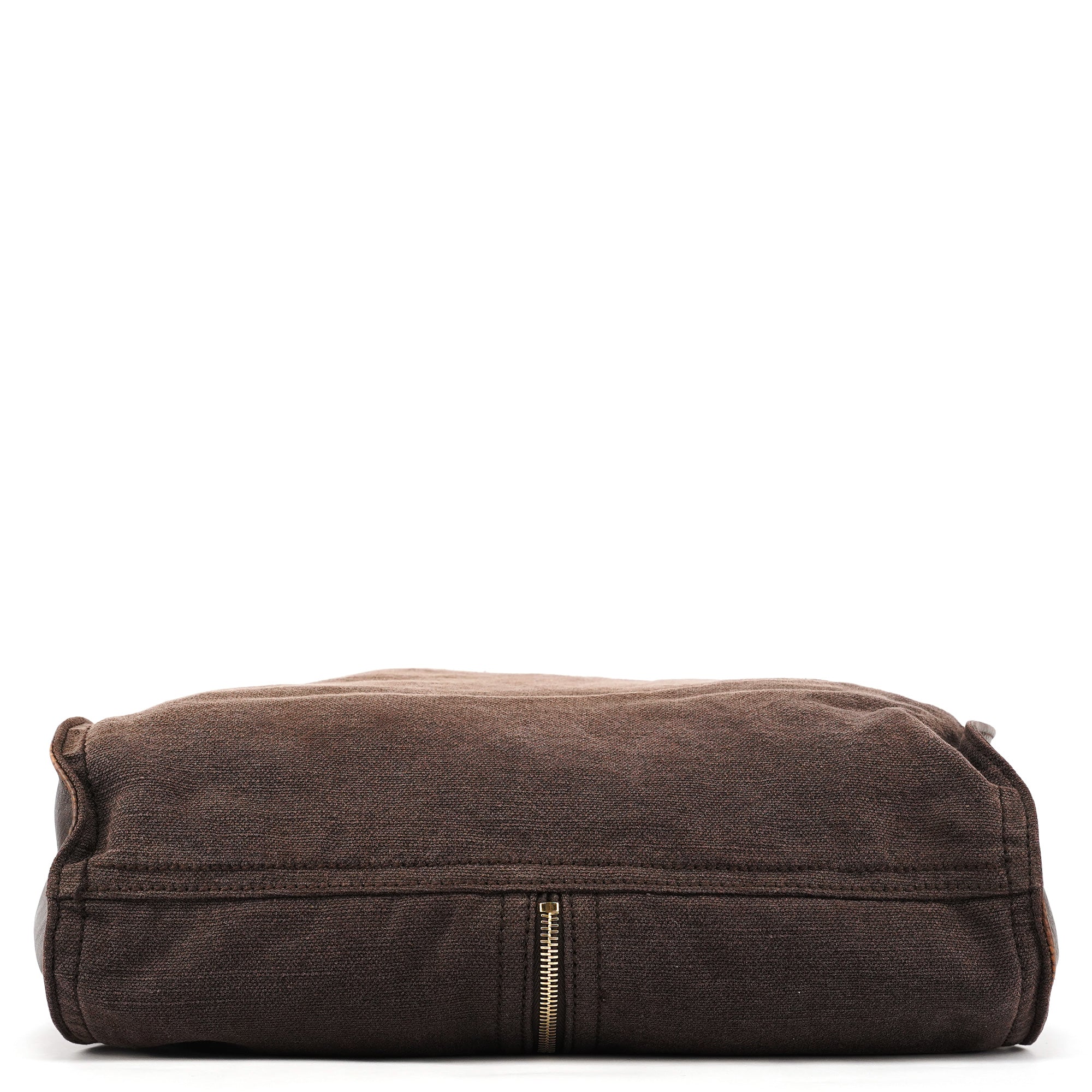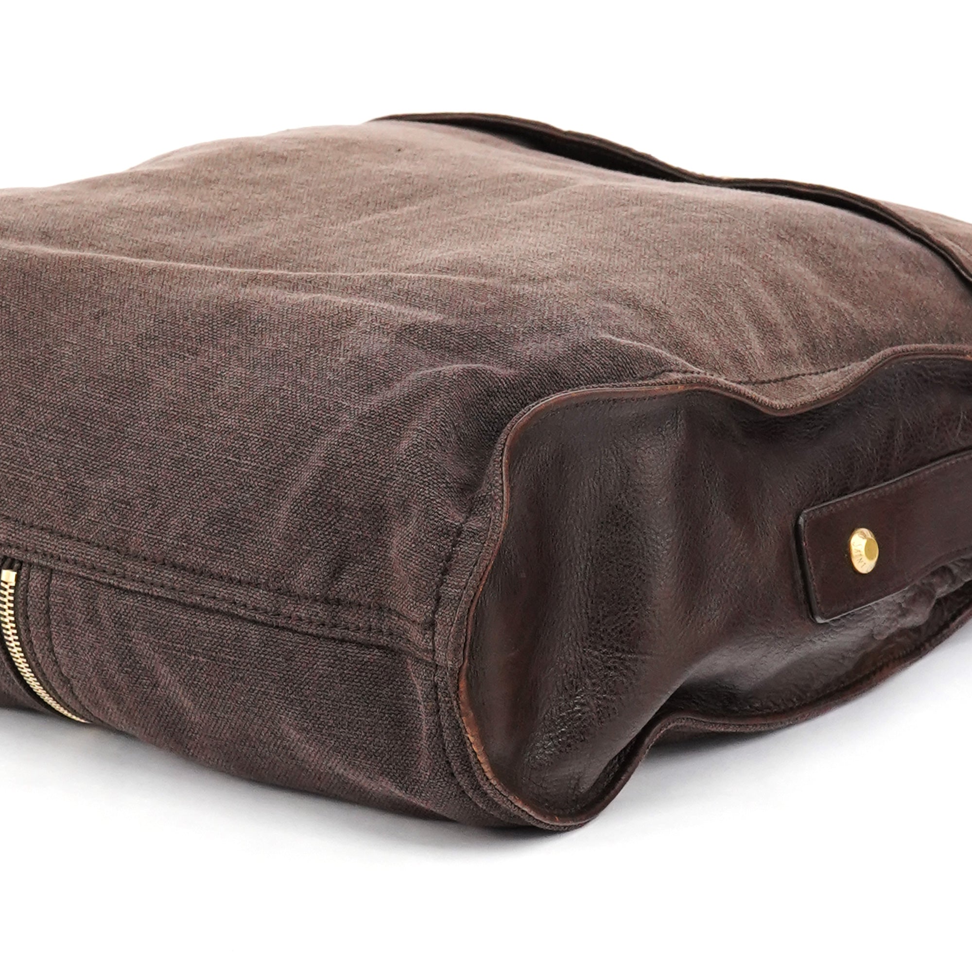 Designed in the mid-2000s, this Yves Saint Laurent crossbody is crafted in brown canvas with brown calfskin trim, featuring a folded flap with gold-tone studs, an adjustable leather strap, and a rear zip pocket finished with a calfskin pull and gold YSL hardware.