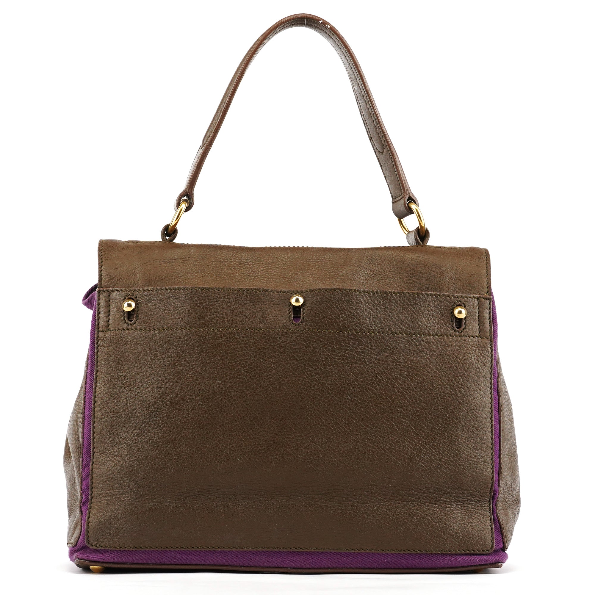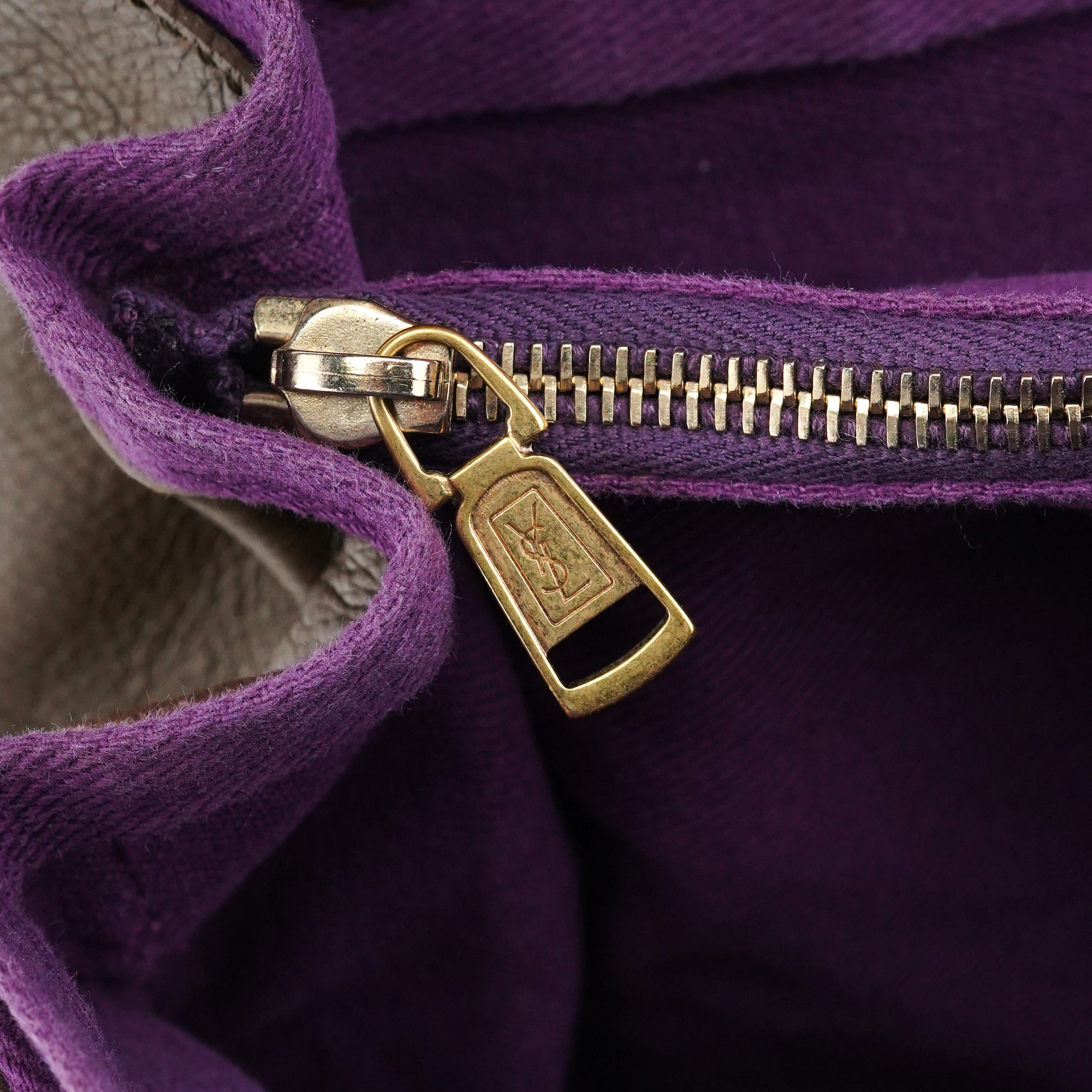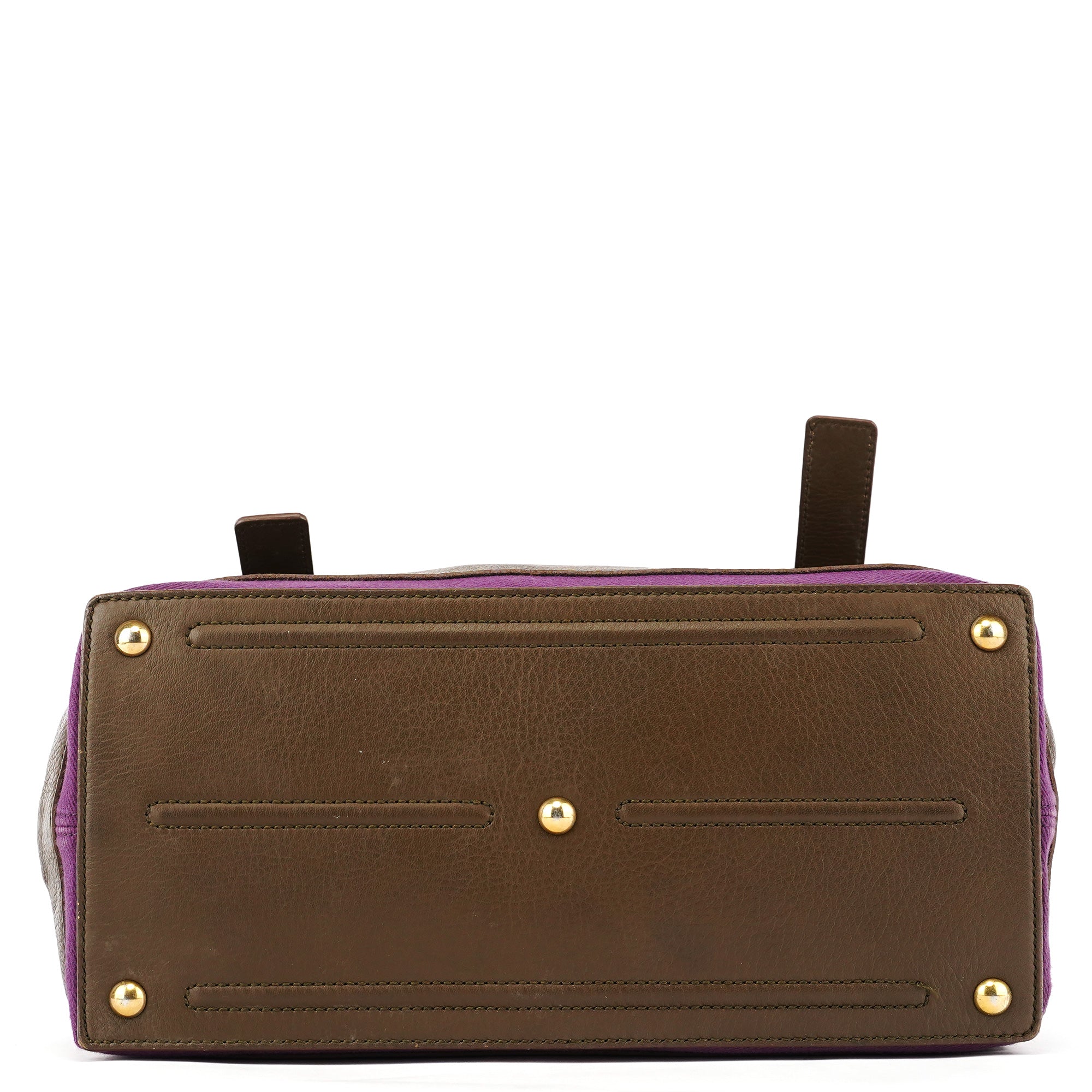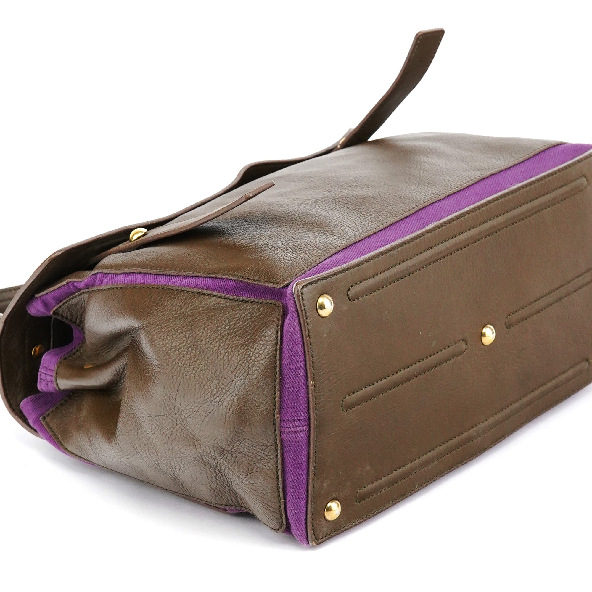 Designed in the late 2000s, this Yves Saint Laurent Muse Two bag is crafted in olive green leather with contrasting purple canvas trims. The structured silhouette features a curved flap with a gold-tone turn-lock closure, a single top handle, and subtle side straps. Inside, the purple canvas lining includes a zipped pocket for easy everyday organisation.