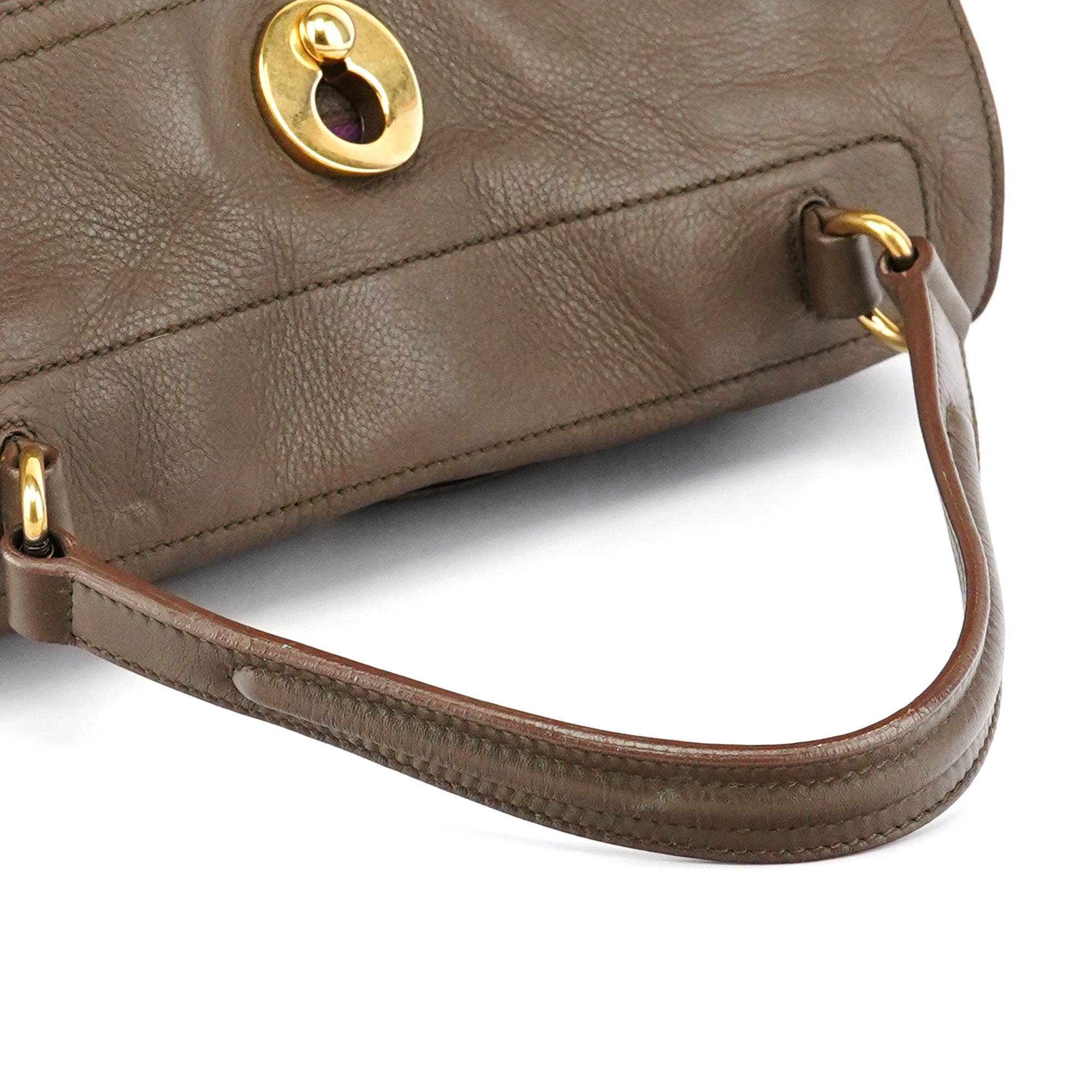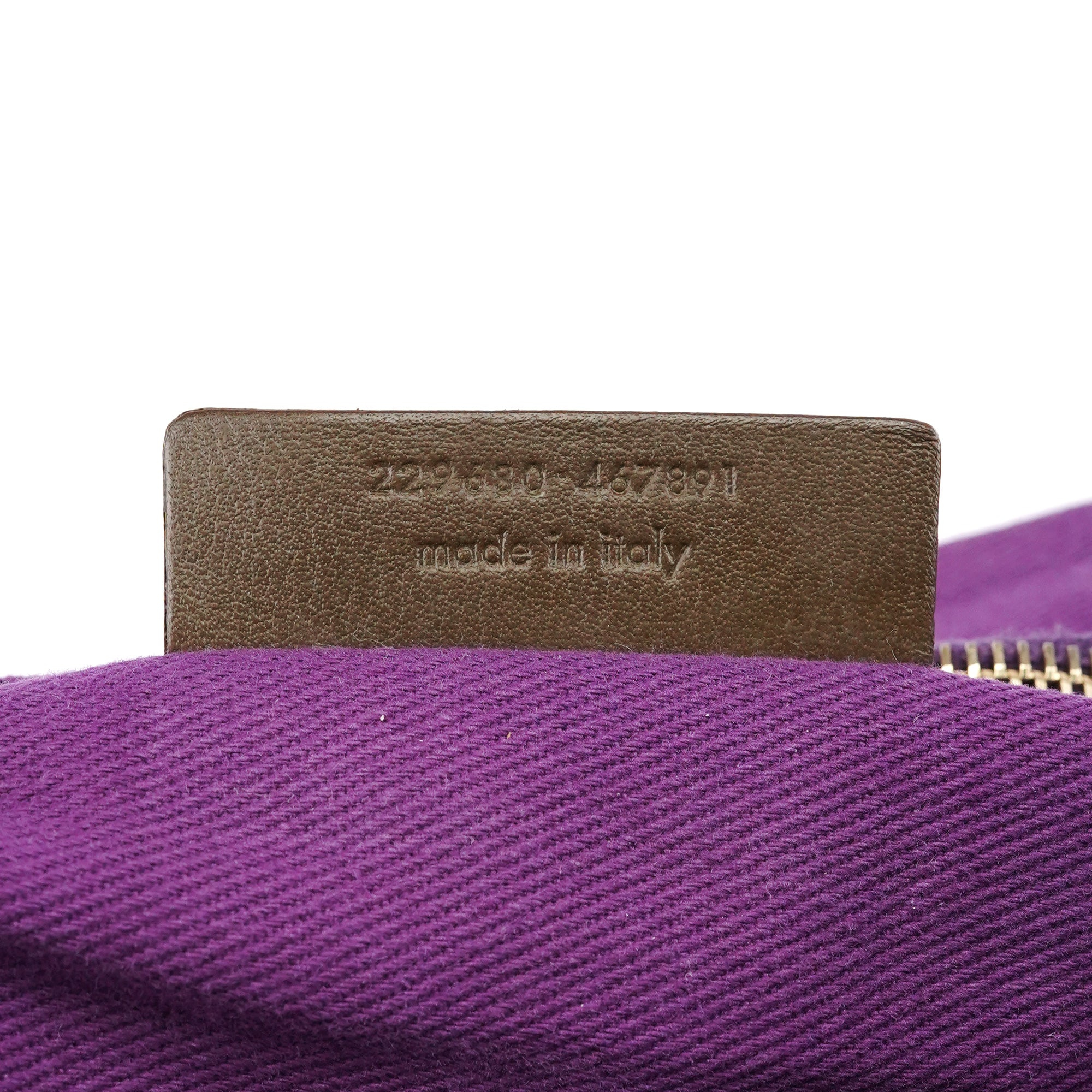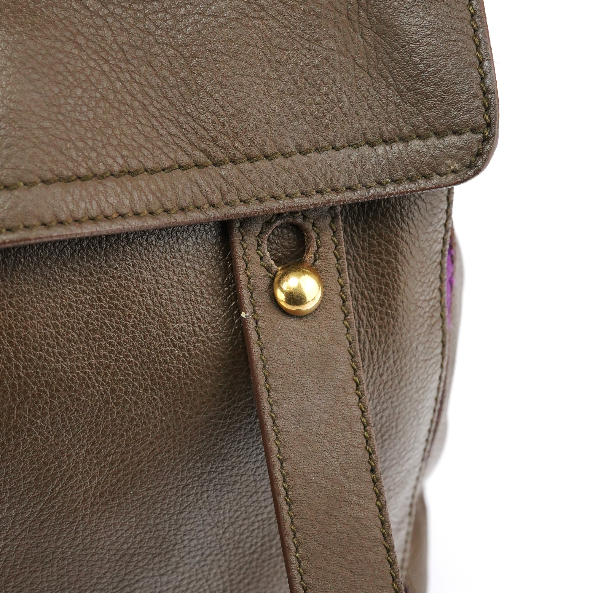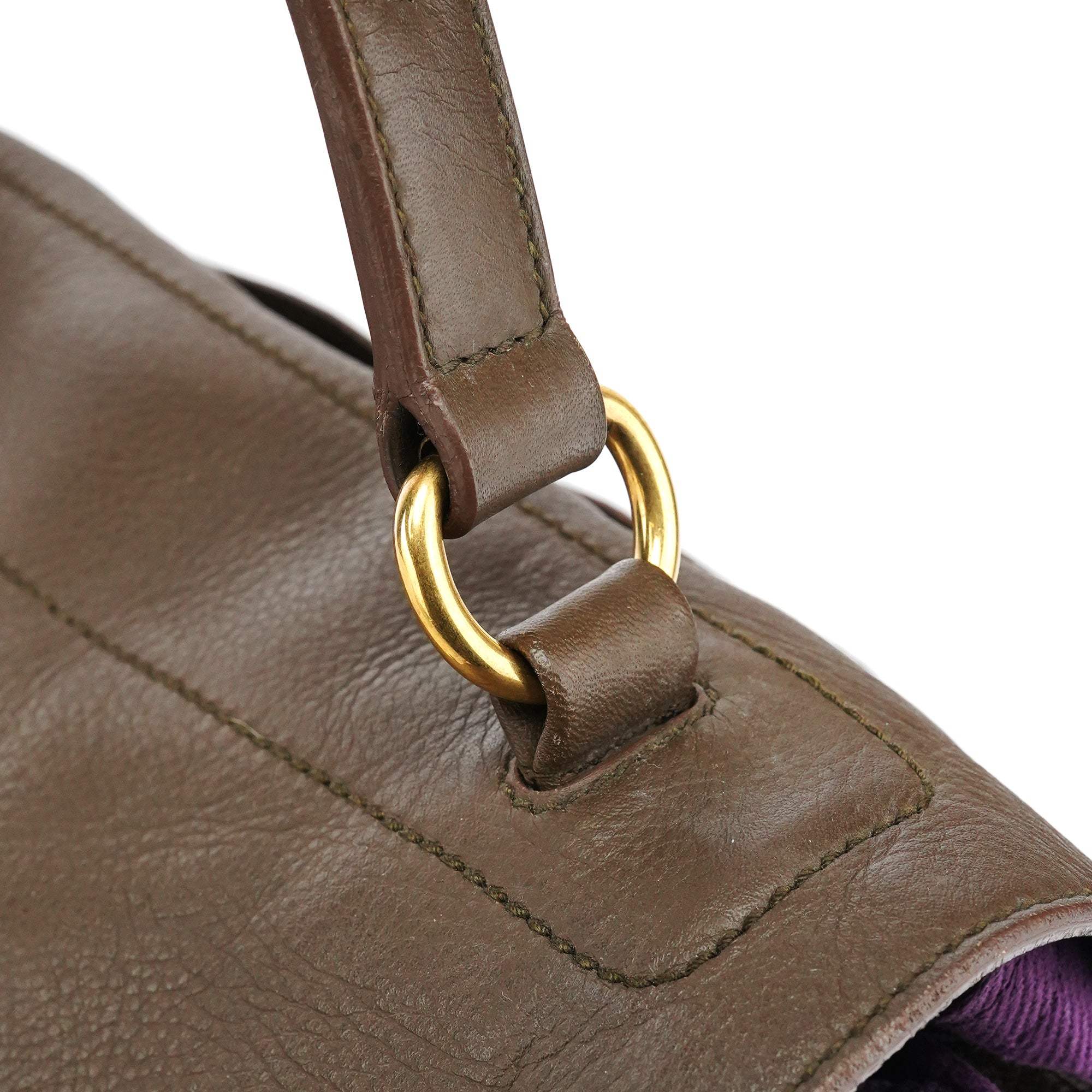 Designed in the late 2000s, this Yves Saint Laurent Muse Two bag is crafted in olive green leather with contrasting purple canvas trims. The structured silhouette features a curved flap with a gold-tone turn-lock closure, a single top handle, and subtle side straps. Inside, the purple canvas lining includes a zipped pocket for easy everyday organisation.