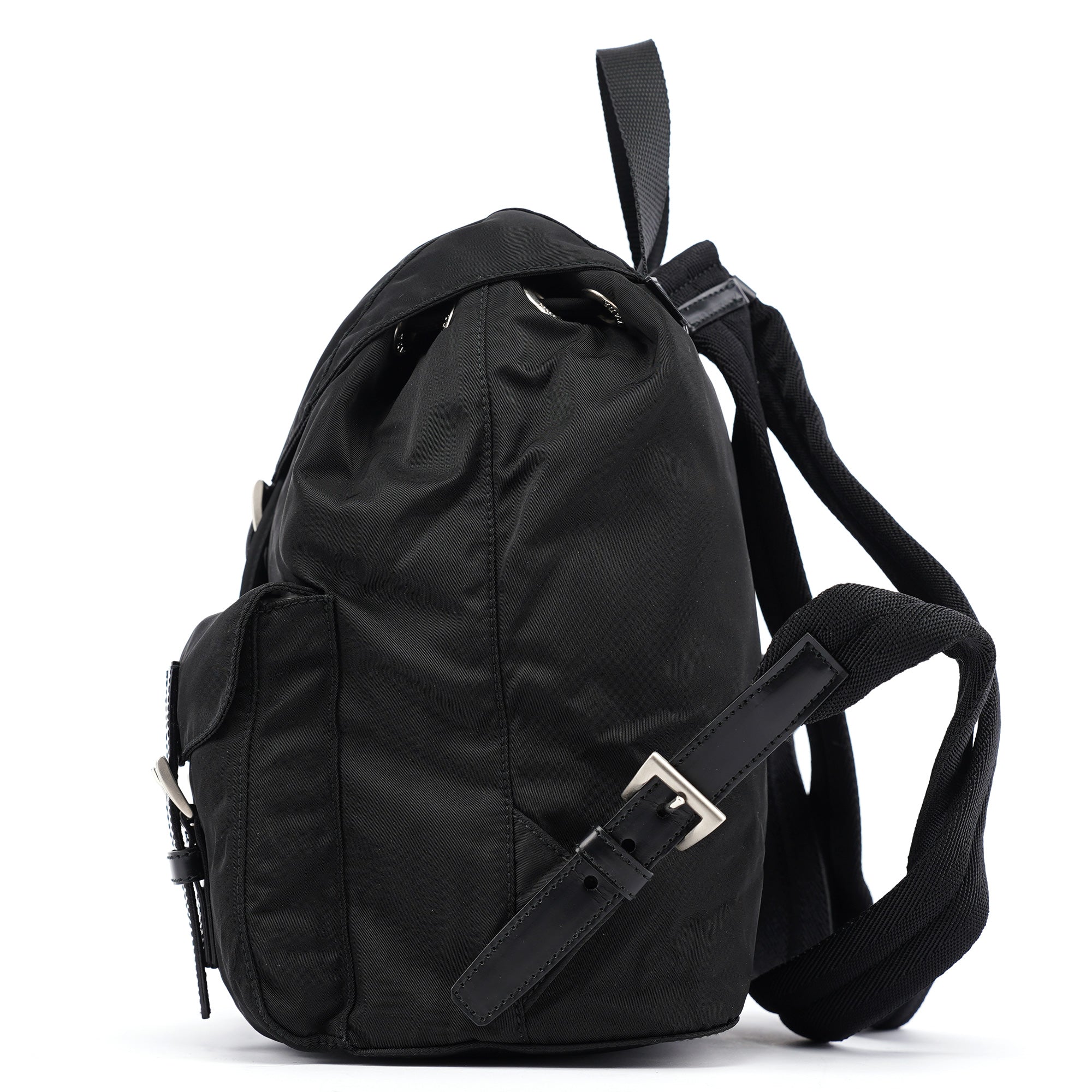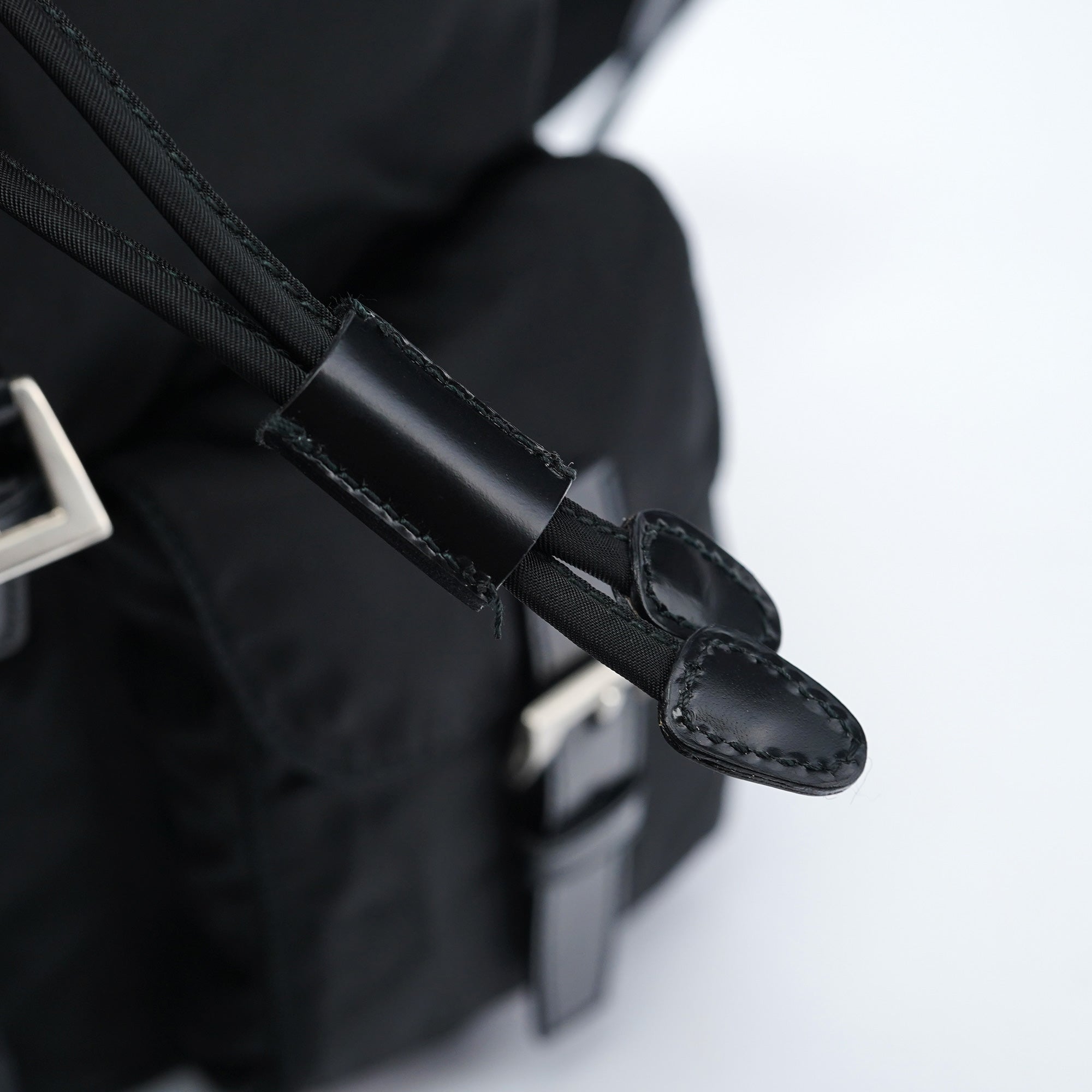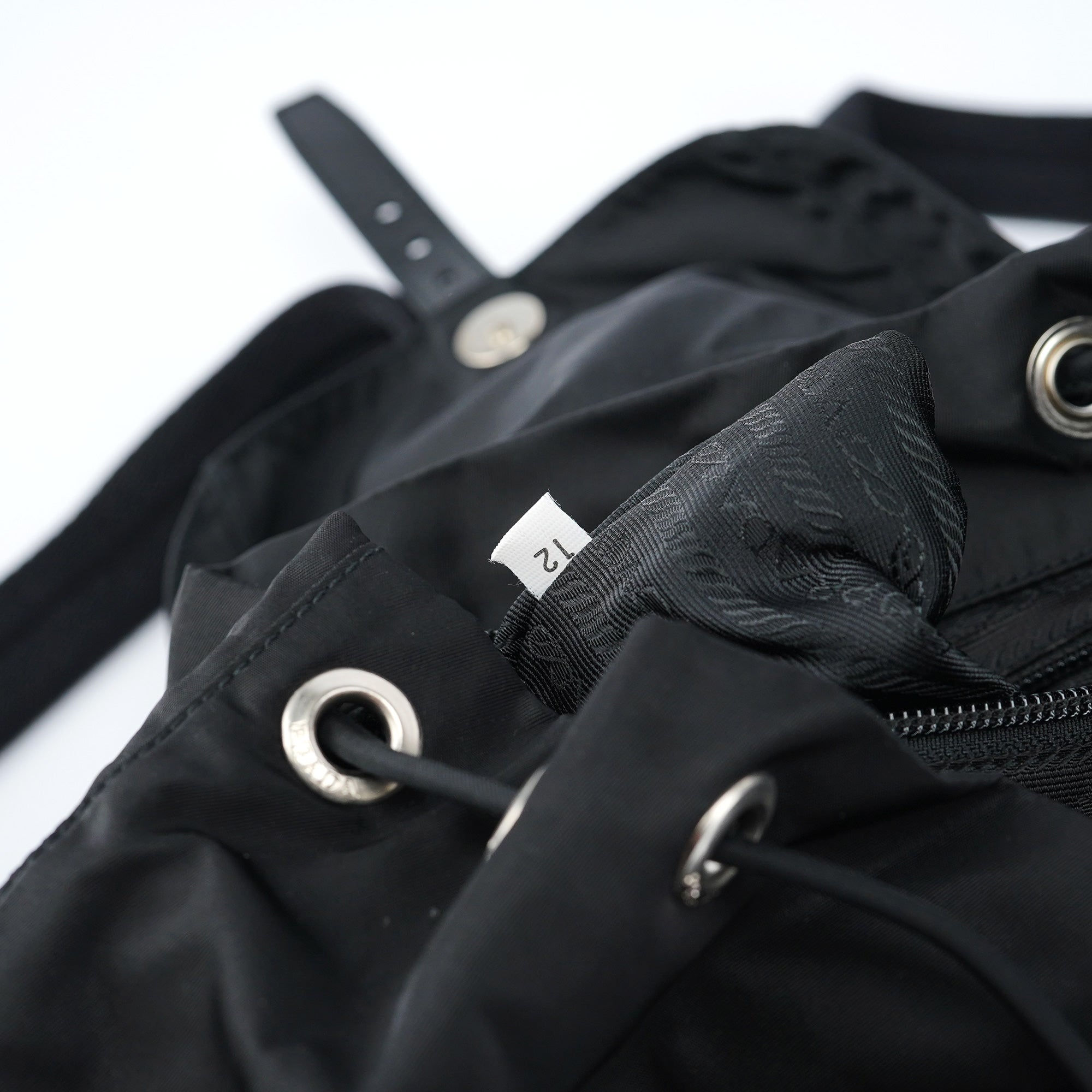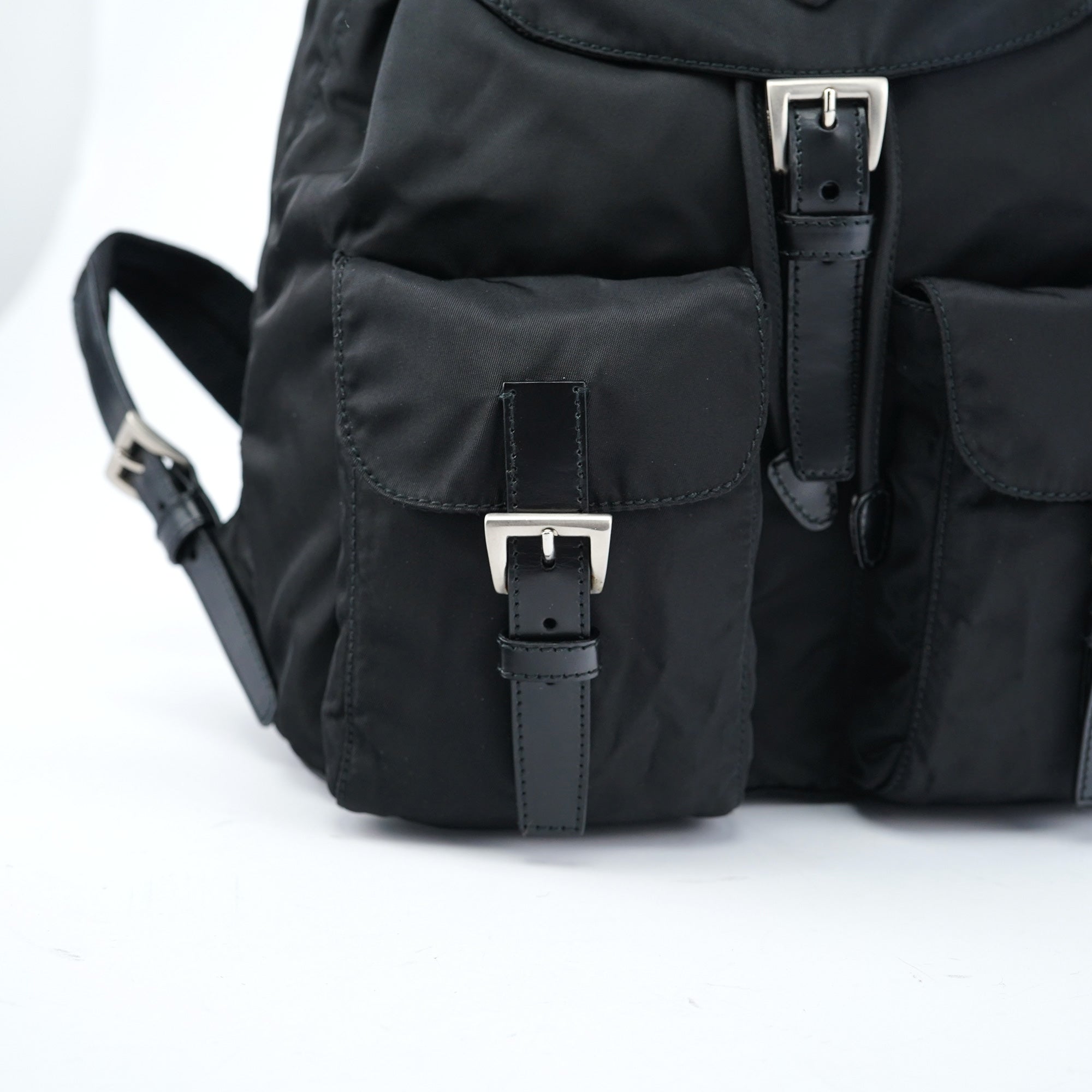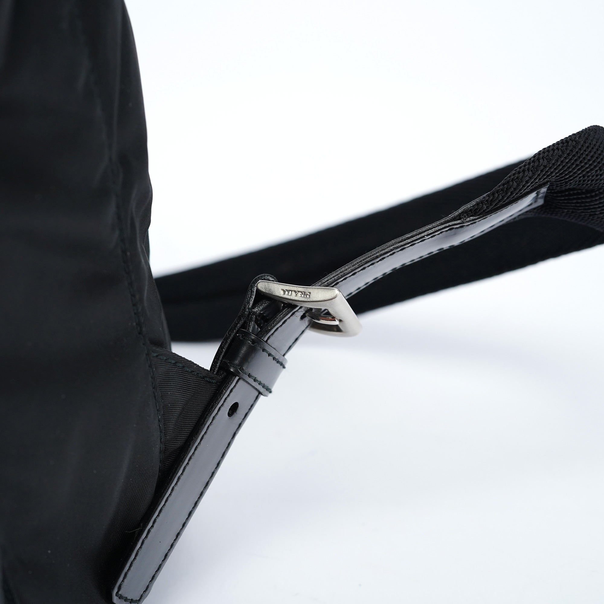 Designed in the late 1990's by Miuccia Prada, this vintage Prada Tessuto Vela backpack features lightweight black nylon with leather trim throughout. The utilitarian silhouette includes a front flap with the iconic triangular Prada logo plate, secured by a leather buckle strap. Three exterior front pockets with individual buckle closures offer additional storage, while adjustable shoulder straps provide comfortable carry. The fabric-lined interior features a drawstring closure beneath the flap.