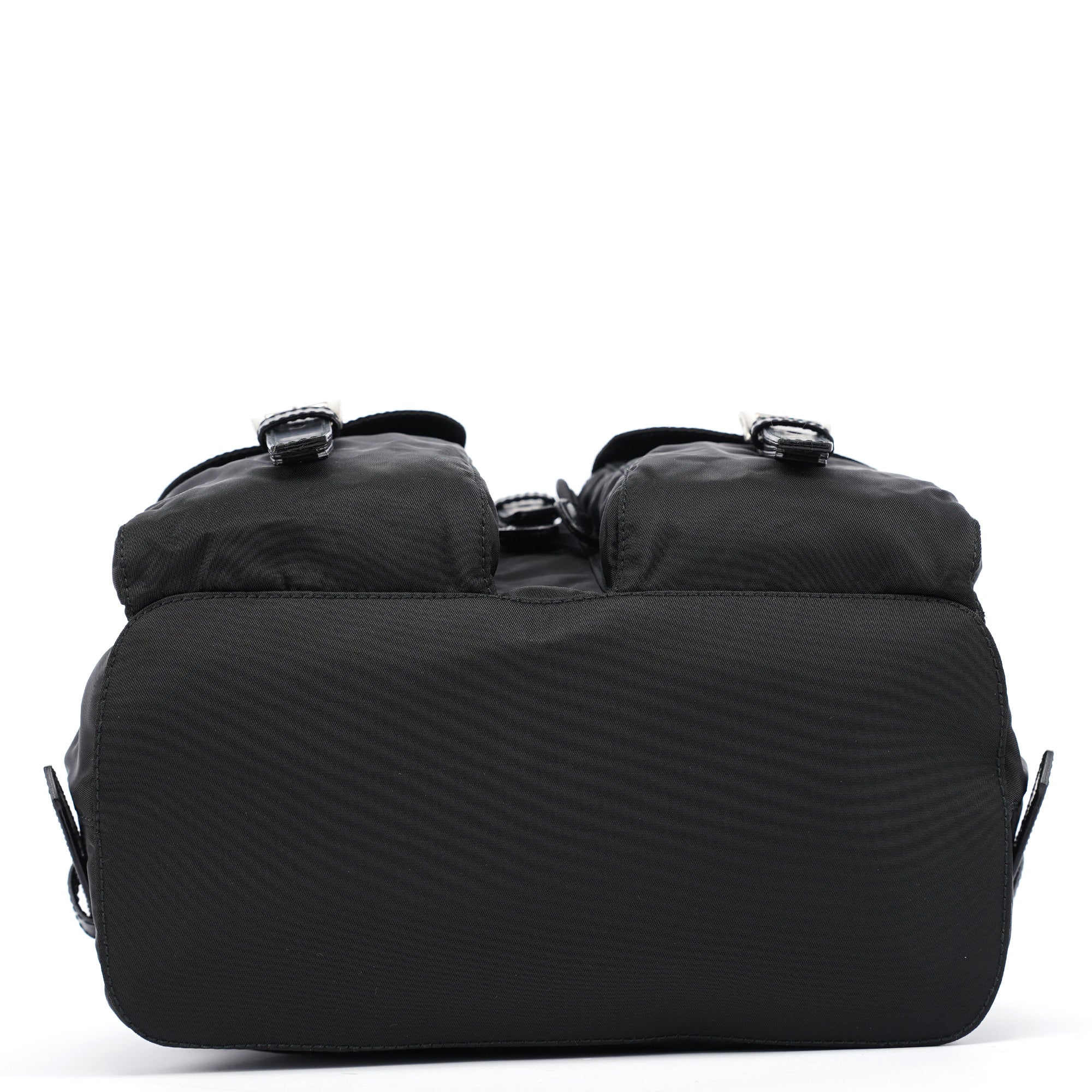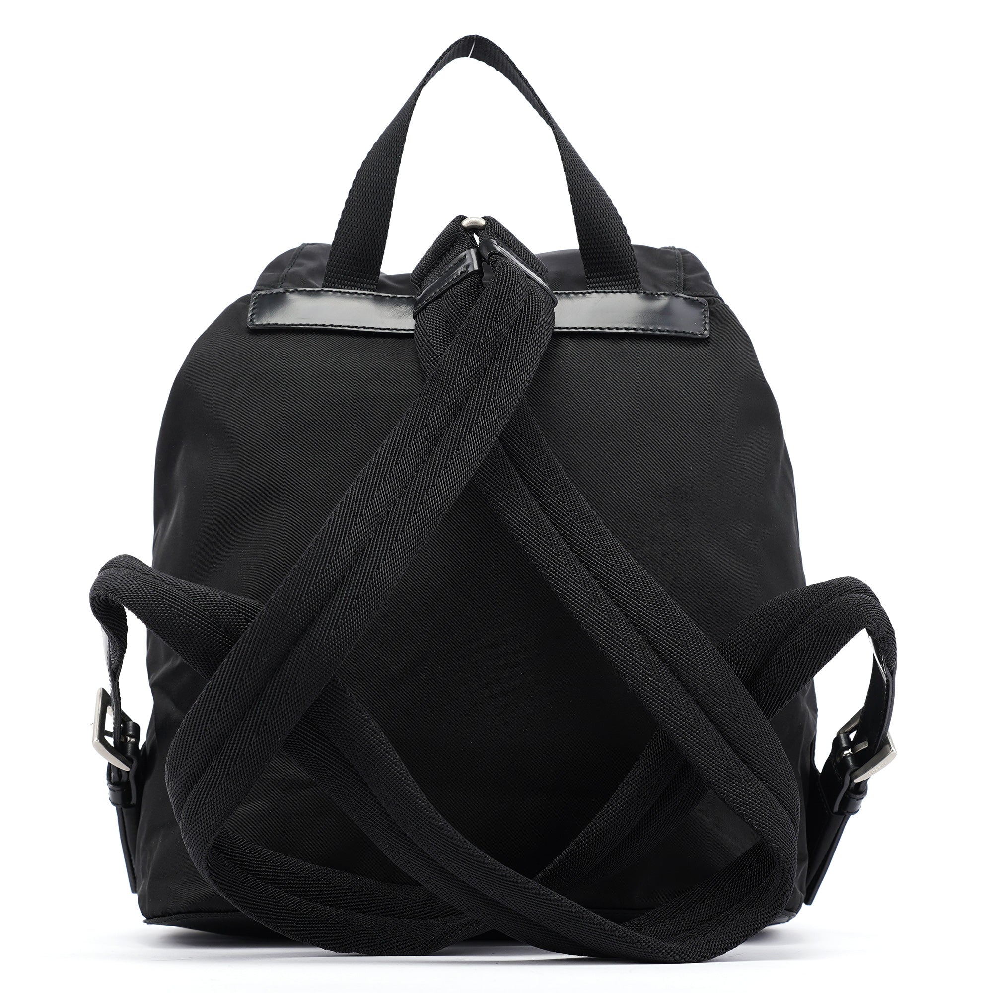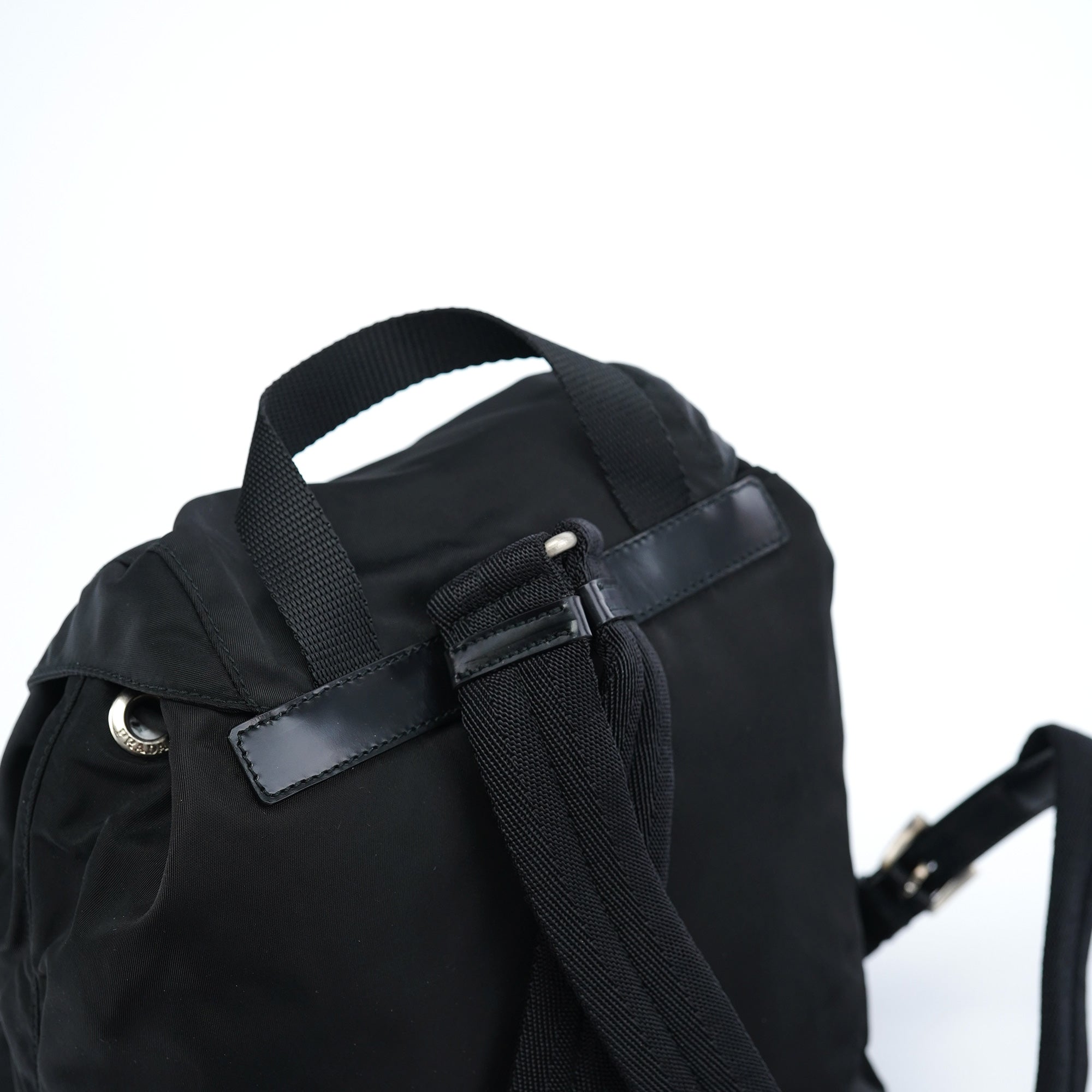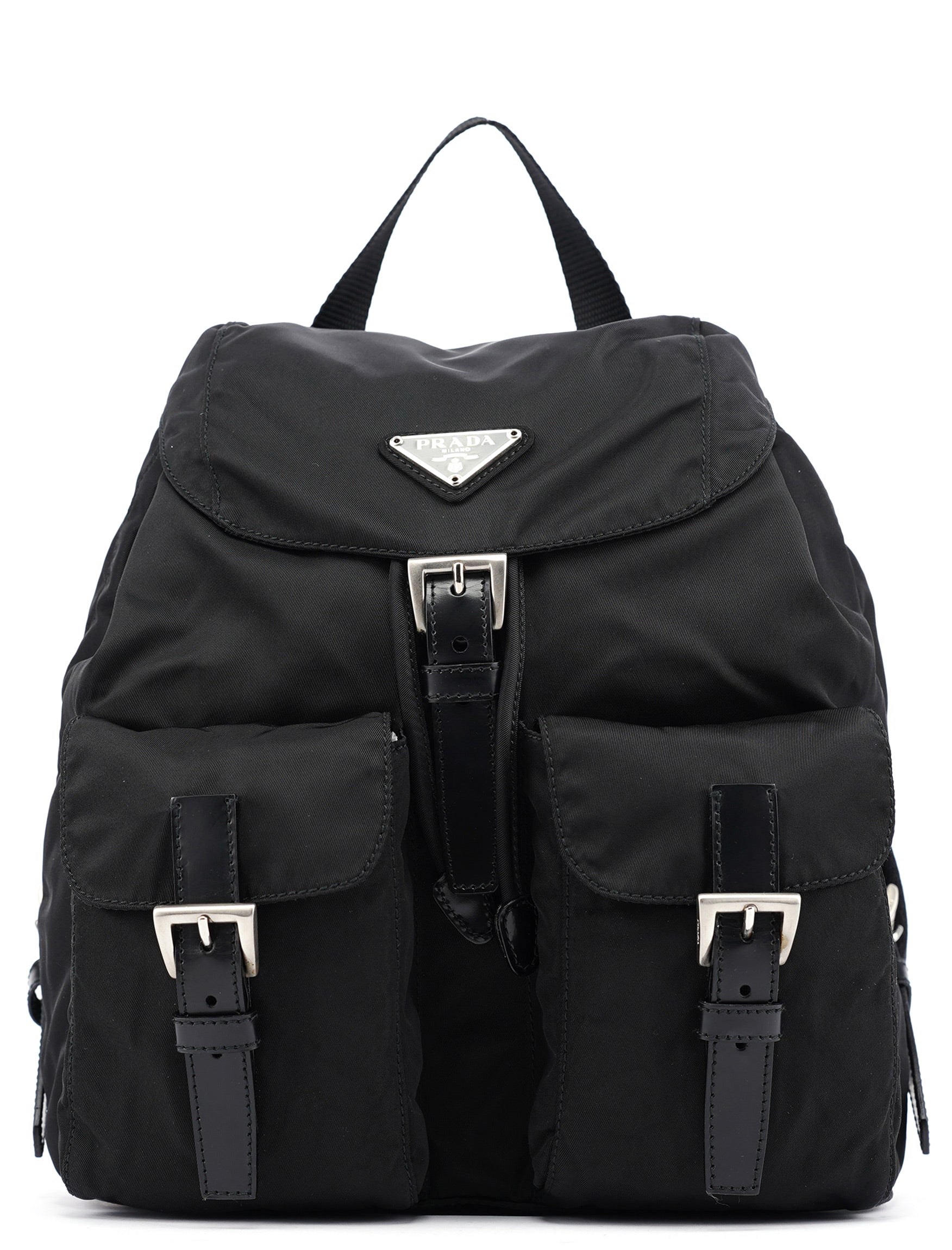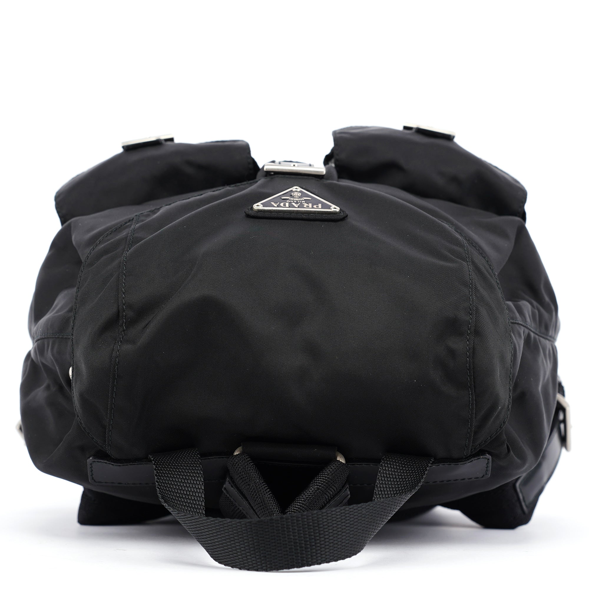 Designed in the late 1990's by Miuccia Prada, this vintage Prada Tessuto Vela backpack features lightweight black nylon with leather trim throughout. The utilitarian silhouette includes a front flap with the iconic triangular Prada logo plate, secured by a leather buckle strap. Three exterior front pockets with individual buckle closures offer additional storage, while adjustable shoulder straps provide comfortable carry. The fabric-lined interior features a drawstring closure beneath the flap.
