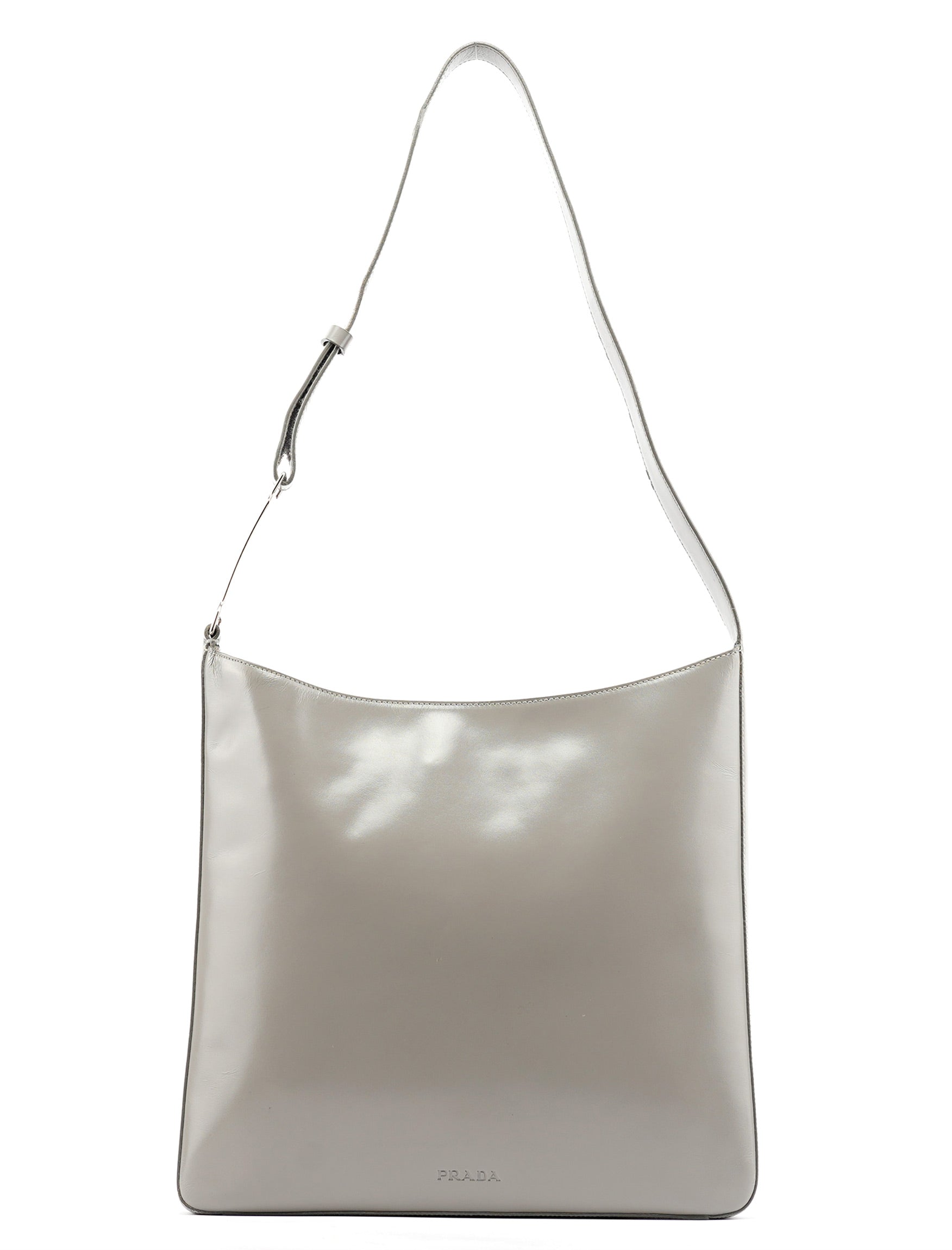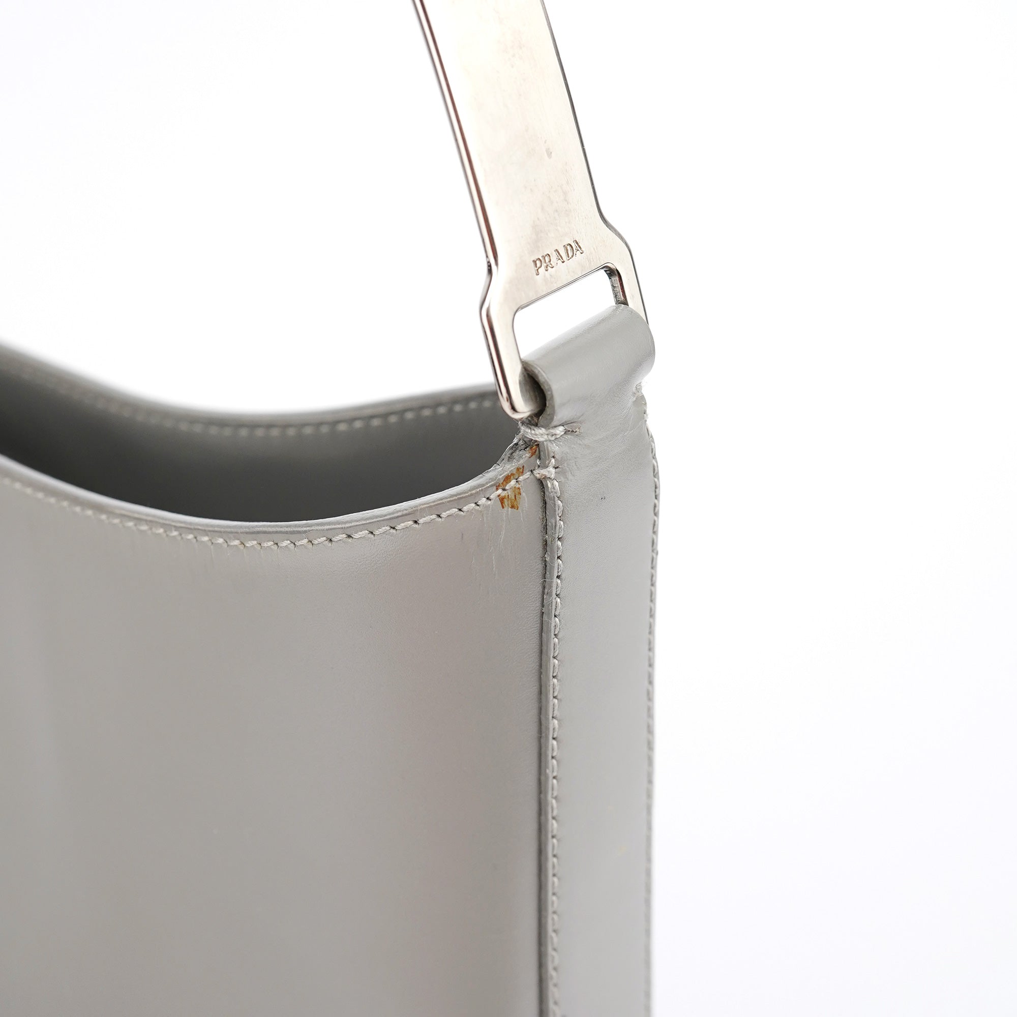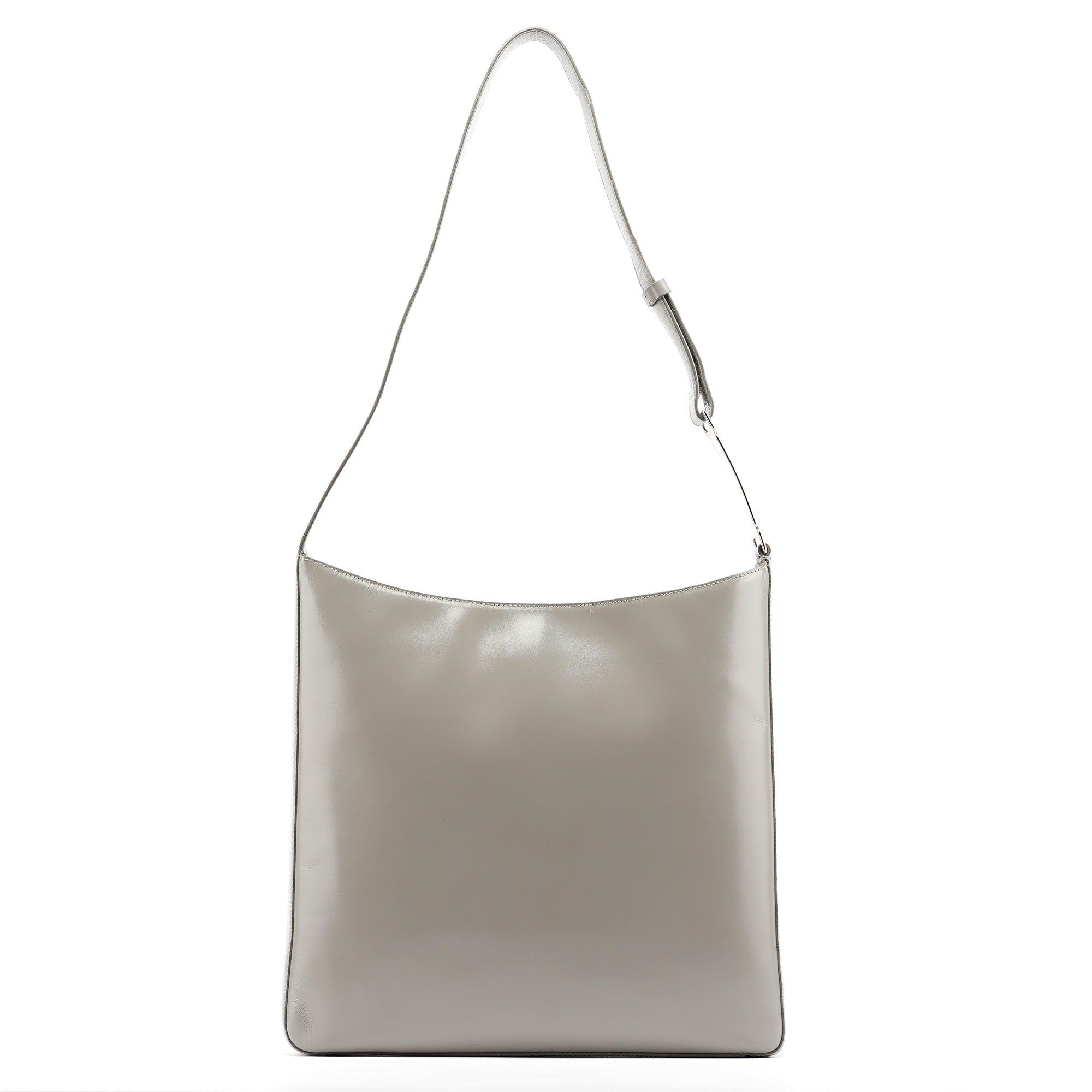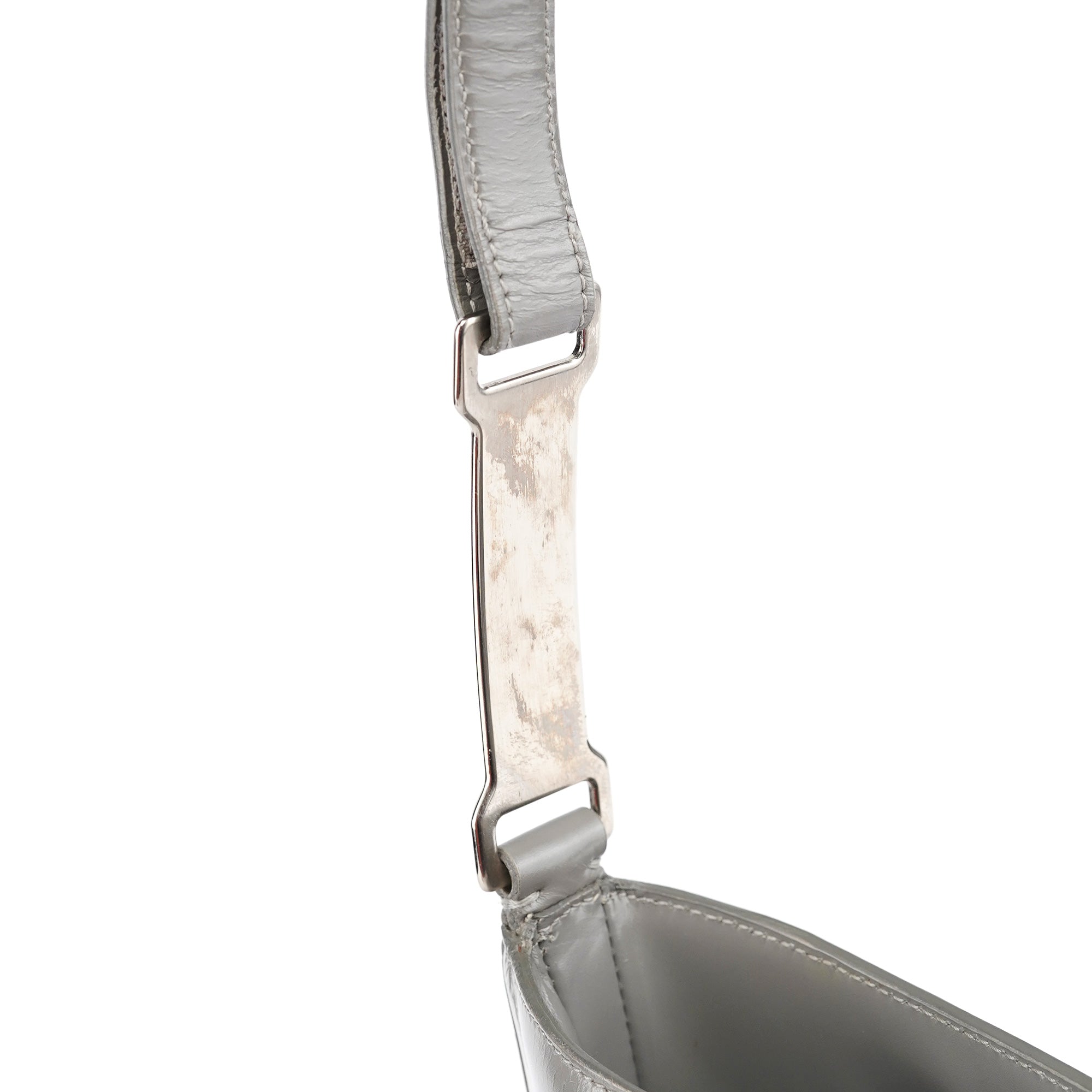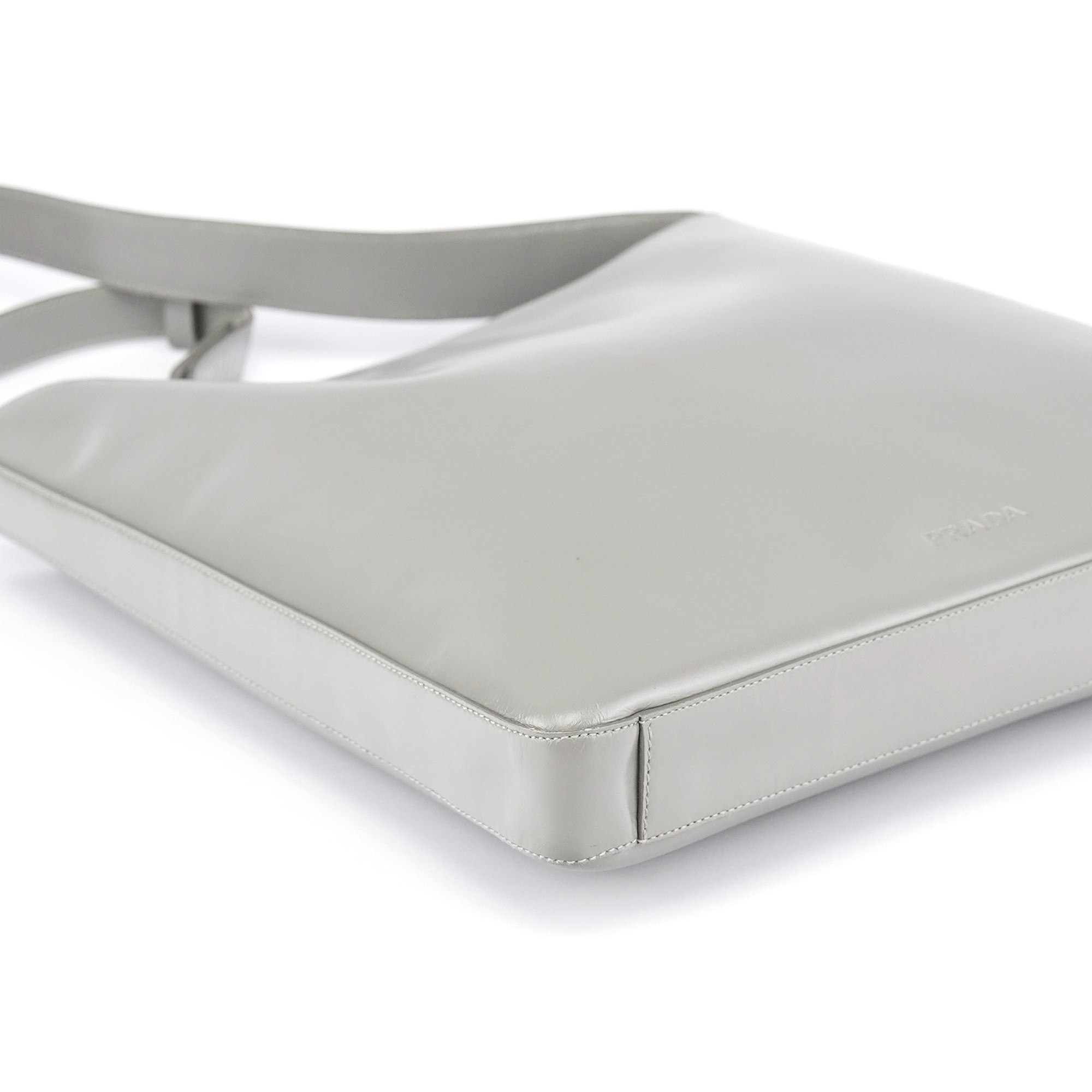 Designed in 1999 by Miuccia Prada, this vintage Prada shoulder bag features minimalist design in grey calfskin leather. The streamlined messenger-style silhouette showcases silver-tone hardware and an adjustable shoulder strap for crossbody wear. The bag closes with a secure zip and the interior is lined in Prada's signature logo jacquard fabric.