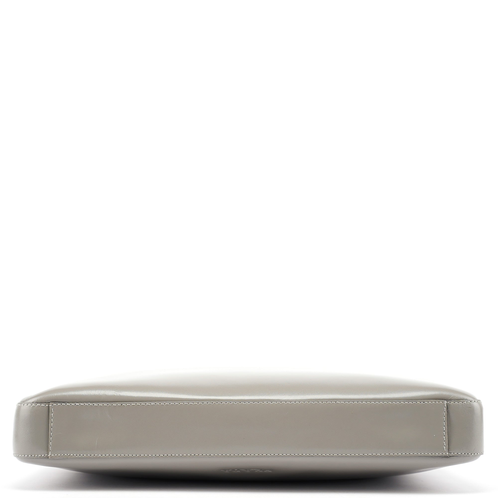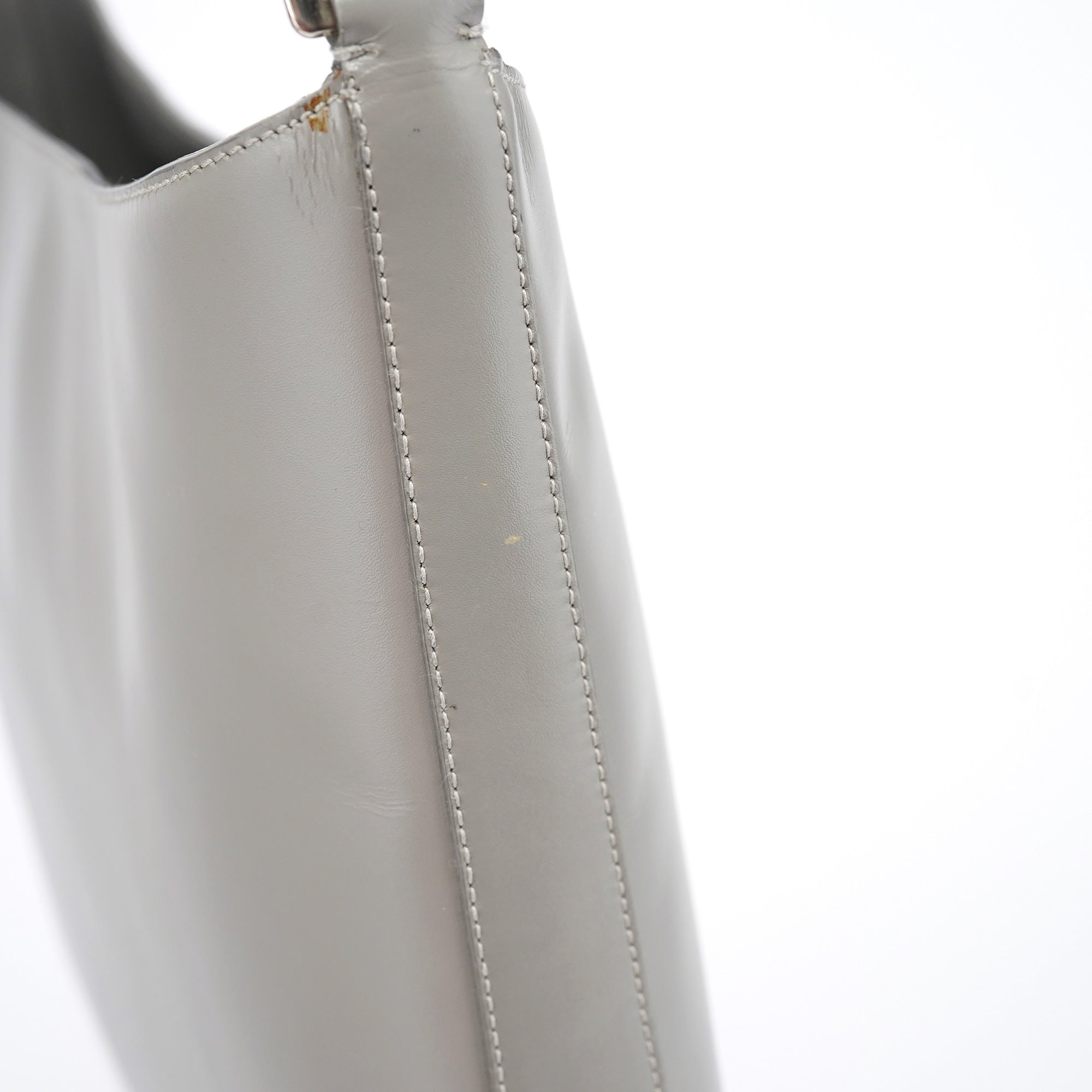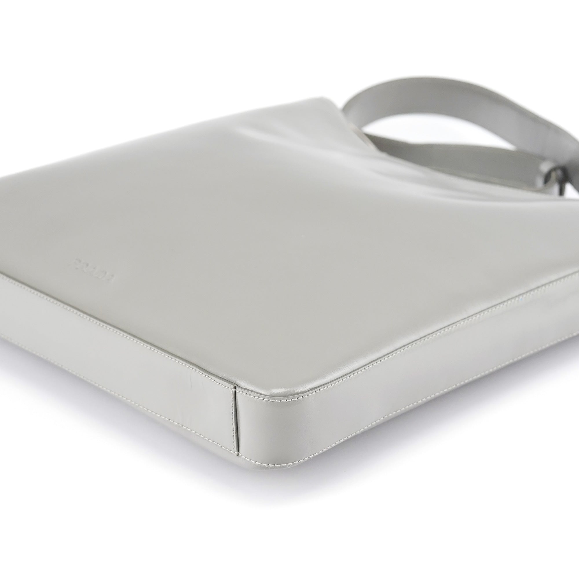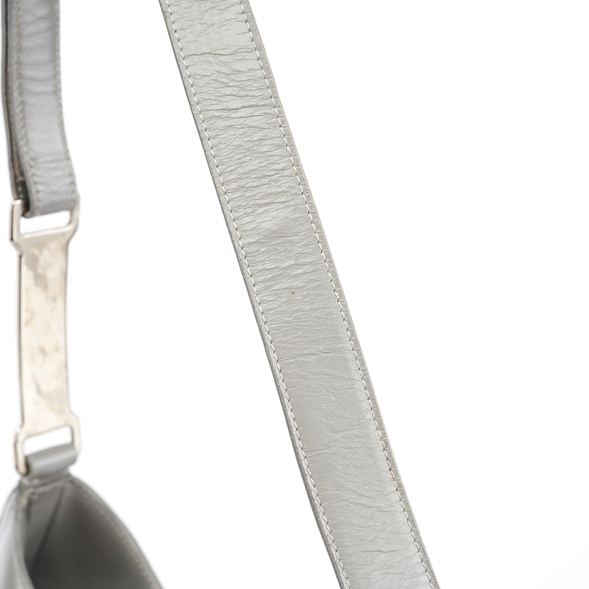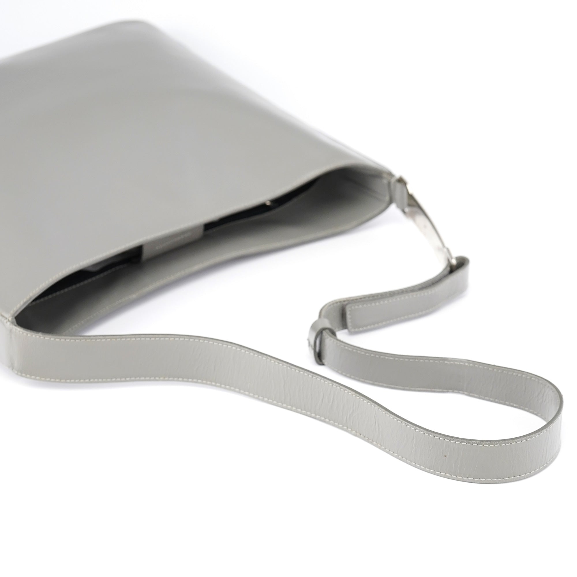 Designed in 1999 by Miuccia Prada, this vintage Prada shoulder bag features minimalist design in grey calfskin leather. The streamlined messenger-style silhouette showcases silver-tone hardware and an adjustable shoulder strap for crossbody wear. The bag closes with a secure zip and the interior is lined in Prada's signature logo jacquard fabric.
