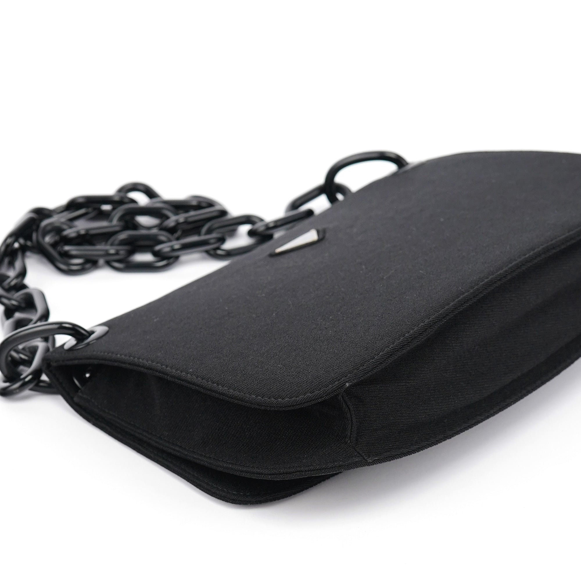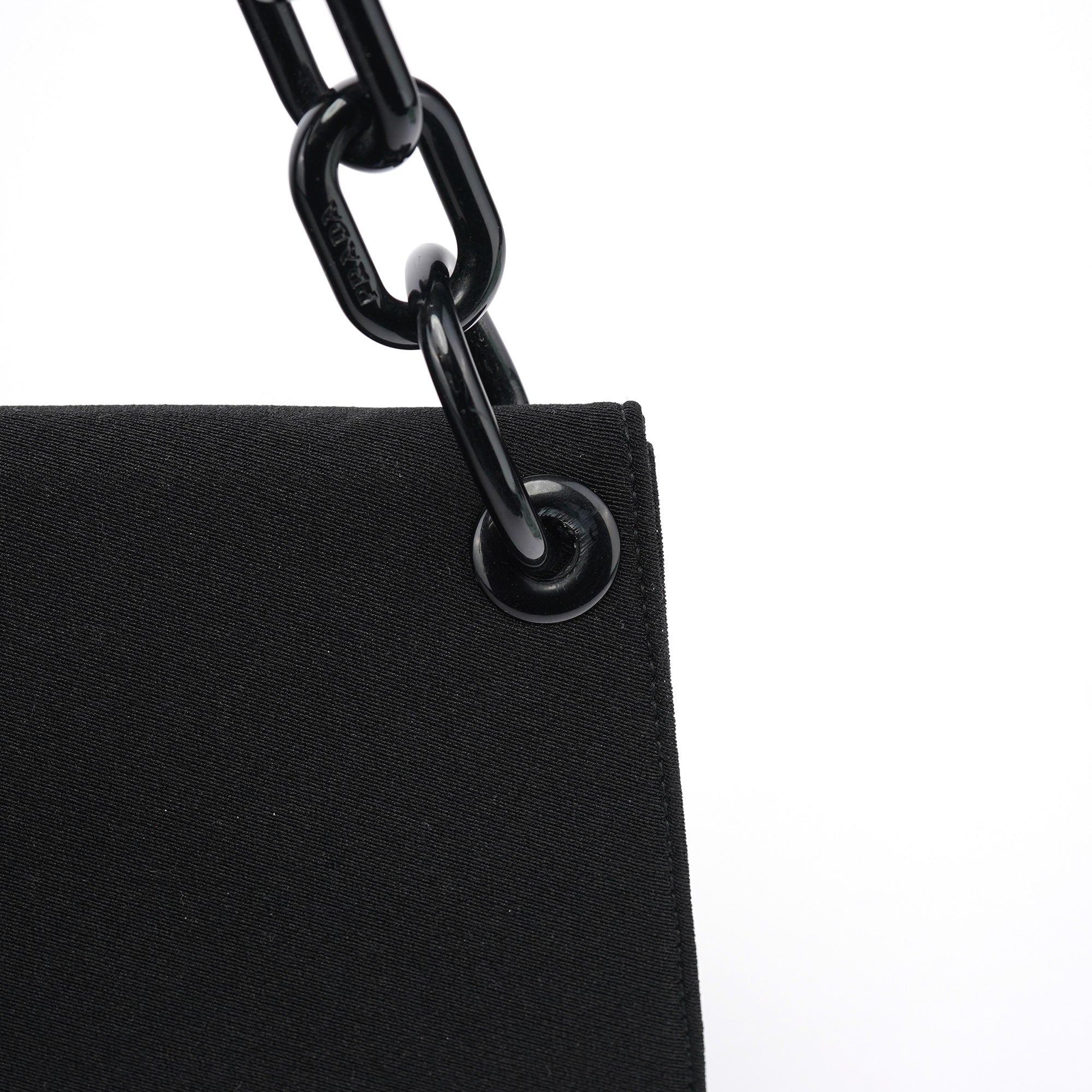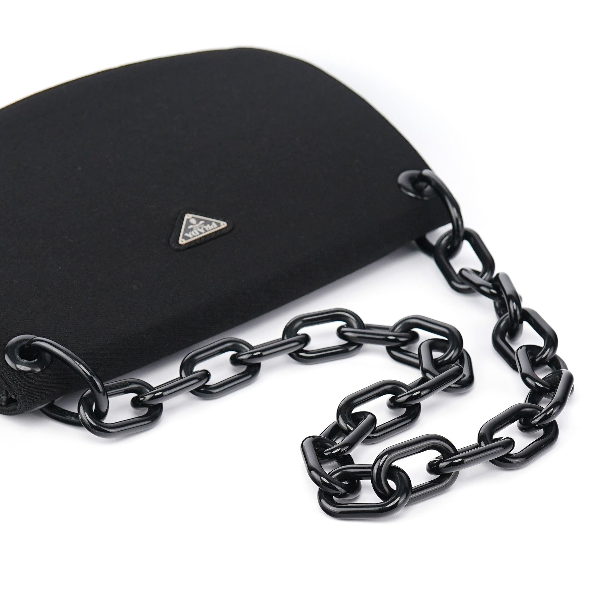 Designed in 1996 by Miuccia Prada, this vintage Prada Tessuto Swing shoulder bag features the brand's signature black nylon with the iconic triangular logo plate. This rare discontinued model showcases a distinctive plastic chain strap that adds a modern architectural element while remaining lightweight and practical. The compact rectangular silhouette includes an interior zip pocket for organization.