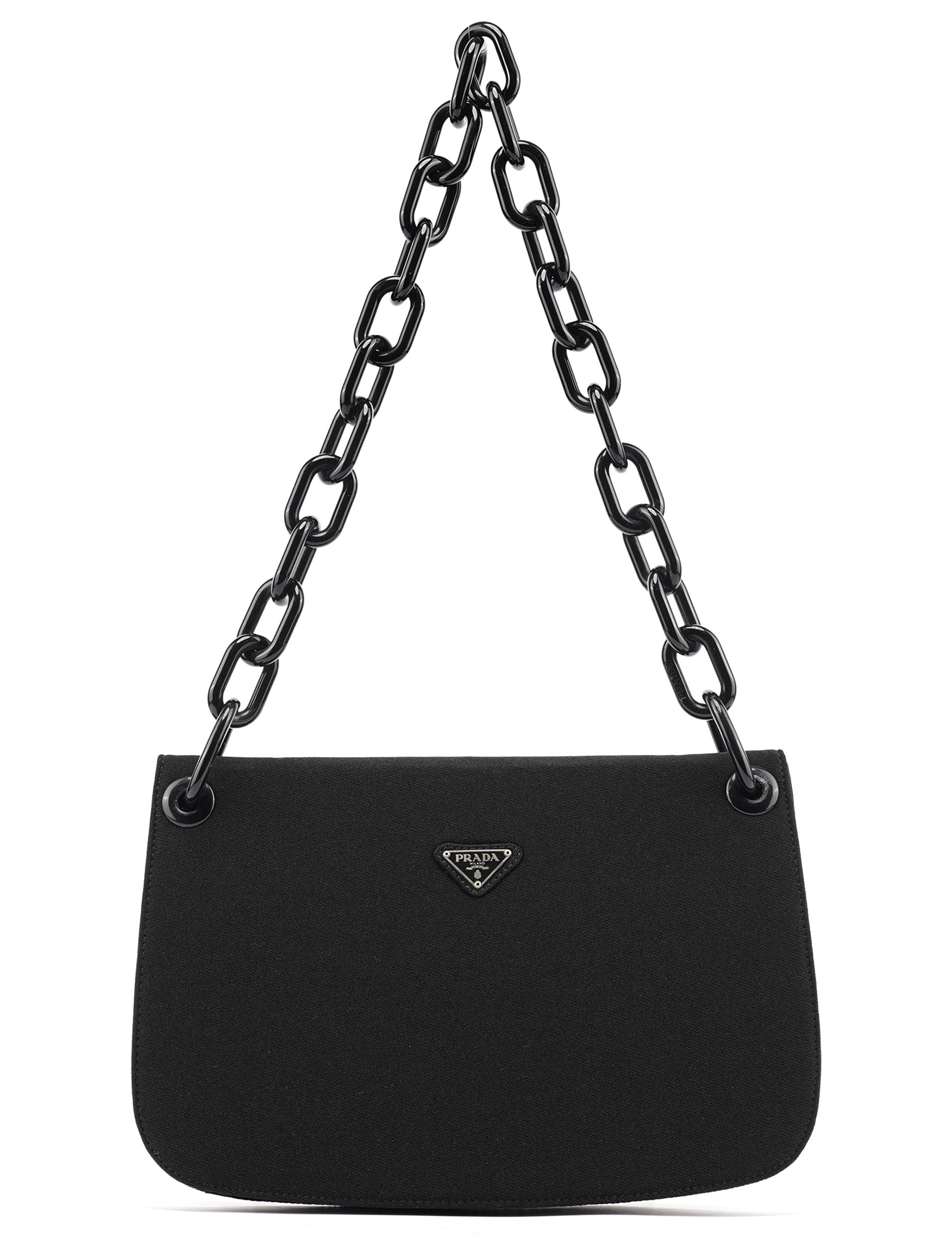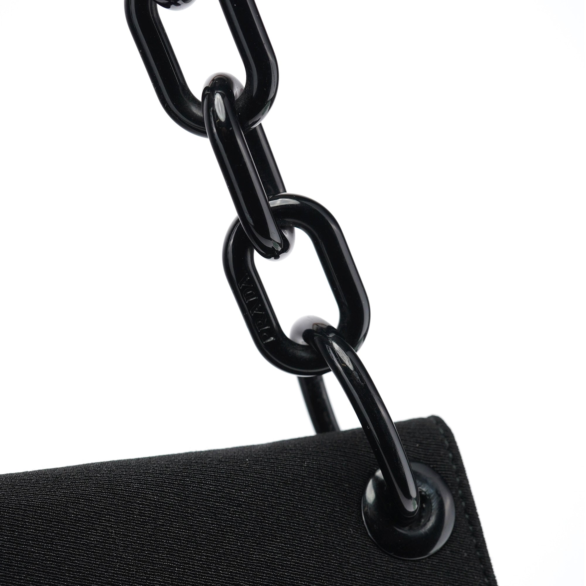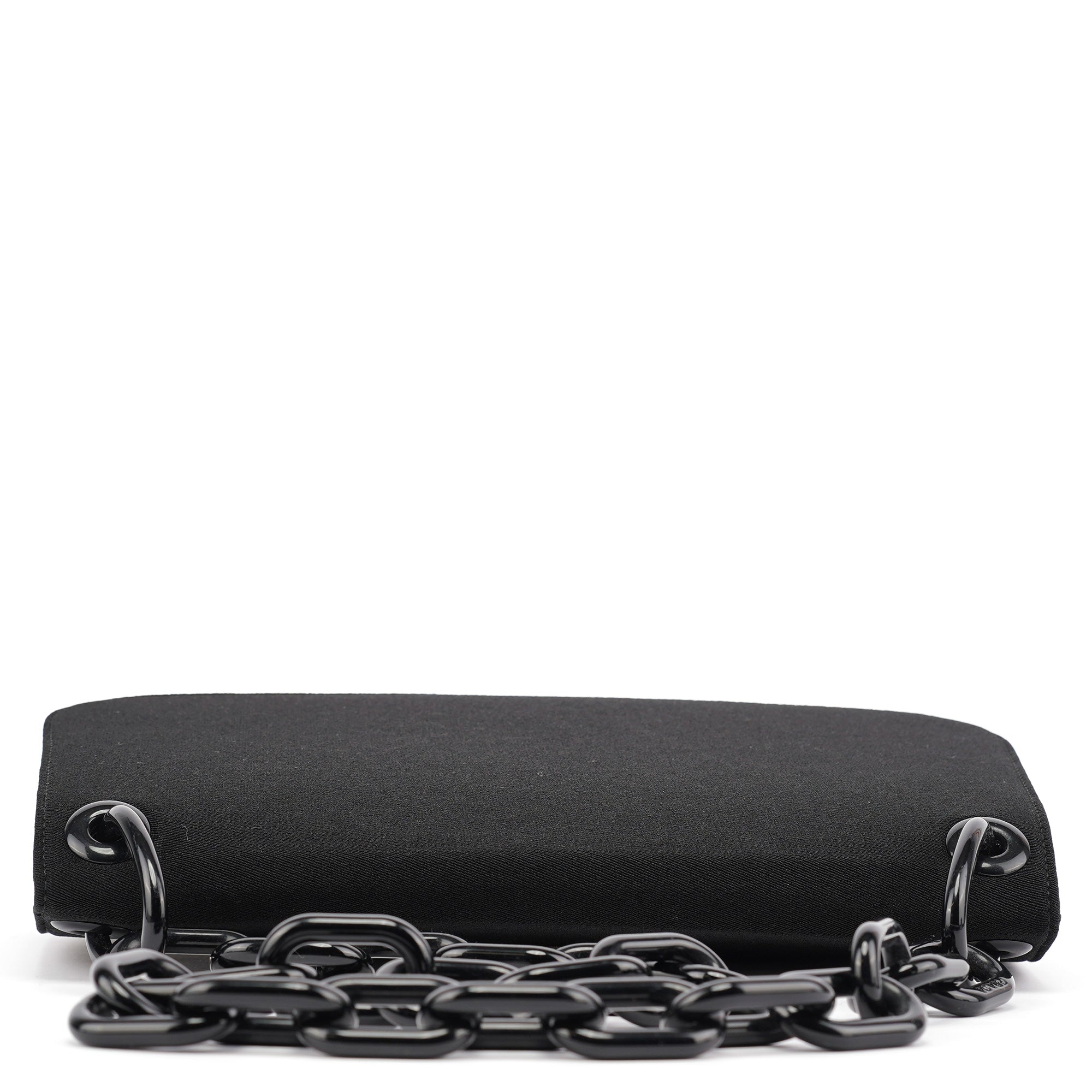 Designed in 1996 by Miuccia Prada, this vintage Prada Tessuto Swing shoulder bag features the brand's signature black nylon with the iconic triangular logo plate. This rare discontinued model showcases a distinctive plastic chain strap that adds a modern architectural element while remaining lightweight and practical. The compact rectangular silhouette includes an interior zip pocket for organization.