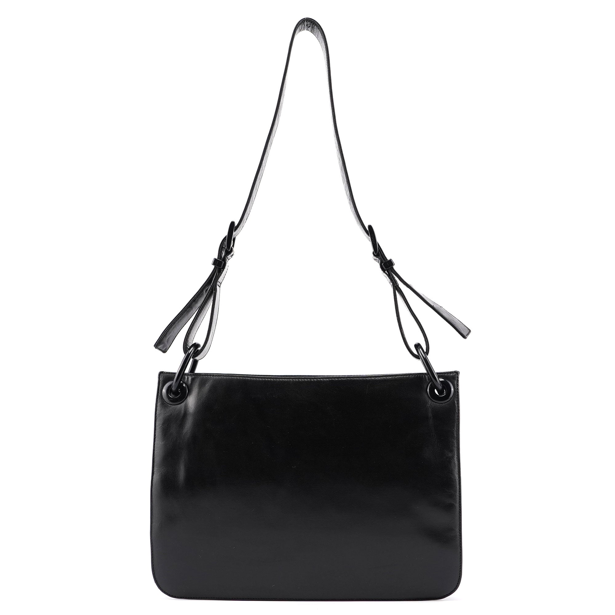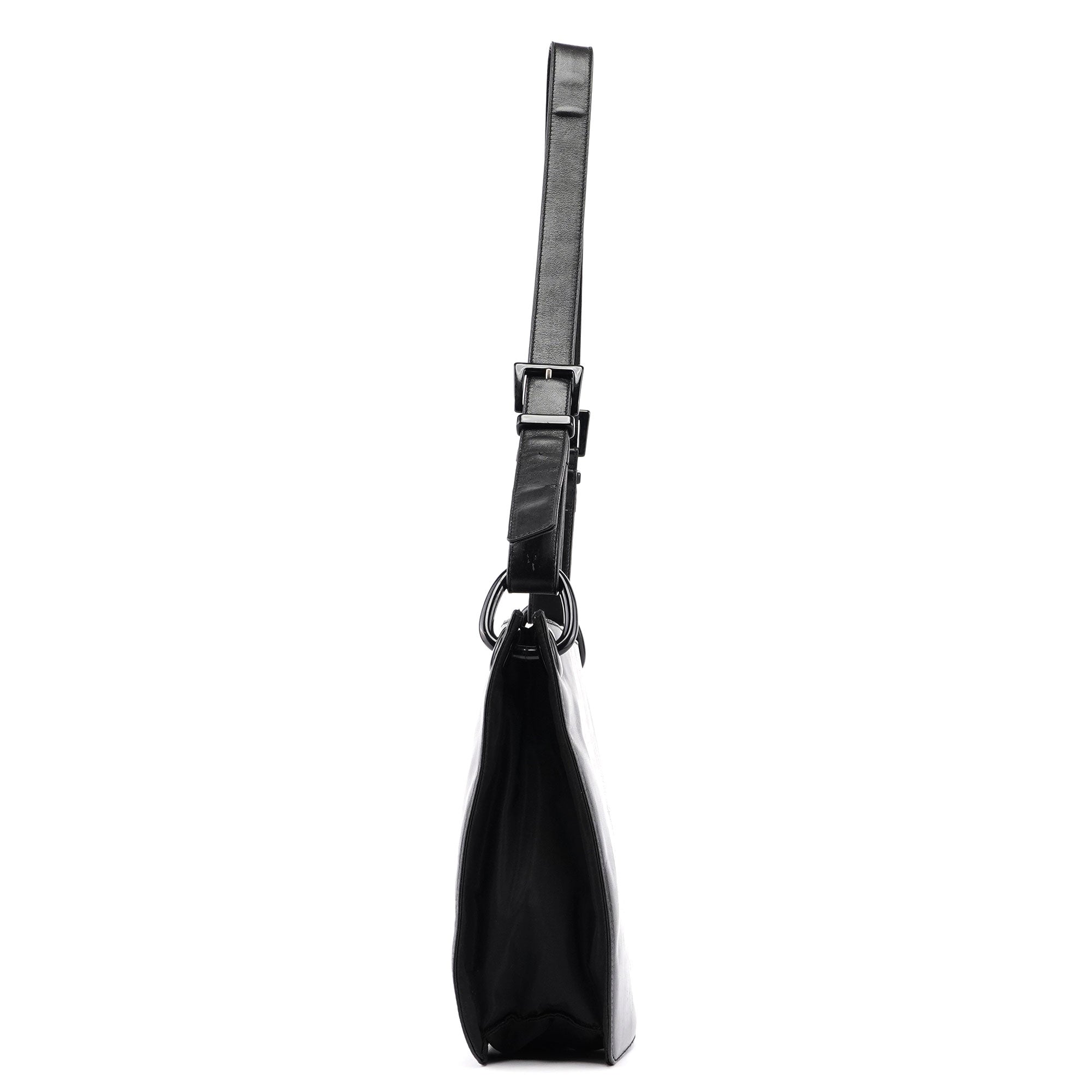 Introducing the Prada Vitello Tessuto shoulder bag, a design by Miuccia Prada from the late 1990s. Handcrafted from black calfskin leather with black tessuto nylon on the sides and gloss black plastic hardware, it features a satin-lined interior with a zipper pocket for organization. Adorning the front is an embossed Prada logo, adding a touch of sophistication.