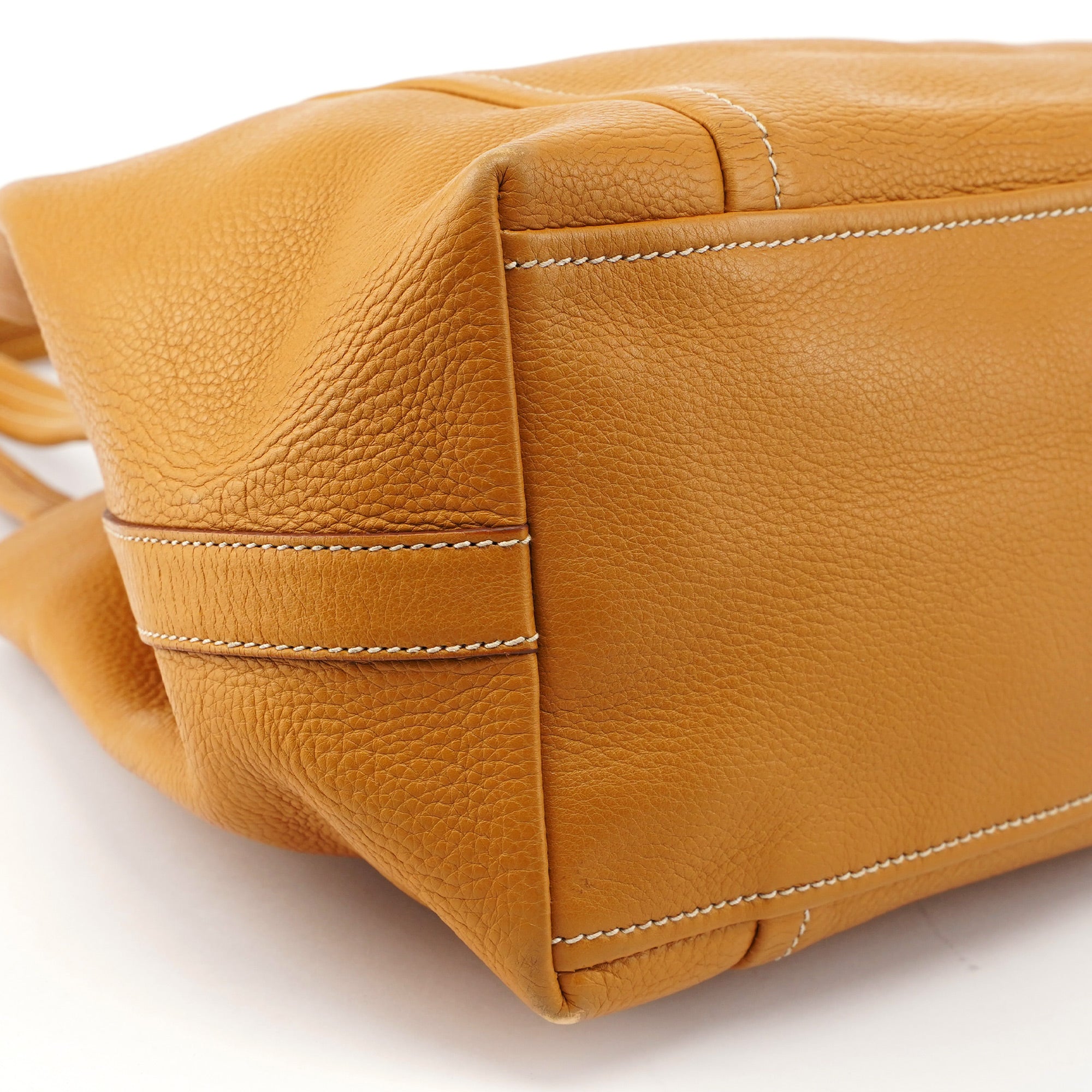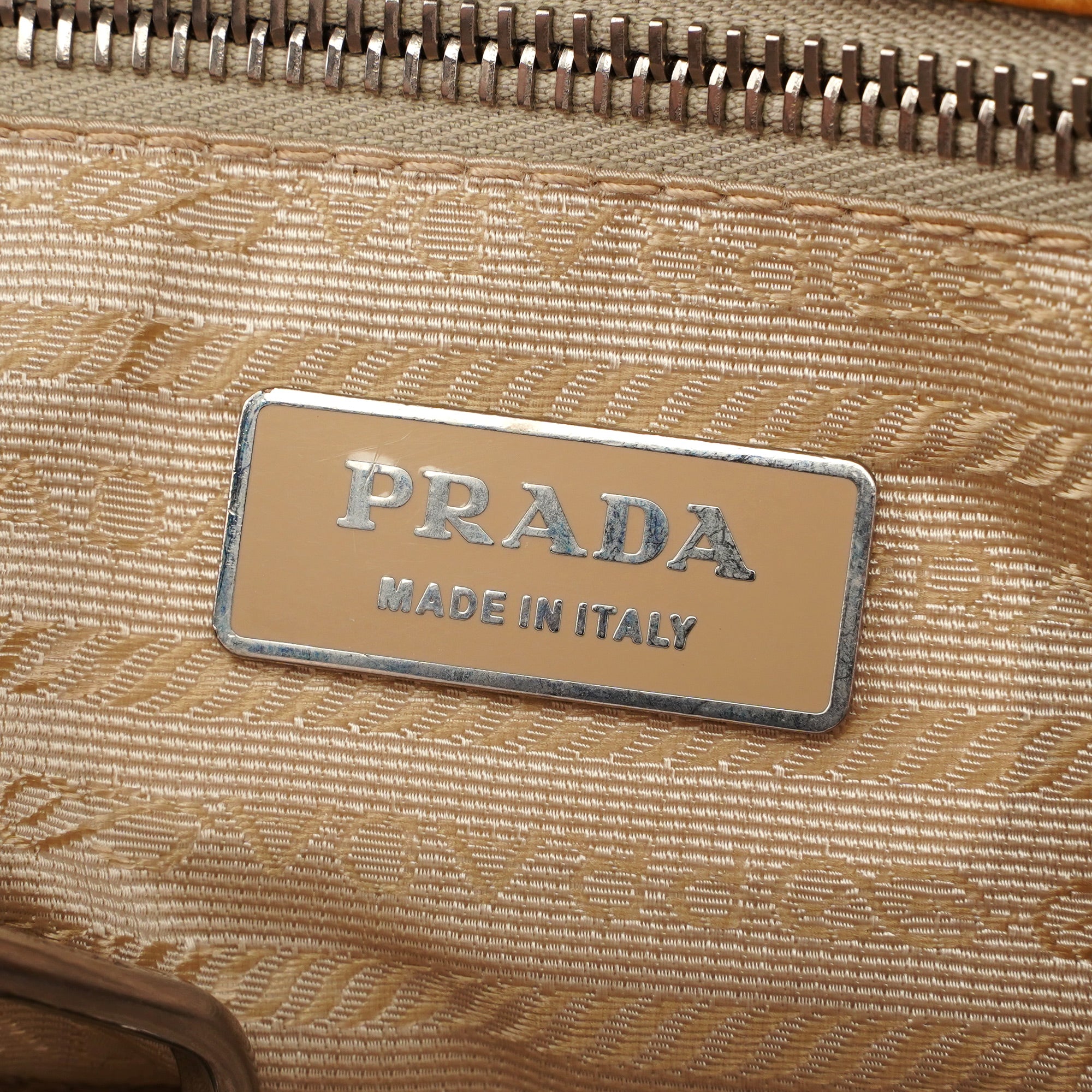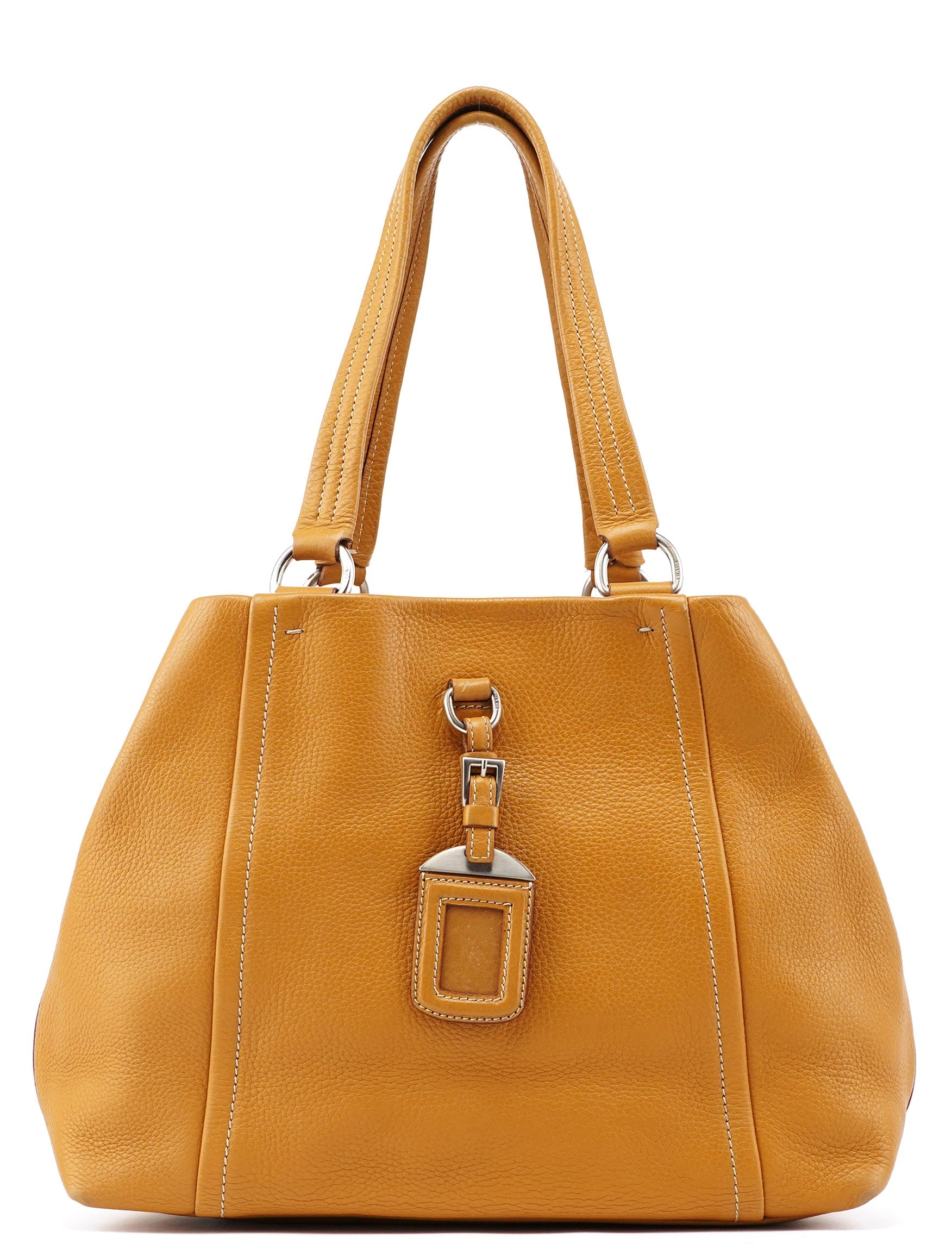 Designed by Miuccia Prada in the late 1990s, this Prada tote bag is handcrafted from beige tumbled leather and features silver-tone hardware engraved with the Prada logo. A tag is attached at the front, and the interior is lined in satin with an interior zipper pocket, showcasing timeless elegance. The Prada logo is subtly embossed on the backside.