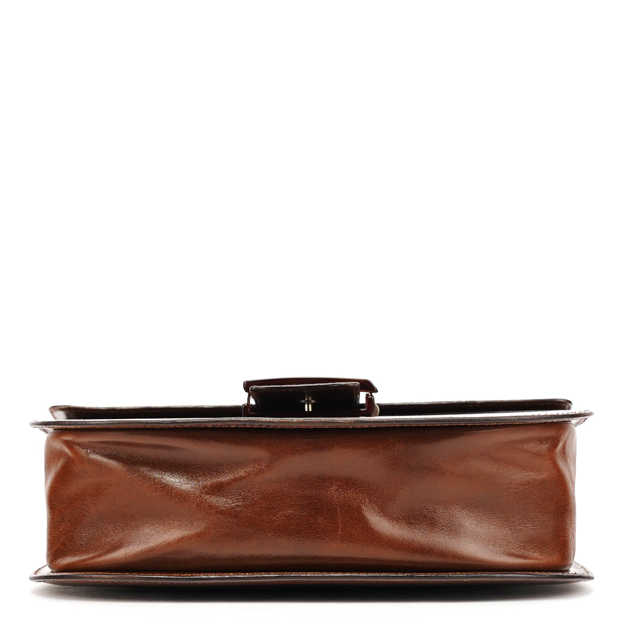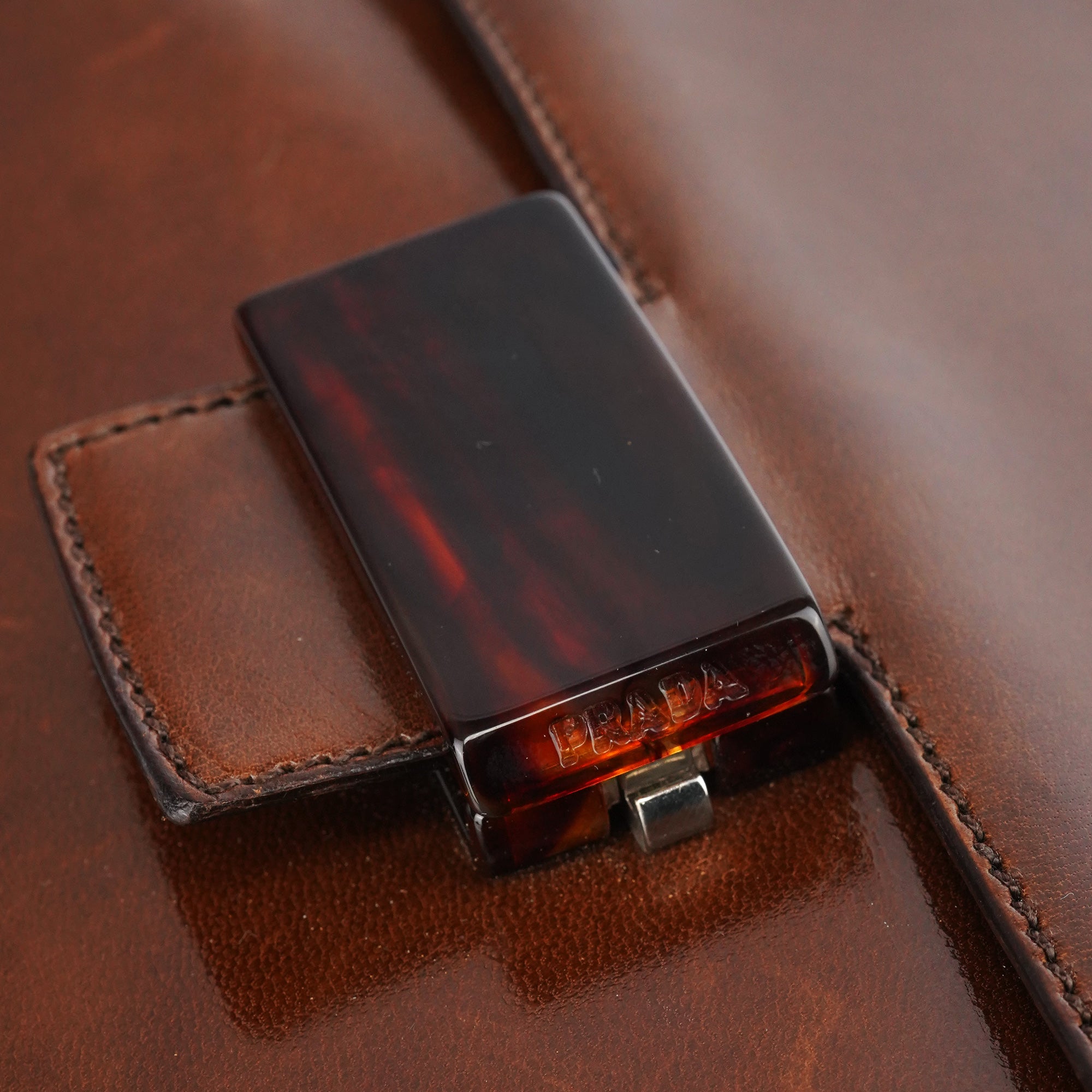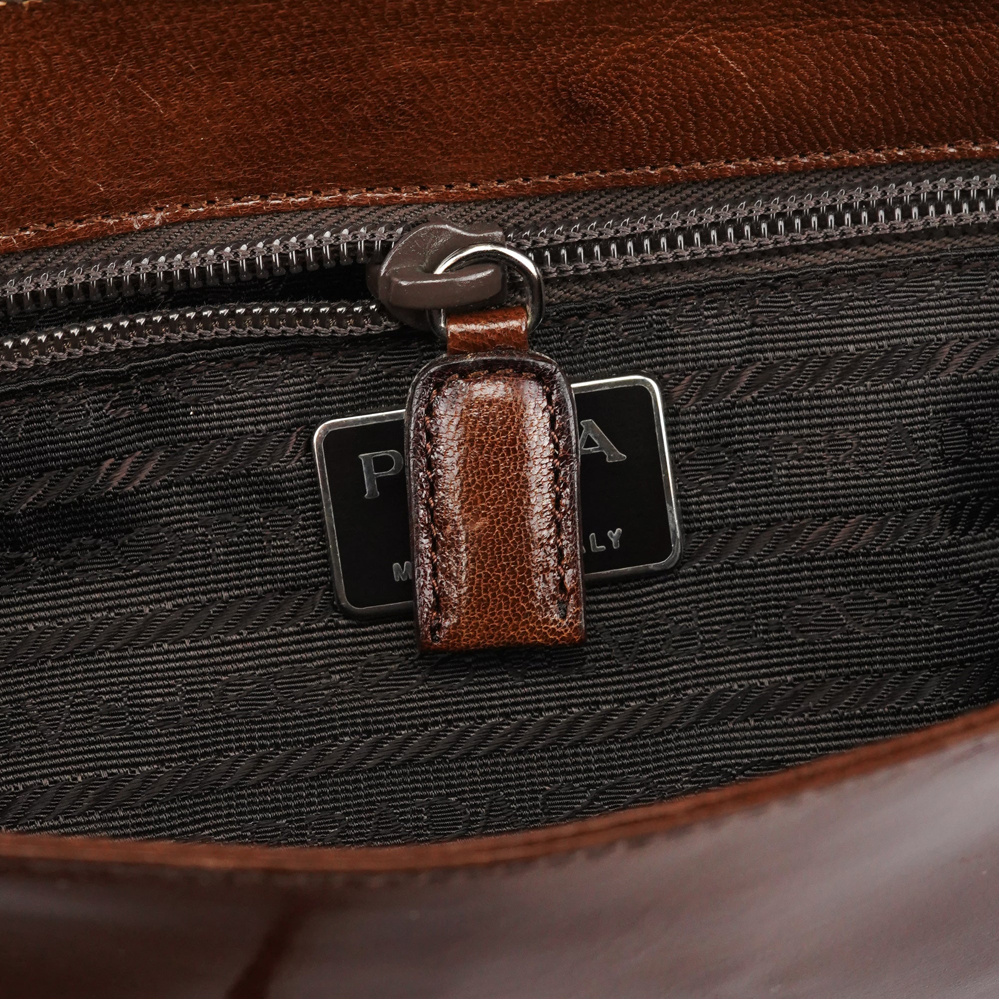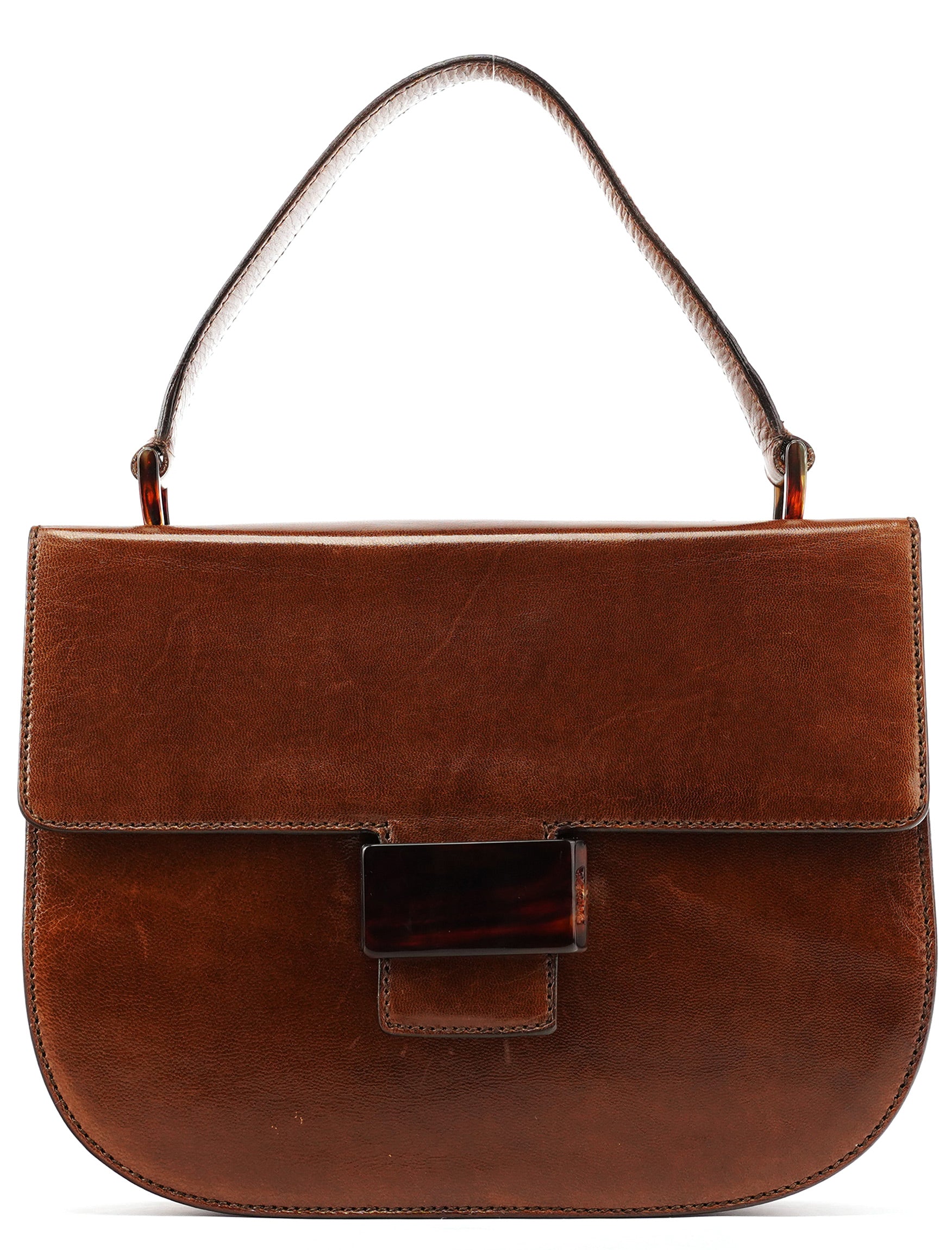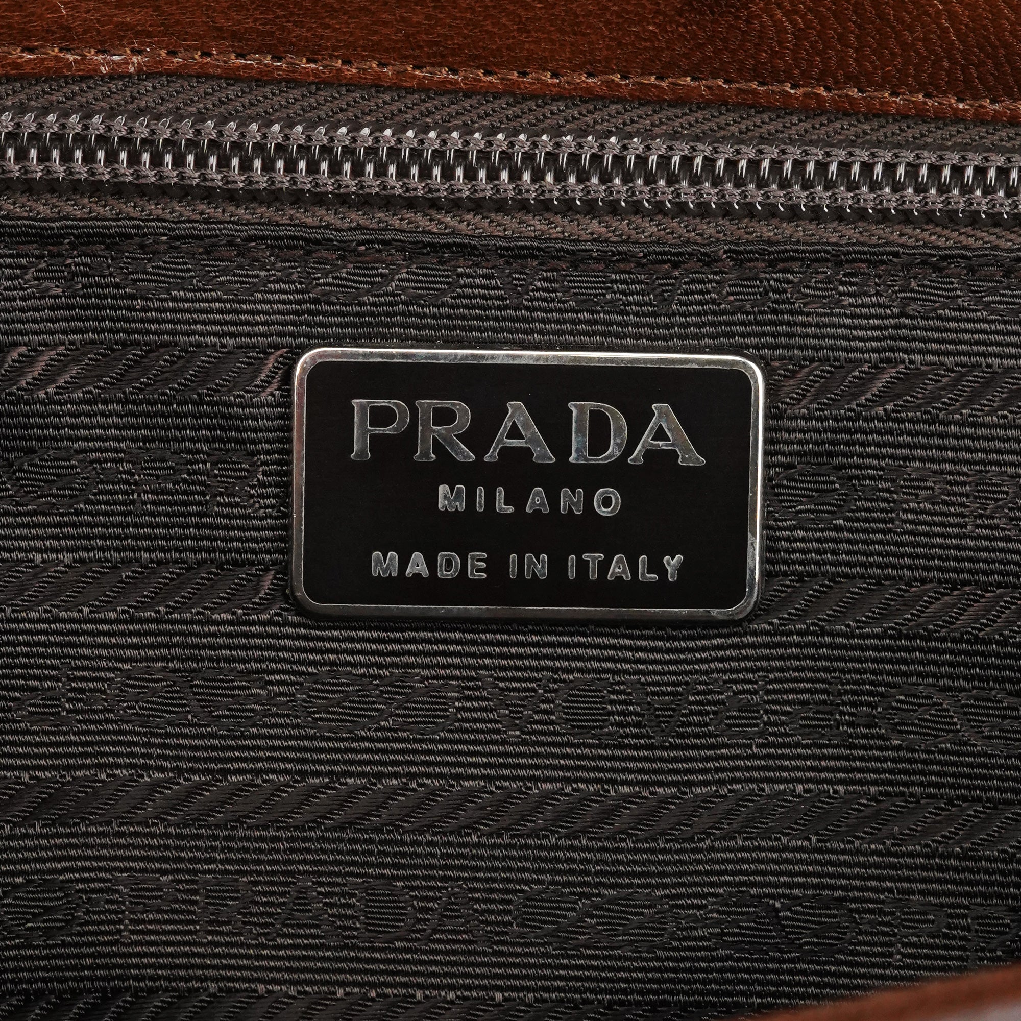 Designed in the mid 1990s by Miuccia Prada, this Prada Madras Sewing buckle bag is crafted in rich brown calfskin with a softly structured silhouette. The design features a single top handle, a leather-trimmed flap with signature resin buckle closure, and a zip-top interior lined in logo jacquard fabric, finished with subtle Prada Milano hardware detailing.