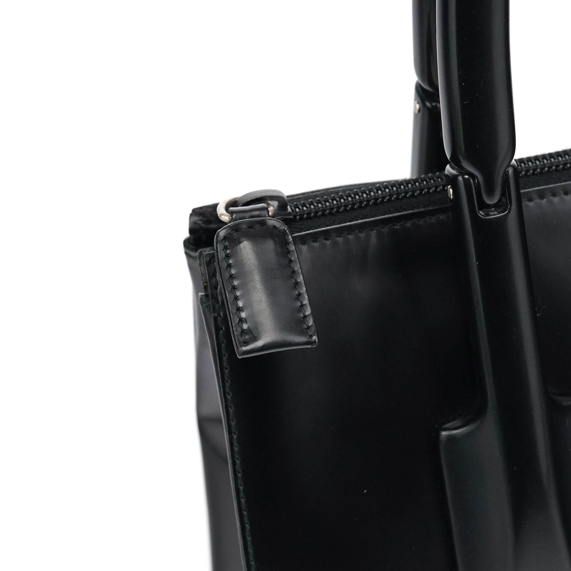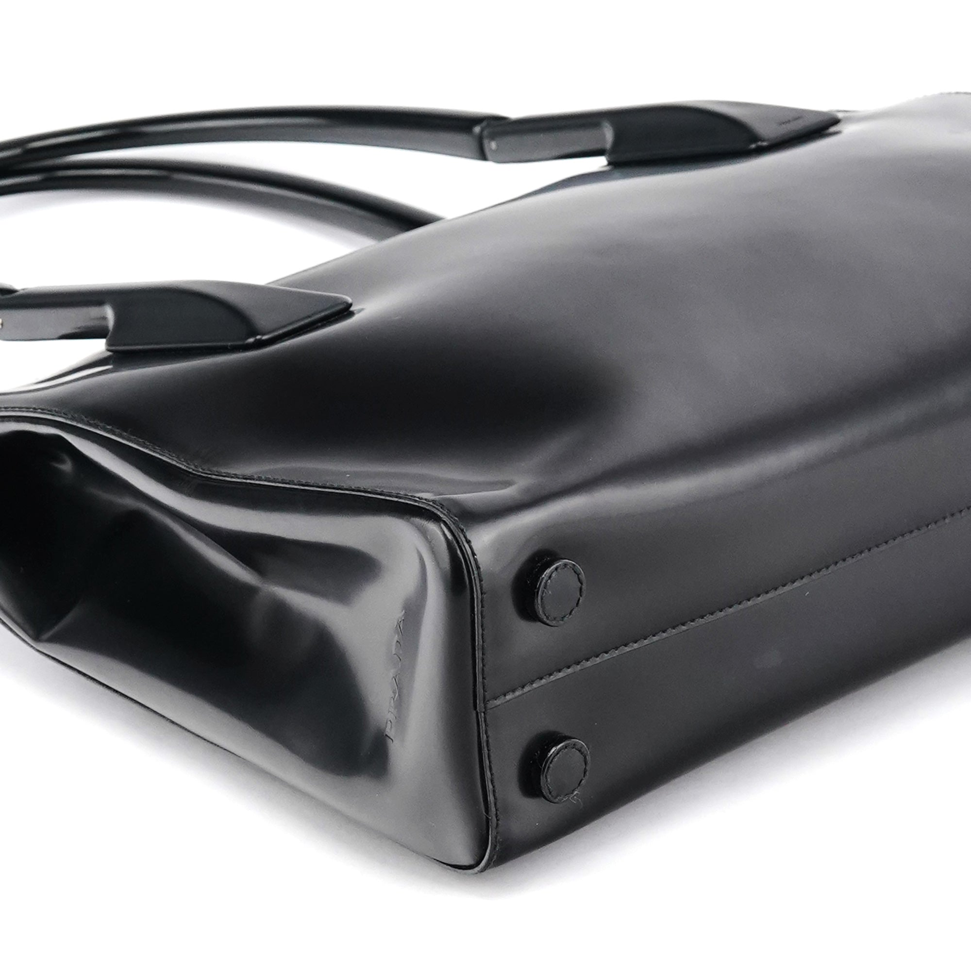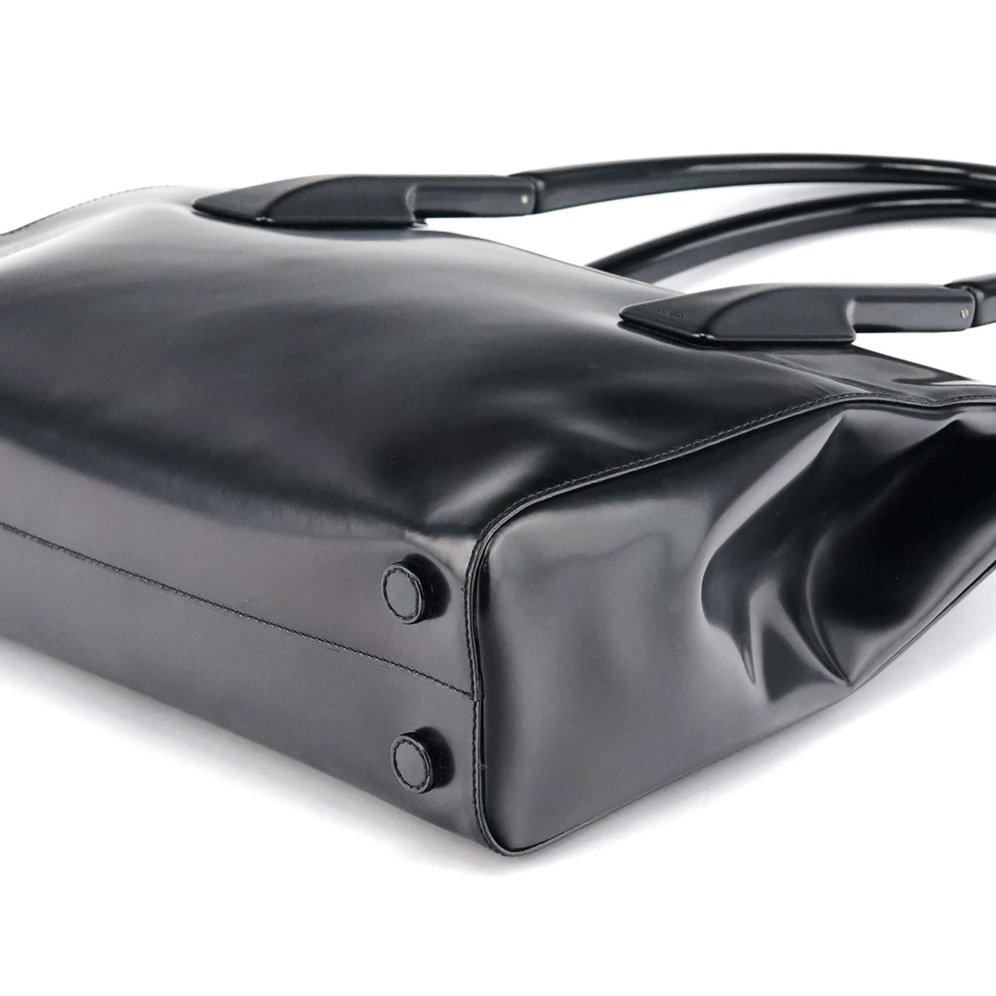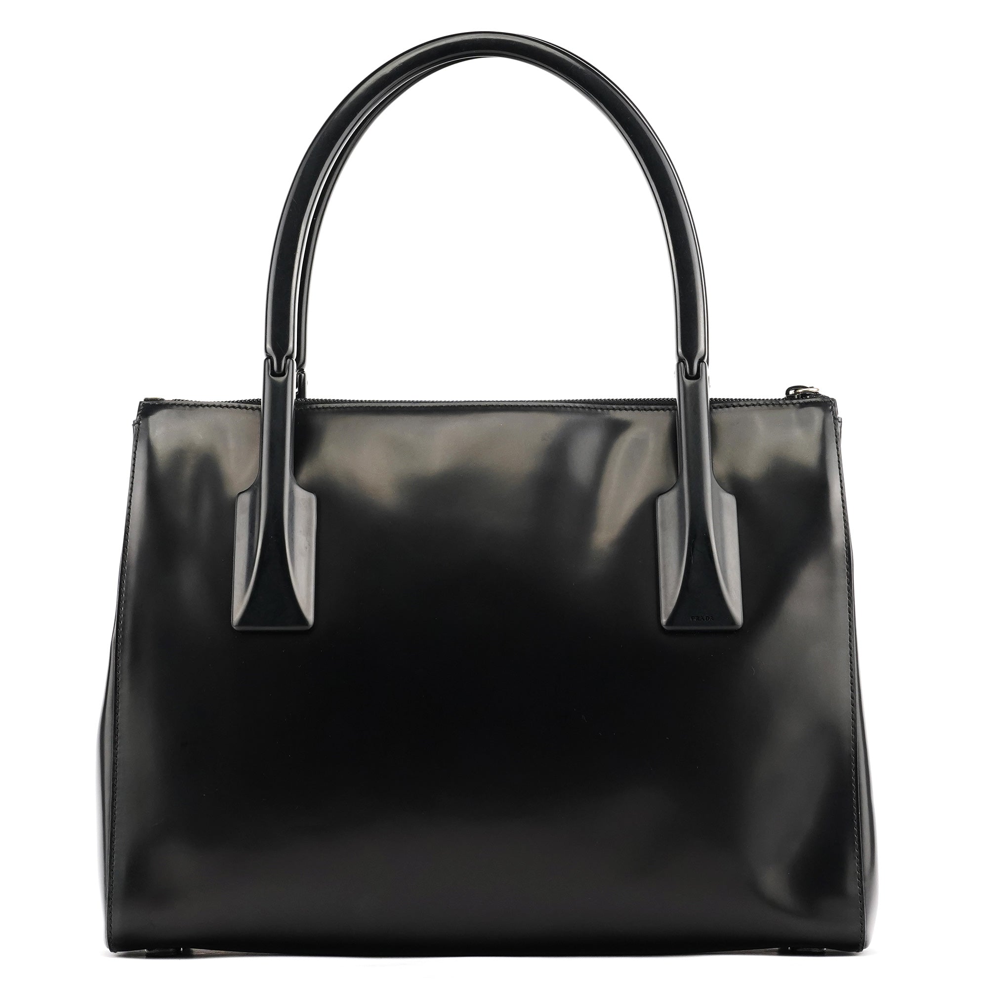 Designed in 1998 by Miuccia Prada, this vintage Prada Spazzolato Sport tote is crafted from glossy black spazzolato leather with rigid top handles and a clean, structured silhouette. Finished with a zip-top closure and logo-jacquard interior lining.