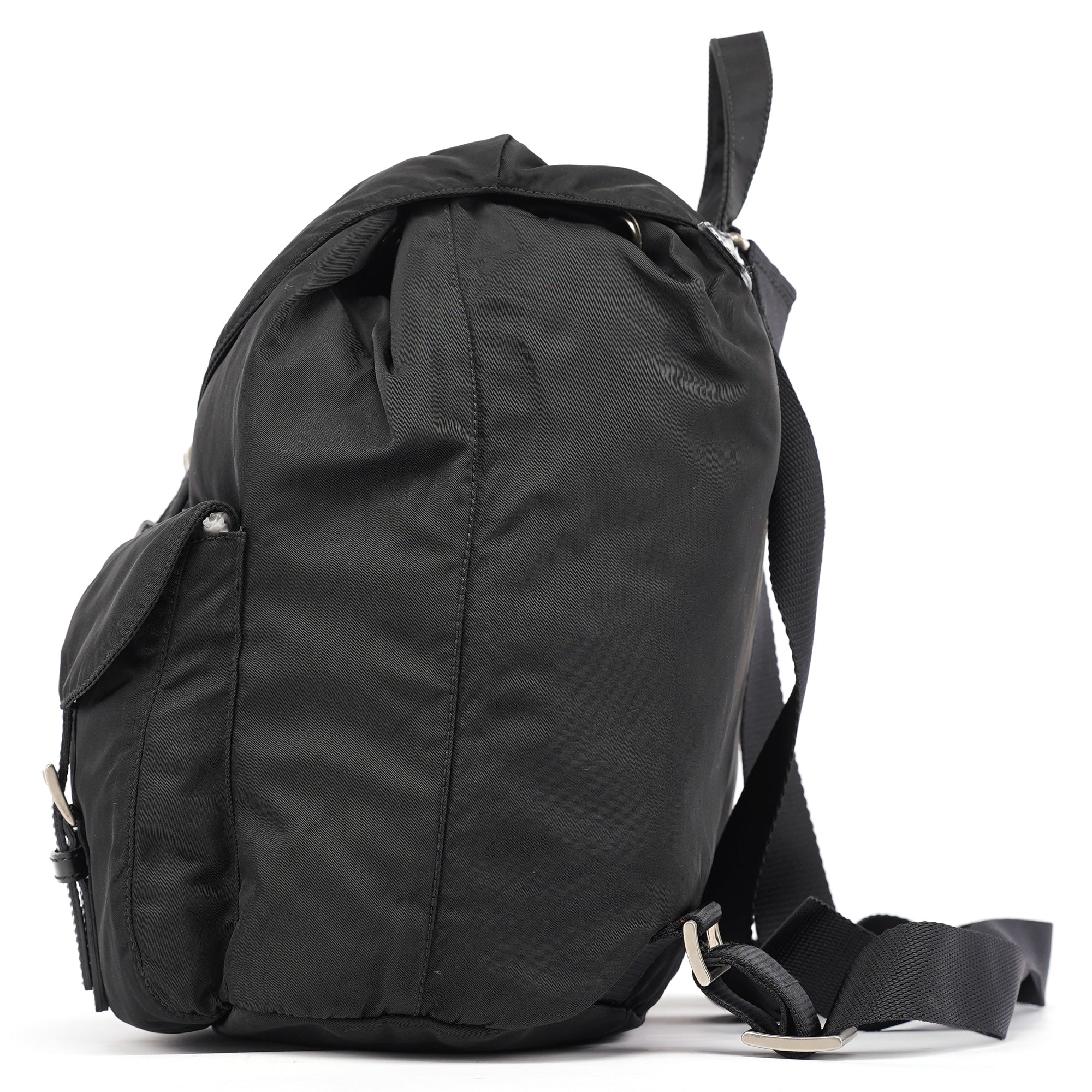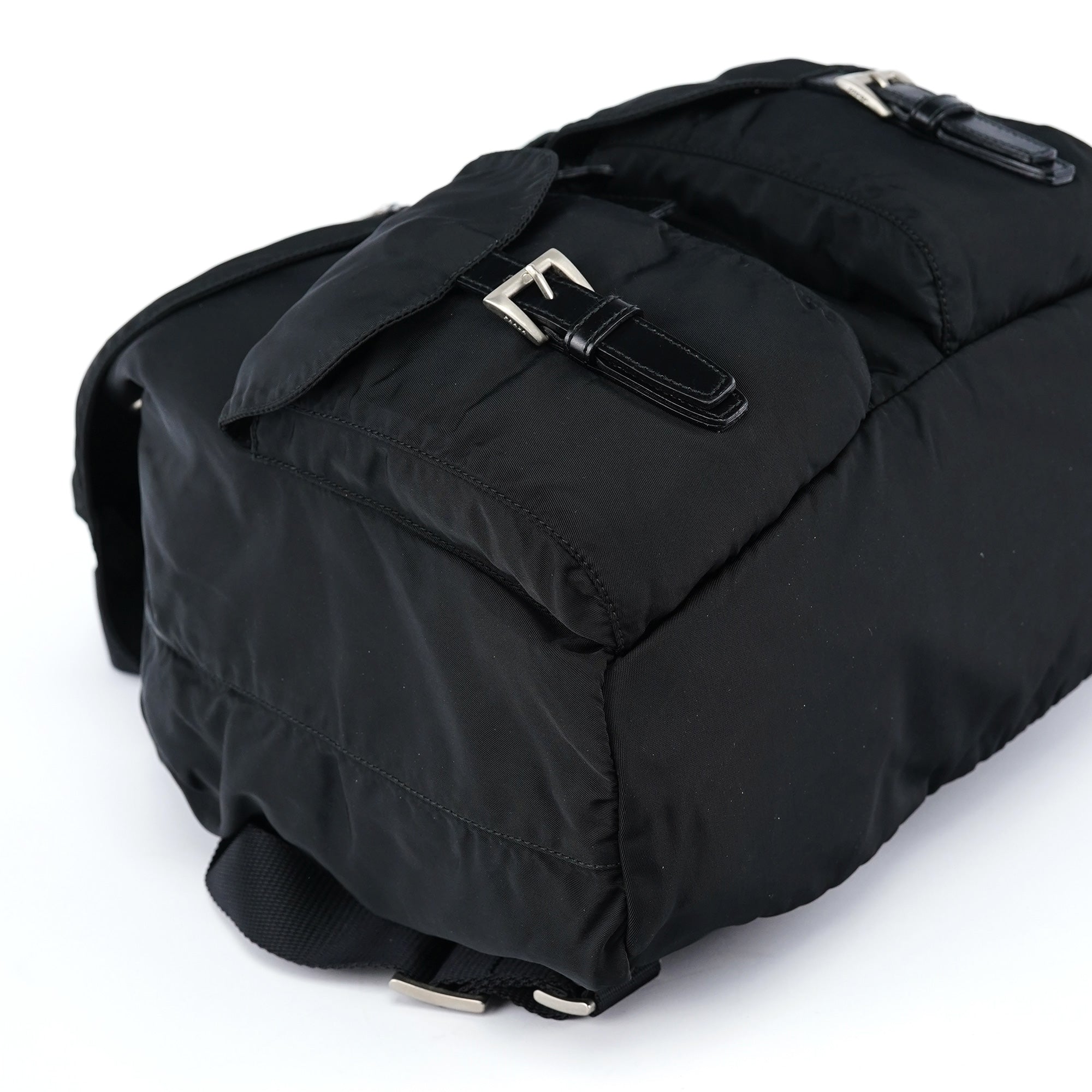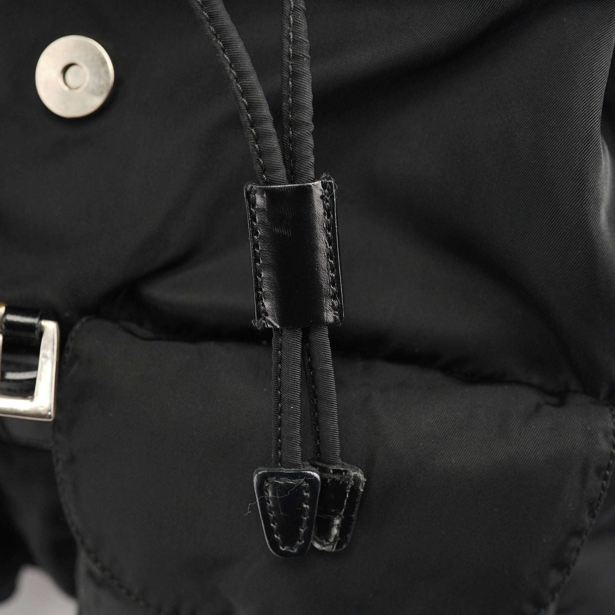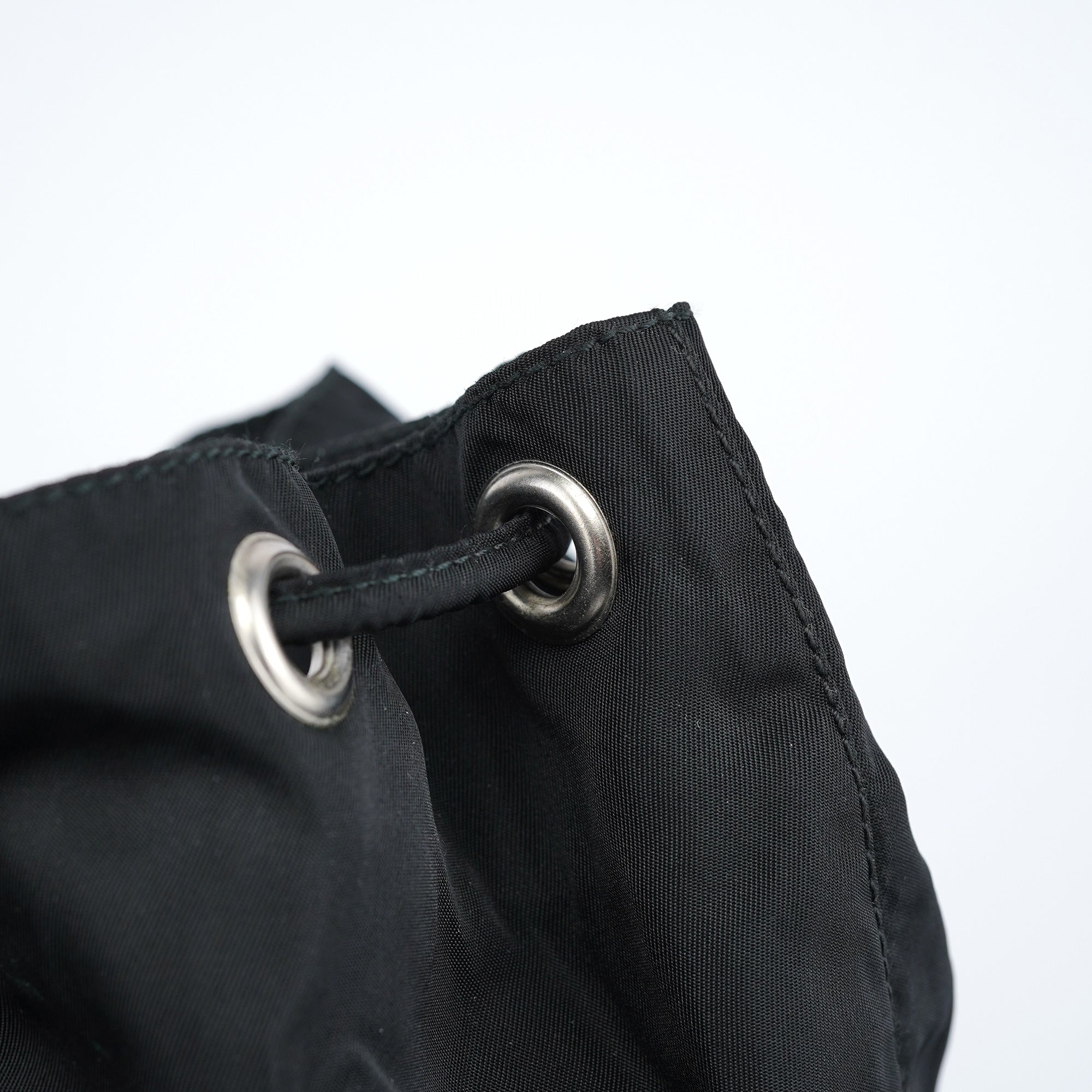Designed in the late 1990s by Miuccia Prada, this vintage Prada backpack showcases the brand's iconic tessuto nylon that revolutionized luxury accessories. Crafted in black nylon with the signature triangular Prada logo plate, the backpack features a drawstring closure with buckle flap, adjustable shoulder straps, and dual front pockets with buckle closures. The interior includes a zipper pocket for organization.