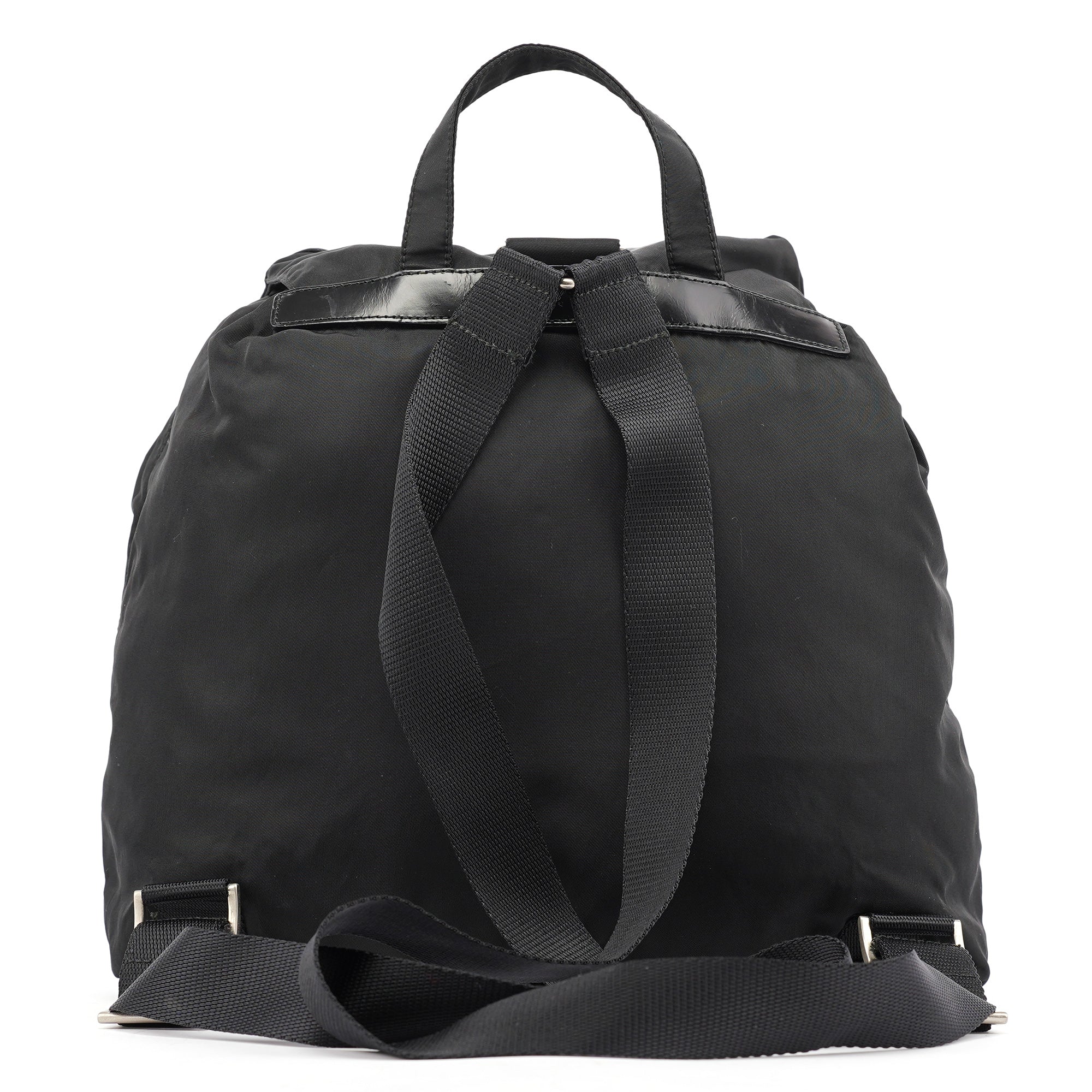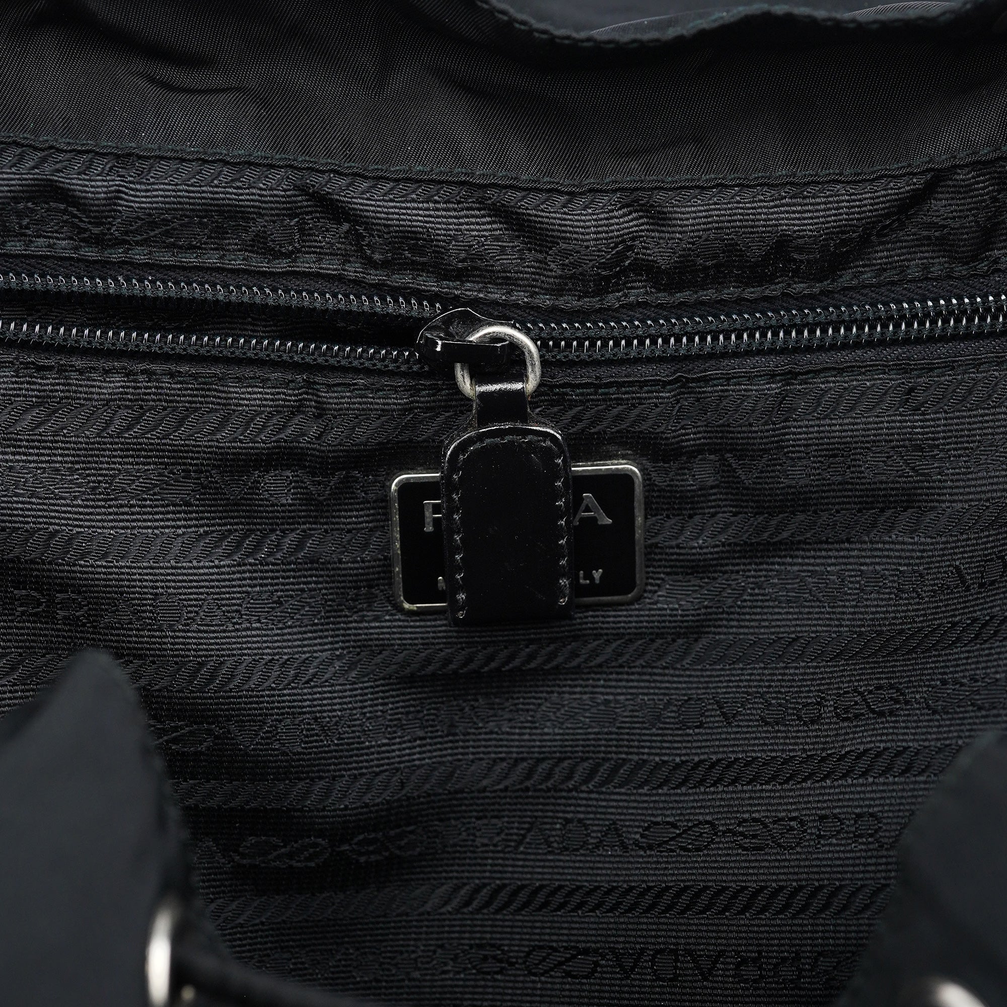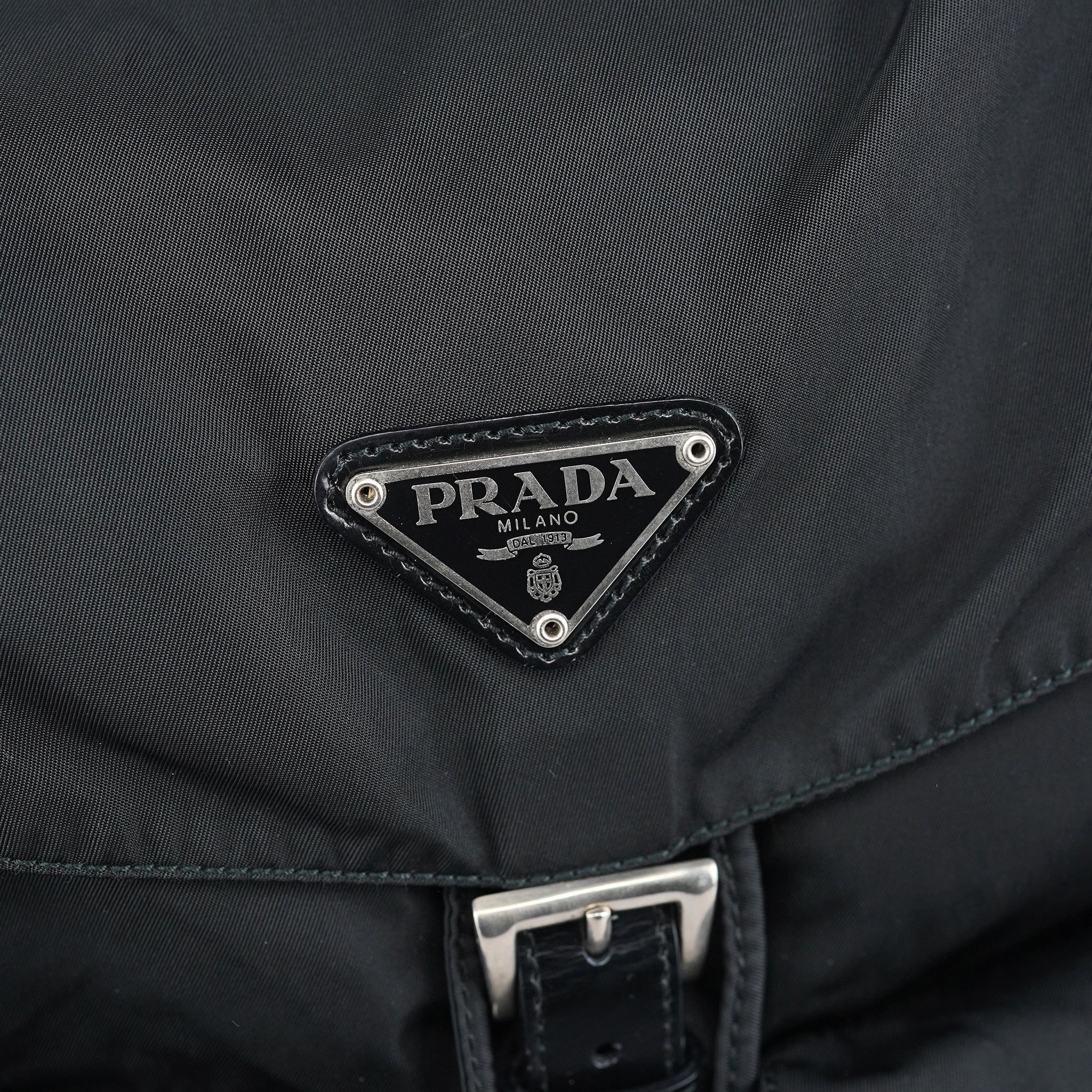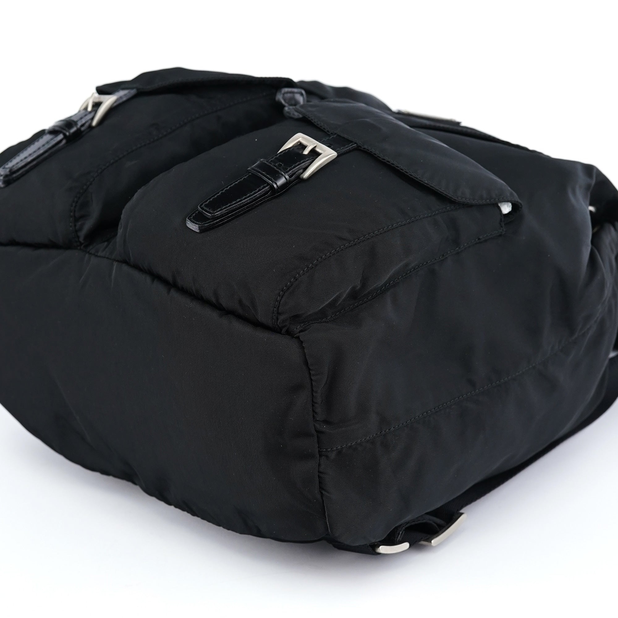 Designed in the late 1990s by Miuccia Prada, this vintage Prada backpack showcases the brand's iconic tessuto nylon that revolutionized luxury accessories. Crafted in black nylon with the signature triangular Prada logo plate, the backpack features a drawstring closure with buckle flap, adjustable shoulder straps, and dual front pockets with buckle closures. The interior includes a zipper pocket for organization.