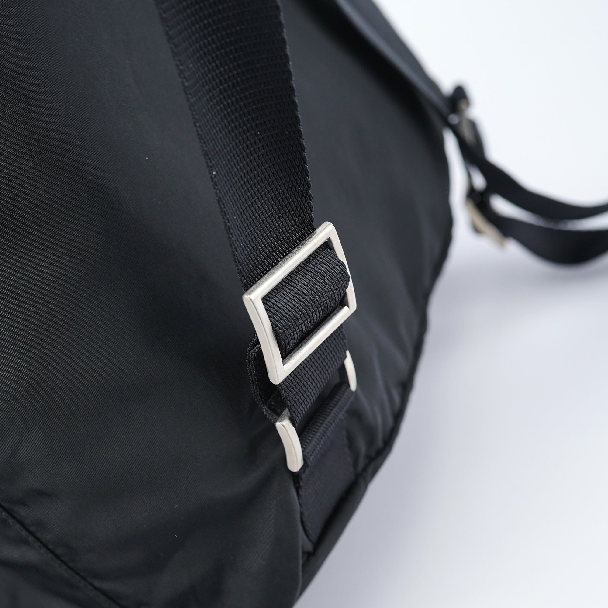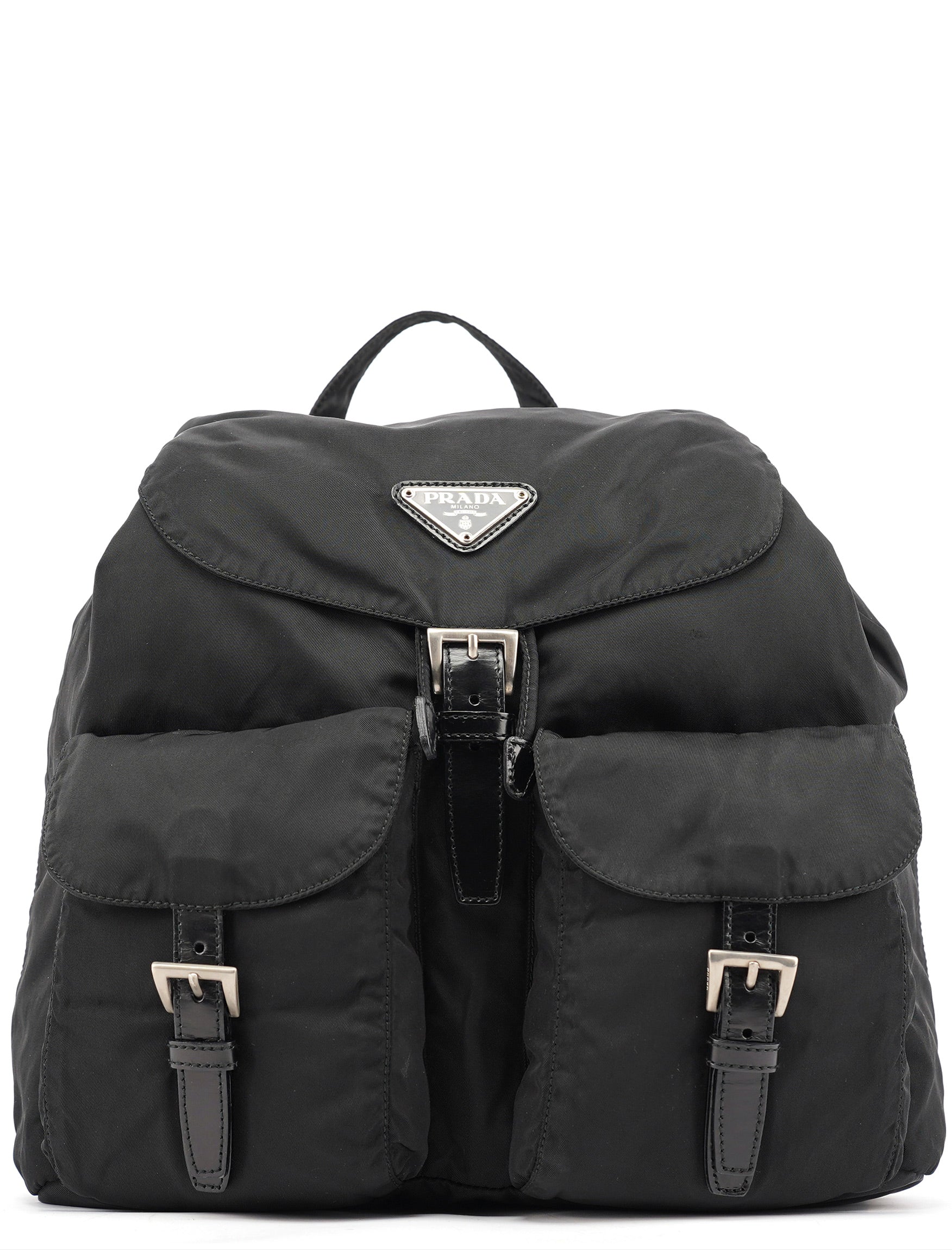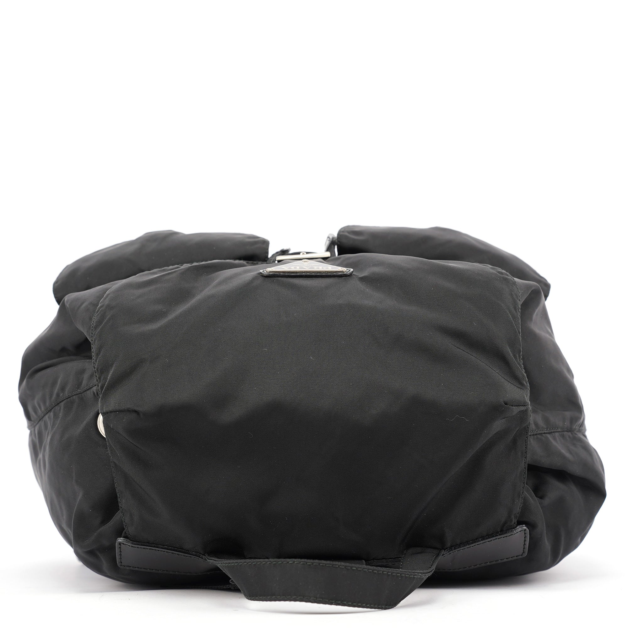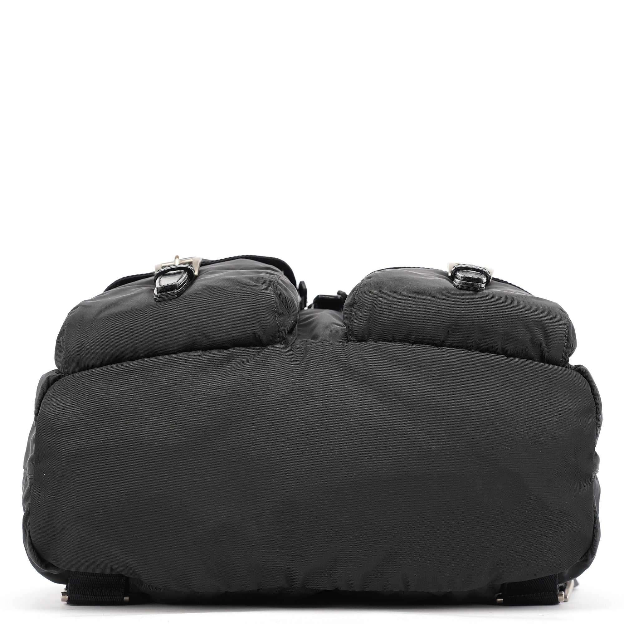 Designed in the late 1990s by Miuccia Prada, this vintage Prada backpack showcases the brand's iconic tessuto nylon that revolutionized luxury accessories. Crafted in black nylon with the signature triangular Prada logo plate, the backpack features a drawstring closure with buckle flap, adjustable shoulder straps, and dual front pockets with buckle closures. The interior includes a zipper pocket for organization.
