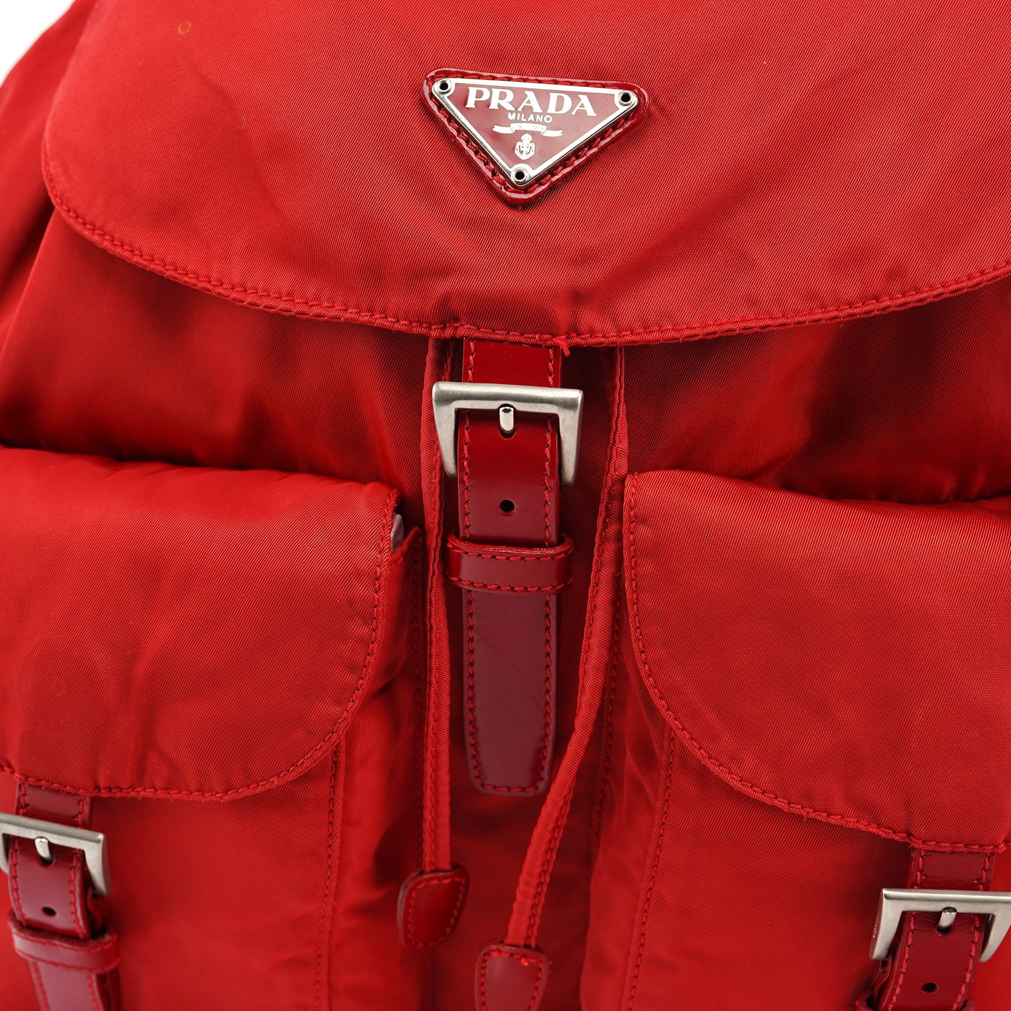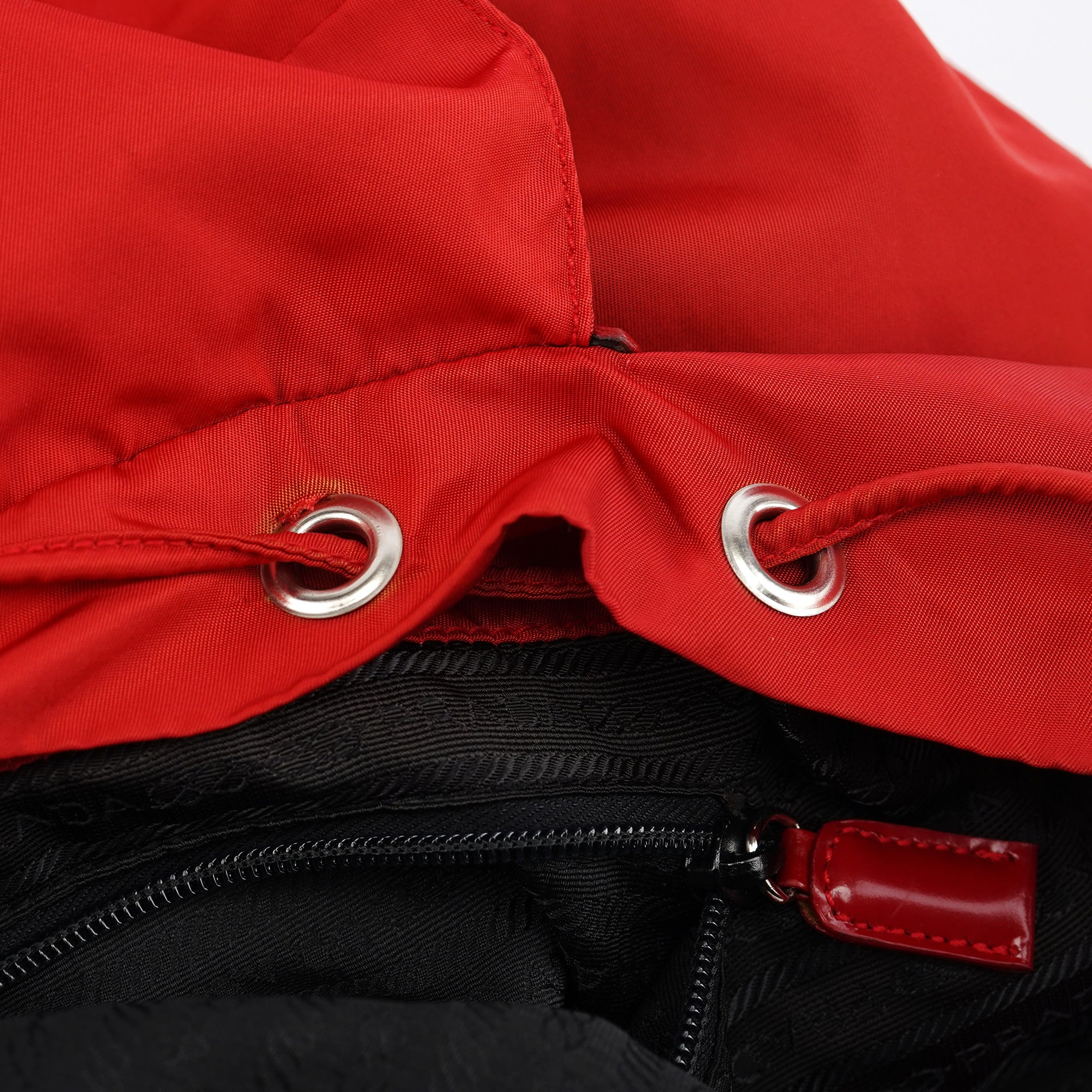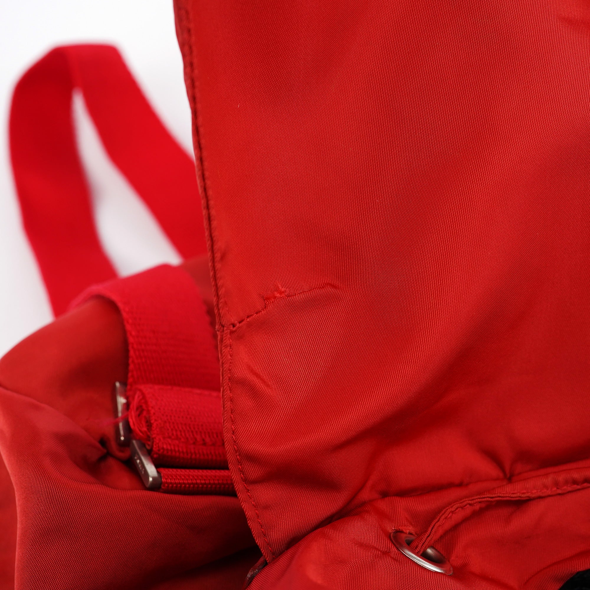 Designed in the late 1990's by Miuccia Prada, this vintage Prada Tessuto Vela backpack was crafted from bright red nylon with leather trim. The functional silhouette features a front flap closure with buckle hardware, an enamel triangle logo, adjustable leather shoulder straps, exterior pockets, and a spacious nylon-lined interior. The lightweight technical fabric and utilitarian design reflect Prada's innovative approach to luxury sportswear.
