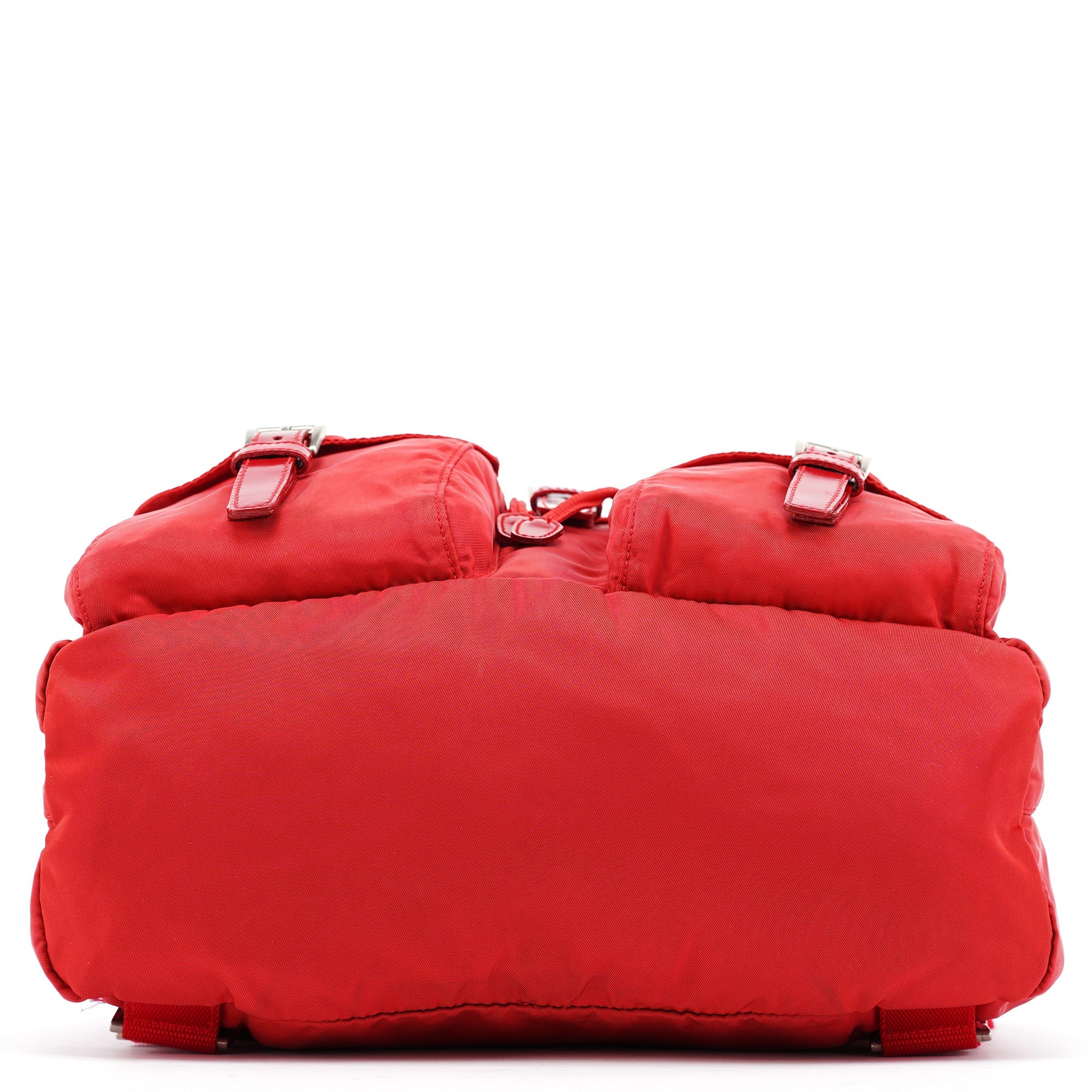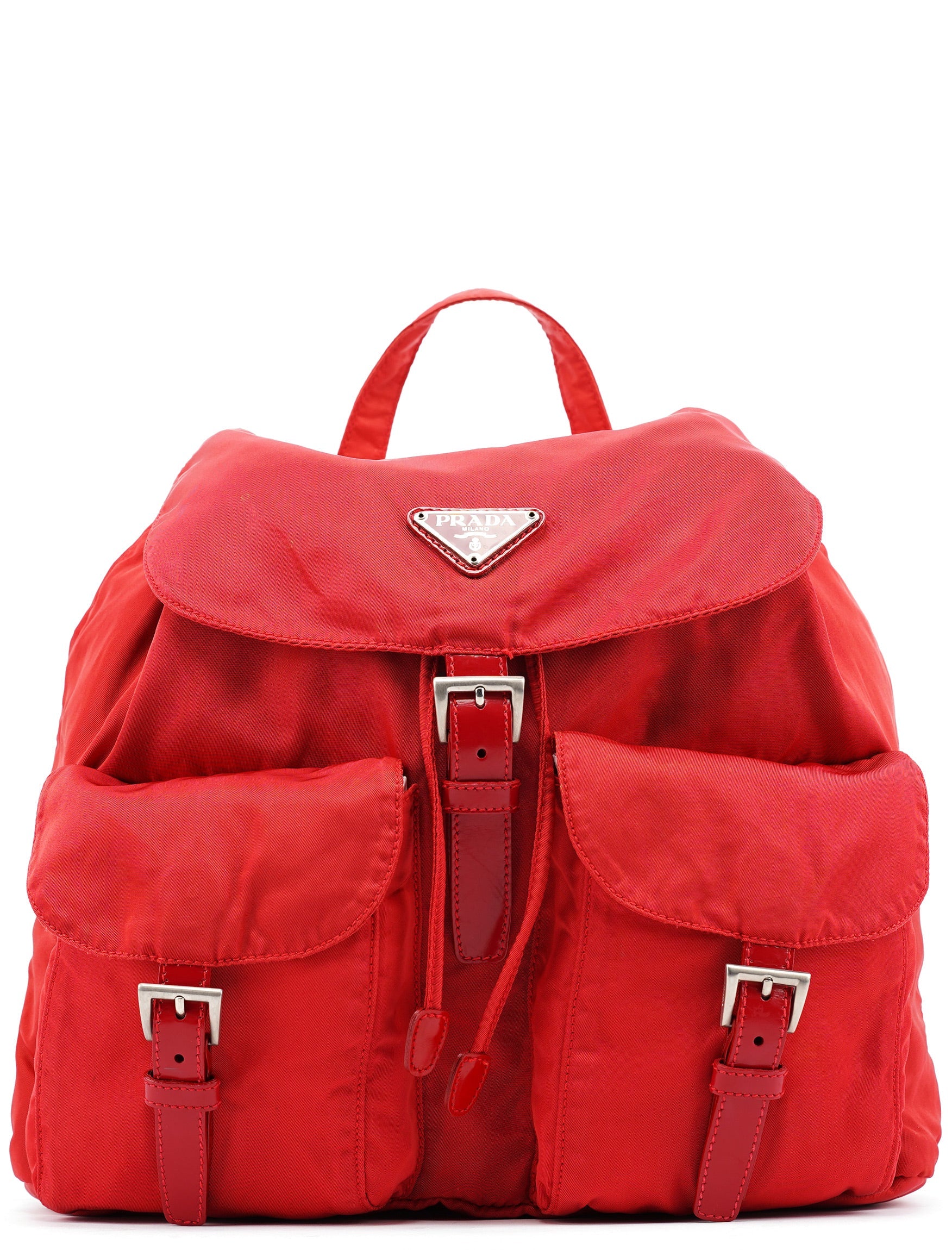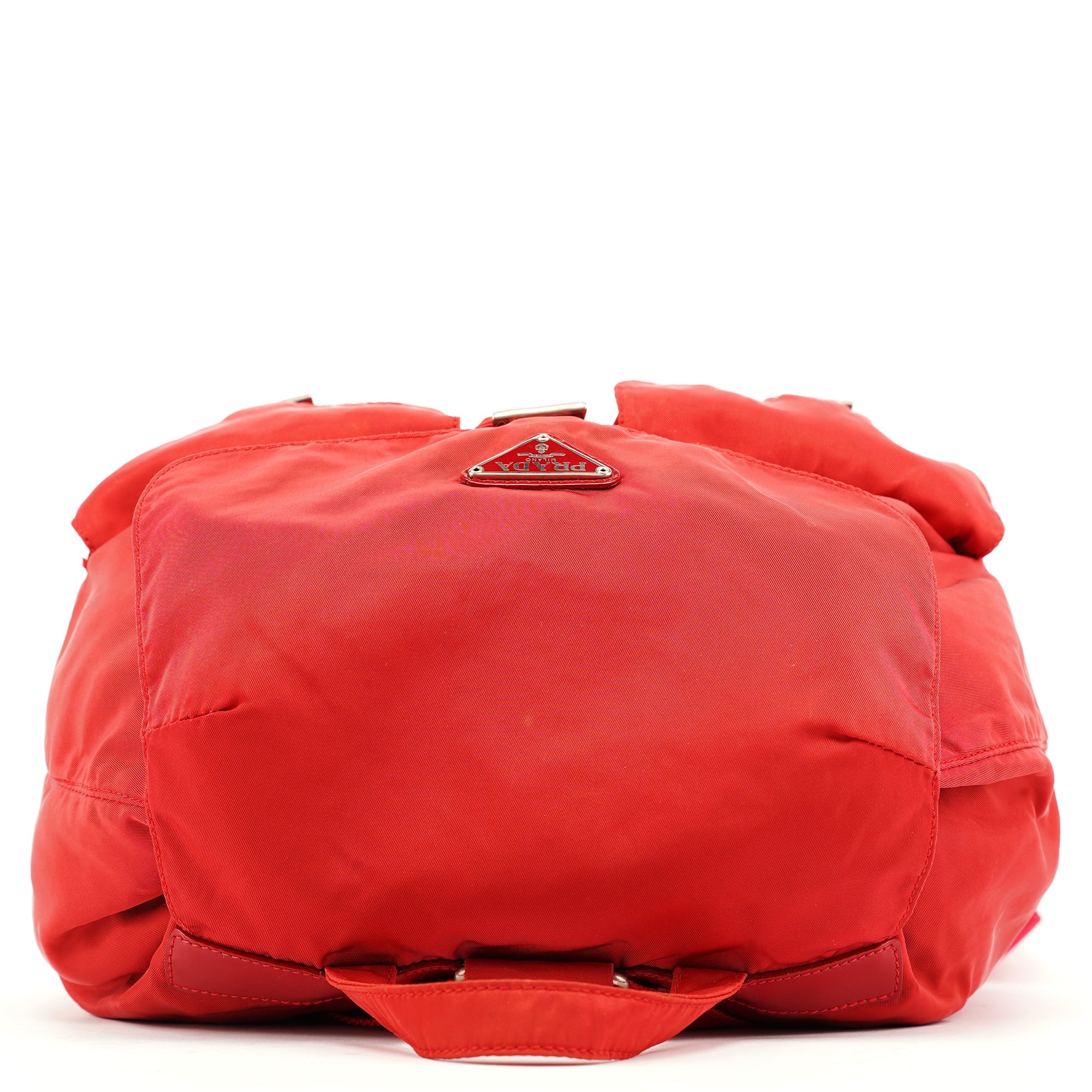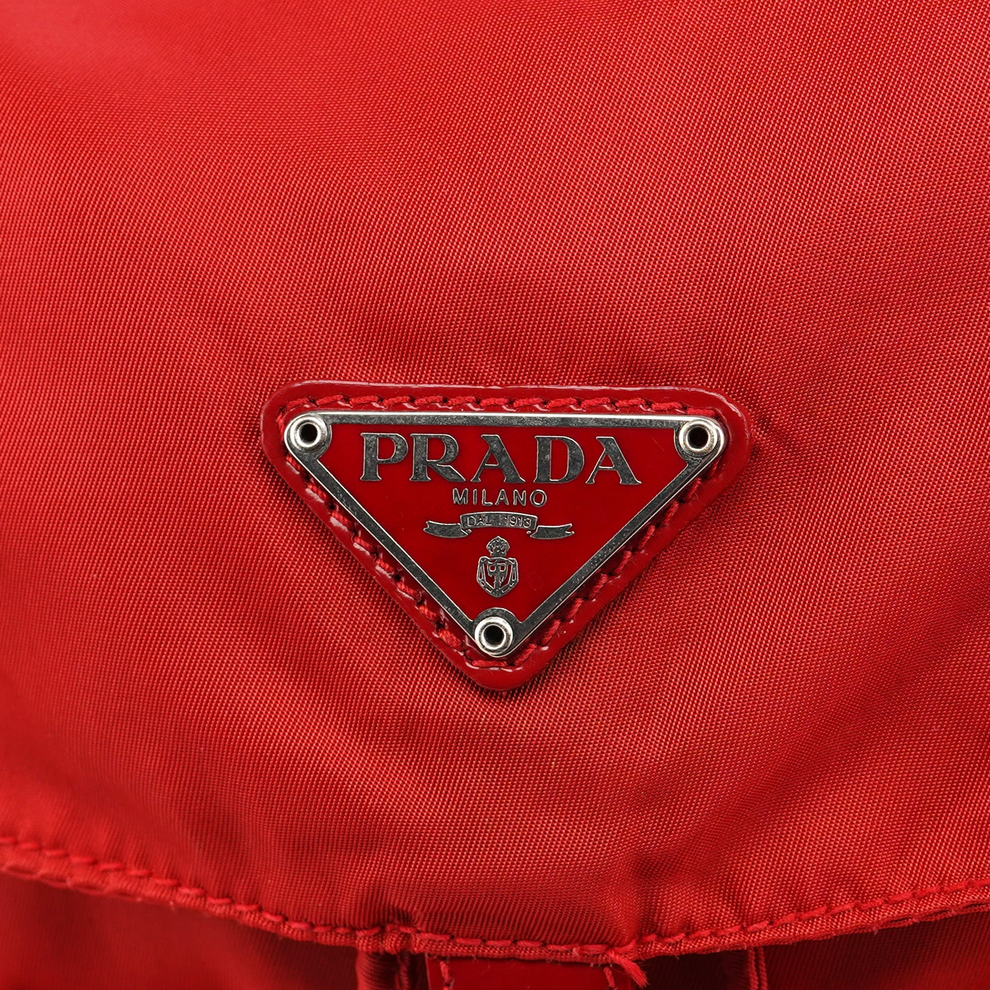 Designed in the late 1990's by Miuccia Prada, this vintage Prada Tessuto Vela backpack was crafted from bright red nylon with leather trim. The functional silhouette features a front flap closure with buckle hardware, an enamel triangle logo, adjustable leather shoulder straps, exterior pockets, and a spacious nylon-lined interior. The lightweight technical fabric and utilitarian design reflect Prada's innovative approach to luxury sportswear.