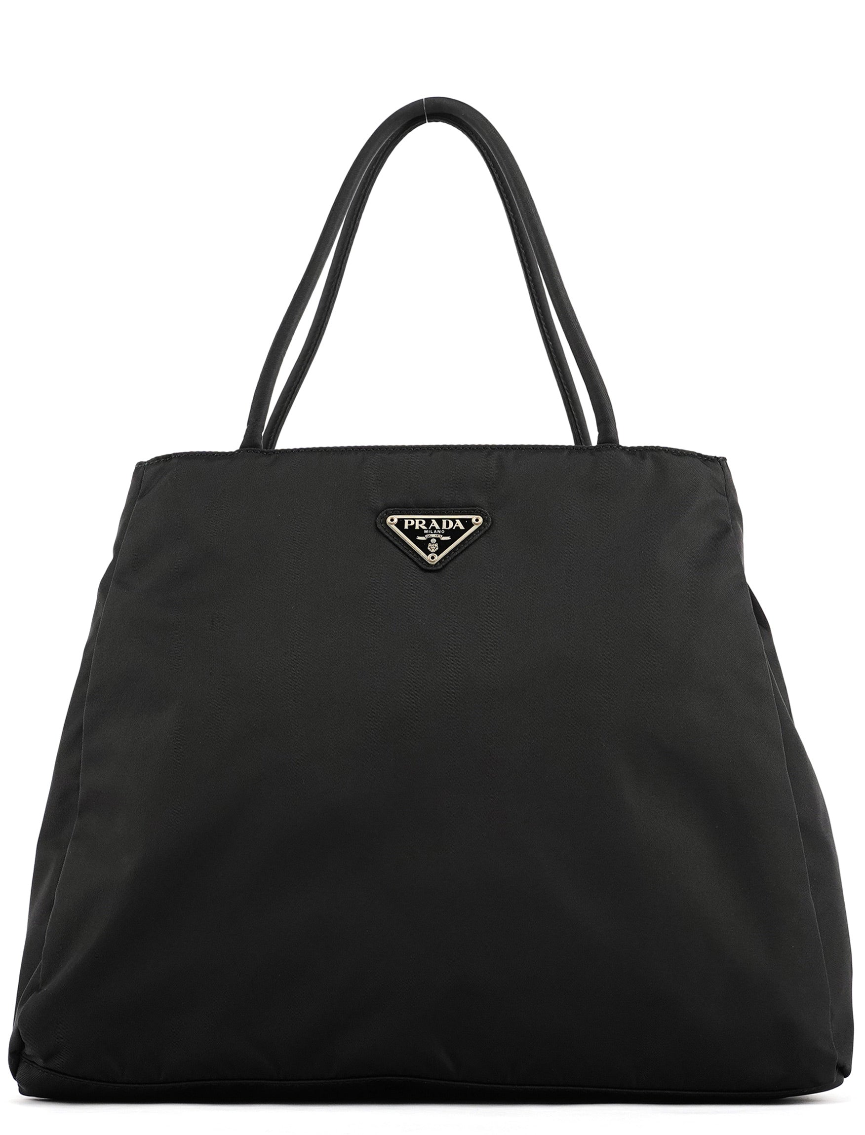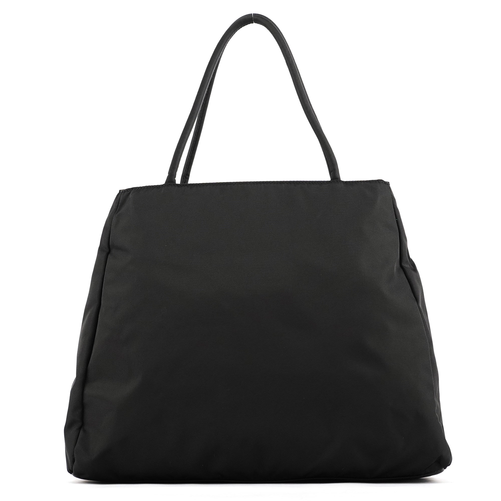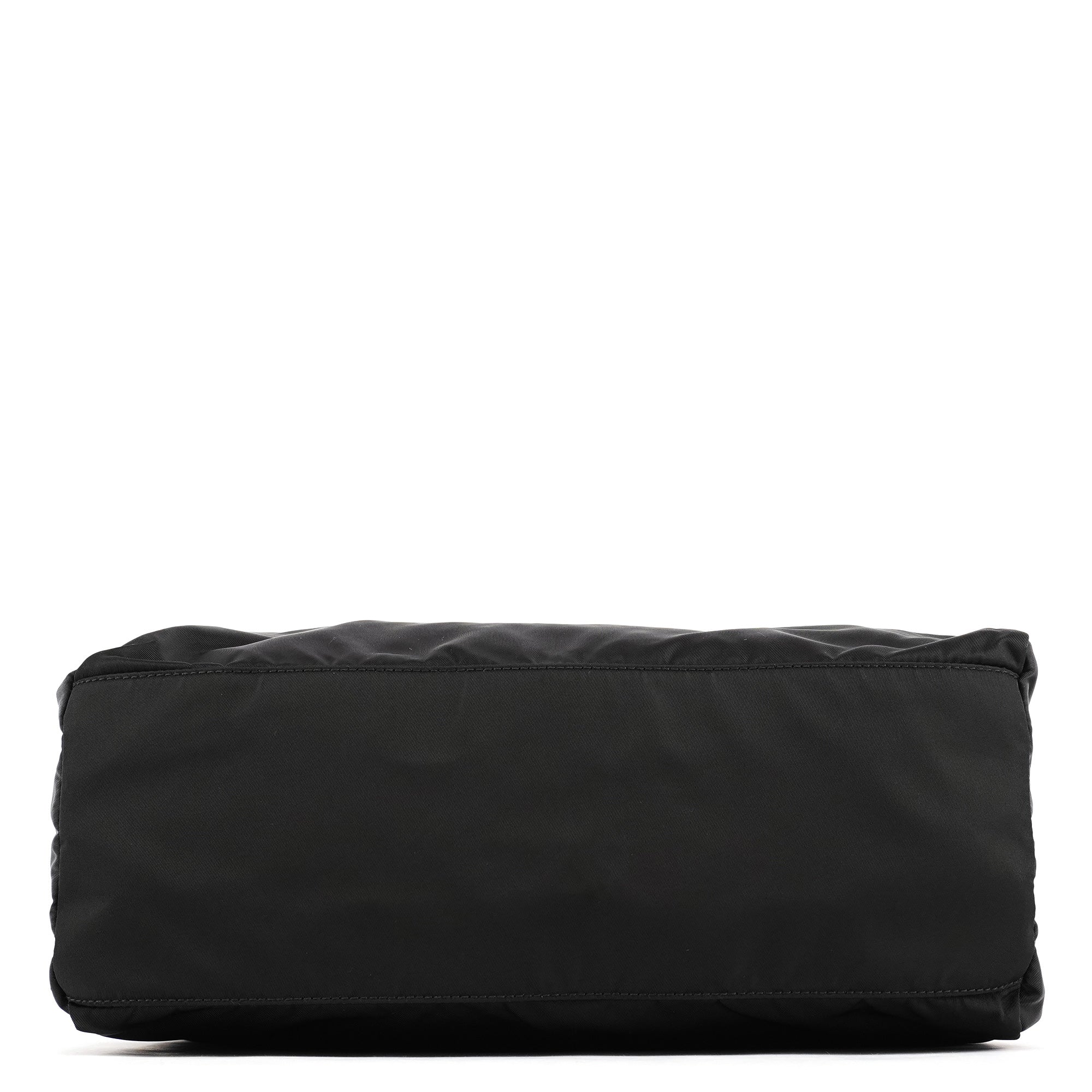 Designed in the late 1990s by Miuccia Prada, this Prada Tessuto city tote is crafted from black nylon with a structured silhouette, featuring three interior compartments, slim shoulder straps, and the signature Prada triangle logo at the front.