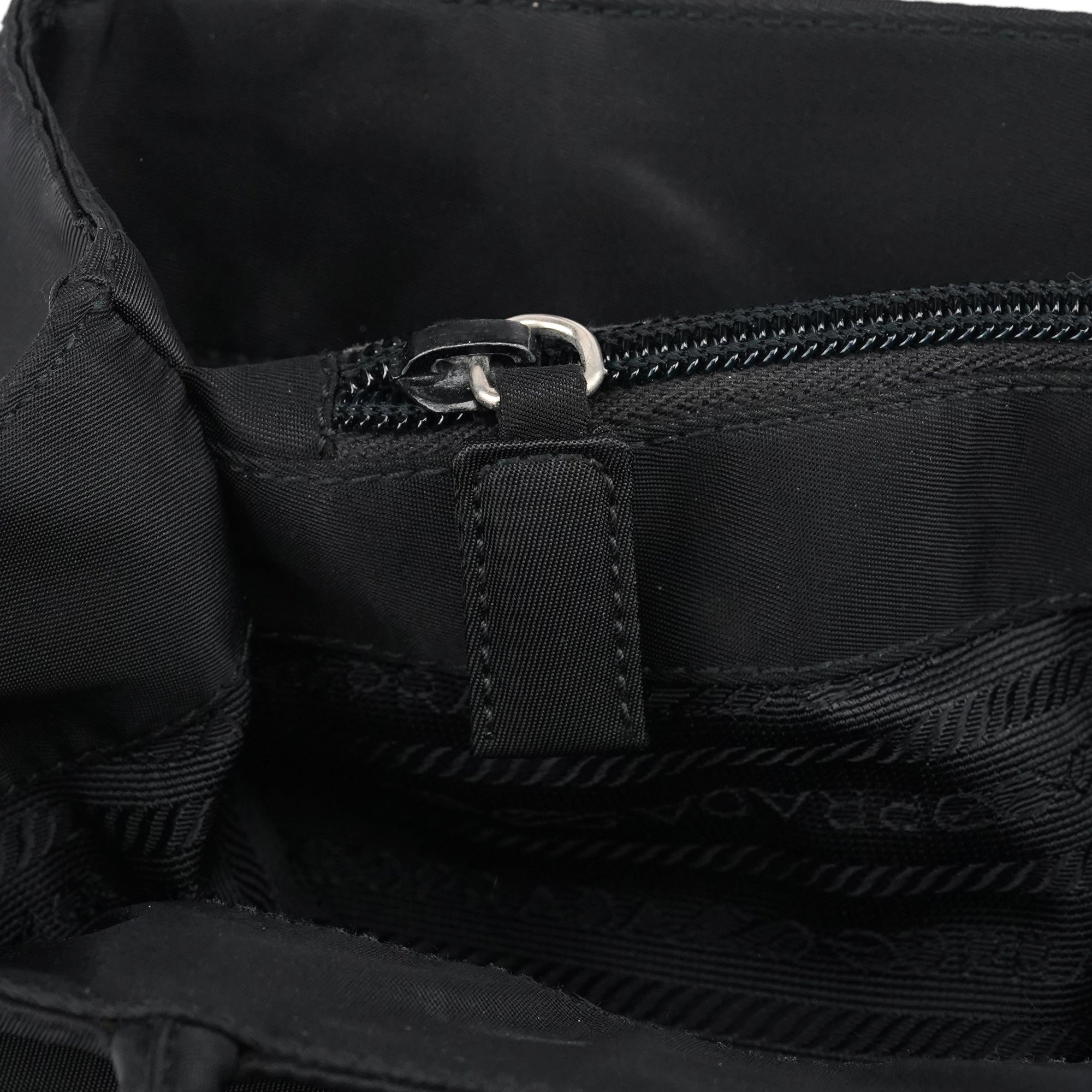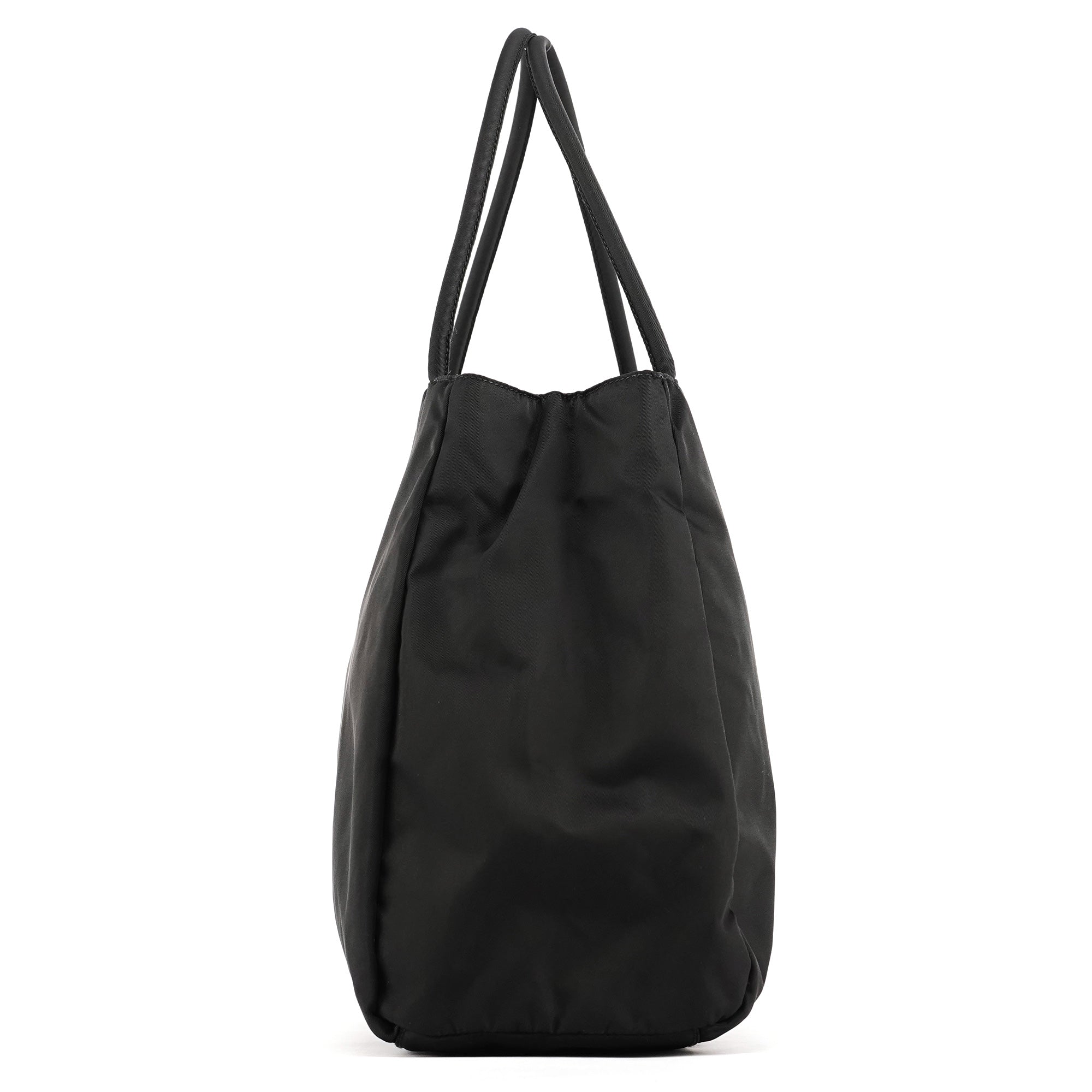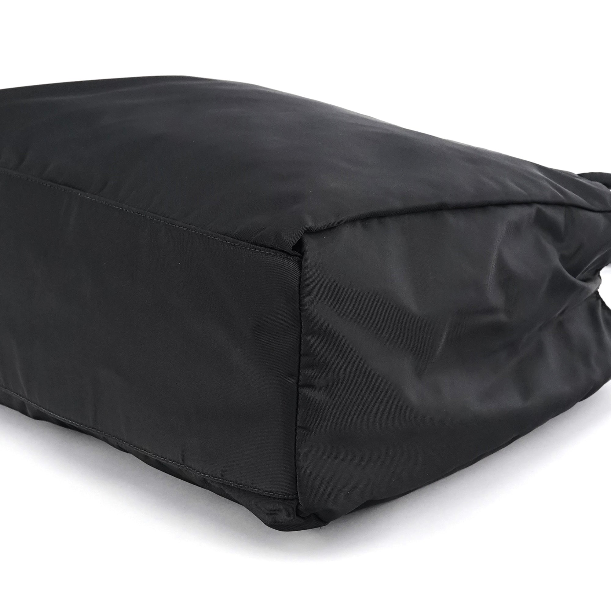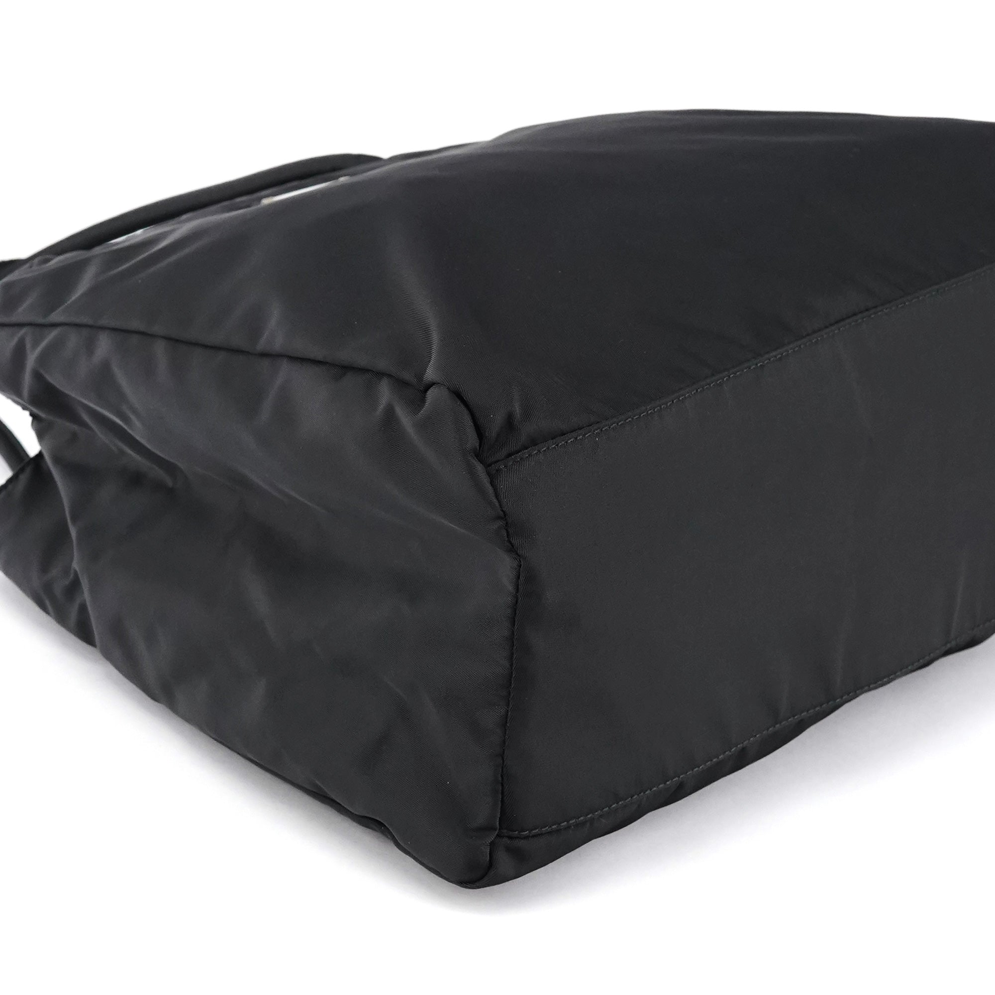 Designed in the late 1990s by Miuccia Prada, this Prada Tessuto city tote is crafted from black nylon with a structured silhouette, featuring three interior compartments, slim shoulder straps, and the signature Prada triangle logo at the front.